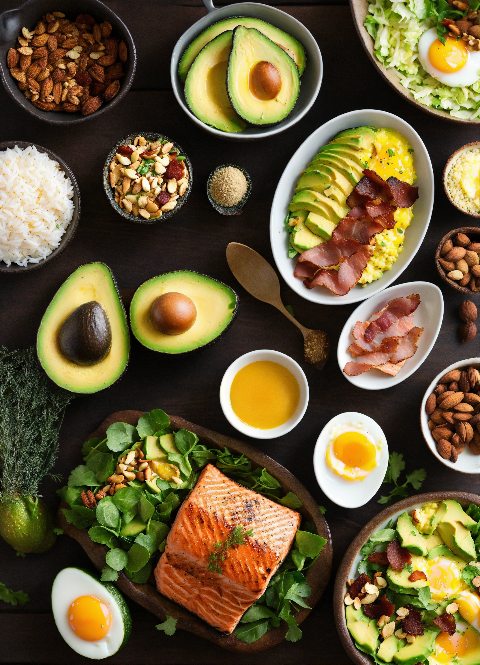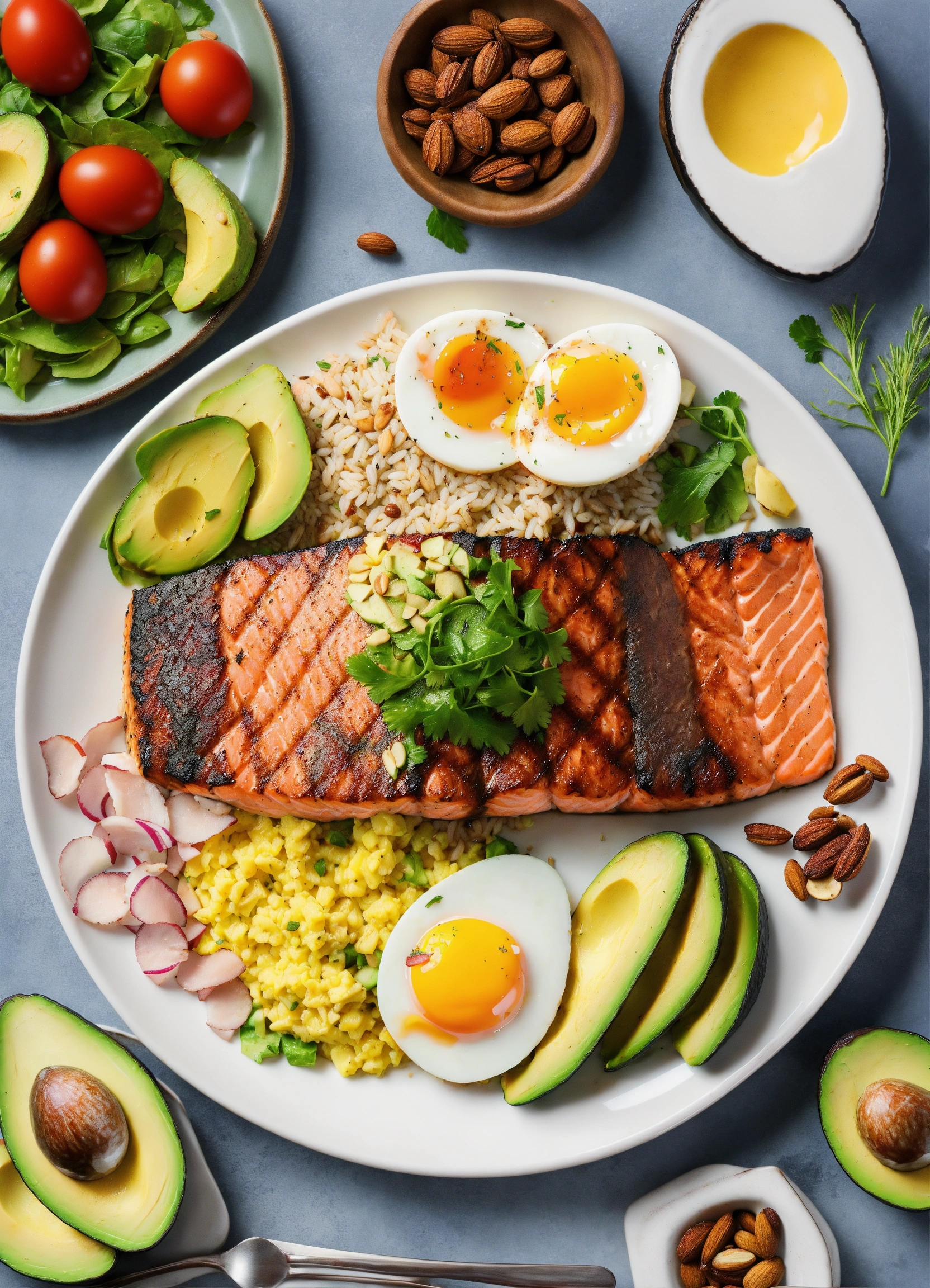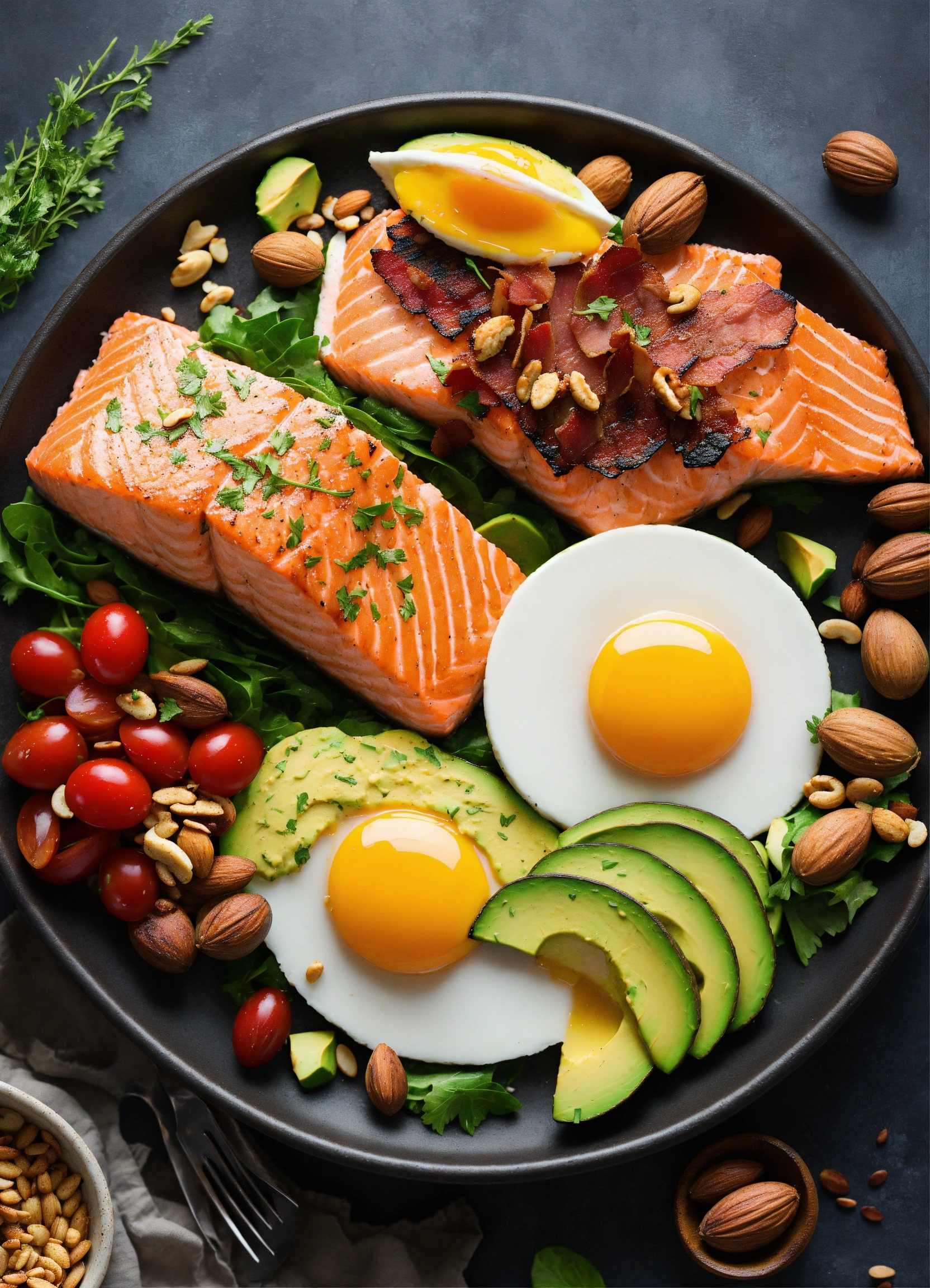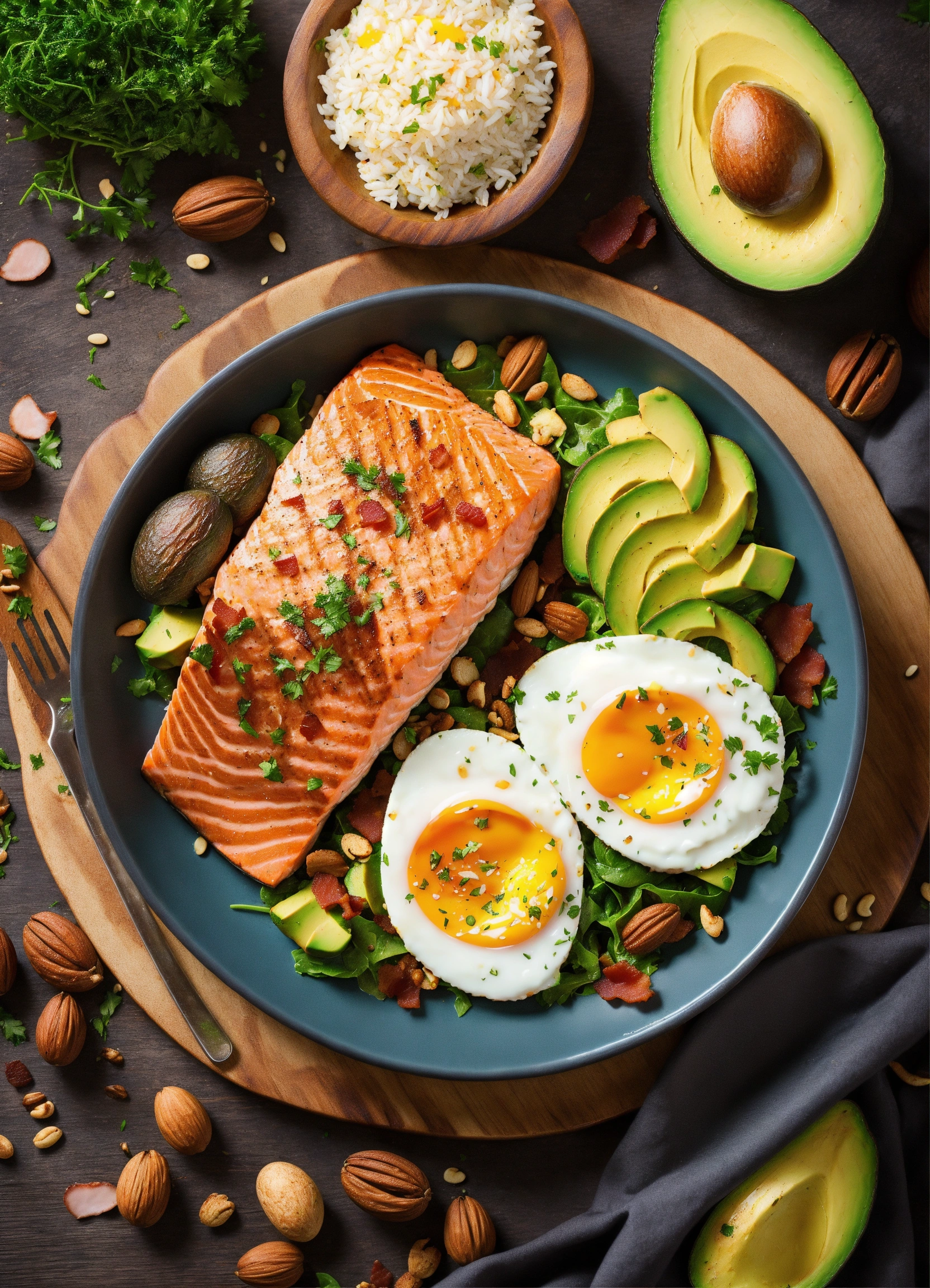 Design a 4 realistic ketogenic dishes using grilled salmon, grilled stake, eggs avocados, crisp bacon, coliflower rice salad, nuts chease and other keto diet ingredients, for the perfecly display dishe view from above