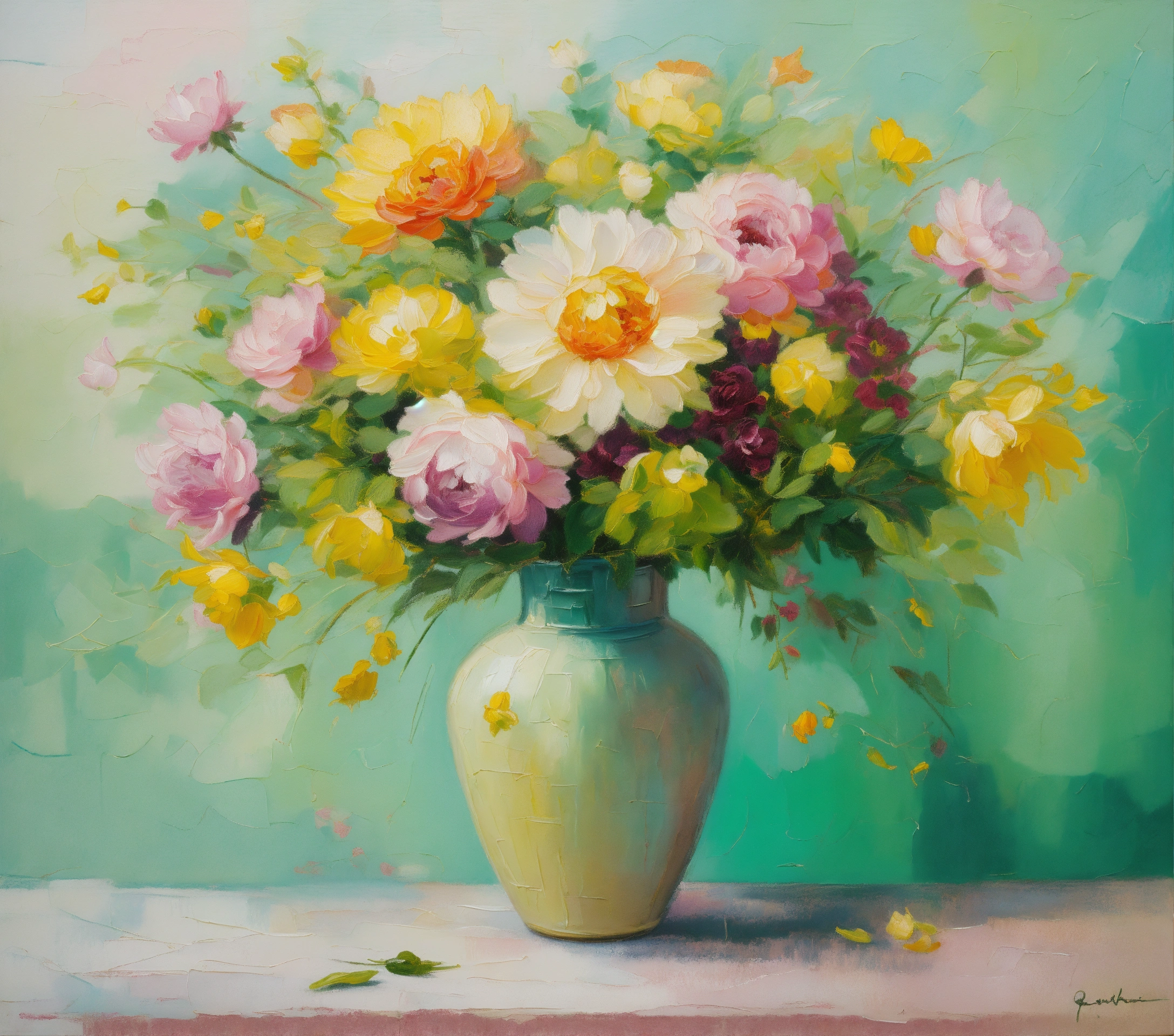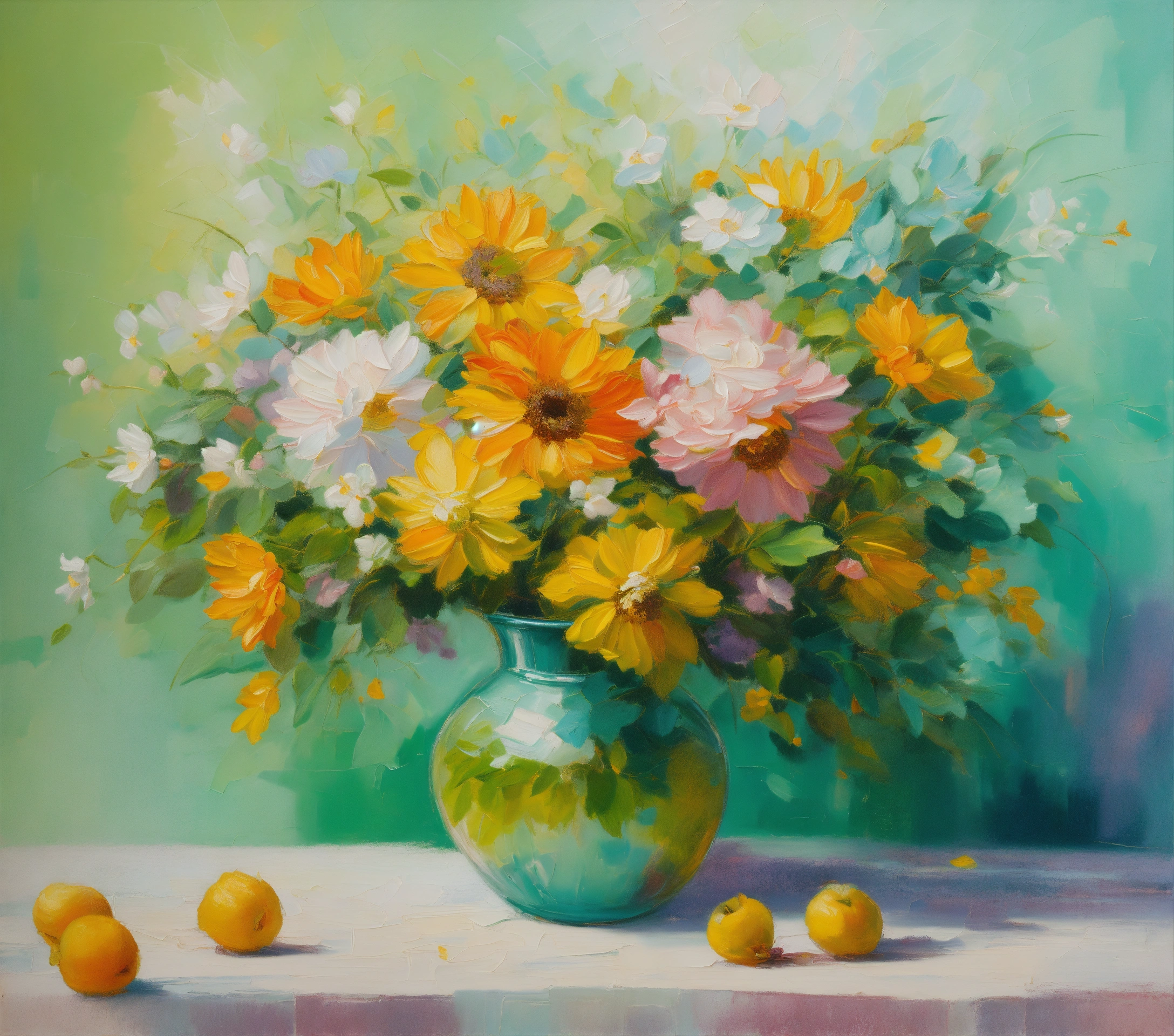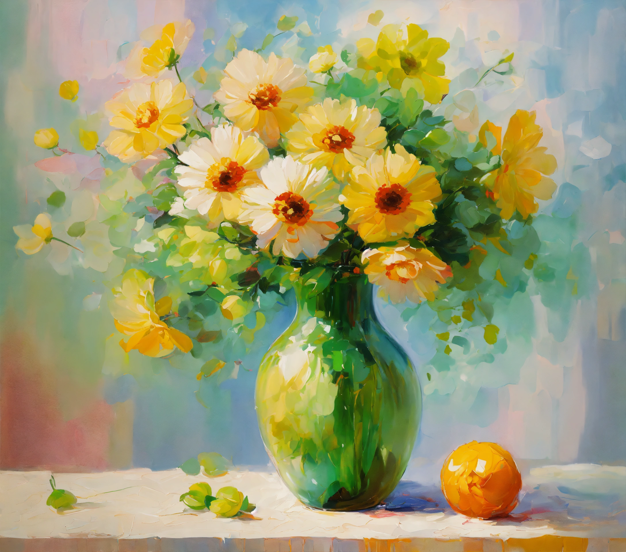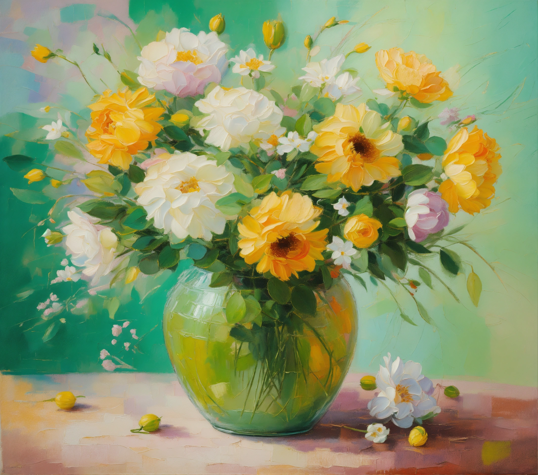 Abstract impressionistic oil painting of beautiful still life, flowers in a vase, pastel background, white, green