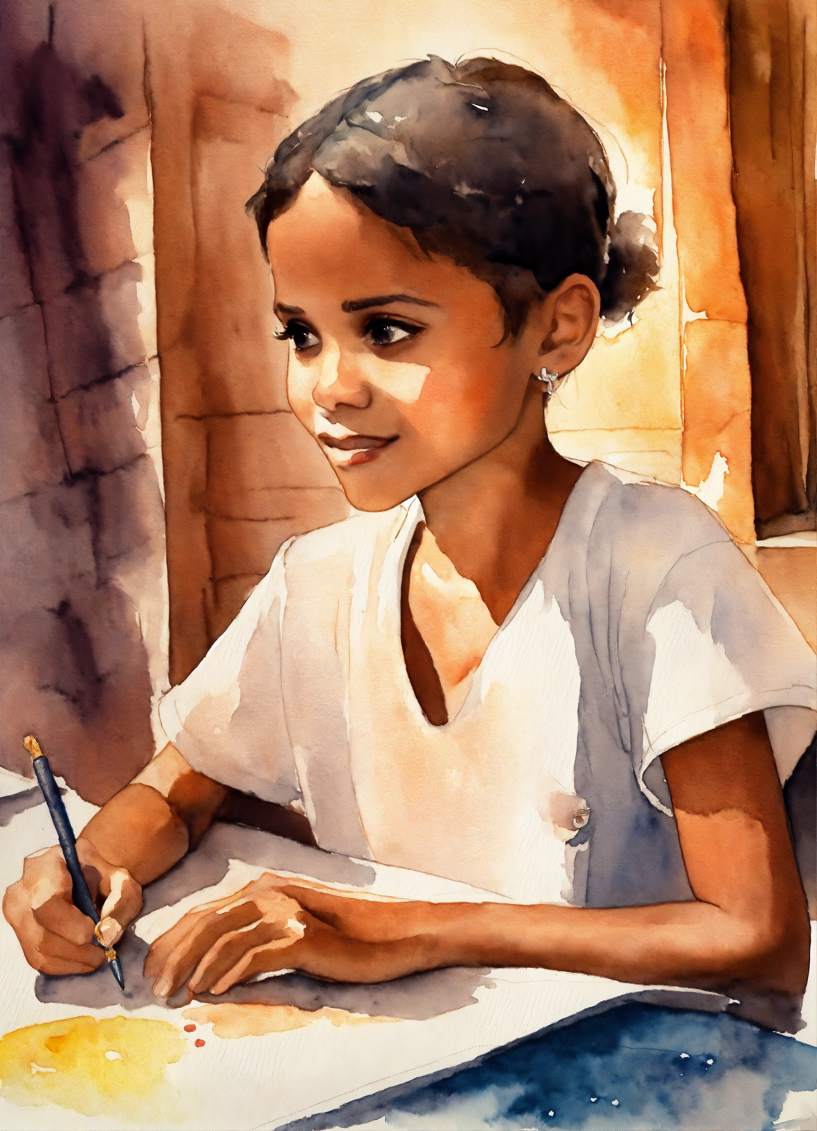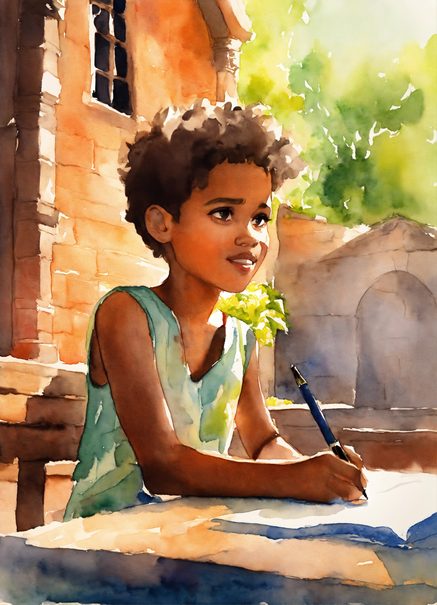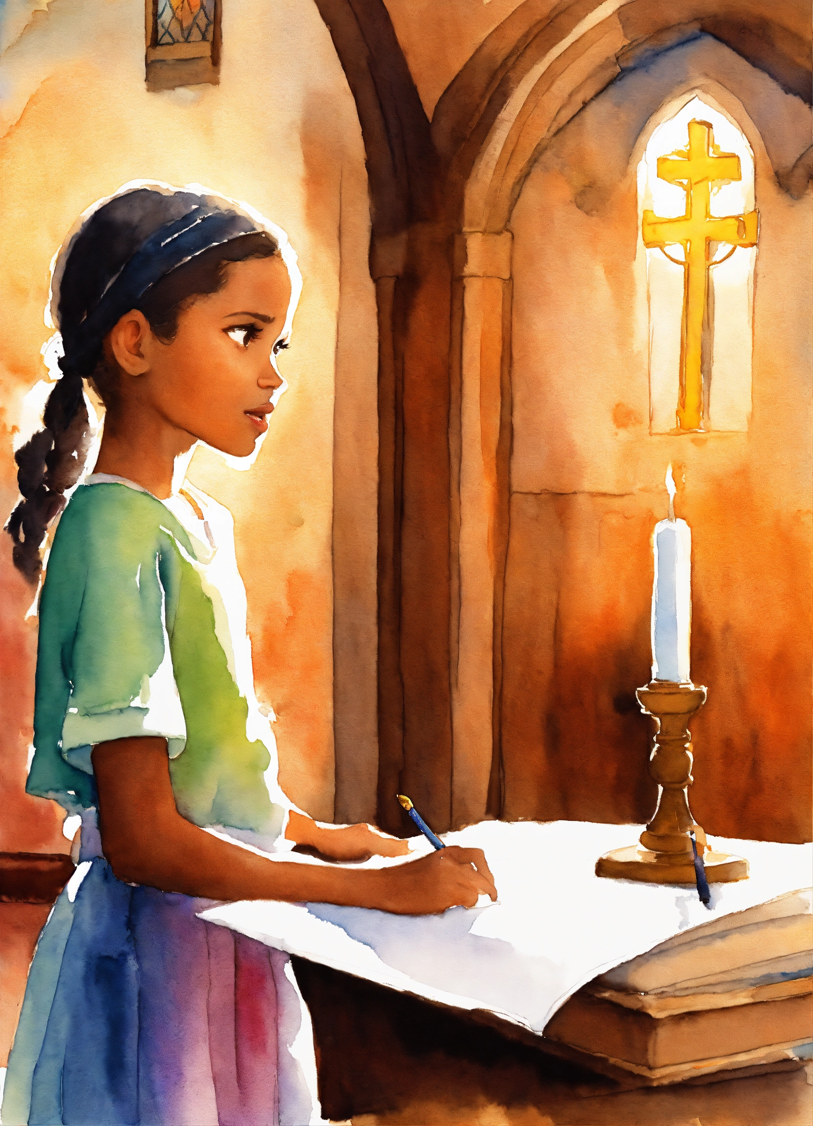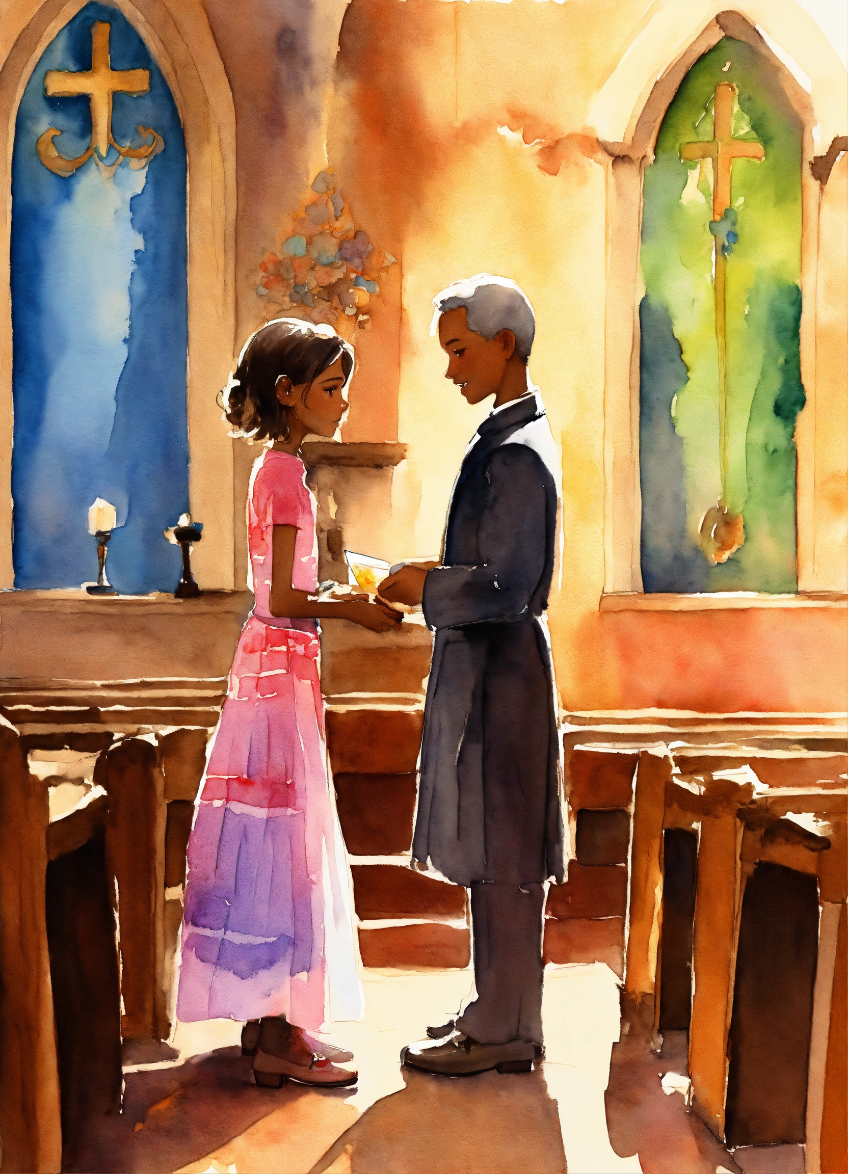 Watercolor pixar painting of hispanic 8 year old halle berry at the local church sharing her idea with the priest, watercolor pixar style cartoon