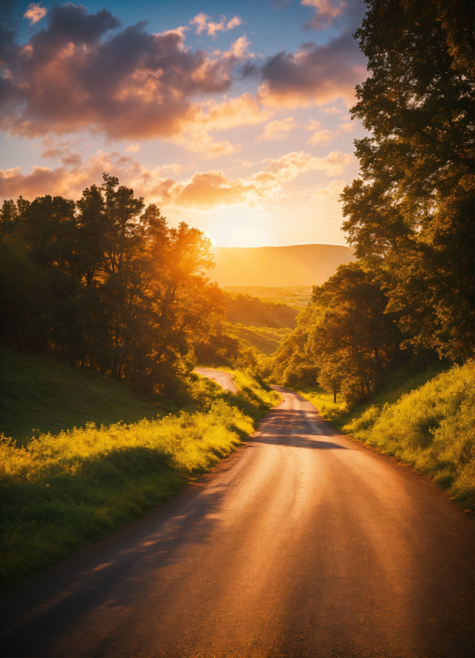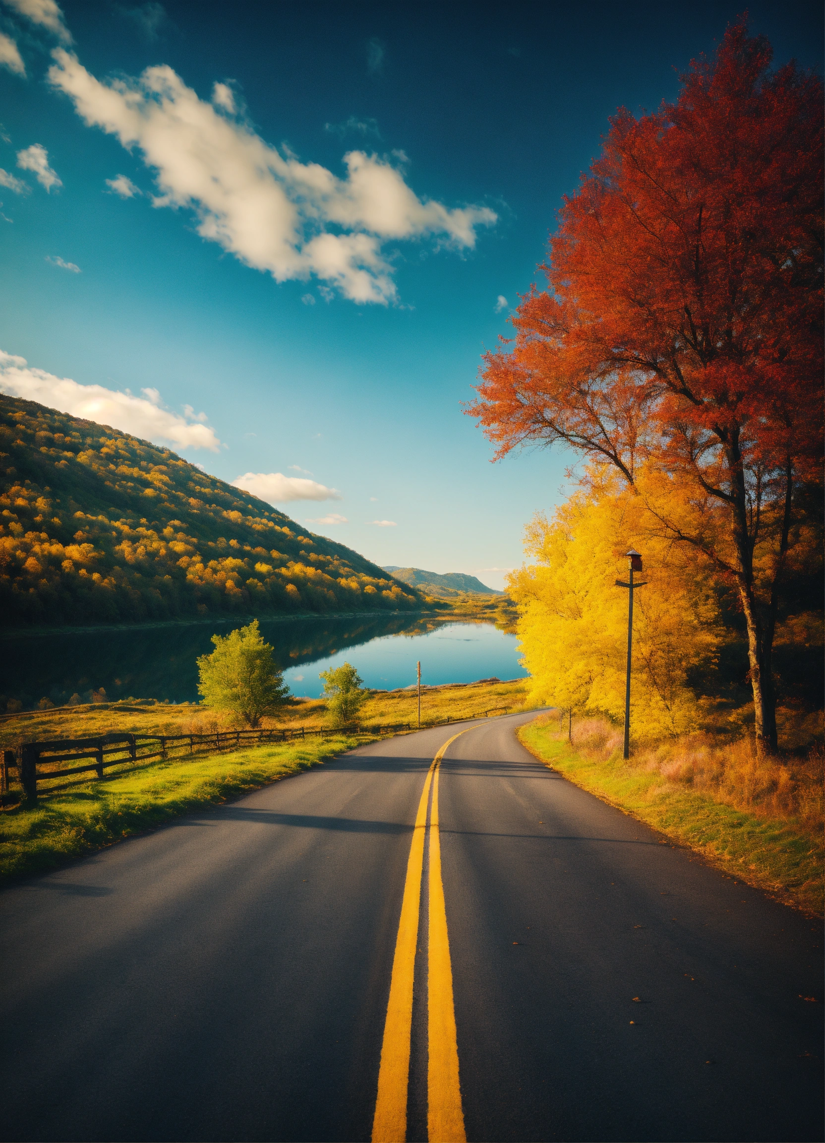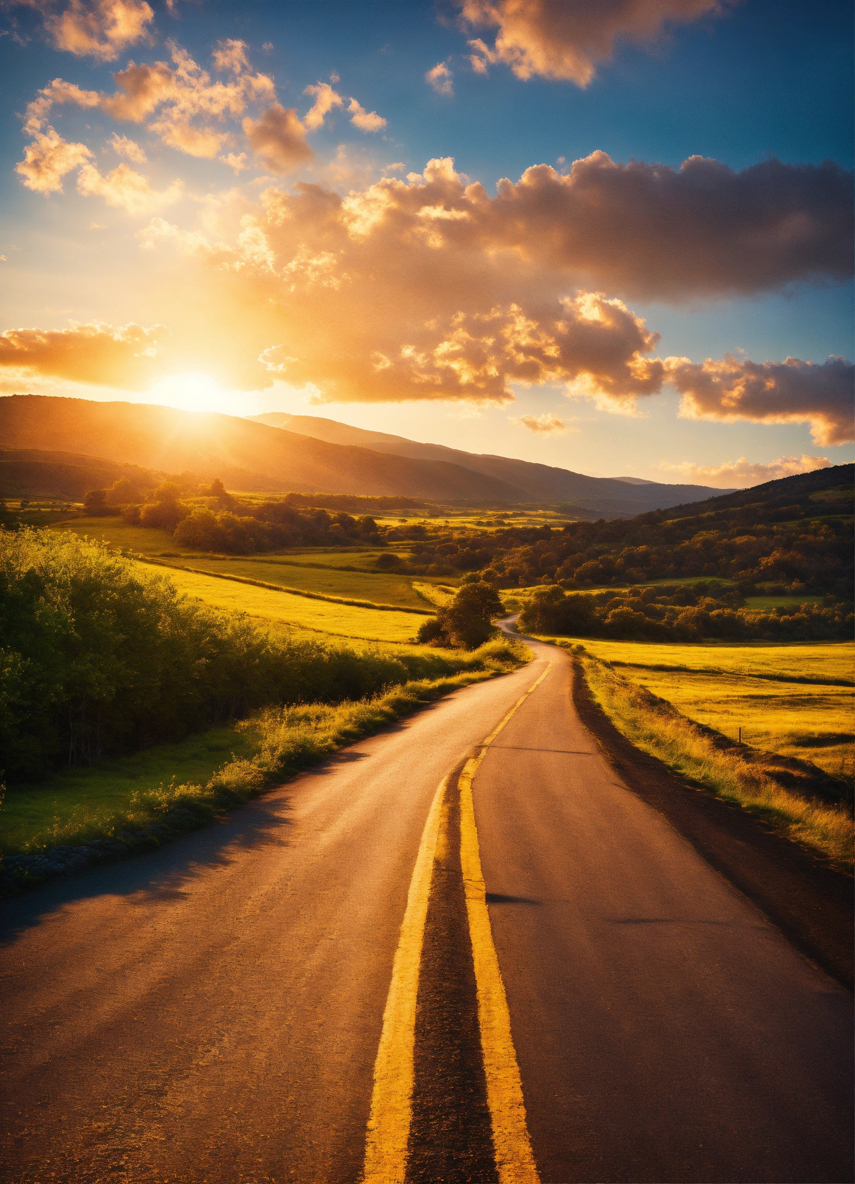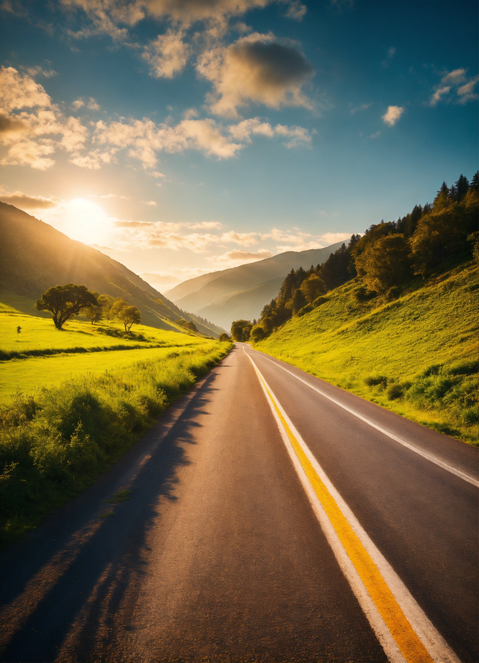 Sunny day, road, landscape photography, natural lighting, breathtaking scenery, serene atmosphere, vibrant colors, picturesque setting, high-quality composition