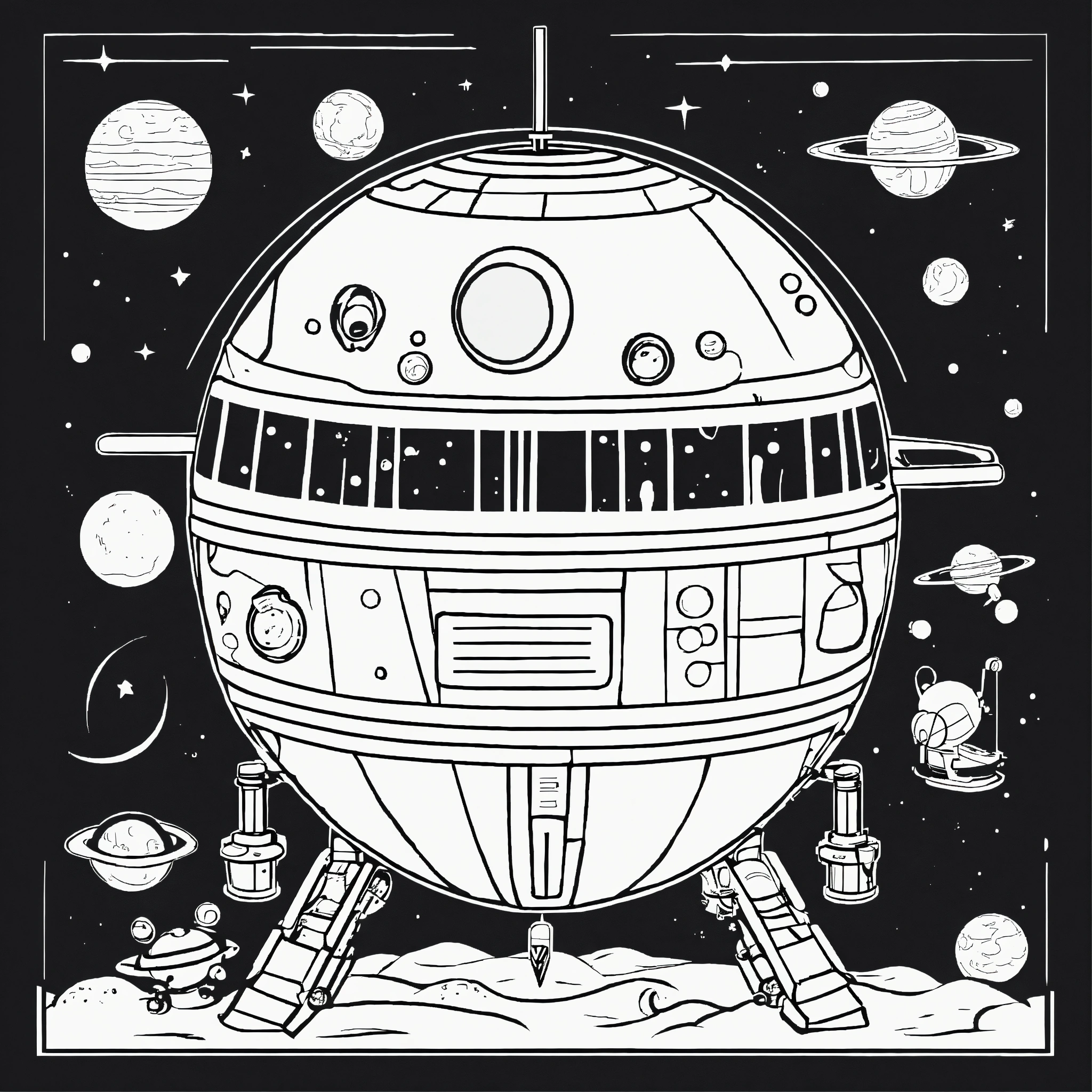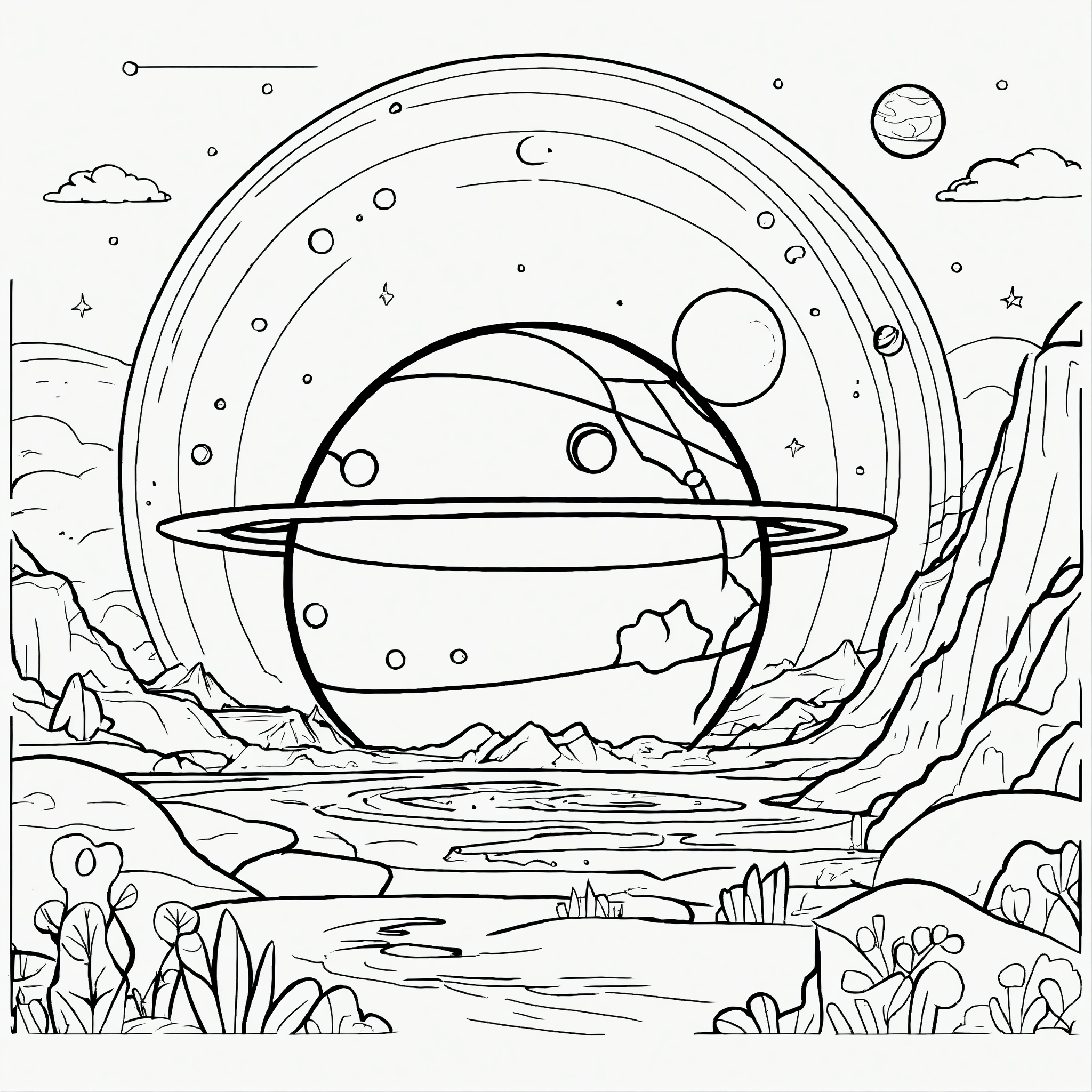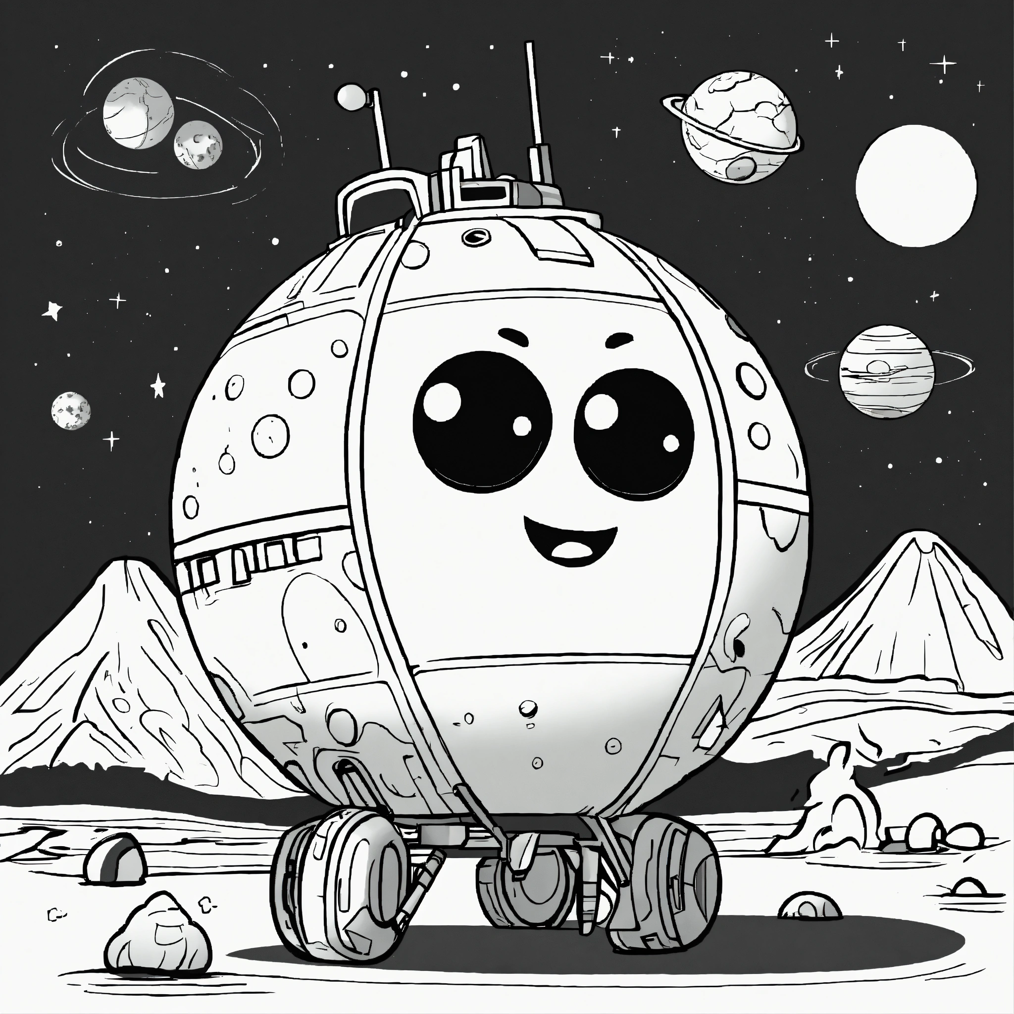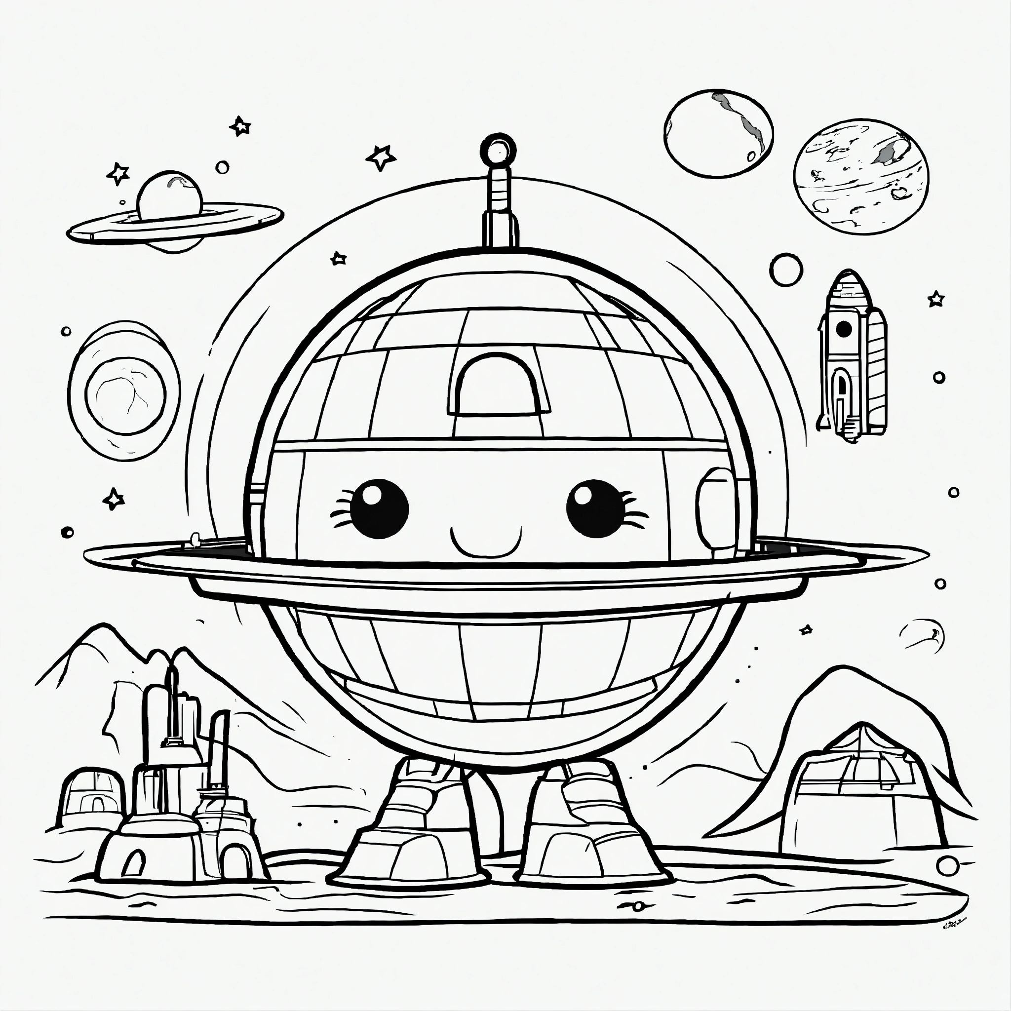 Cartoon cute planet mars for a toddler's, pixar style, simple outline and shapes, black and white coloring book, flat vector, white background, clean line art, studio ghibli studio