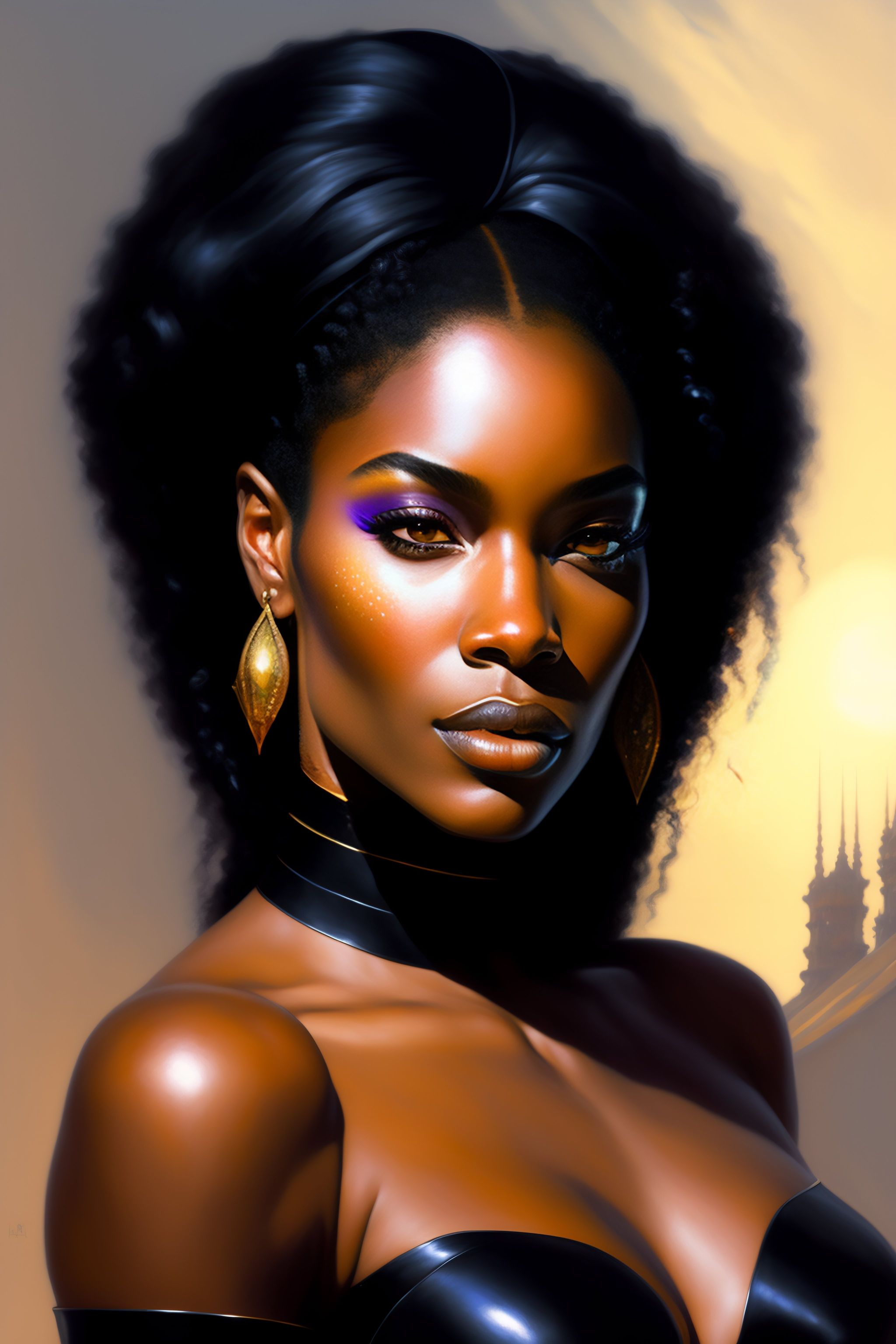 Photorealistic painting of a black female human dragon hybrid, art by donato giancola and greg rutkowski, vintage retro scifi, realistic face, digital art, trending on artstation, symmetry