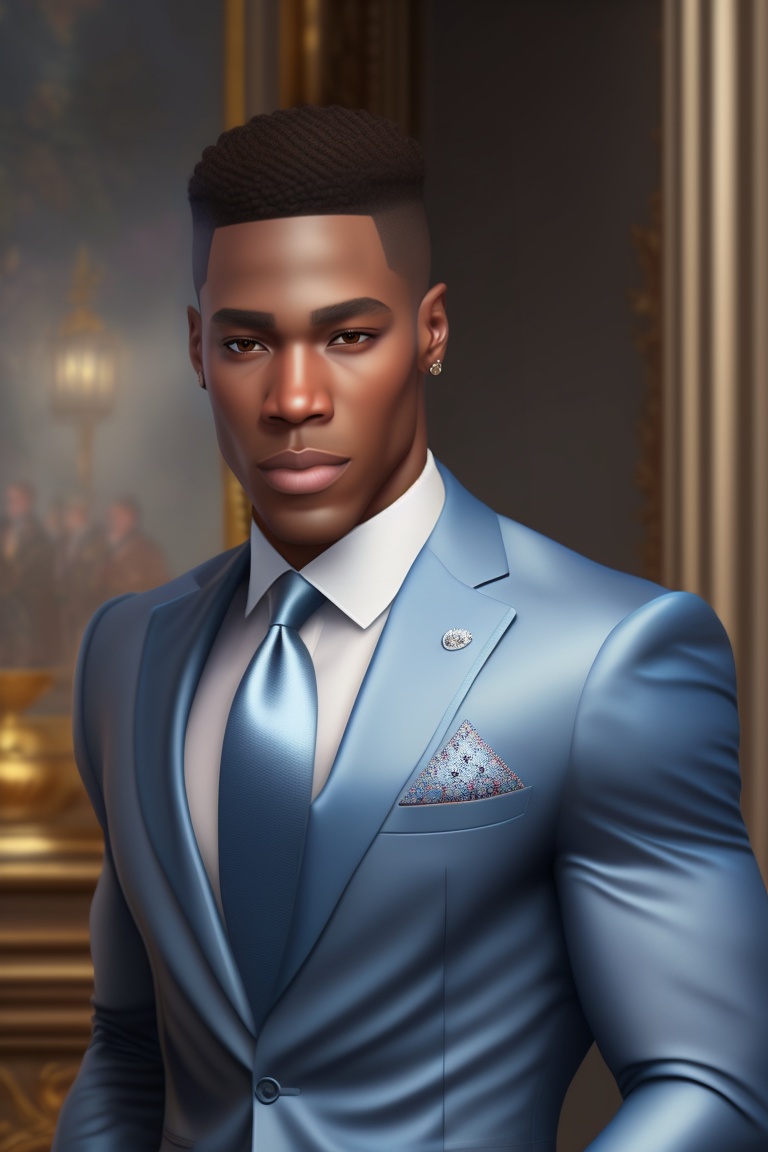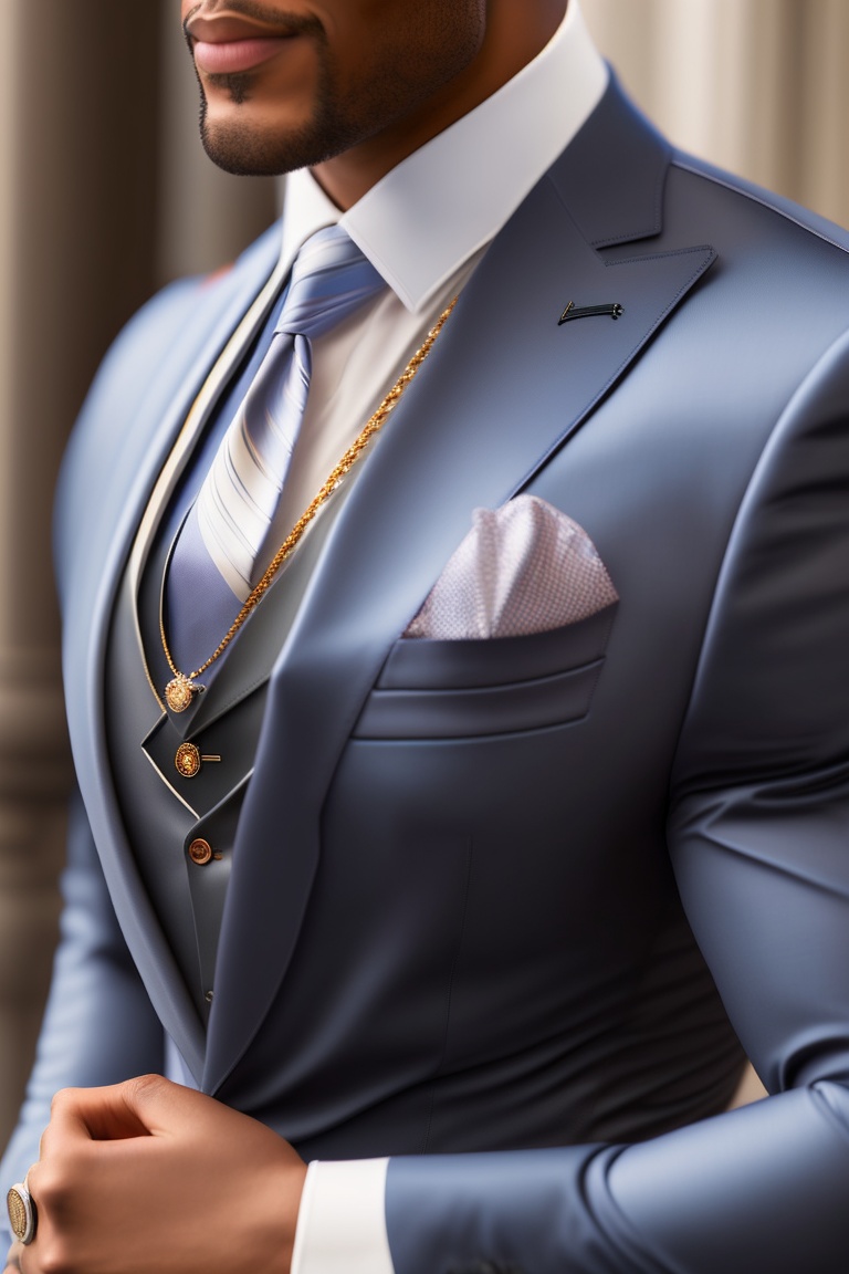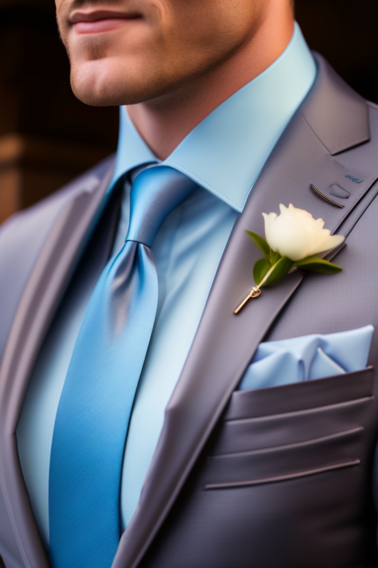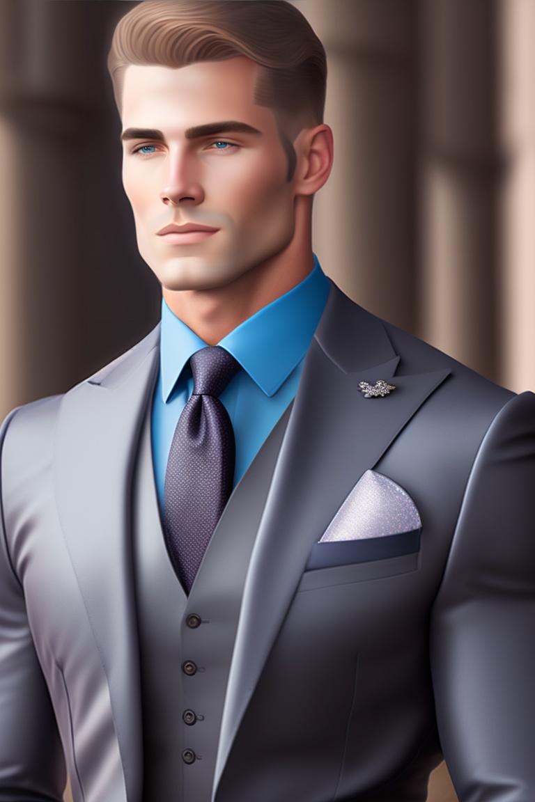 A distinguished gentleman in a charcoal suit, light blue shirt, and silver tie, accessorized with a pocket watch.