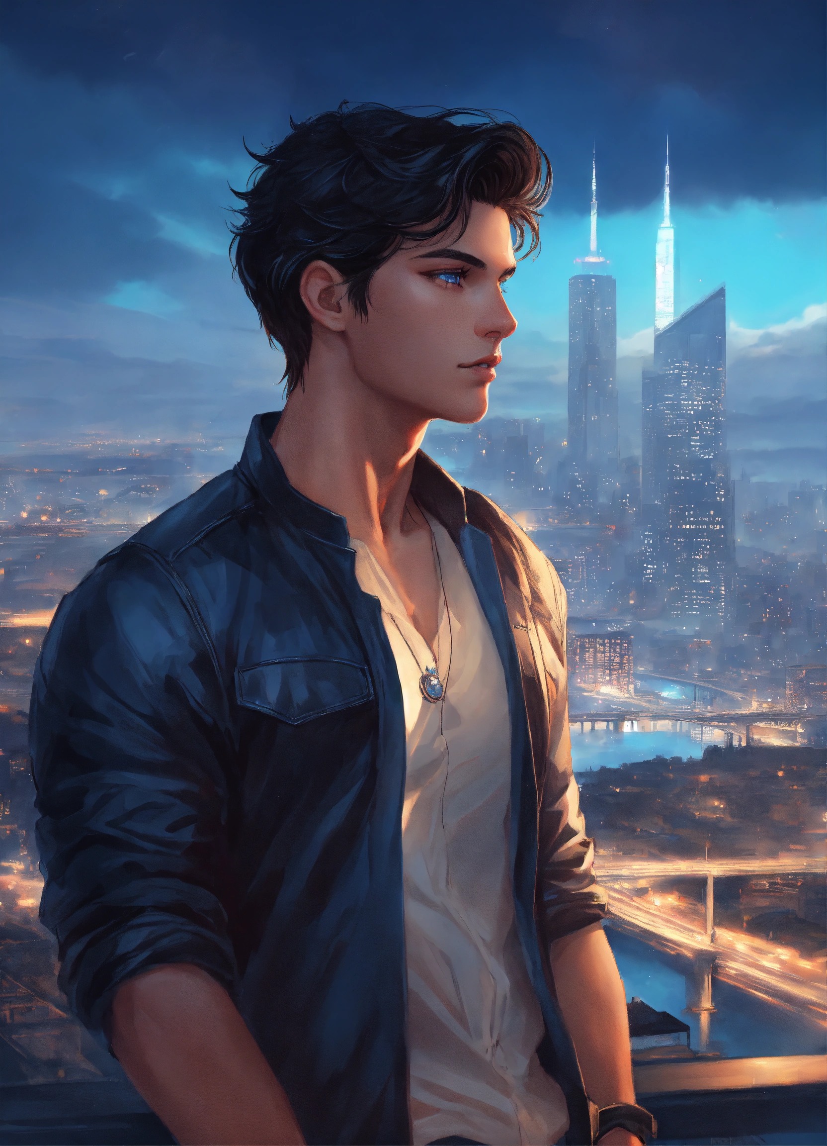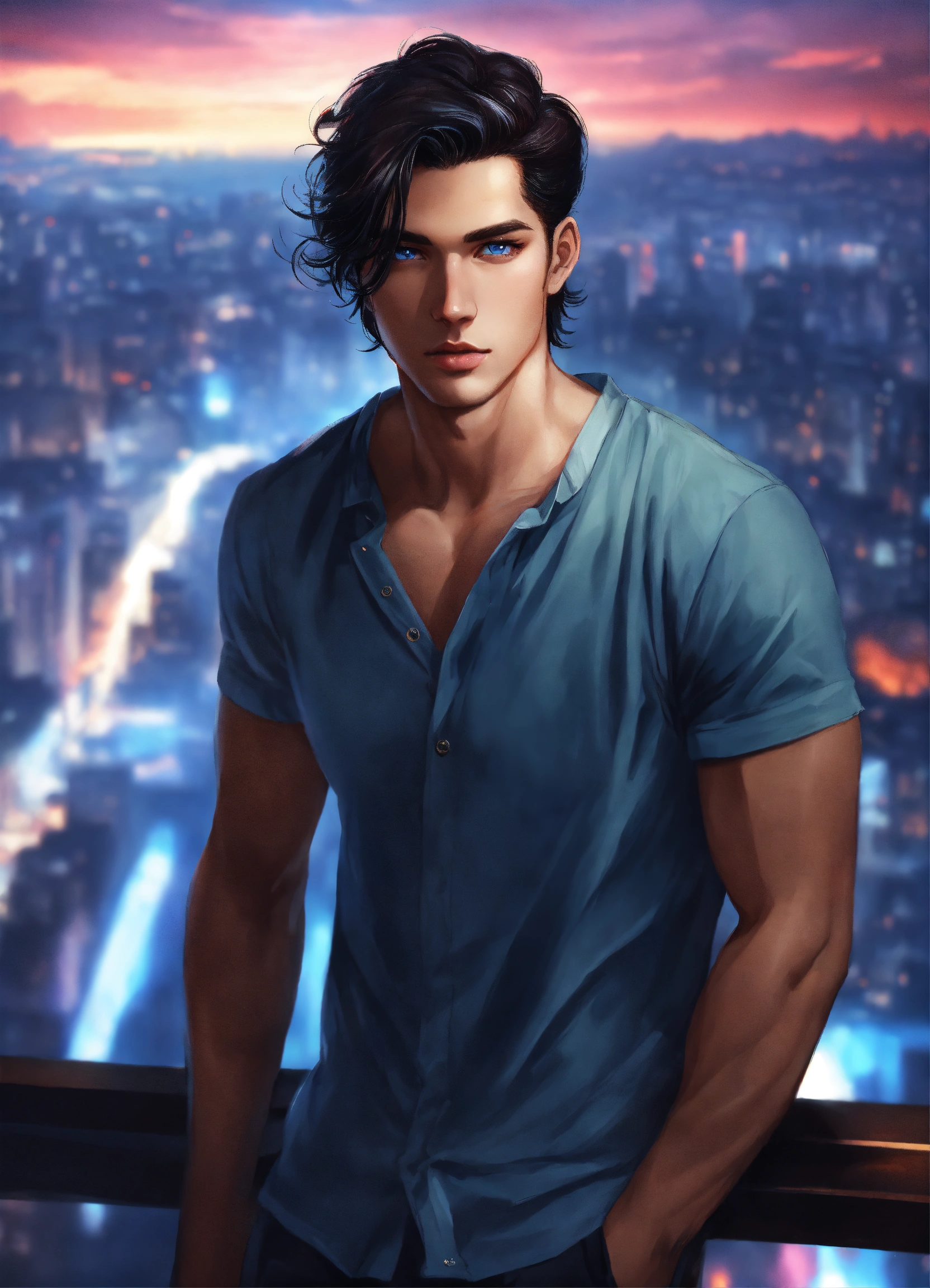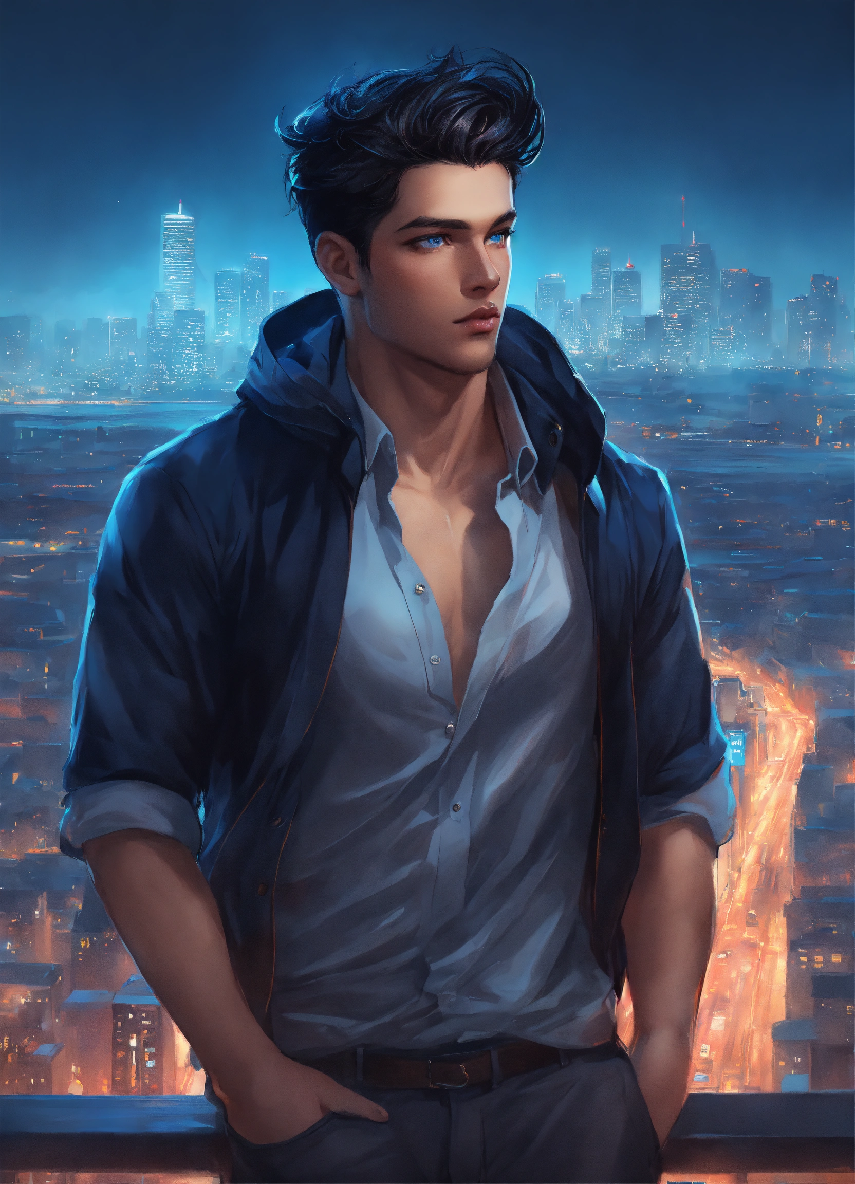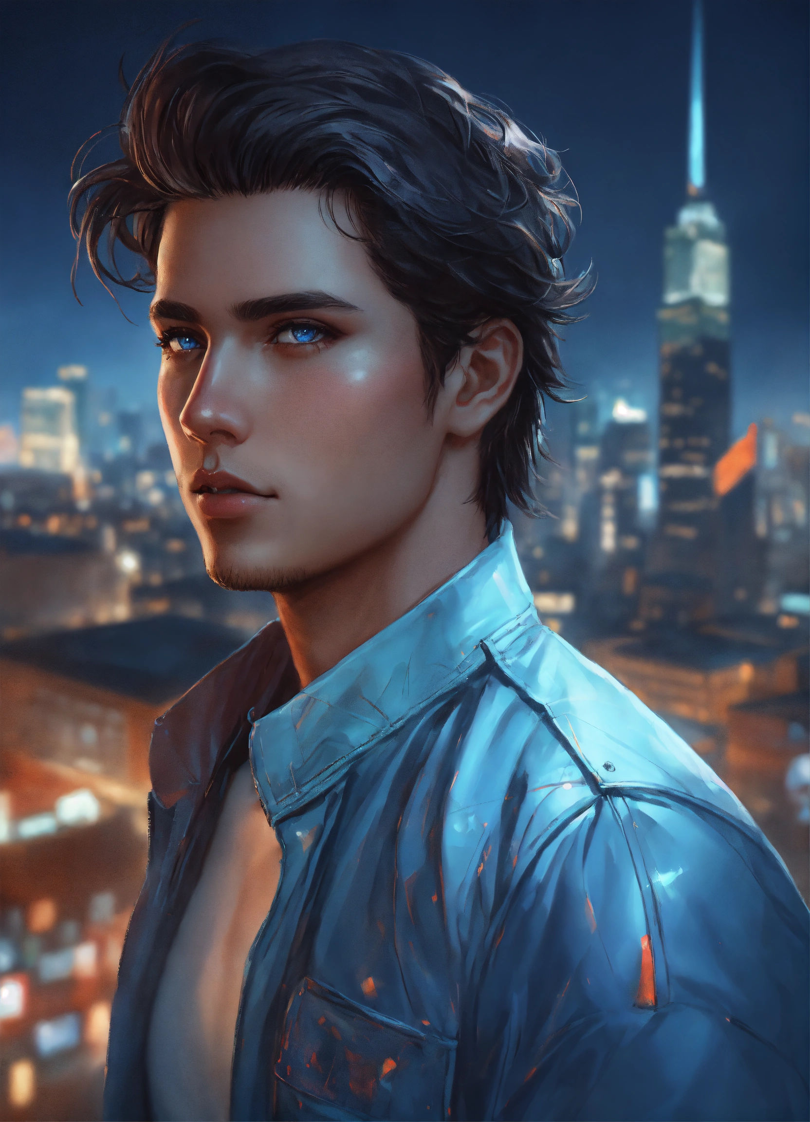 8k, stunning intricate details, by artgerm, male. 25 years old. city in the background. black hair. light blue eyes. modern clothes. night time. tanner buchanan