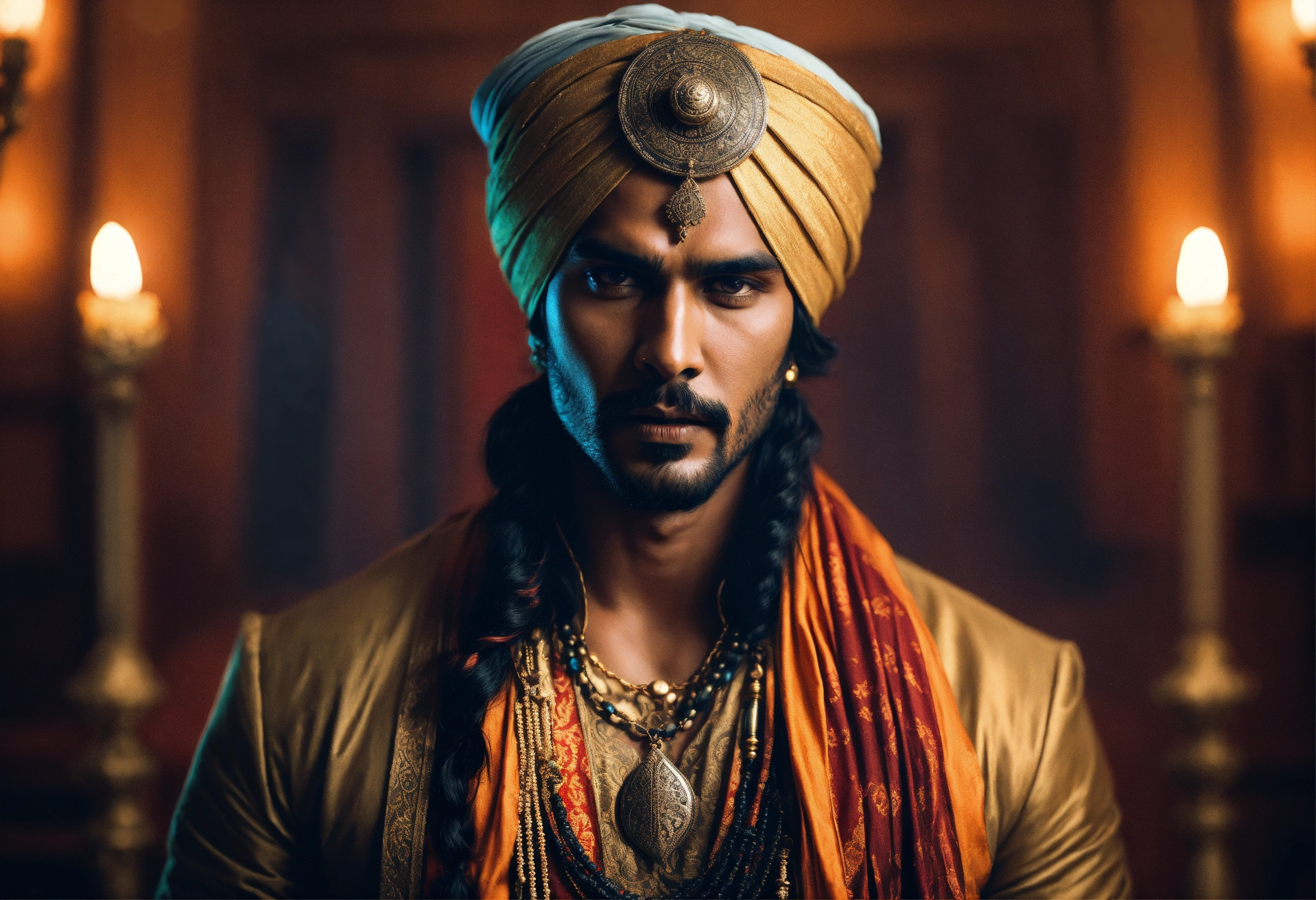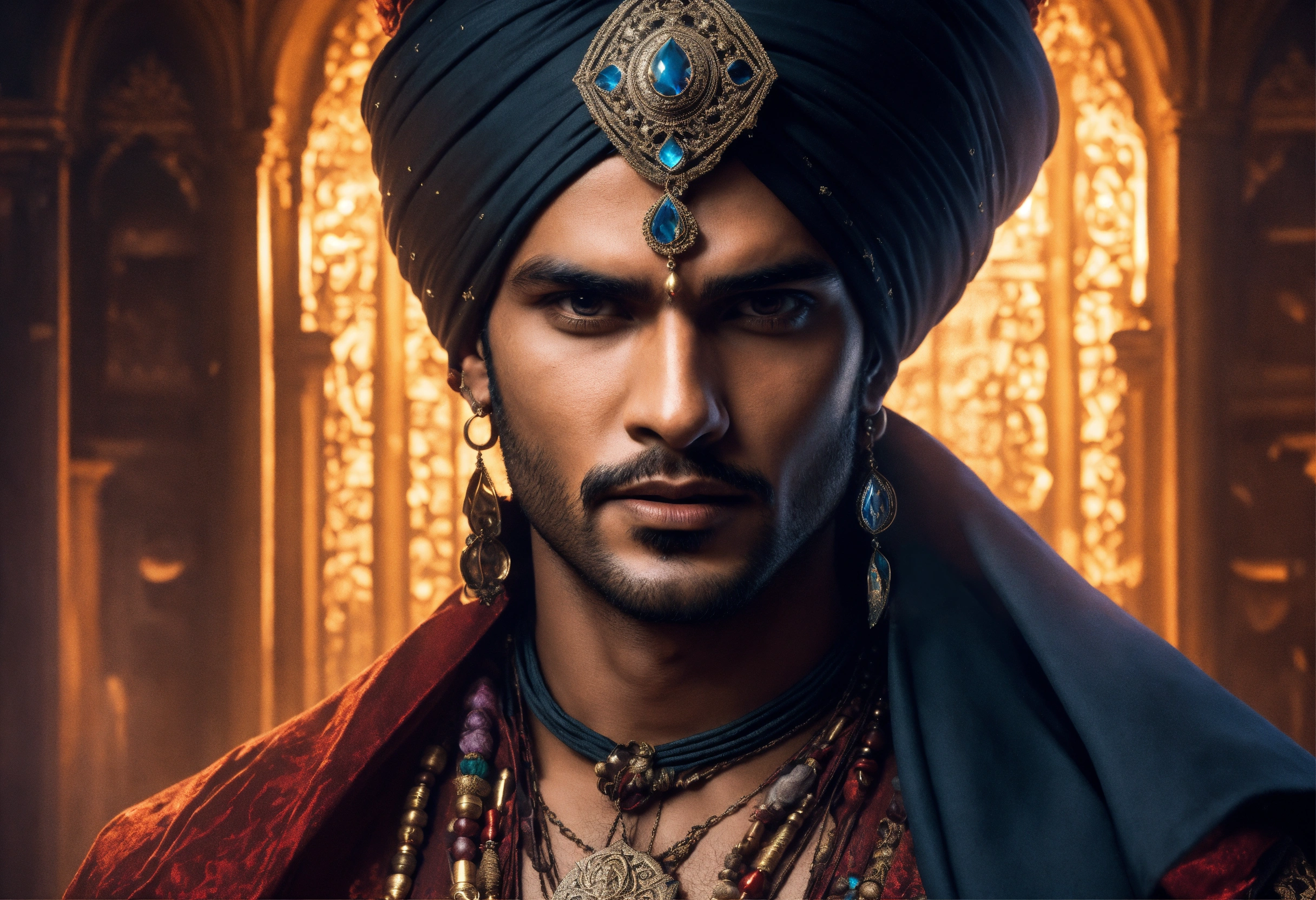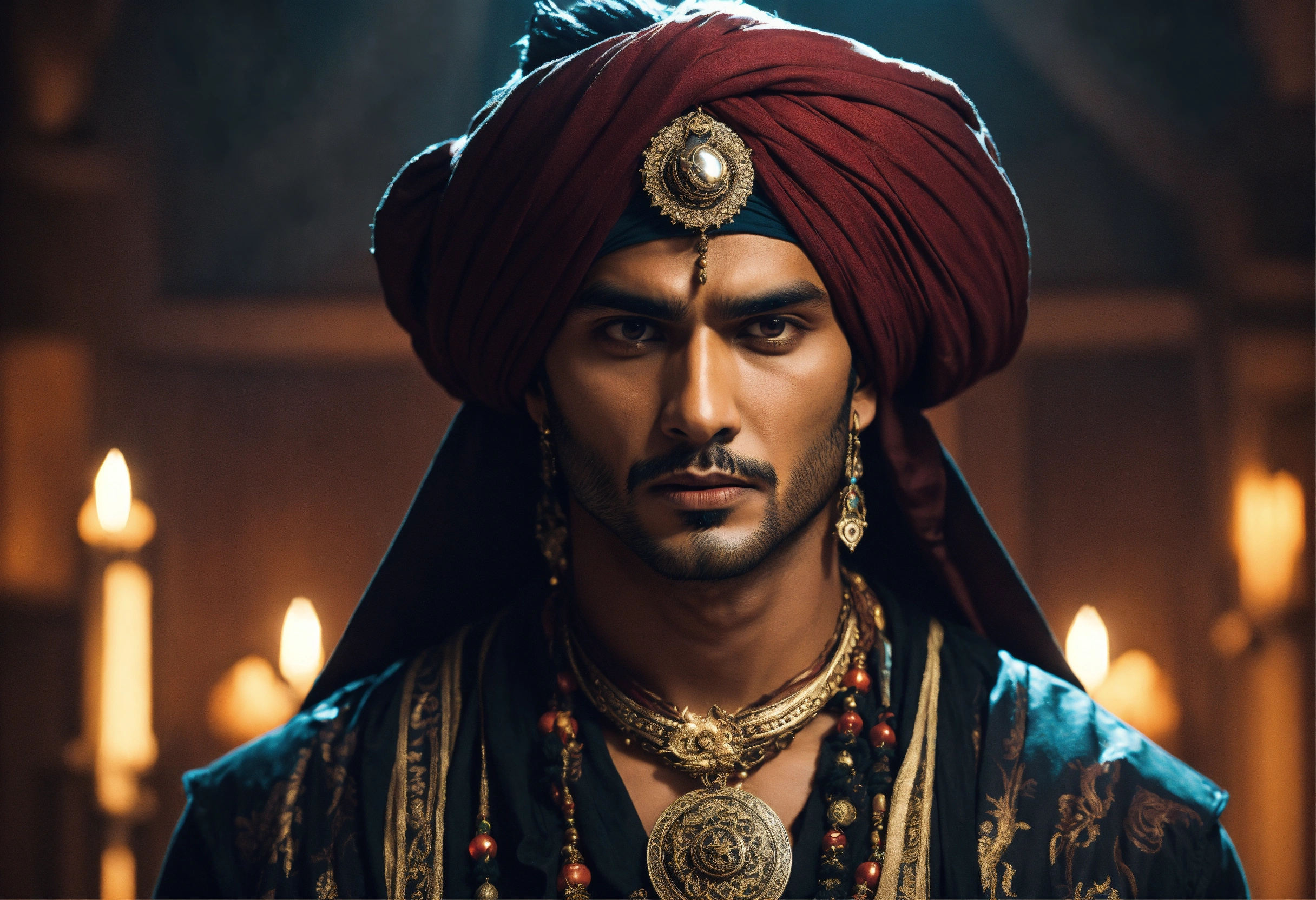 Young handsome evil indian male warlock, supernatural amulet, turban, ominous palace, sinisterly dim.