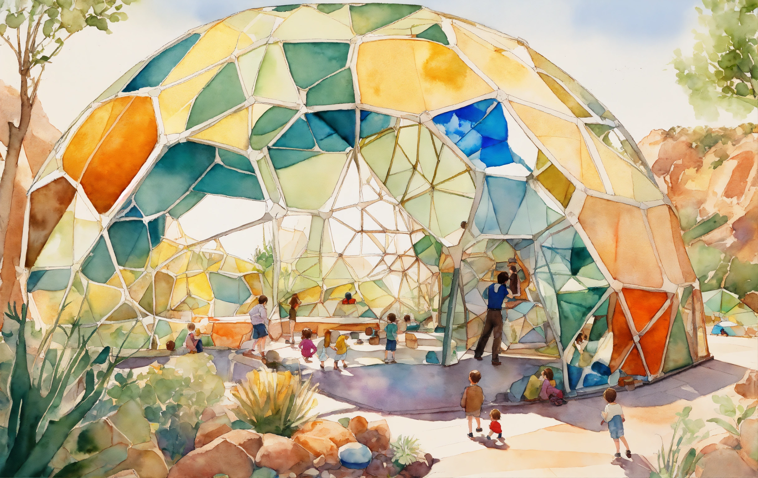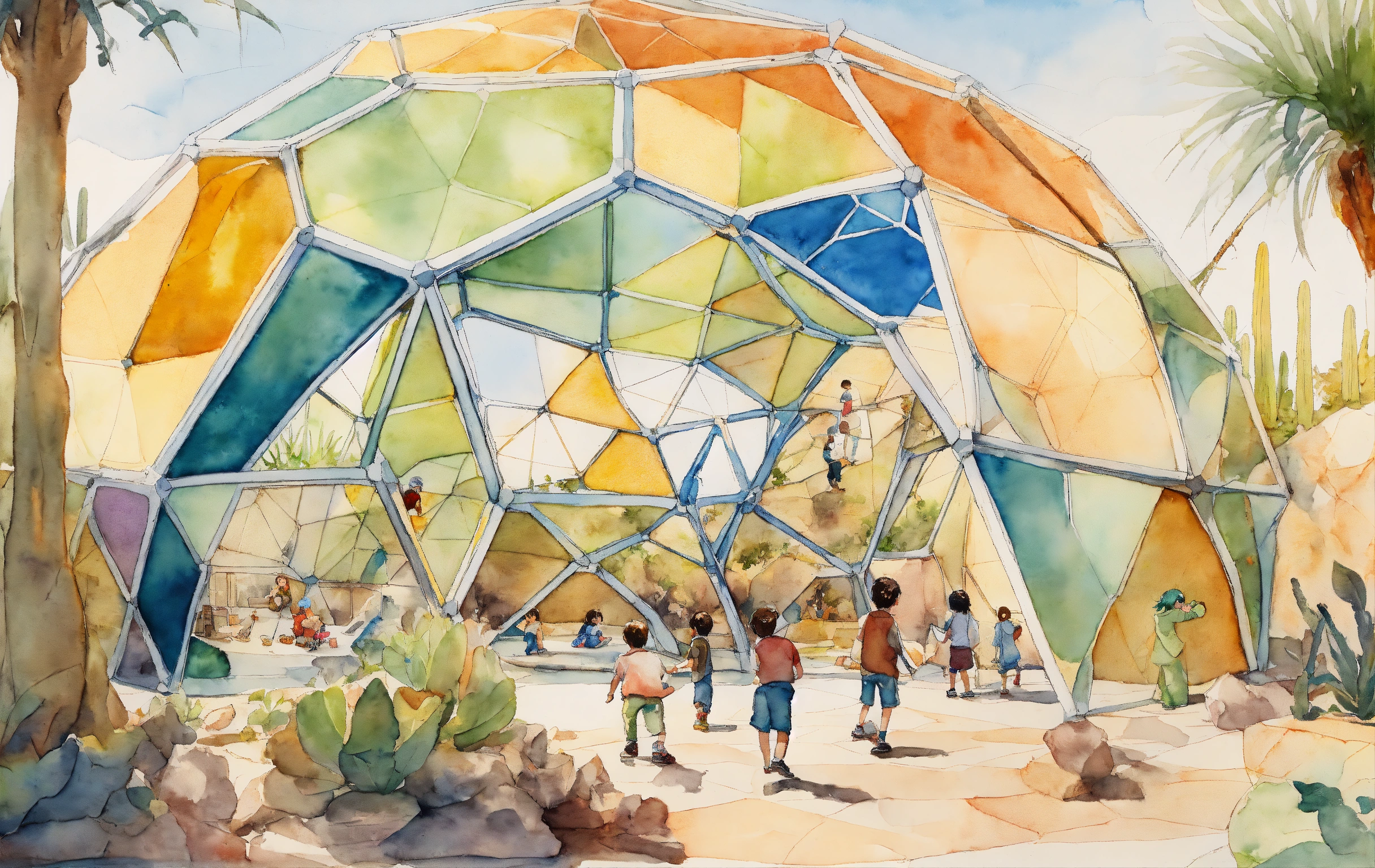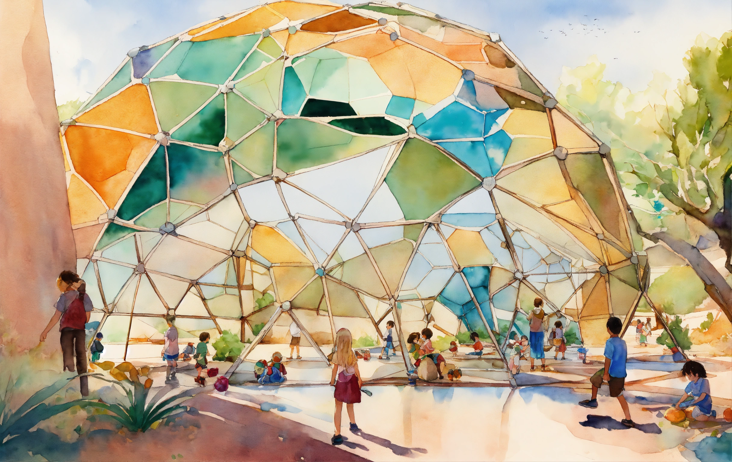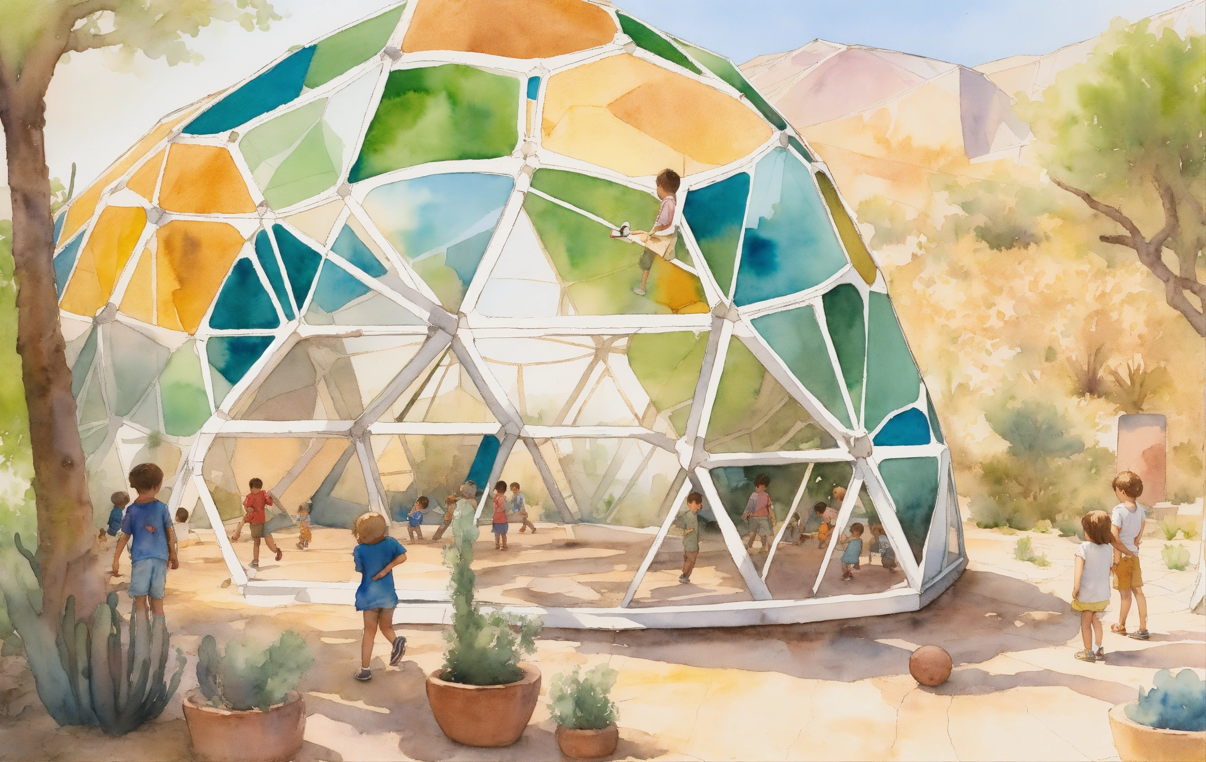 Beautiful muted watercolor painting of lots of kids playing under a series of geodesic frameworks of voronoi shaped galvanized steel meshes that form incomplete but interlinked geodesic arcs rising out of a sonoran desert landscape, vines growing up the side of the arcs, some transparent colored glass fills some of the openings in the domes, the kids and their parents are doing adventurous construction and play activities beneath the arced structures, insane detail, vines and colored glass are providing shade, style of buckminster fuller, colorful details