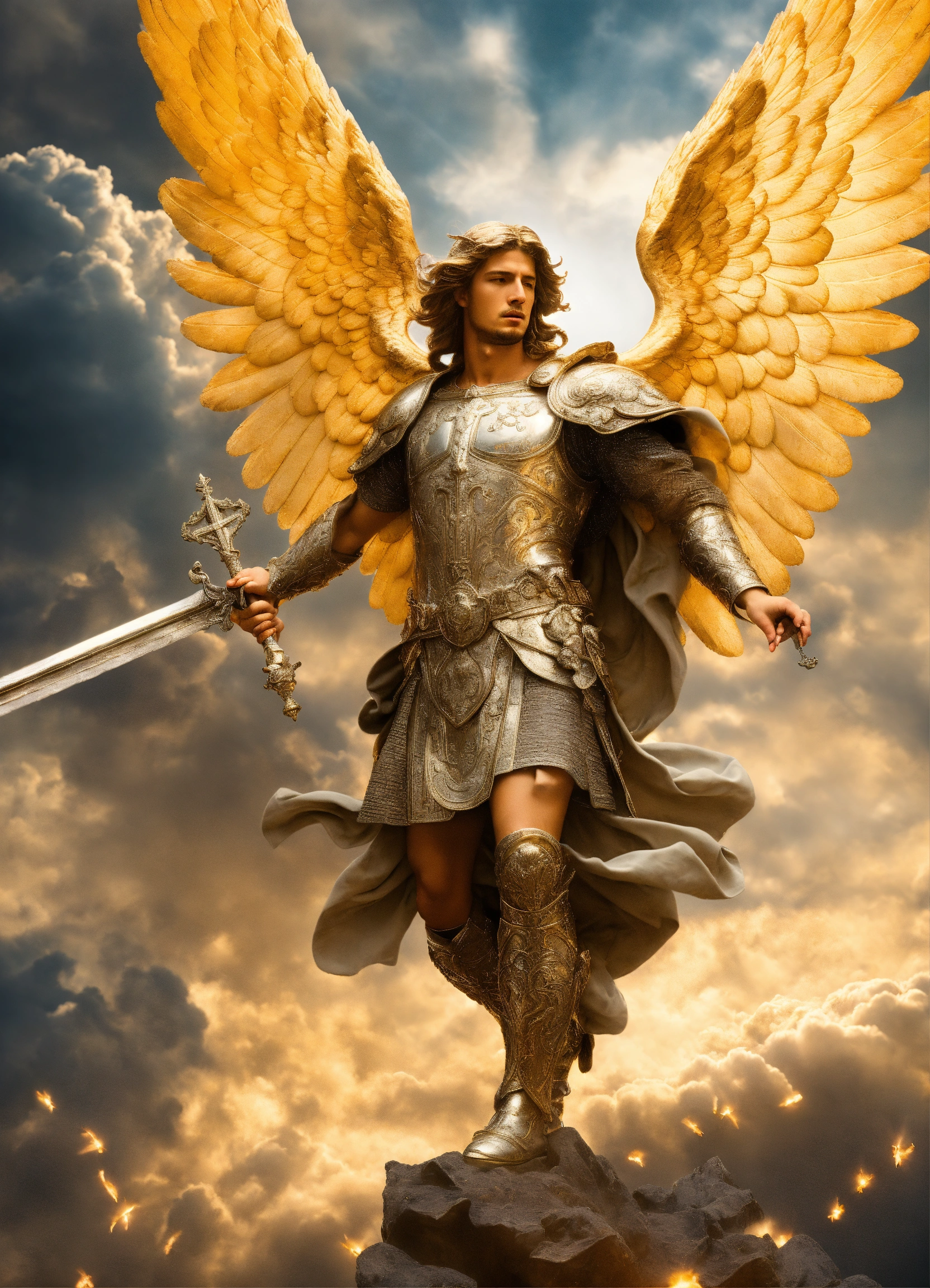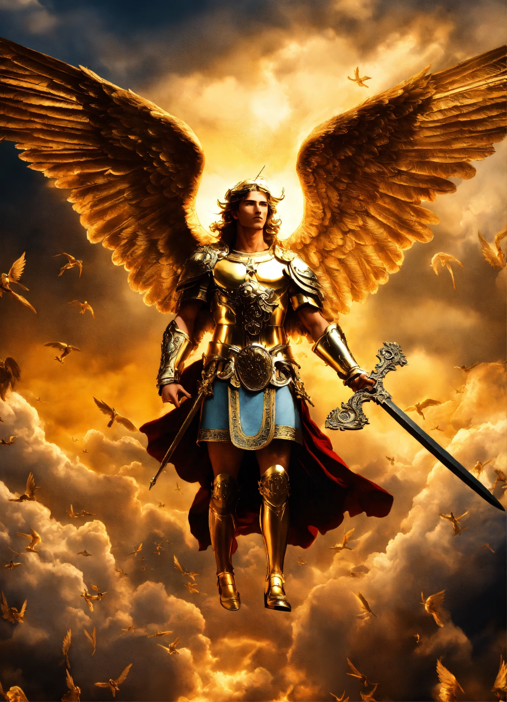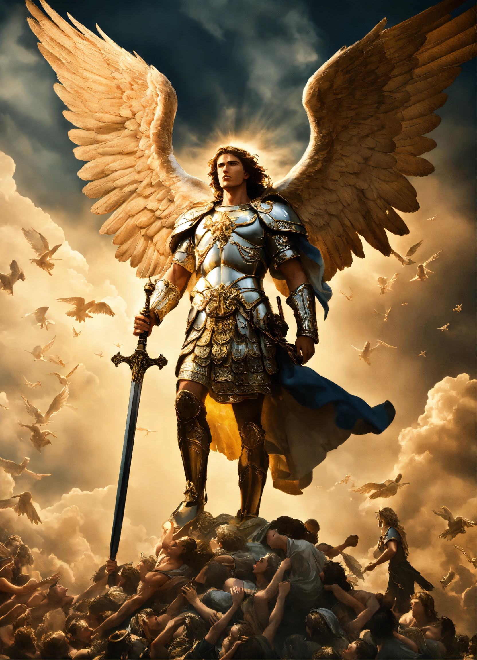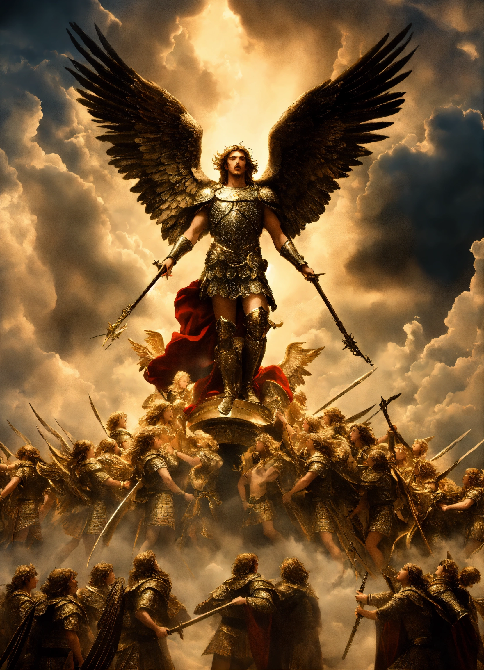 St. michael the archangel in all his heavenly glory, leading a massive army of angels in a charge from the clouds down from the sky. surrealistic photograph, supernatural, awe-inspiring, terrifying, fantasy-inspired, 8k, fearsome
