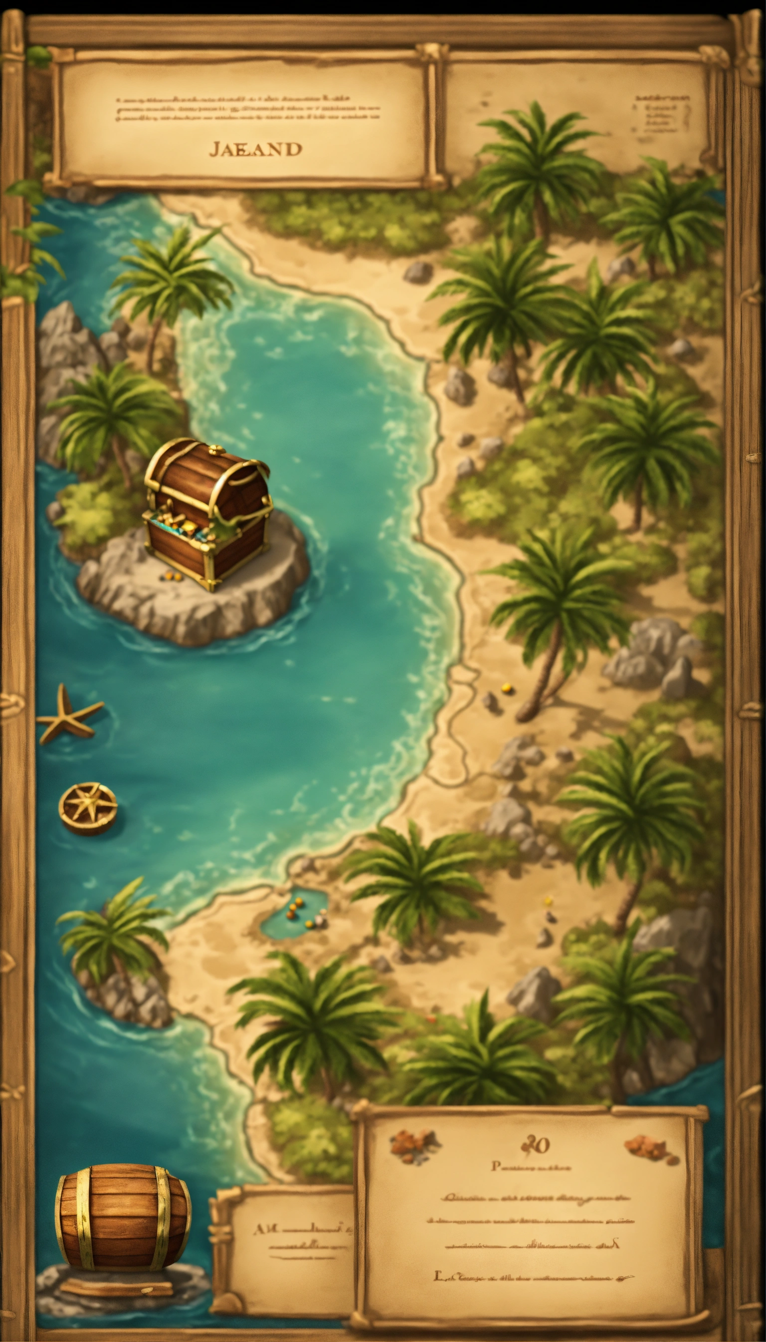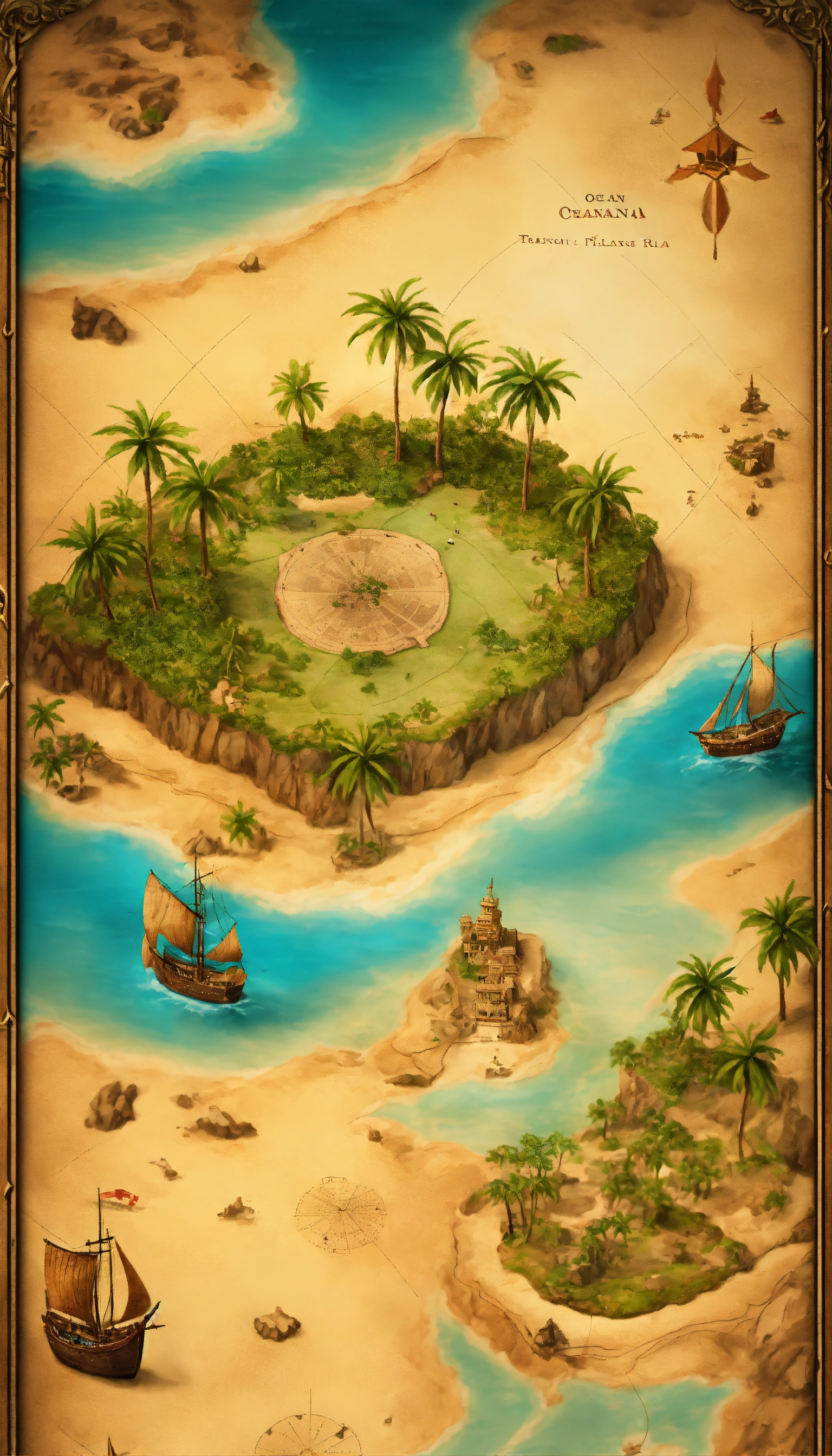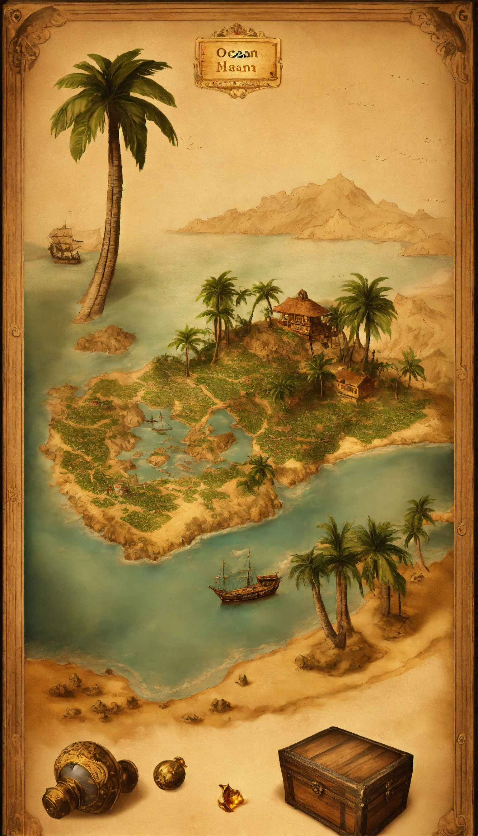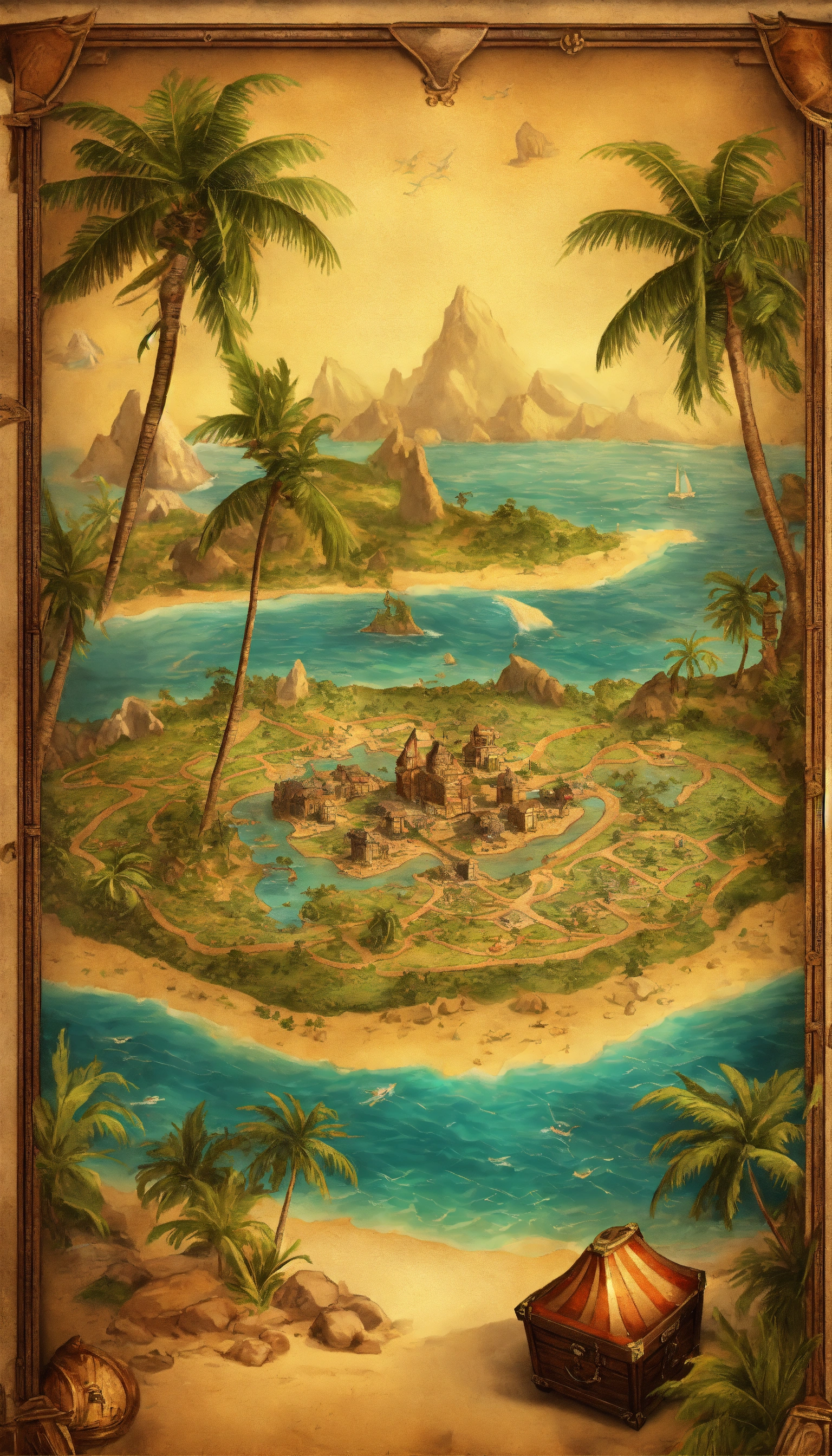 An old ancient map, ocean with palms on a island, 8k, detailed hd, realistic, board game type with treasure chest on it