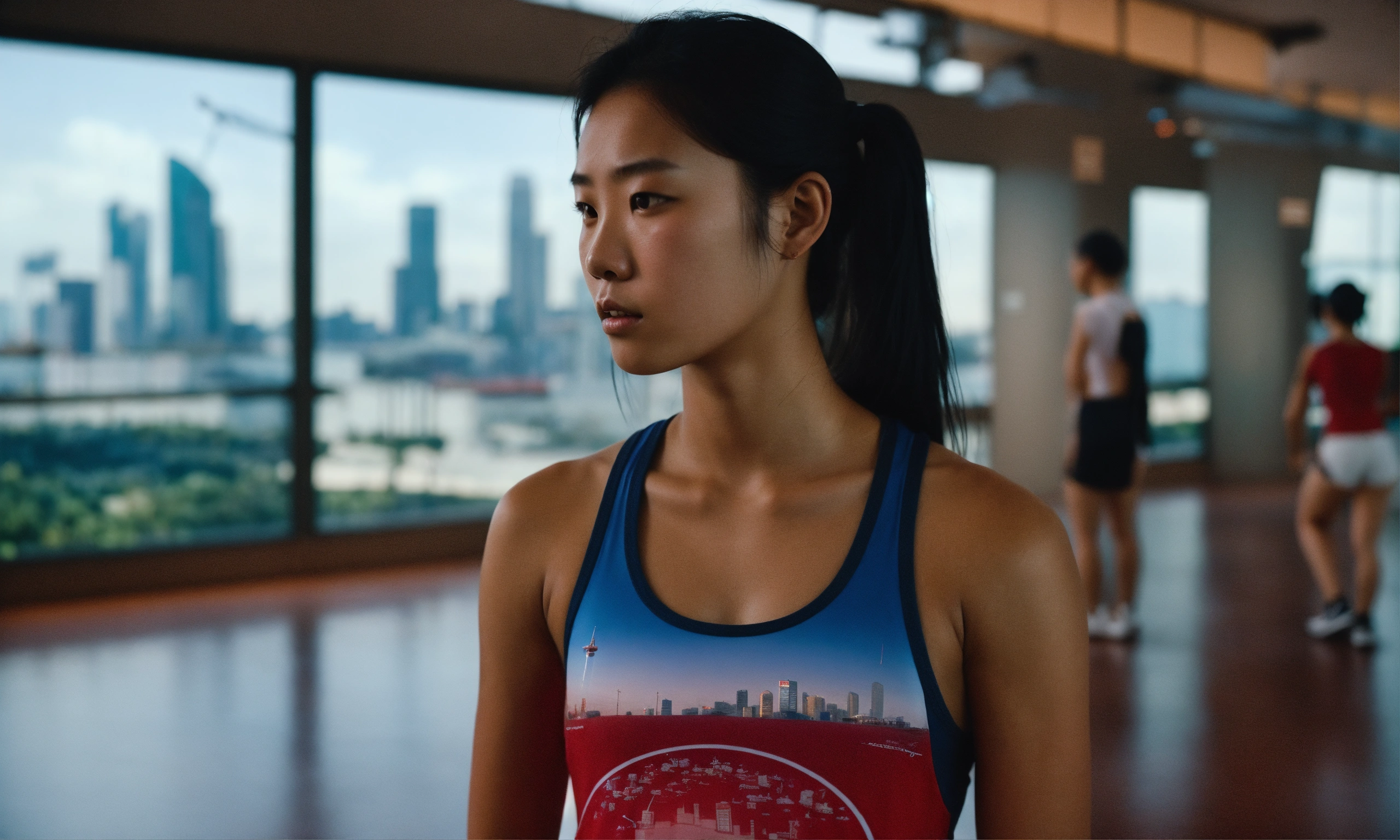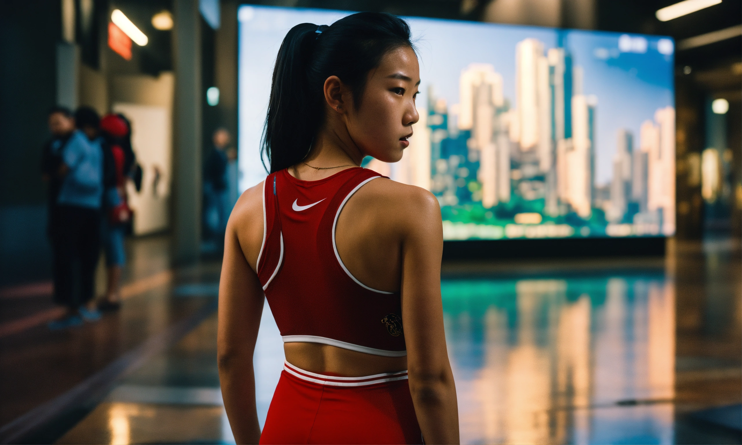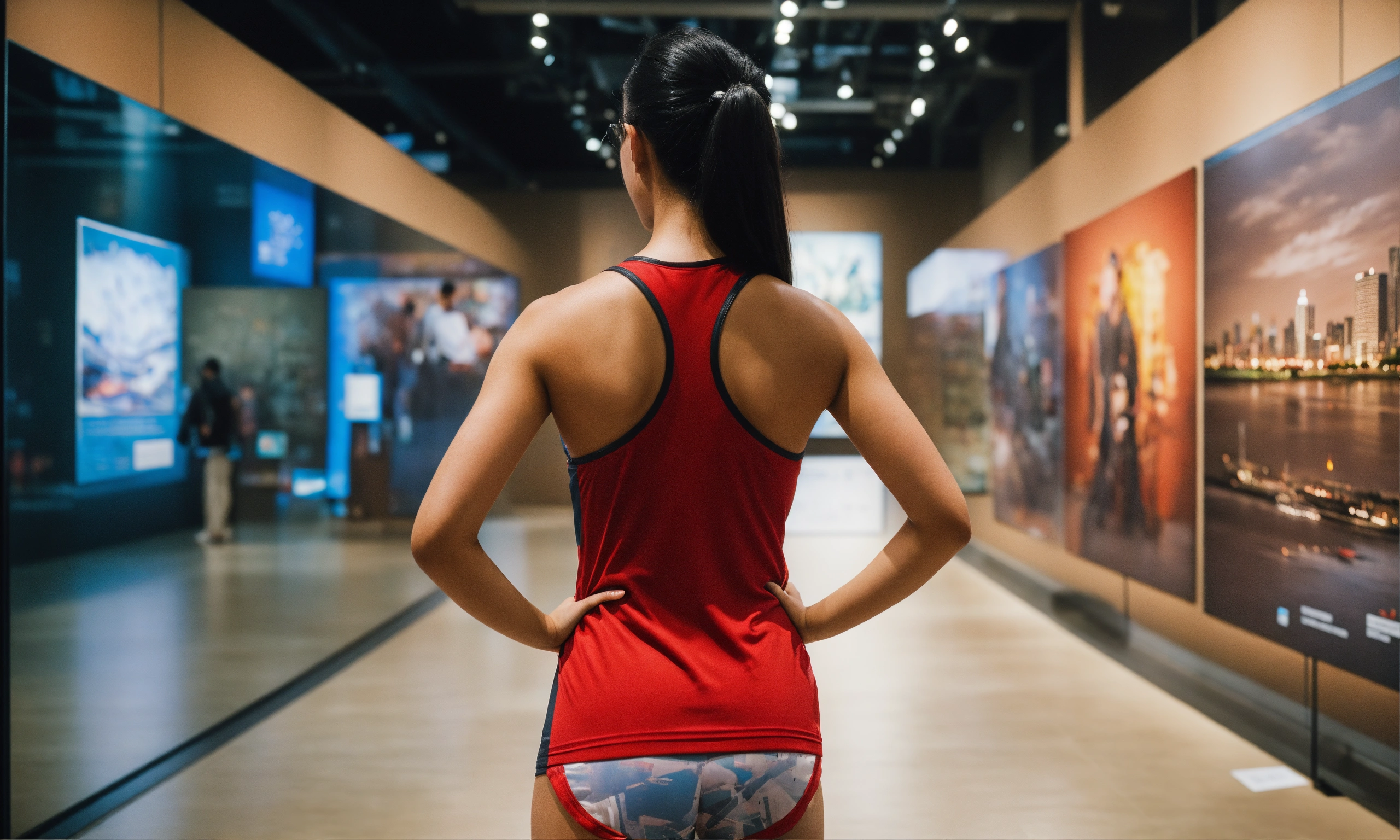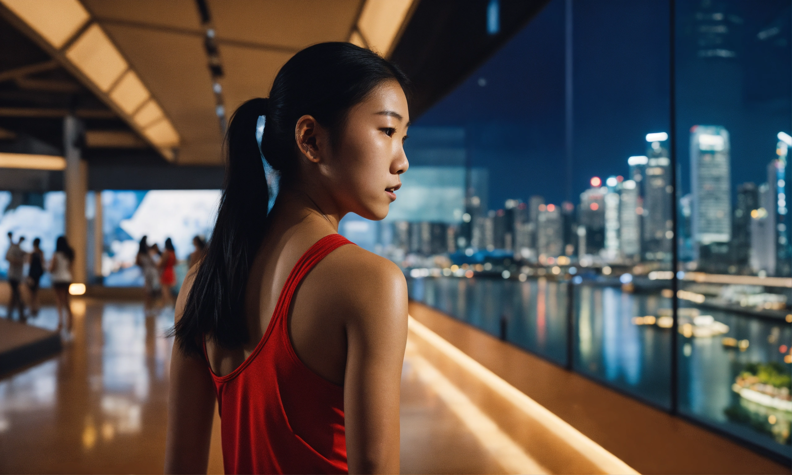 Ultra-realistic back medium shot of a tanned 18-year old asian female athlete, surprise expression, plain red singlet in a next-gen museum in singapore, on one side is a singapore's cityscape or central business district, on the other side is highly detailed augmented reality screen with a fishing village, sci-fi, modern nostalgia, breathtaking, highly detailed, cinematic, 70mm camera, portra 800 film, film grain, reflections on glossy museum floor