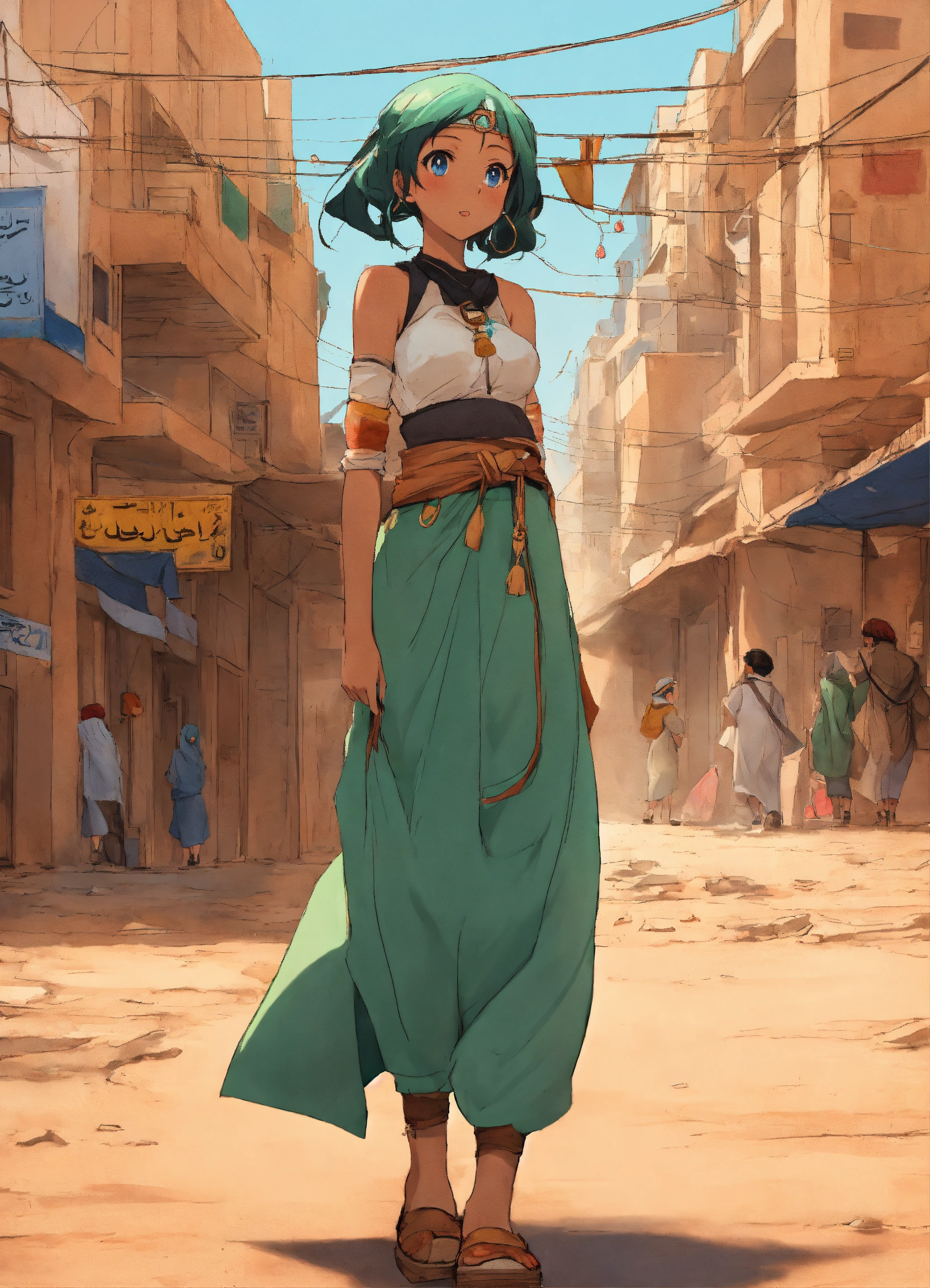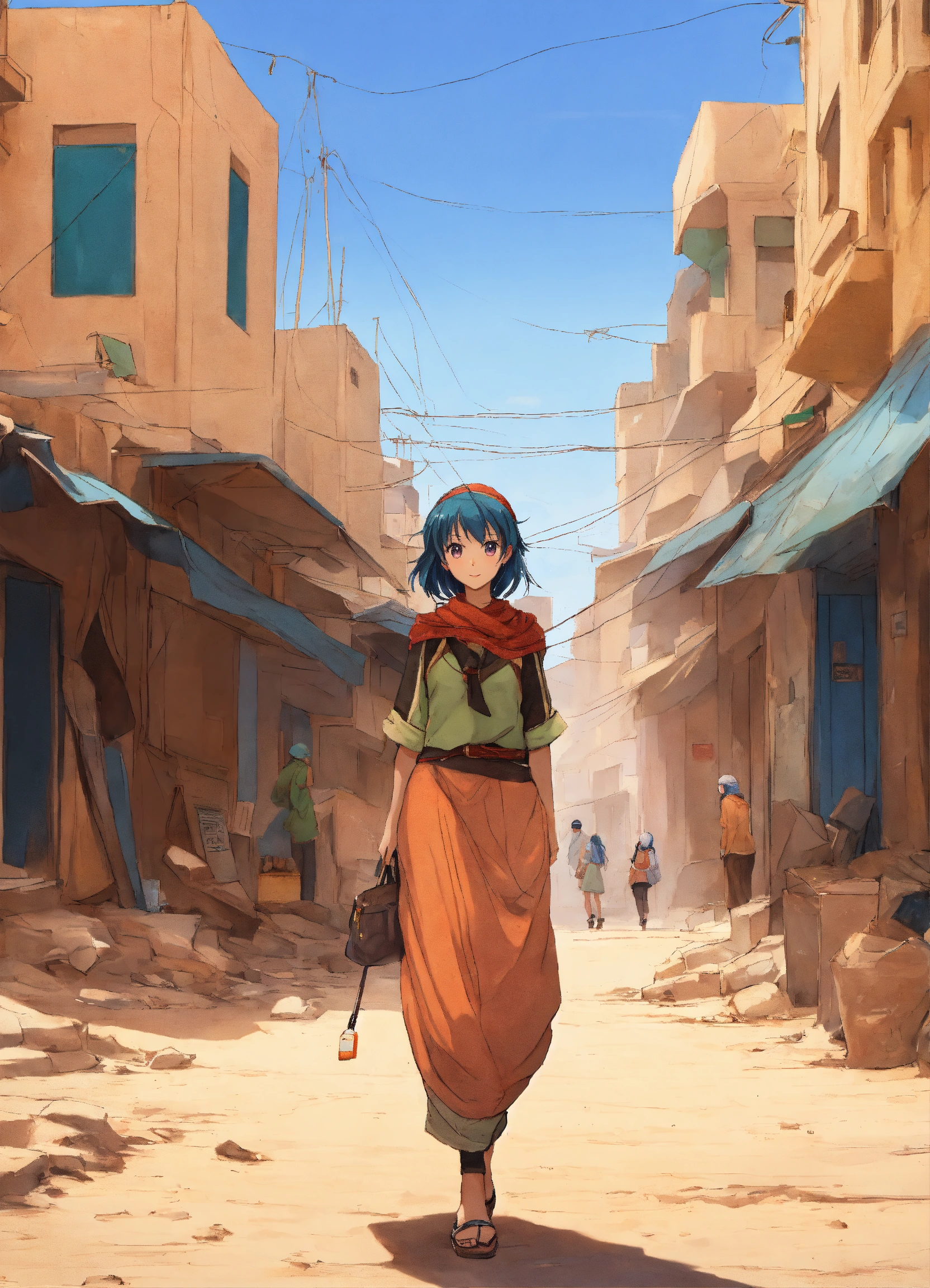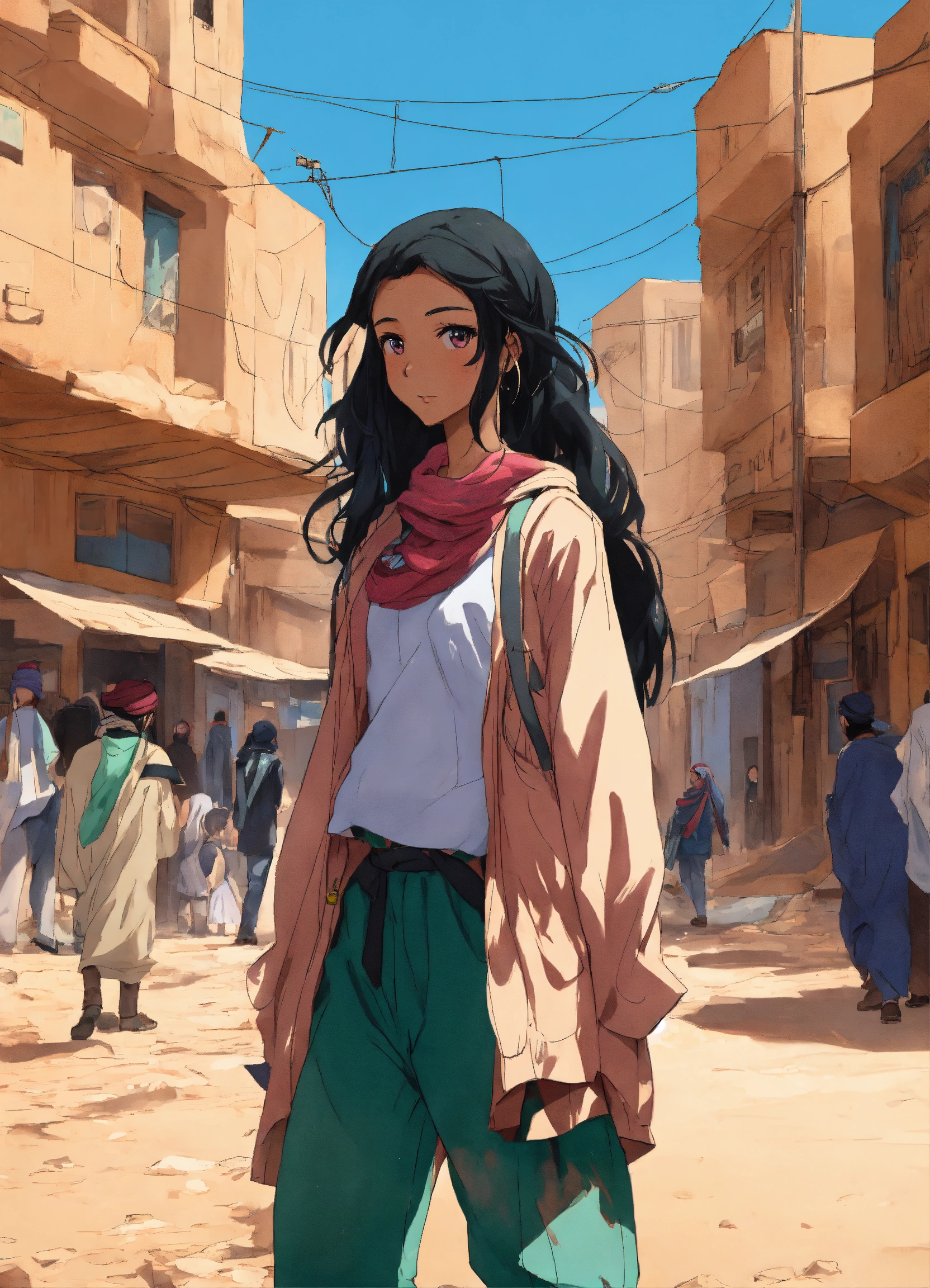Anime girl in the streets of a city in the western sahara