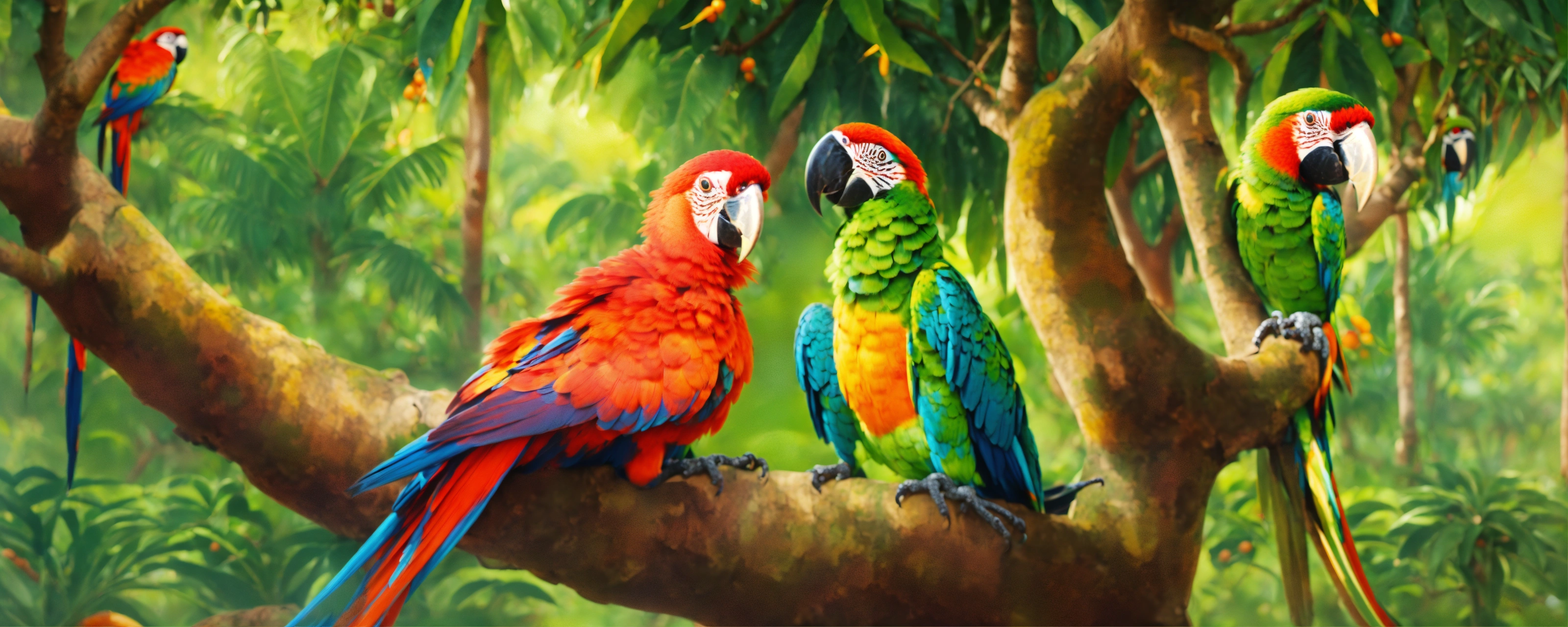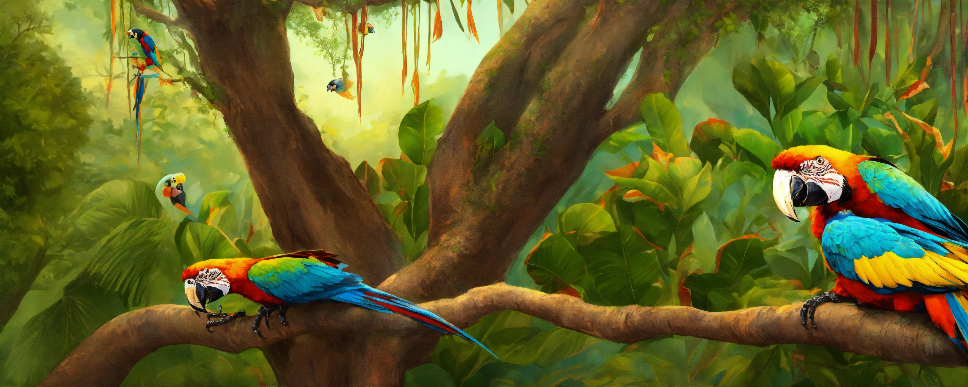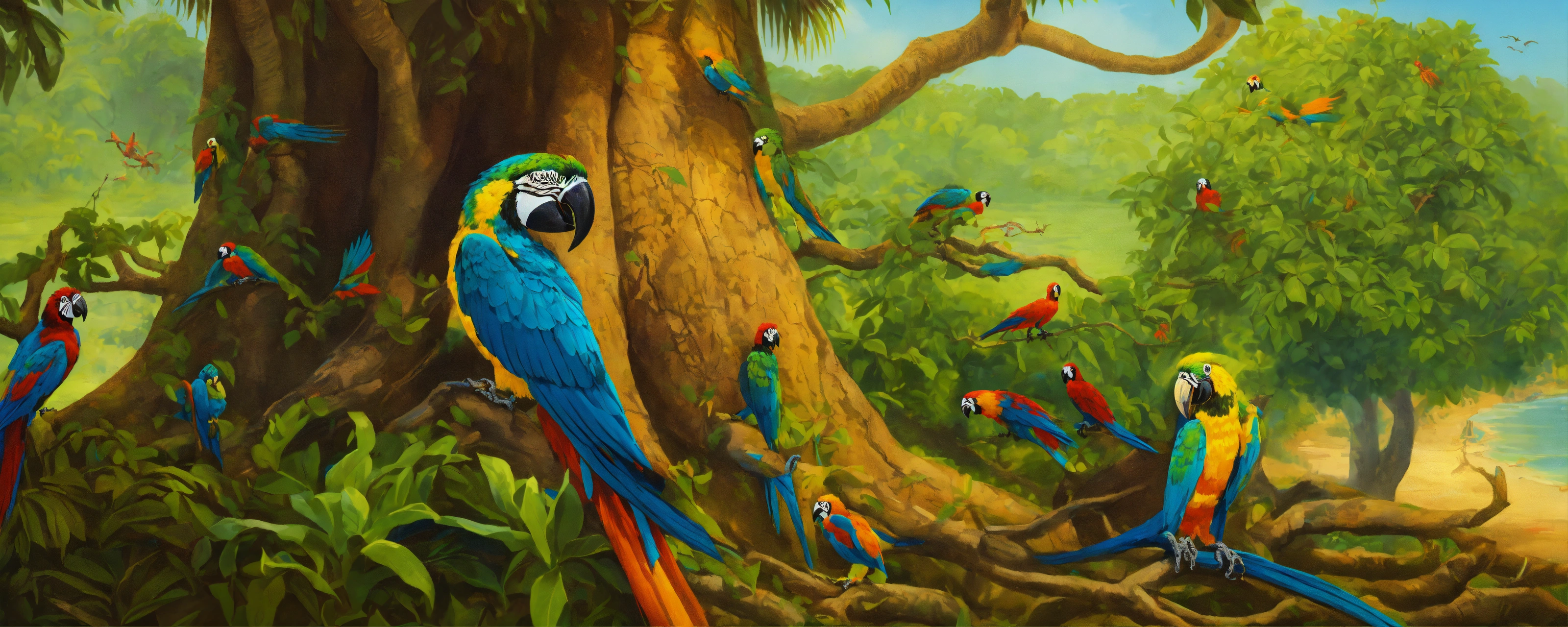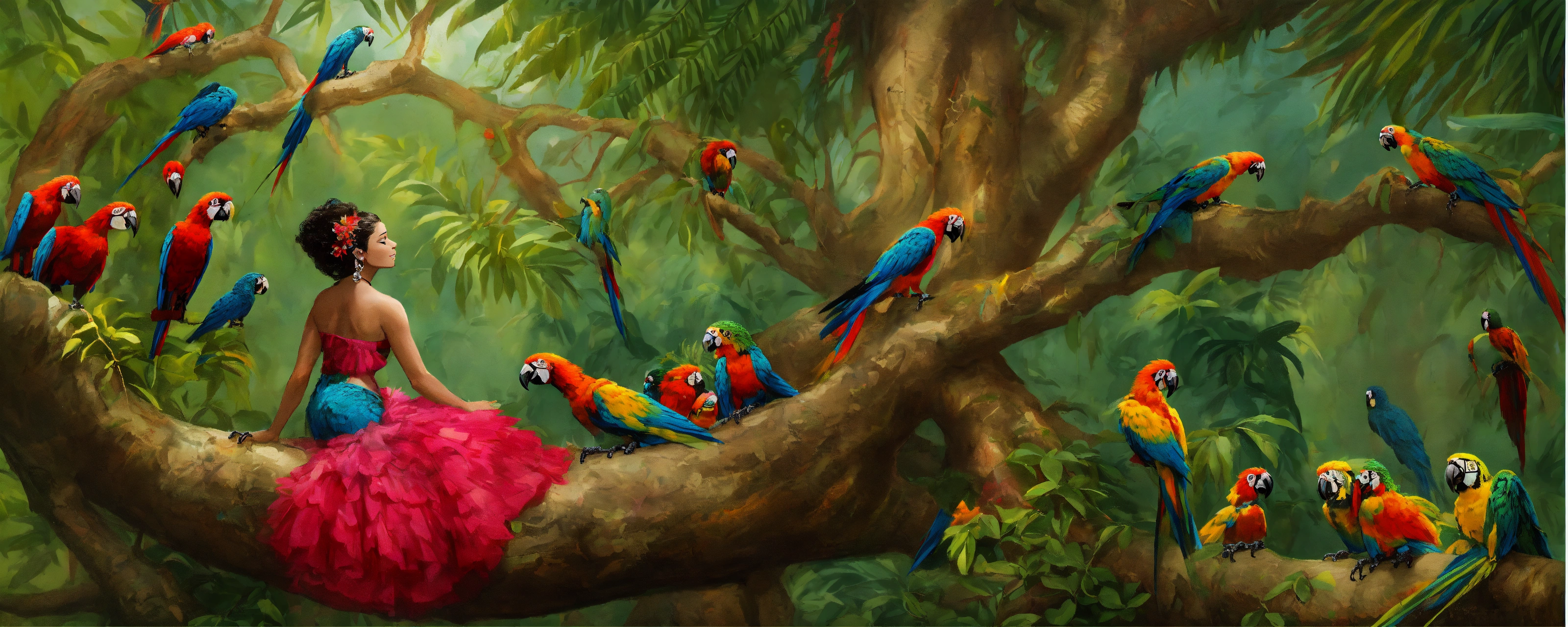 A woman whose legs turn into the trunk of a mango tree, her hair is the bushy part of the tree. macaws, coquis, iguanas, salamanders surround the woman