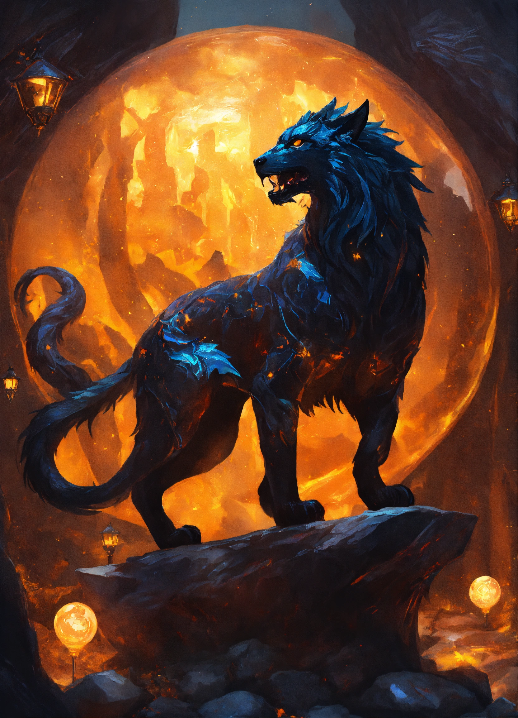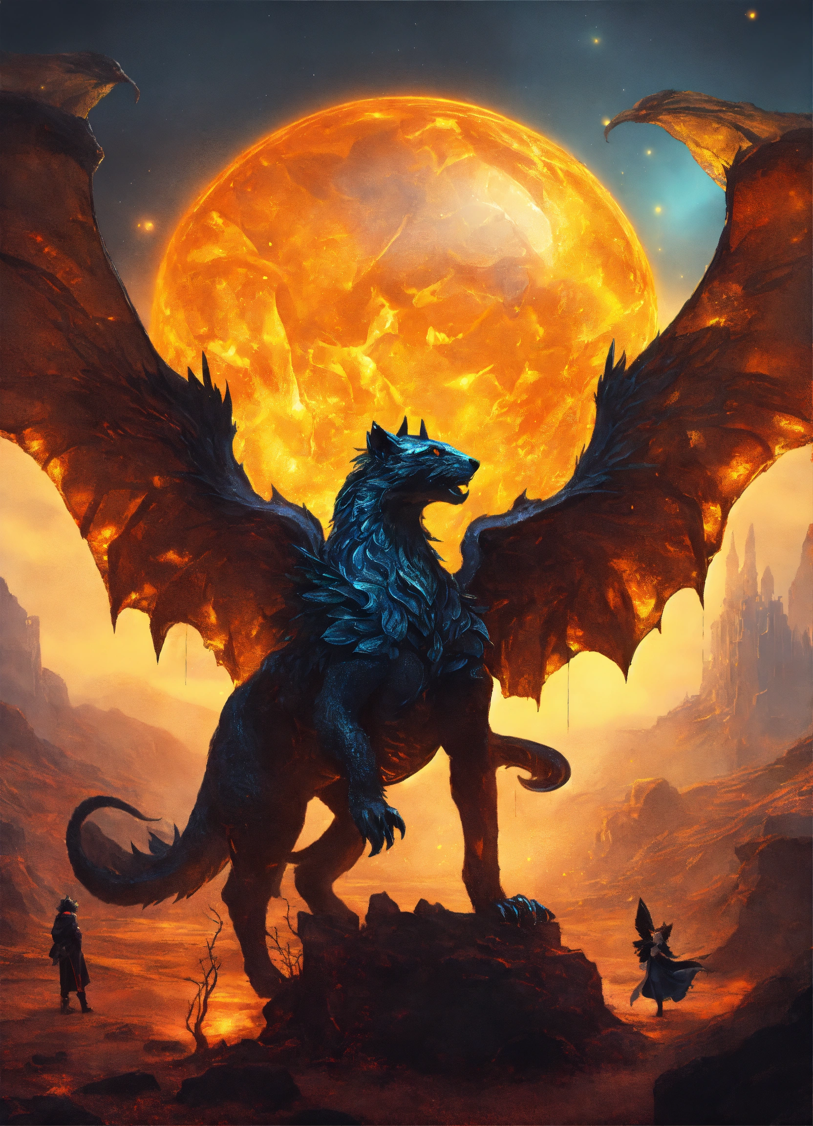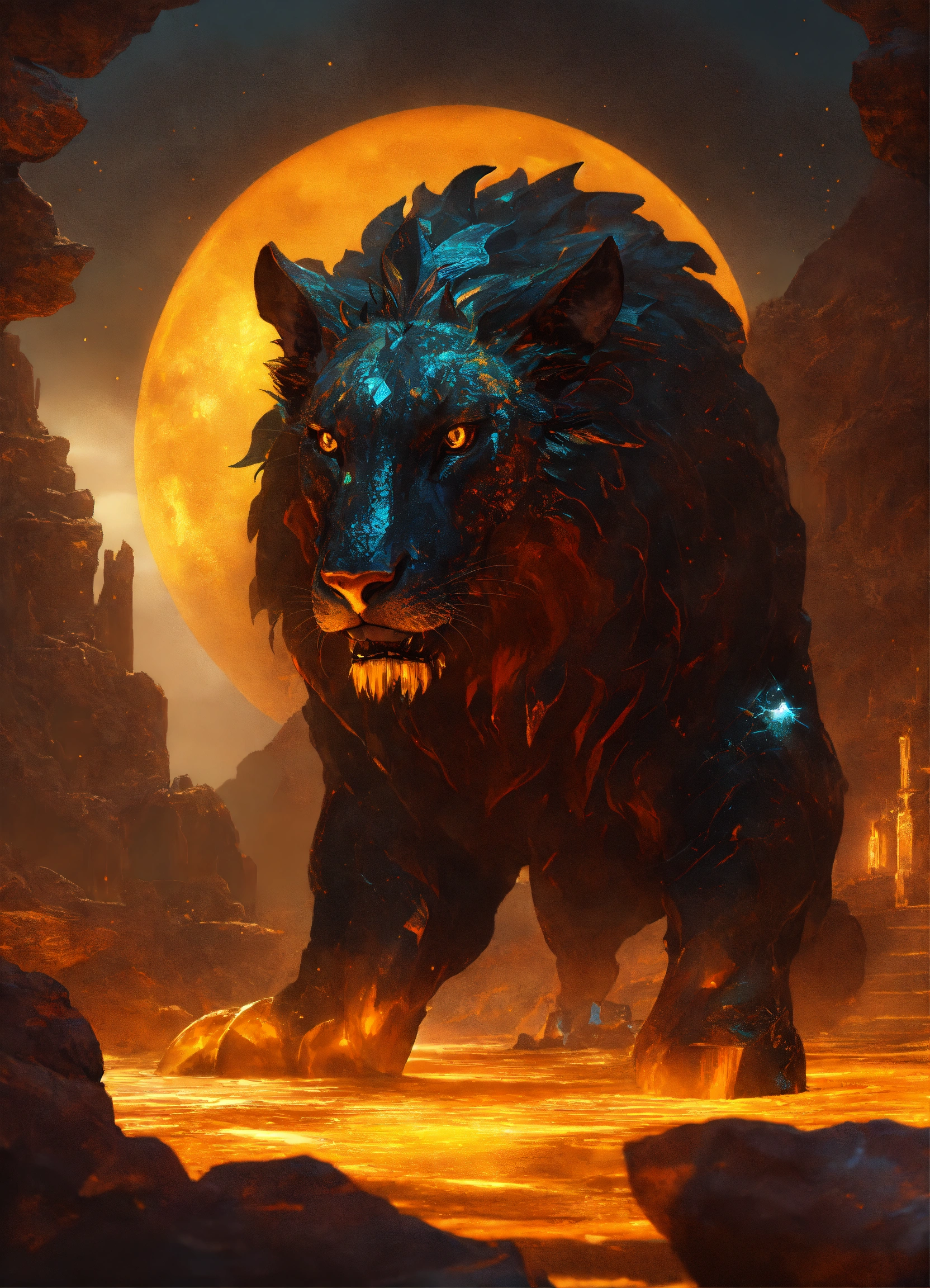 Desolate magical obsidian and amber chimera in a fairy tale world theme