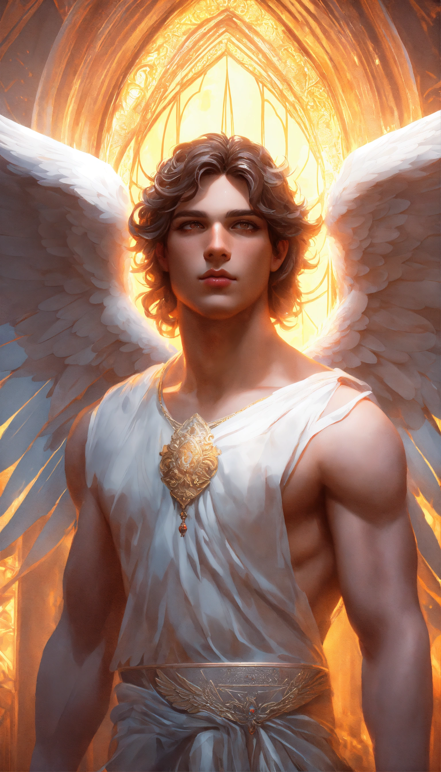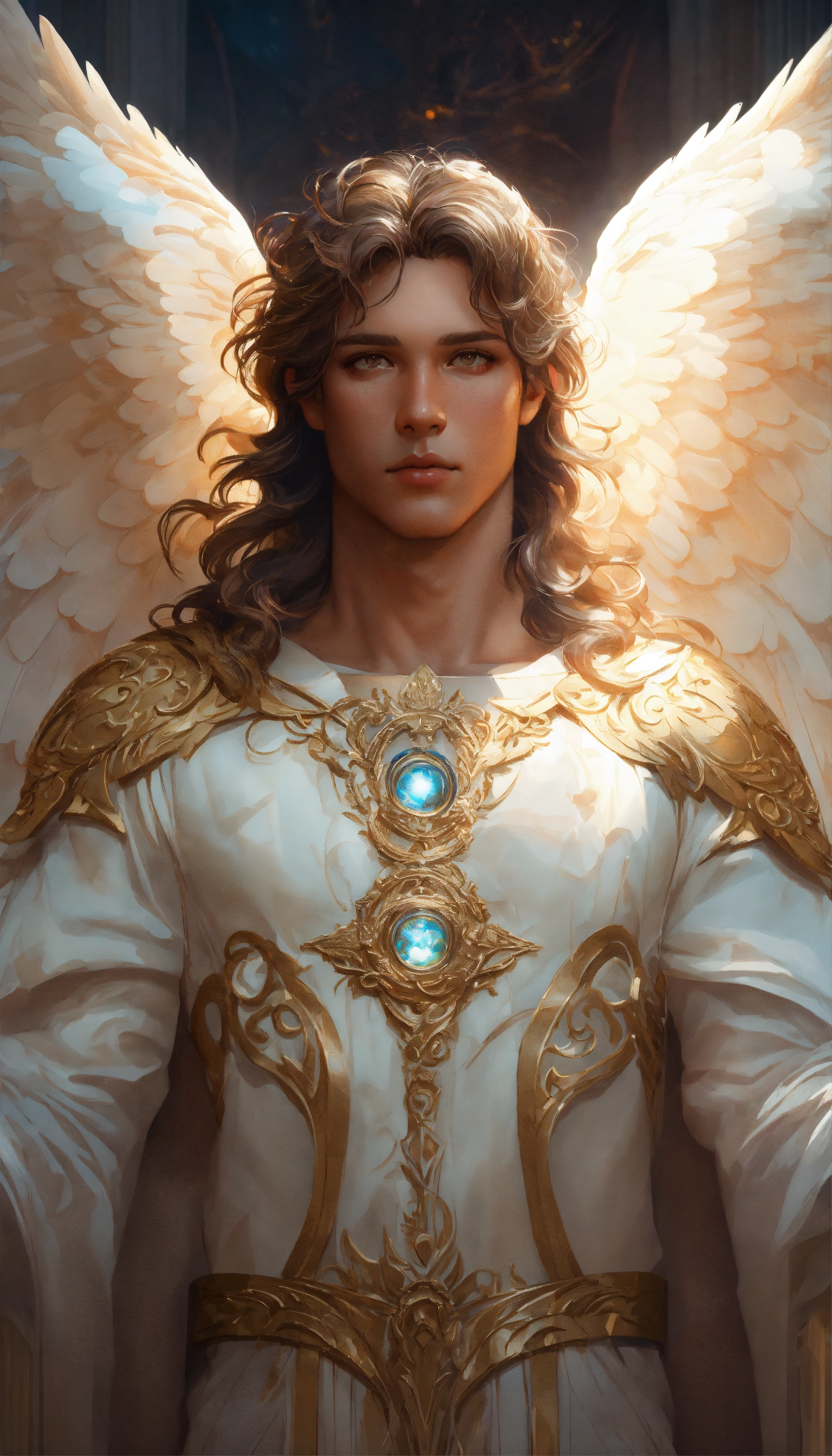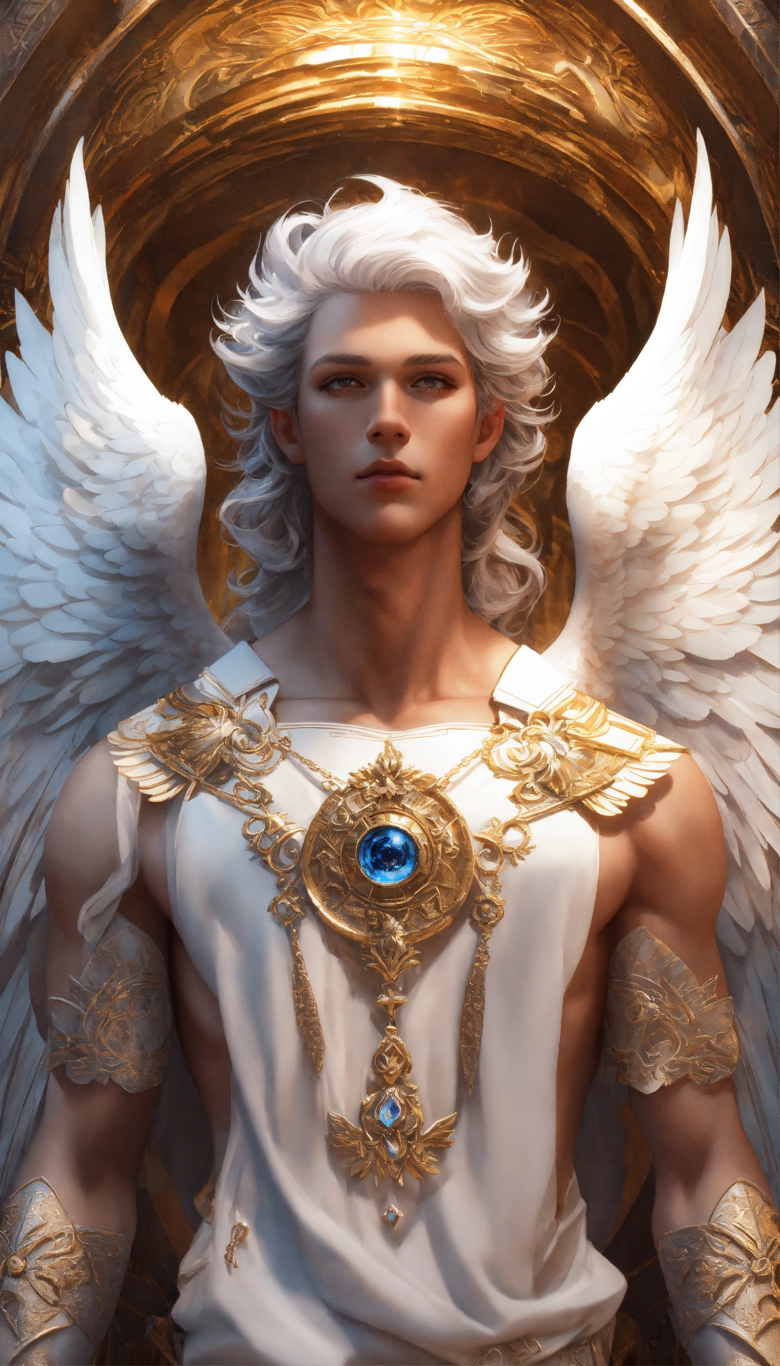 Male angel, wings, intricate, headshot, highly detailed, digital painting, art station, real, 3d, large detailed white wings, white eyes and deep gaze, jewel in third eye, mystical, sharp focus, cinematic lighting, 8k, illustration, art by artgerm and greg rutkowski, alphonse mucha, cgsociety