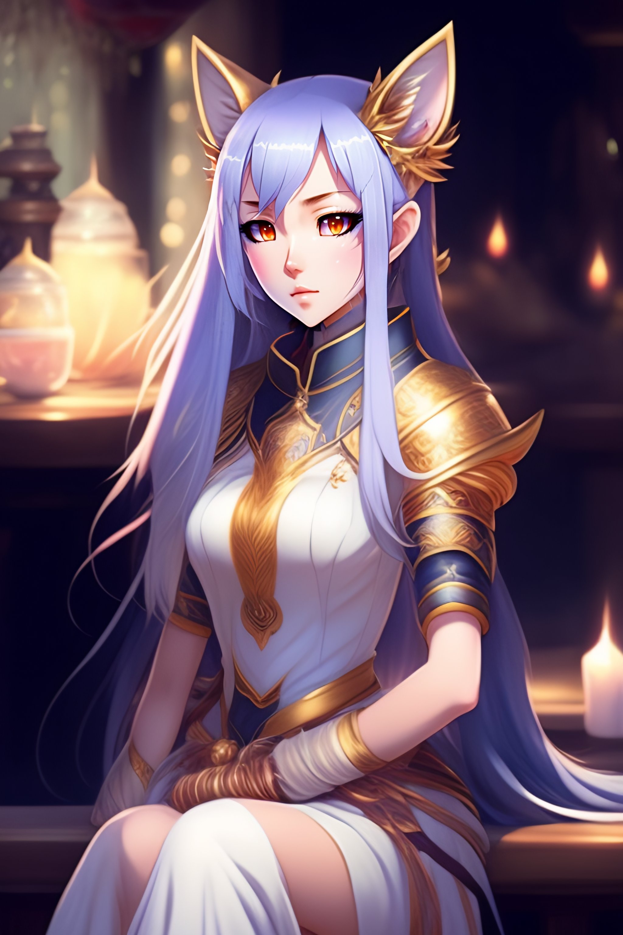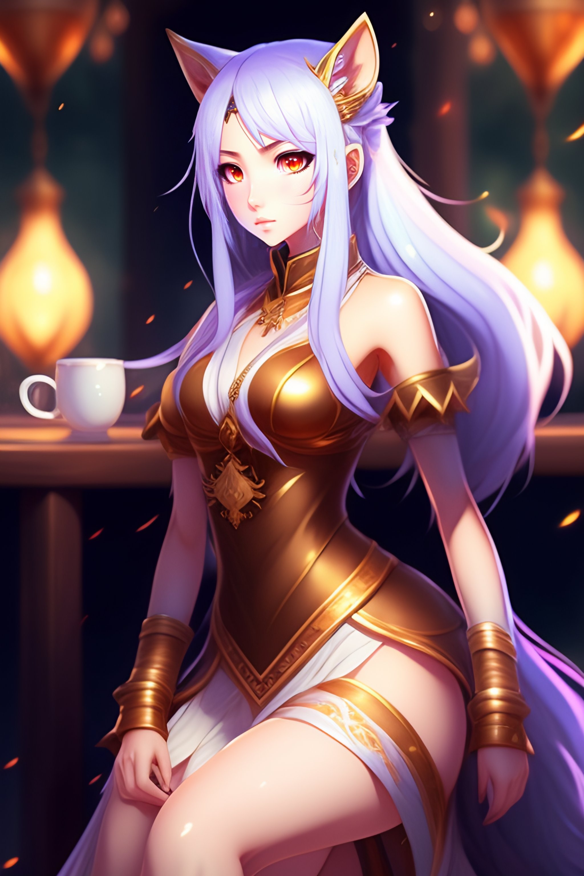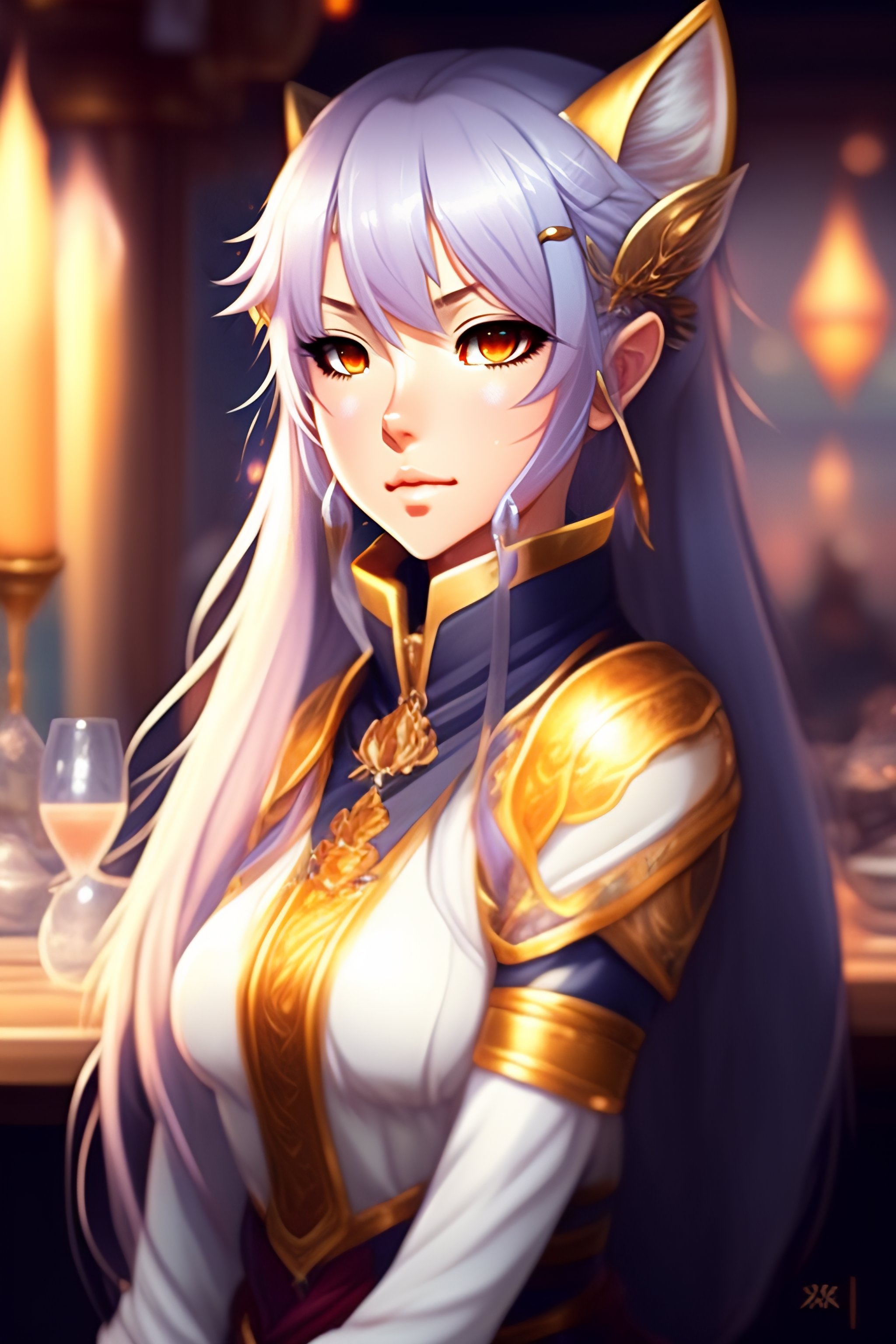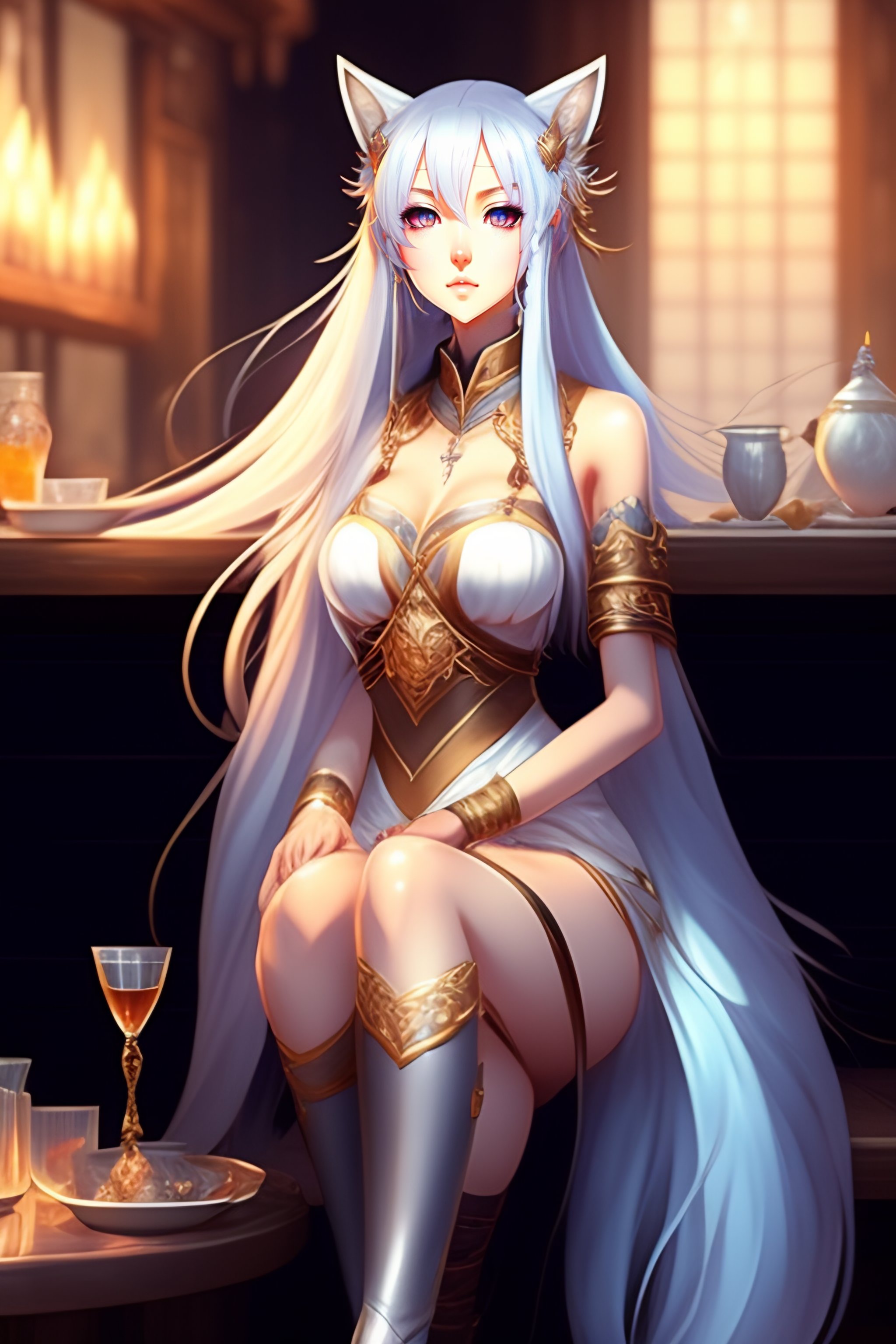 Anime fox girl, arctic hair and eyes, 160cm, hourglass body, ross tran style, xianxia, sitting in a xianxia style tavern, shapeshifting hand, elegant and narcissistic, ice queen, unapproachable