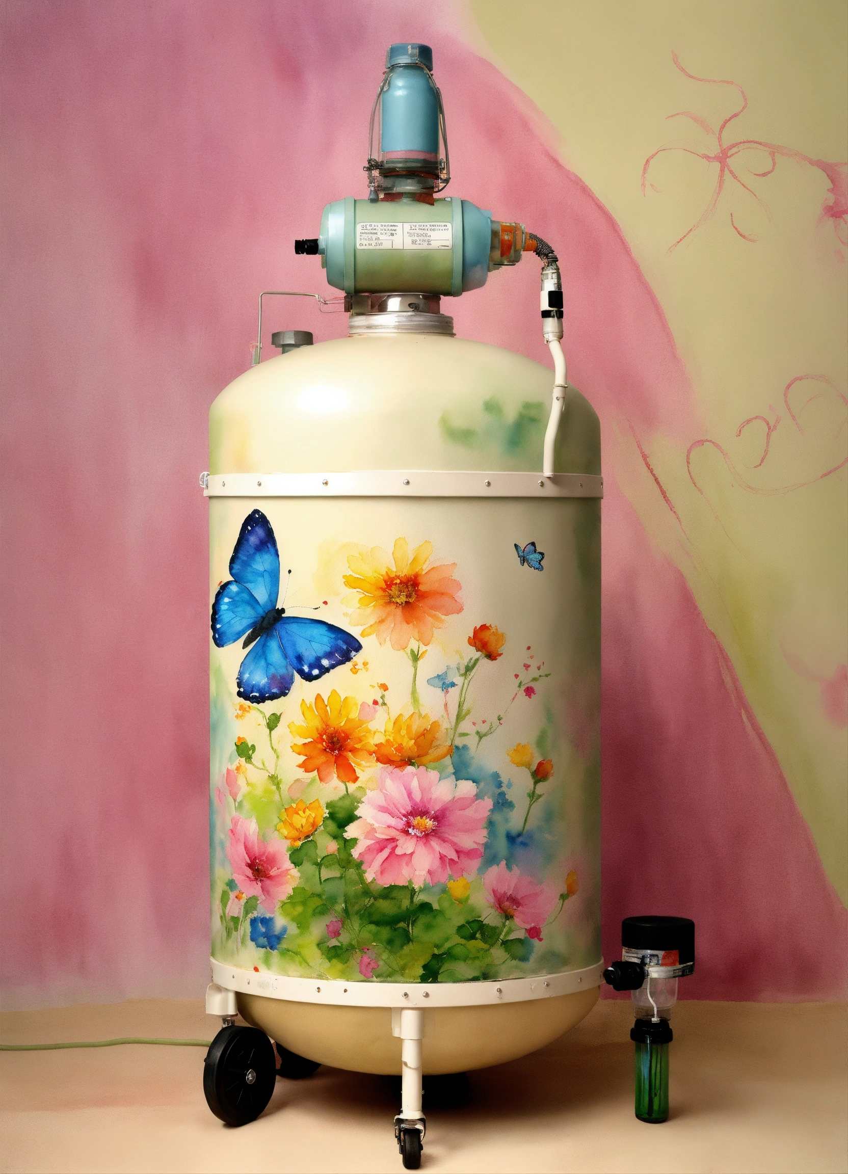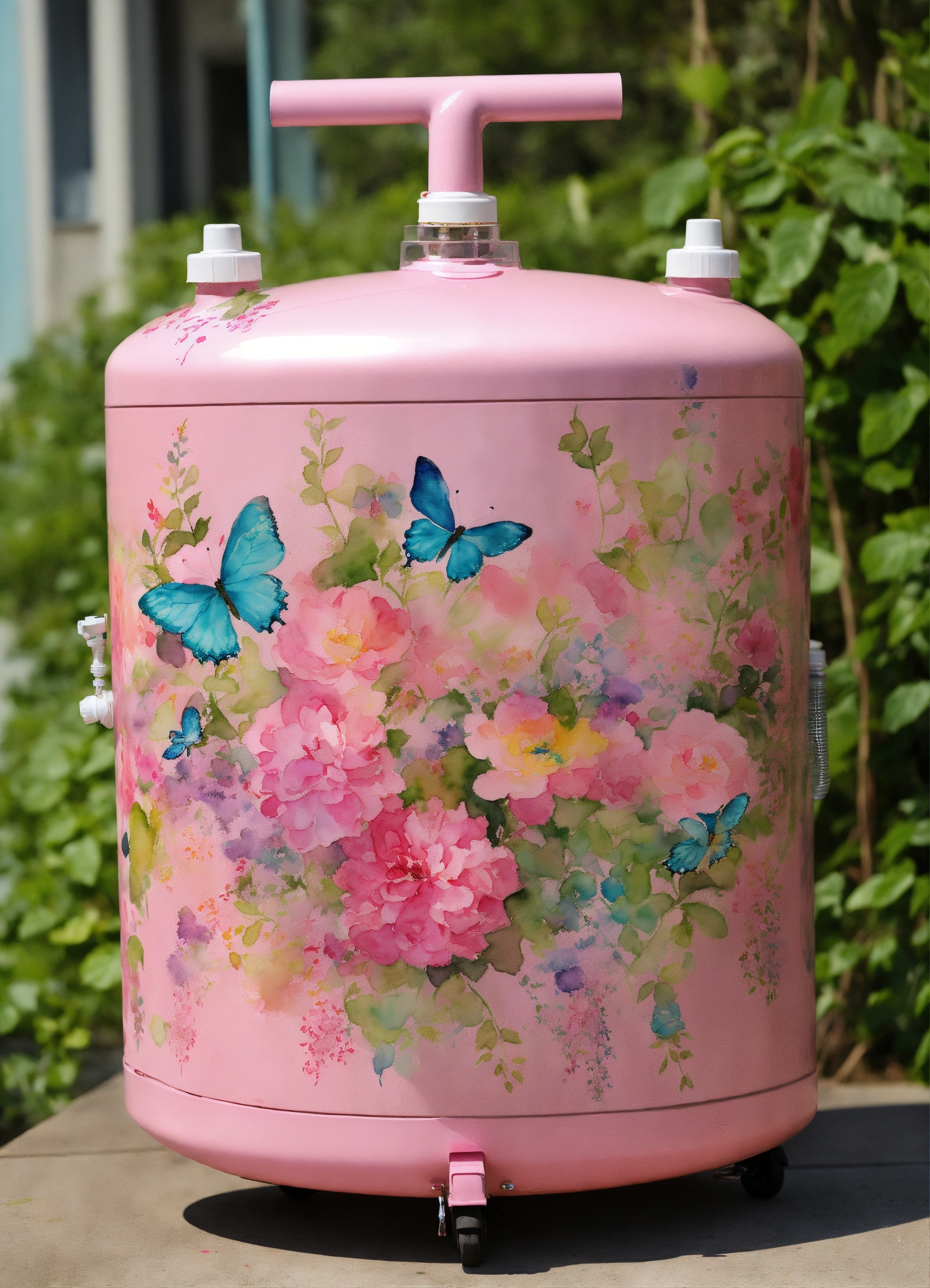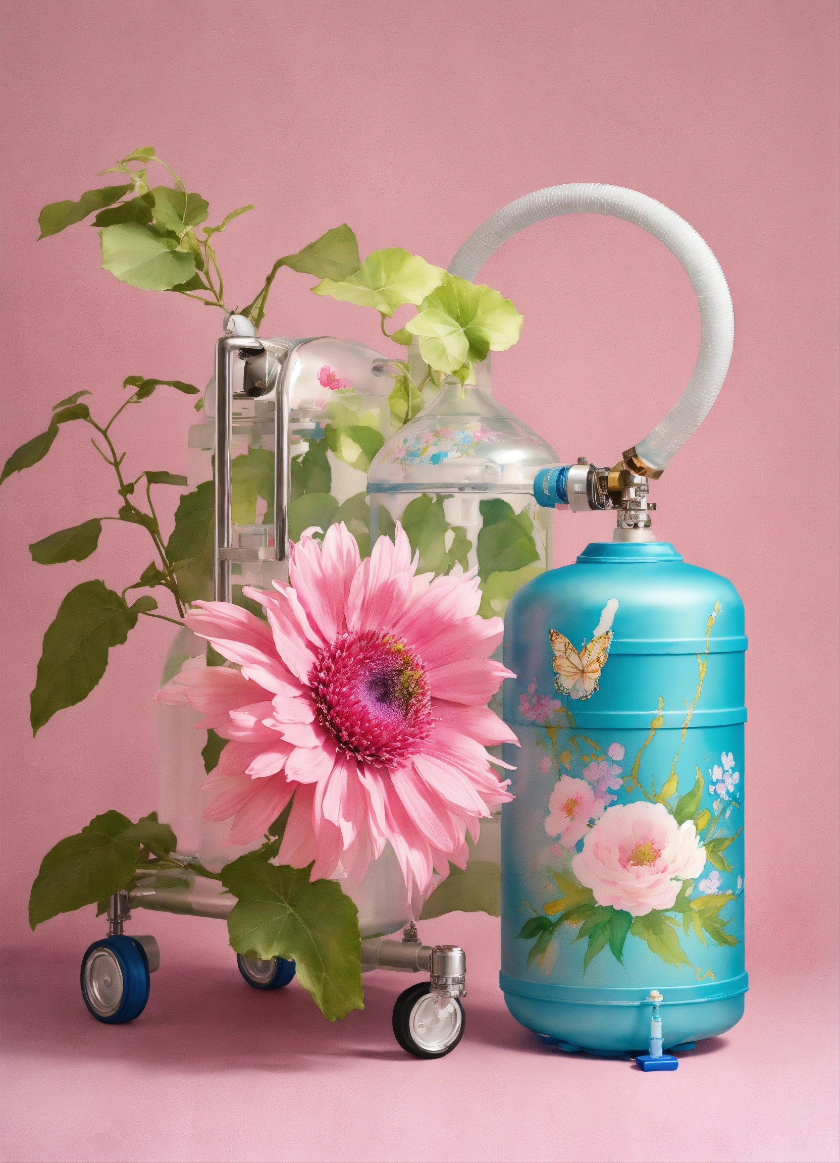 Concept art of oxygen tank and nasogastric tubenose tube, portable, rolling wheels, small, blank background, handprinted painted artsy design, portable oxygen concentrators, pink flowers and butterflies painted on the tank, medical, realistic, hyper realistic, portable, cute, artsy, decorated, thin tank, colorful girly handprinted designs on the tank, thin small portable tank, personalized decorated painted medical portable oxygen tank, respiratory, thin tank, watercolor paint, fake flowers on a fake vine wrapped around tank, super thin small narrow tank, watercolor abstract paint, clear thin tube attached