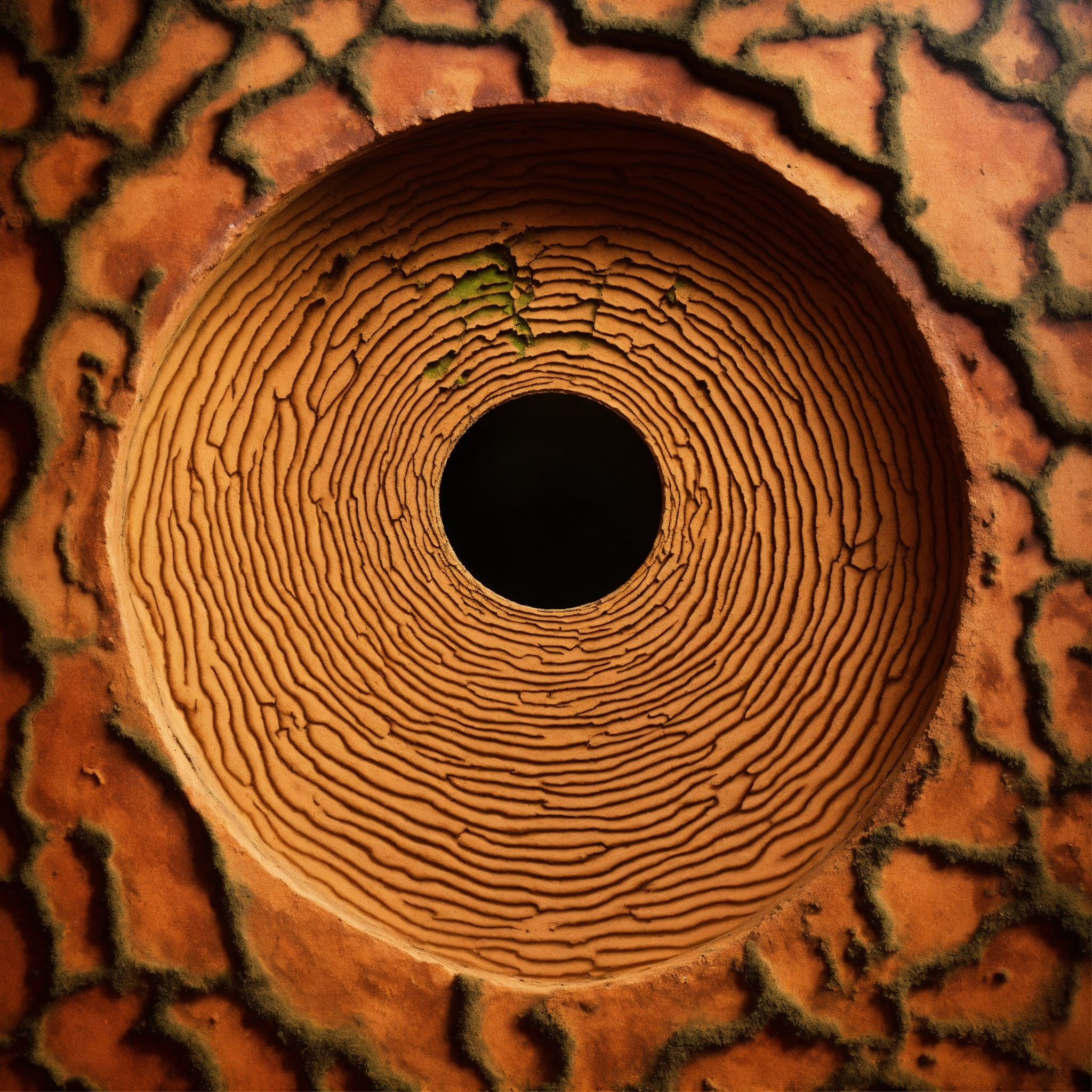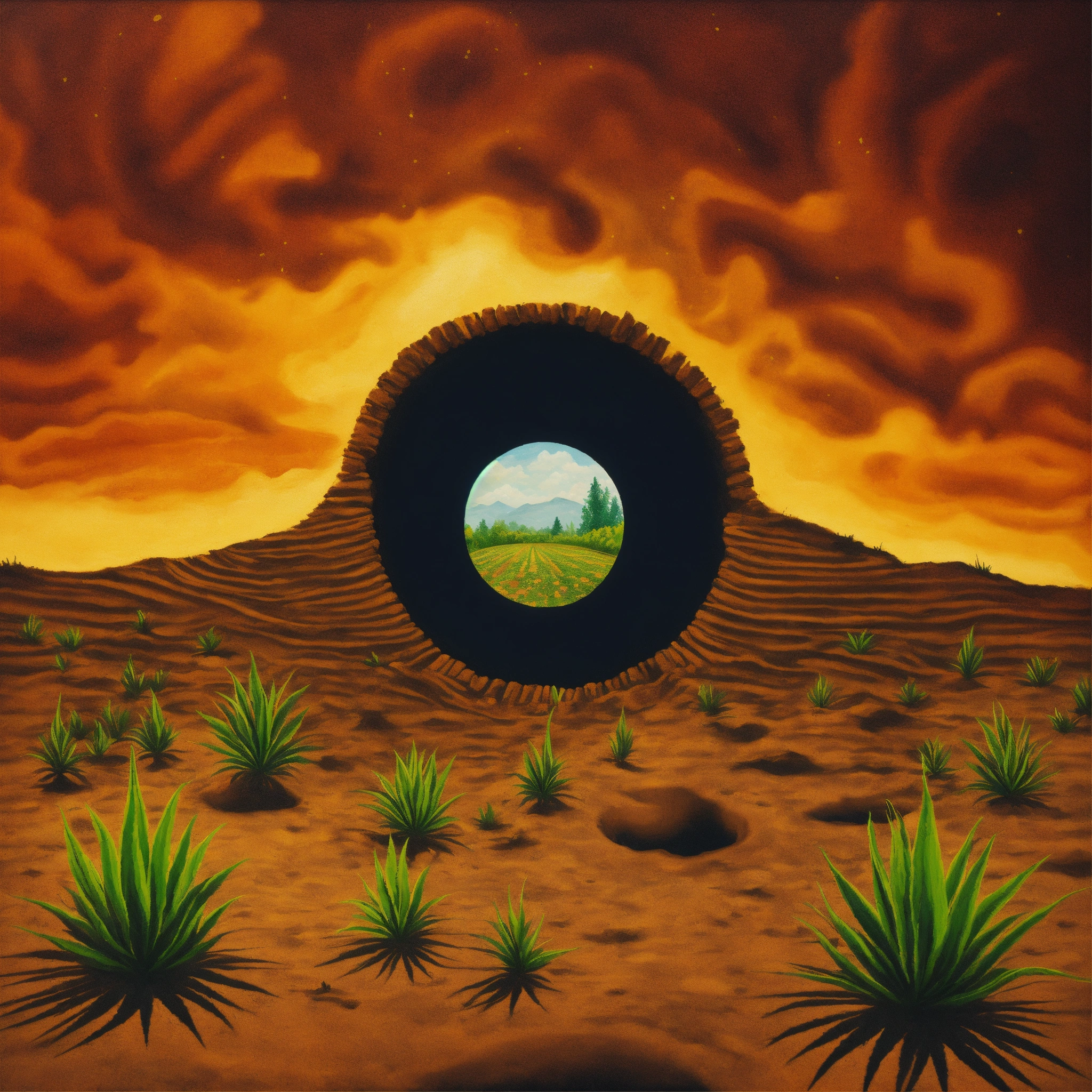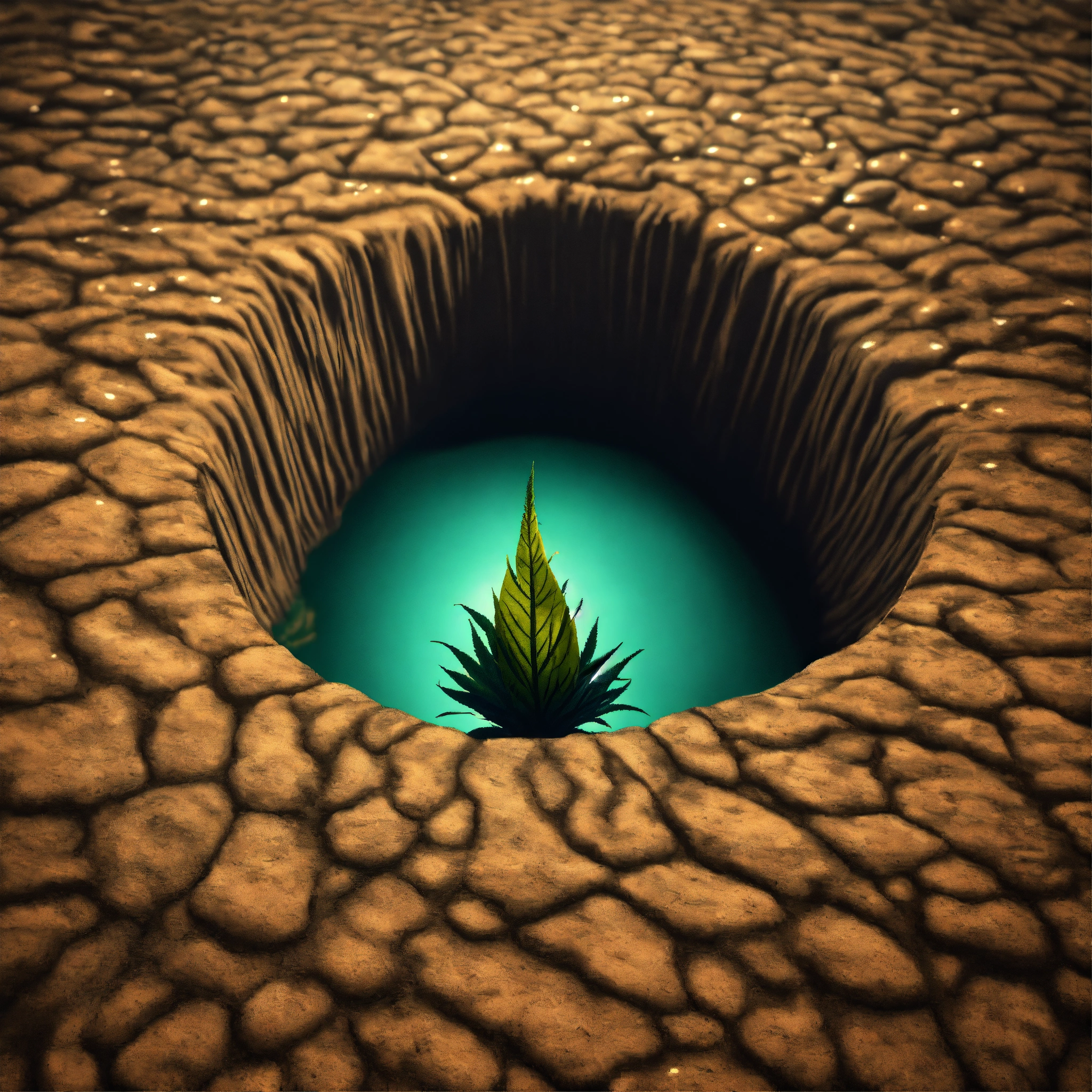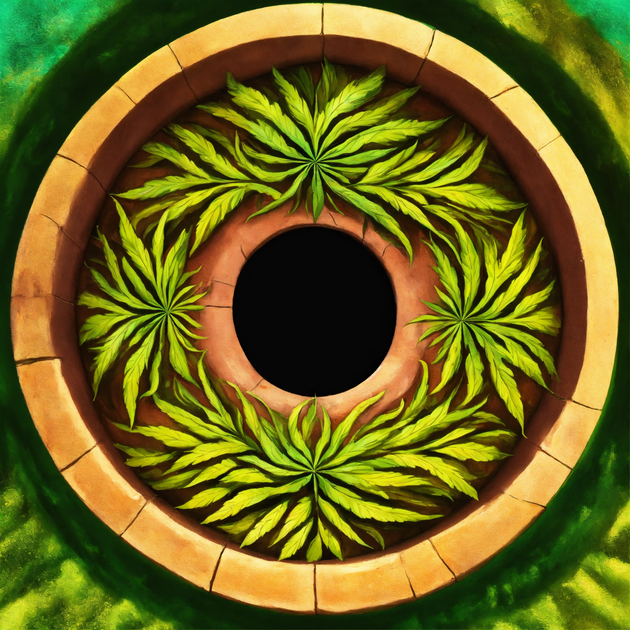 A hand painted texture with optical illusion image with a hole in the ground and ganja, symmetrical, substance