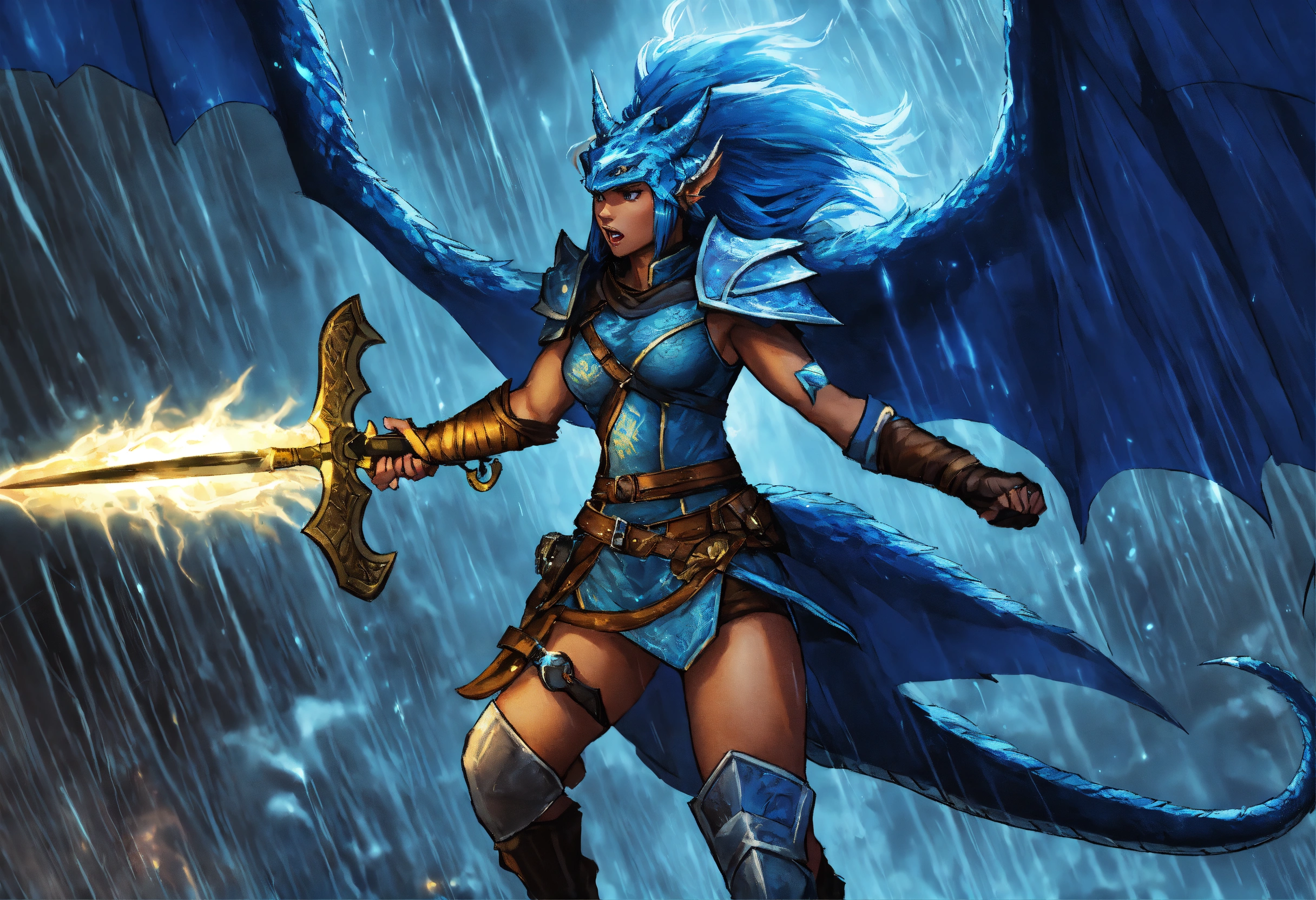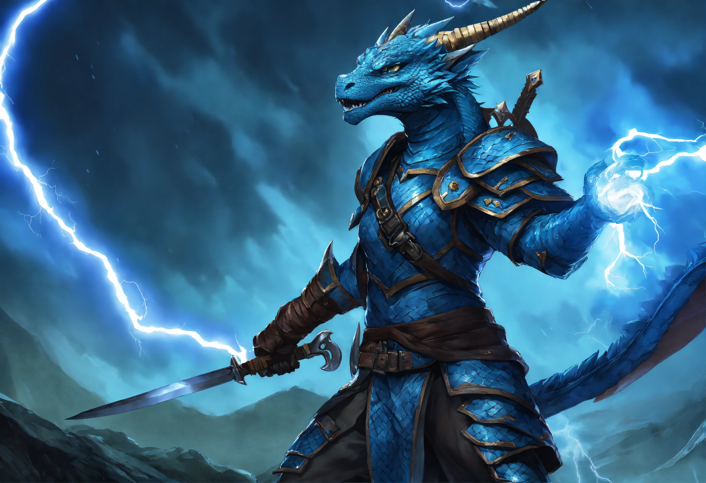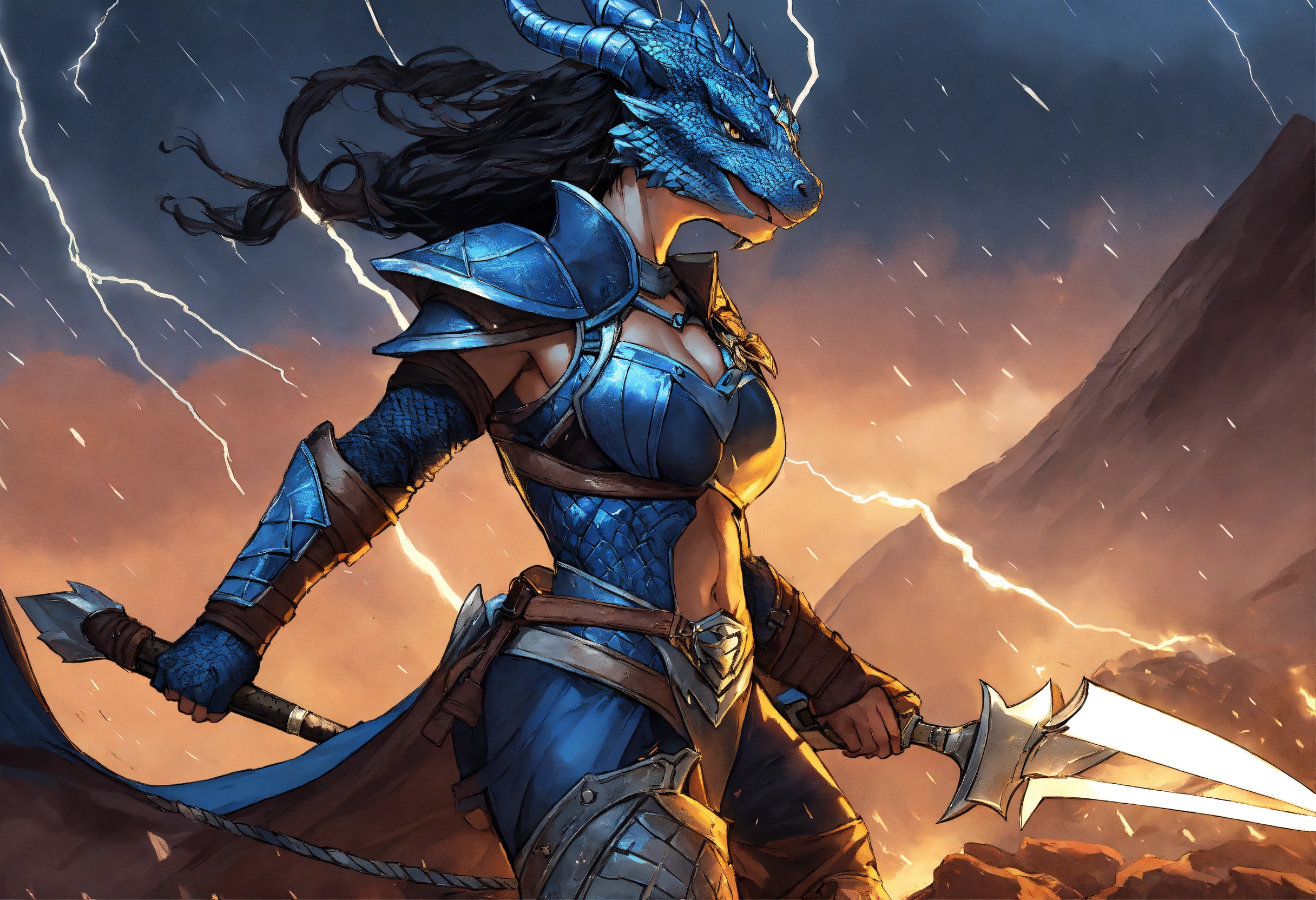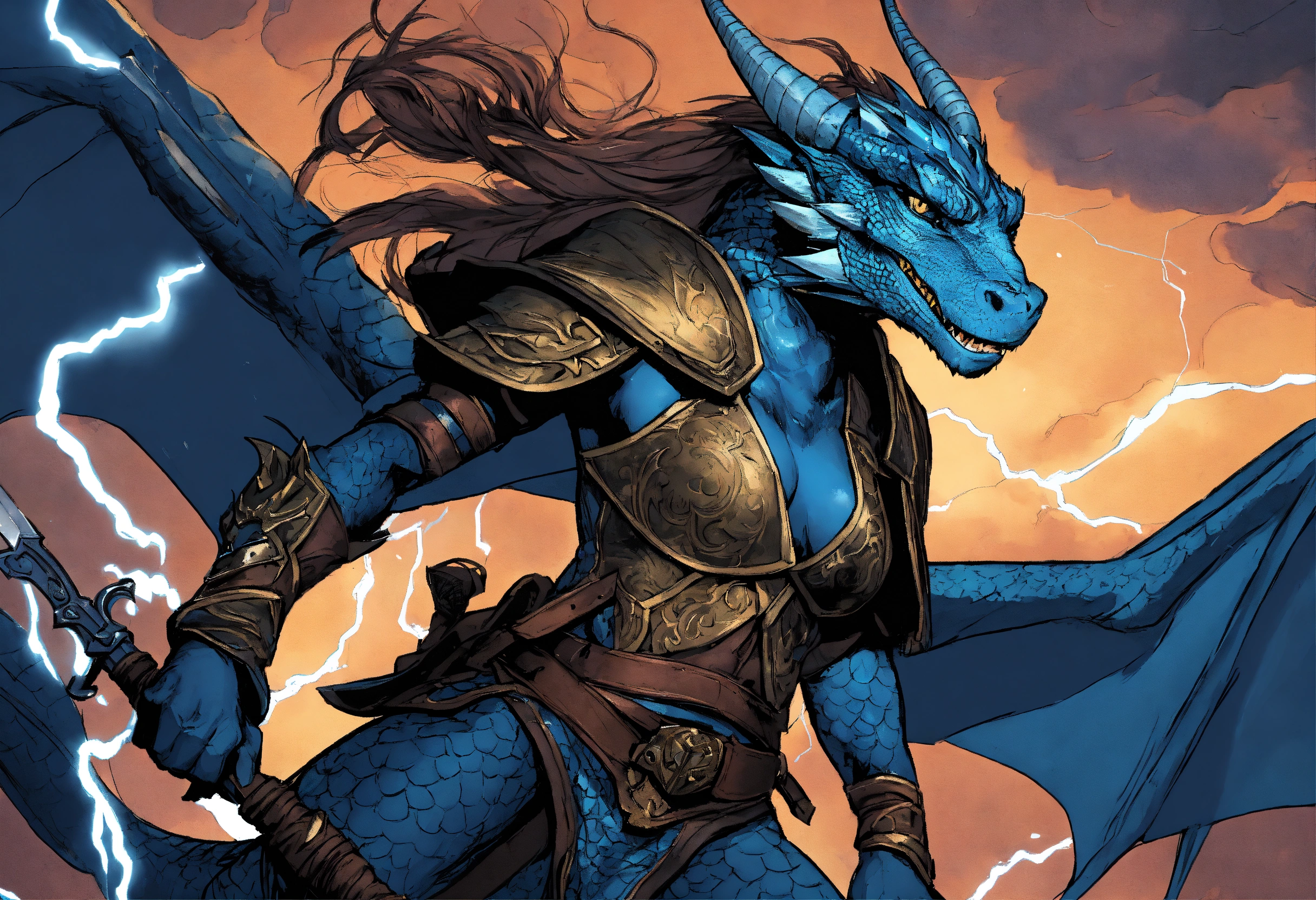 A body shot of a female blue dragonborn warrior, with a tail, thrusting forward with a glaive, powerful, shrouded in lightning storm in graphic novel art form
