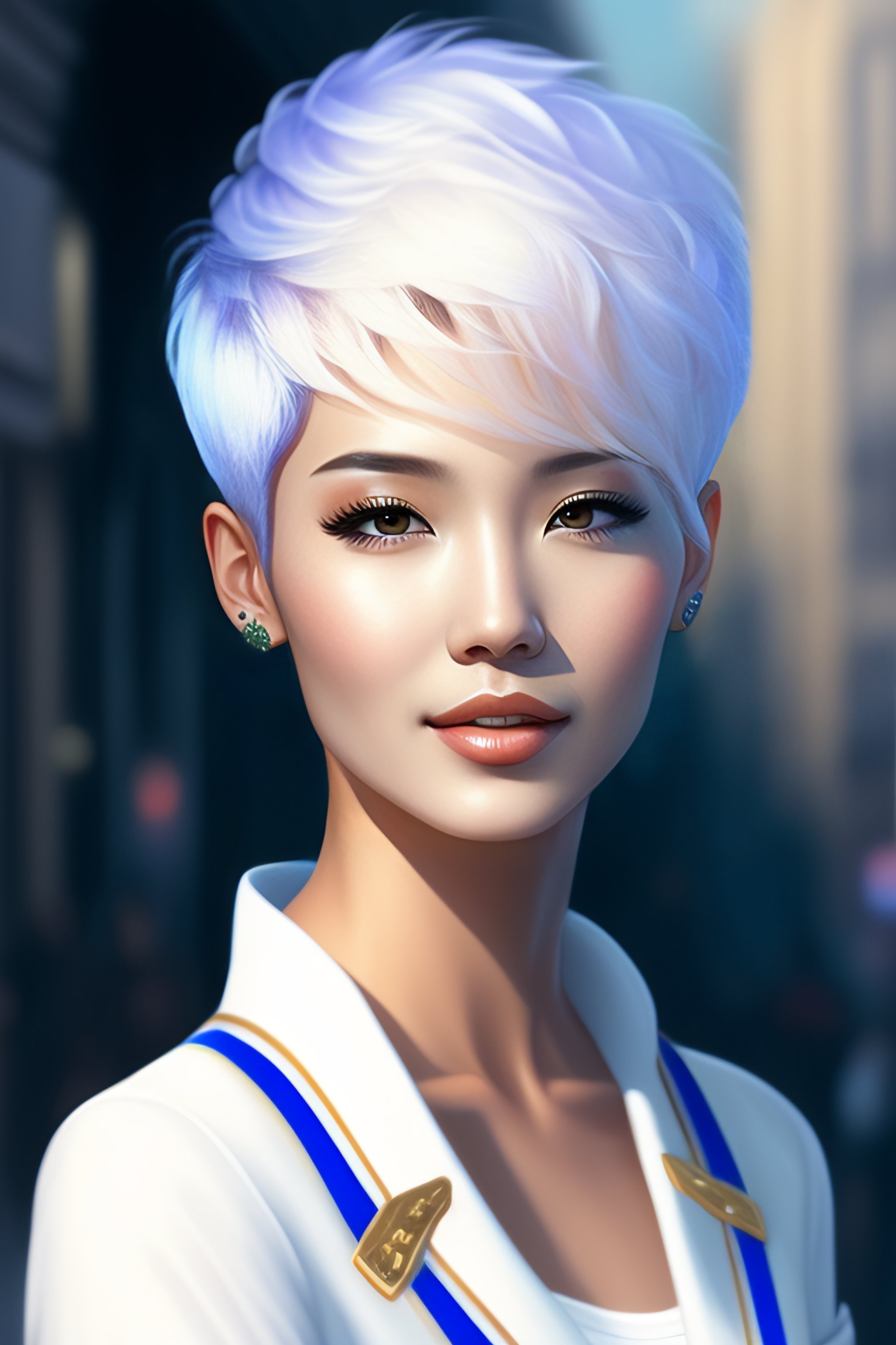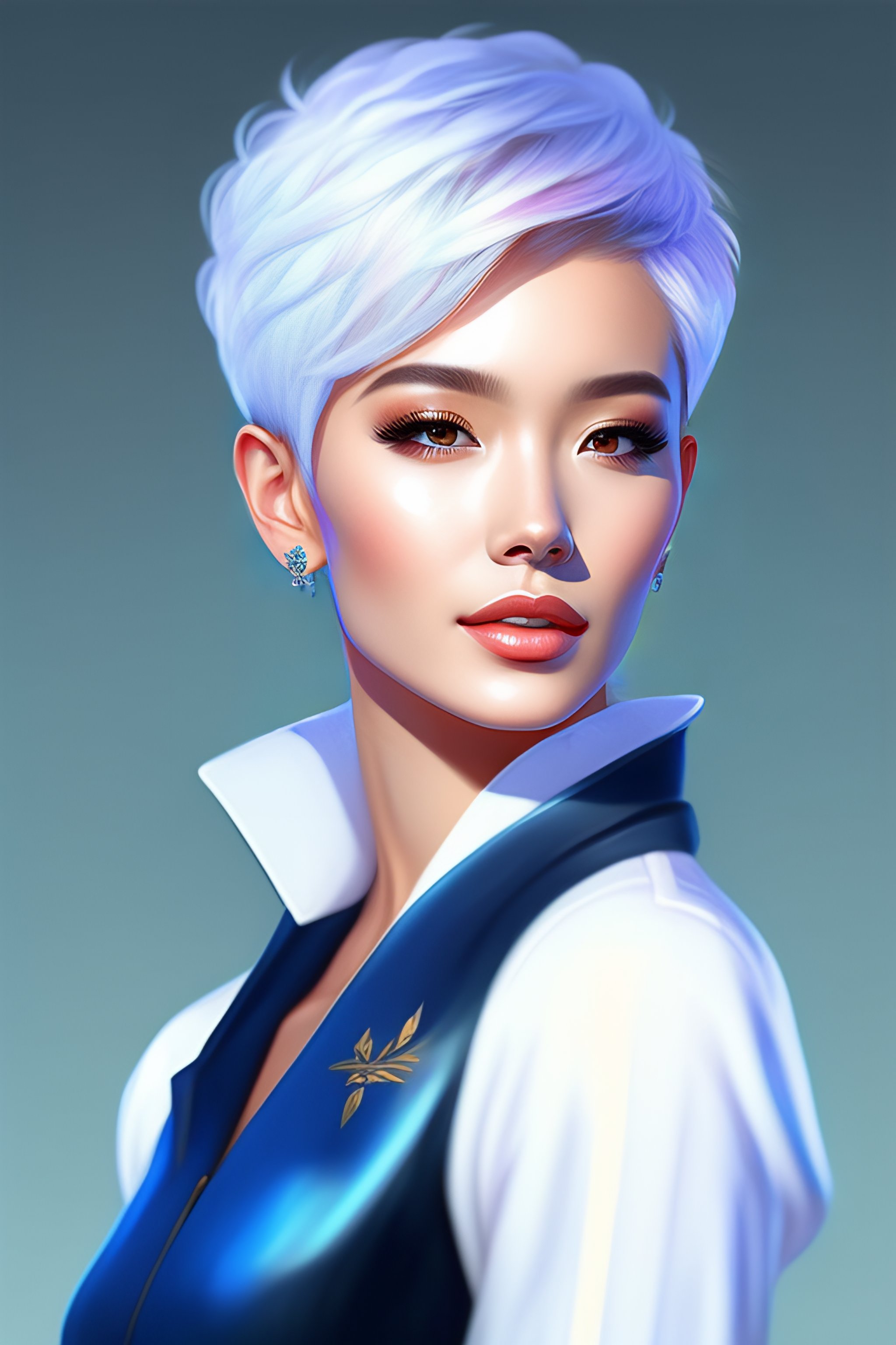 White short pixie cut hair woman blue jacket korean digital art sketch