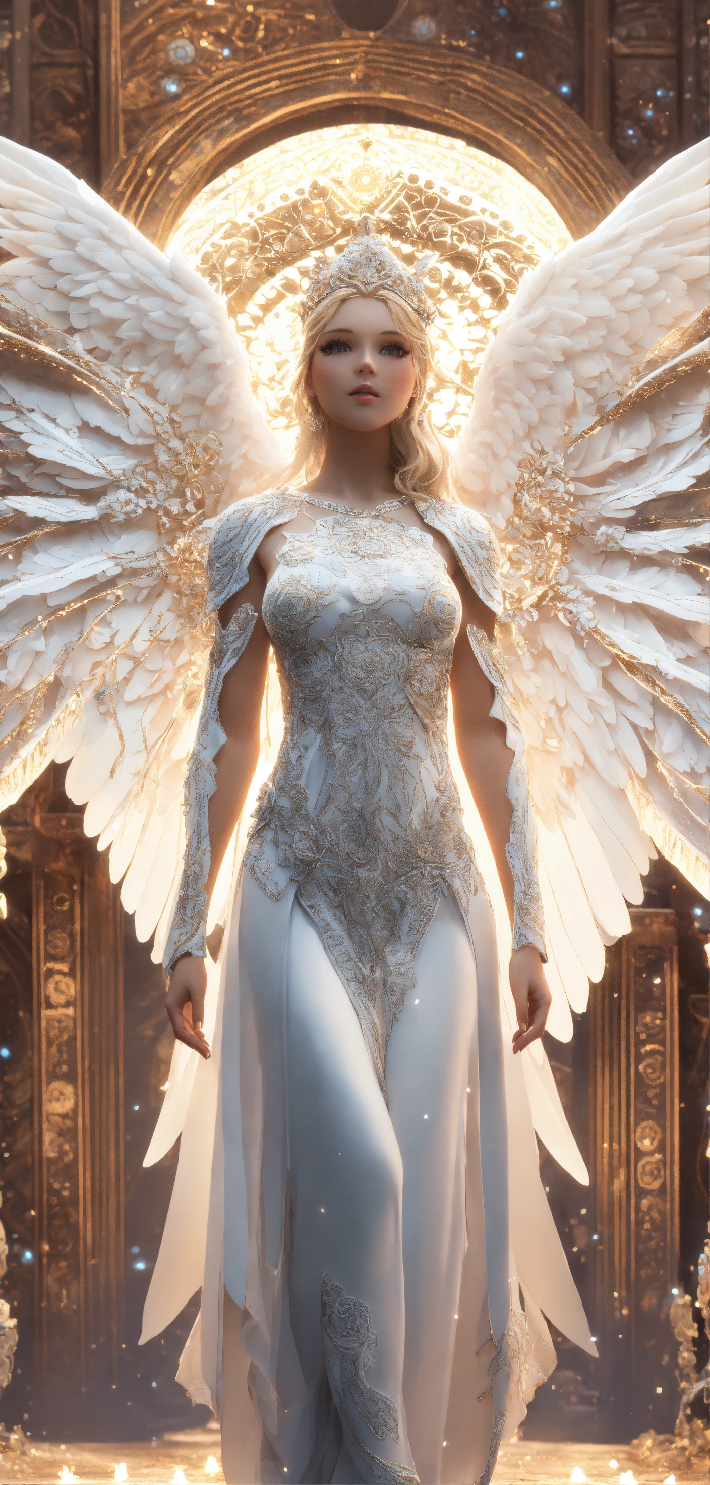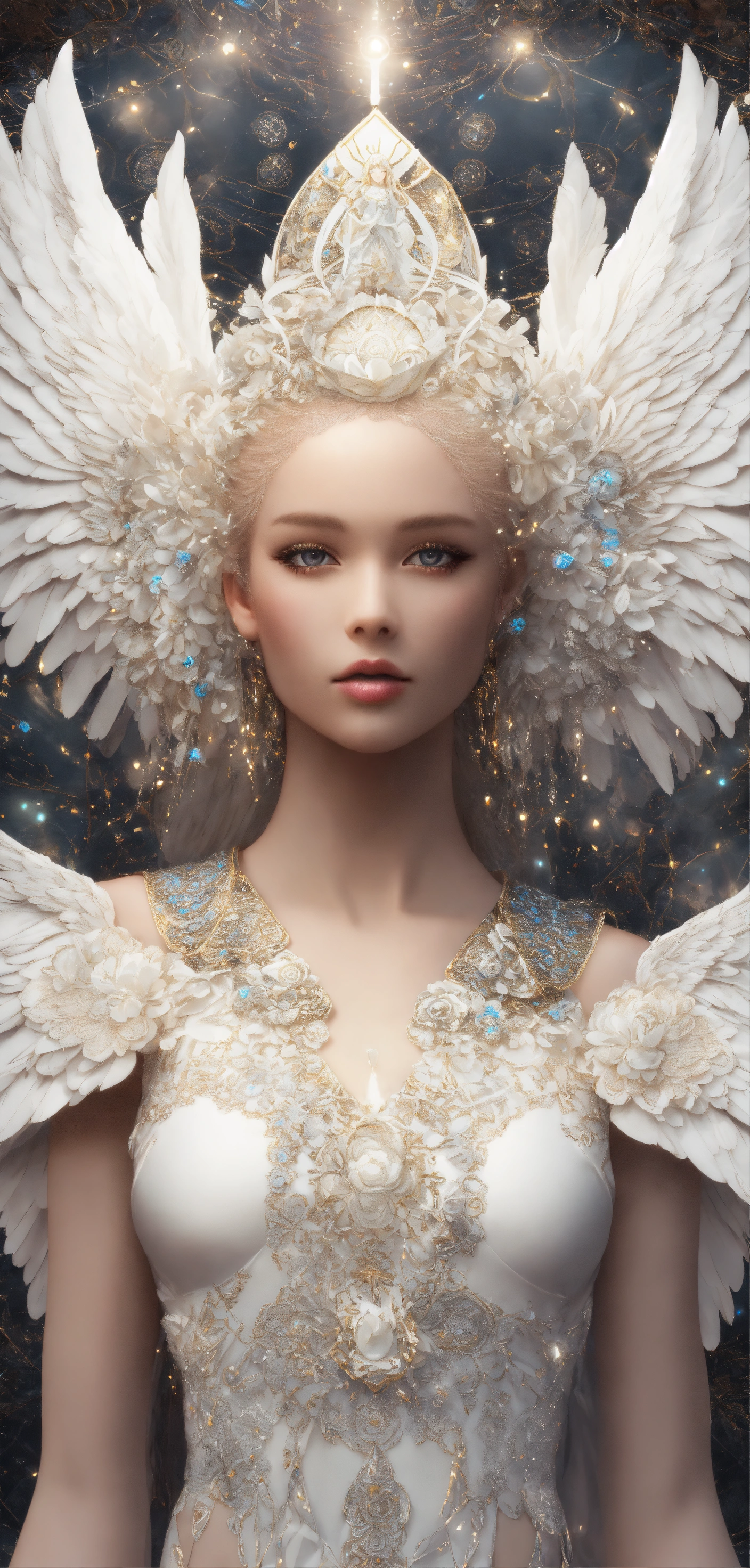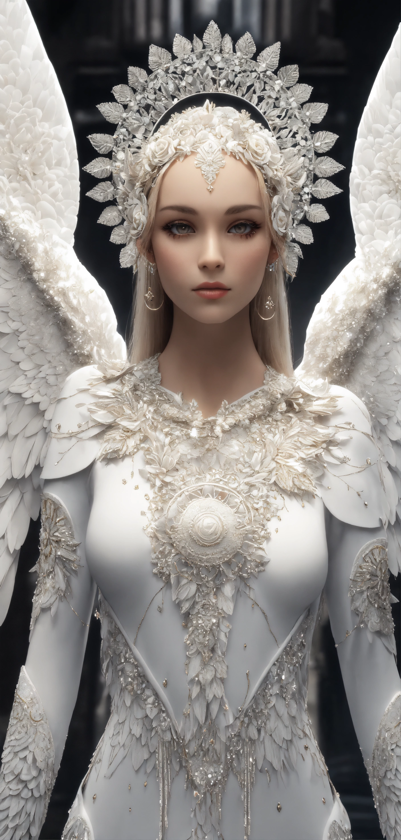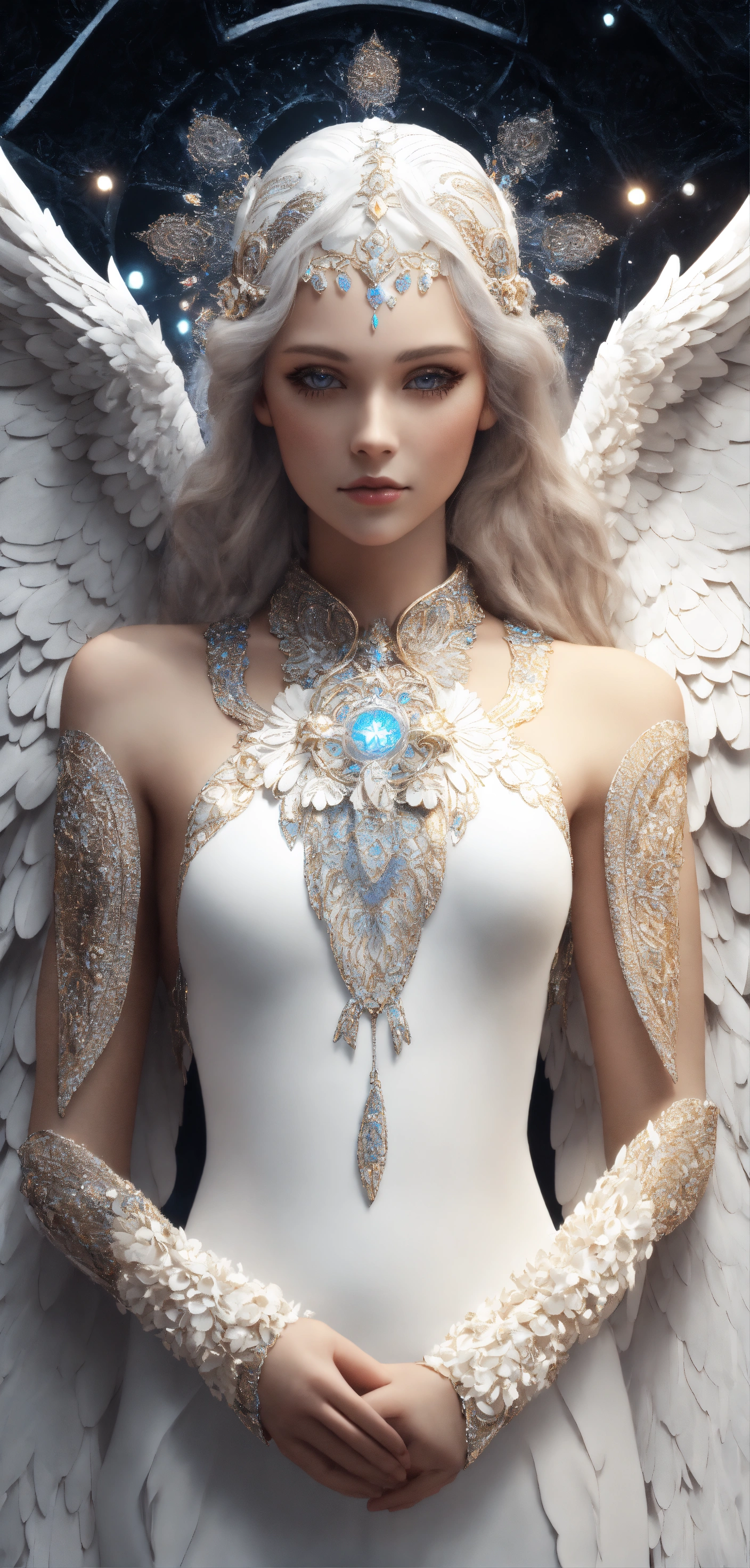 Angel woman with white angel wings, large and detailed 3d illustration, dressed in a white tunic and encrusted with white crystals. mandalas around. open eyes with penetrating gaze, matte white skin, surreal graphic, hd, 8k
