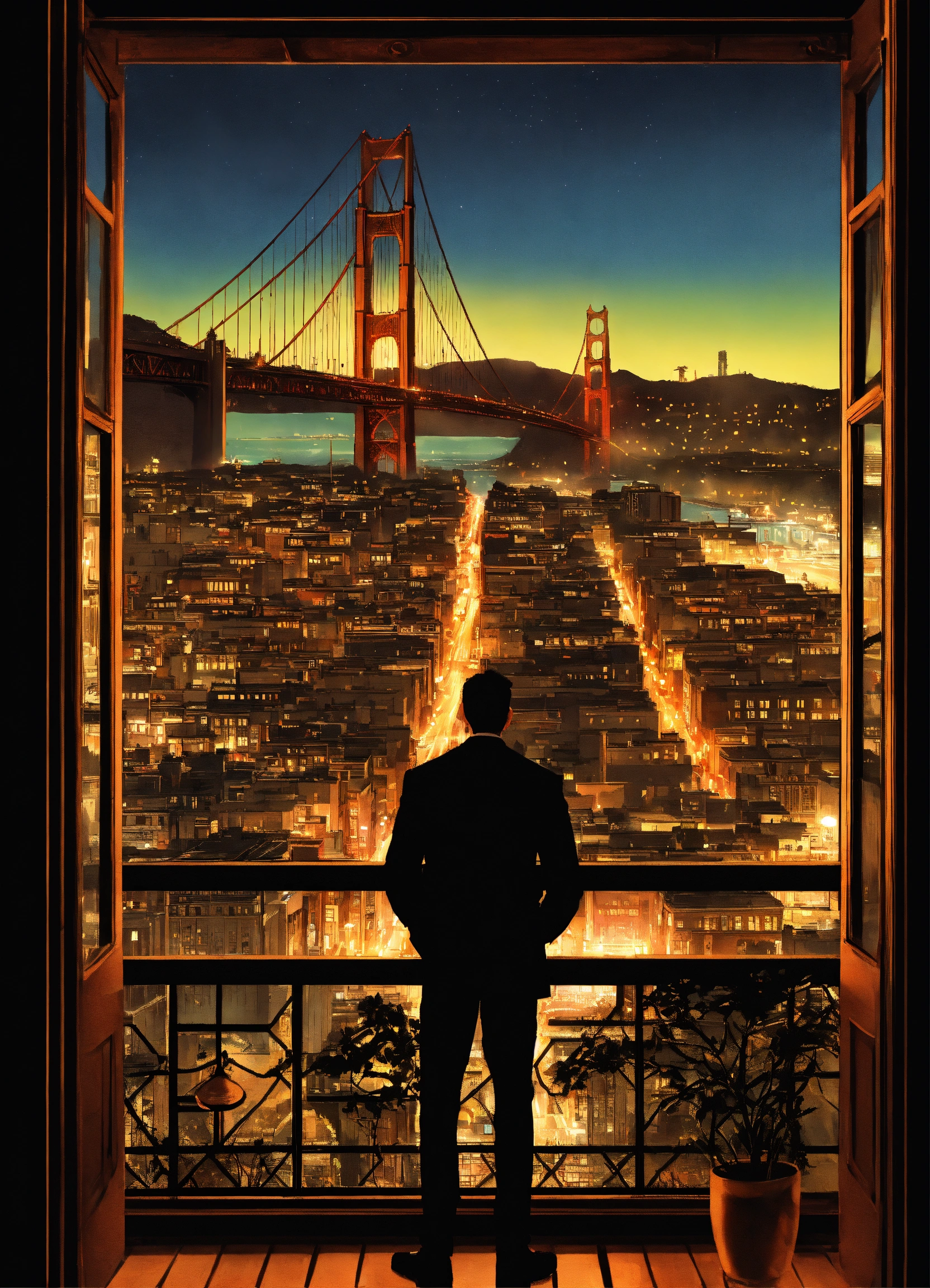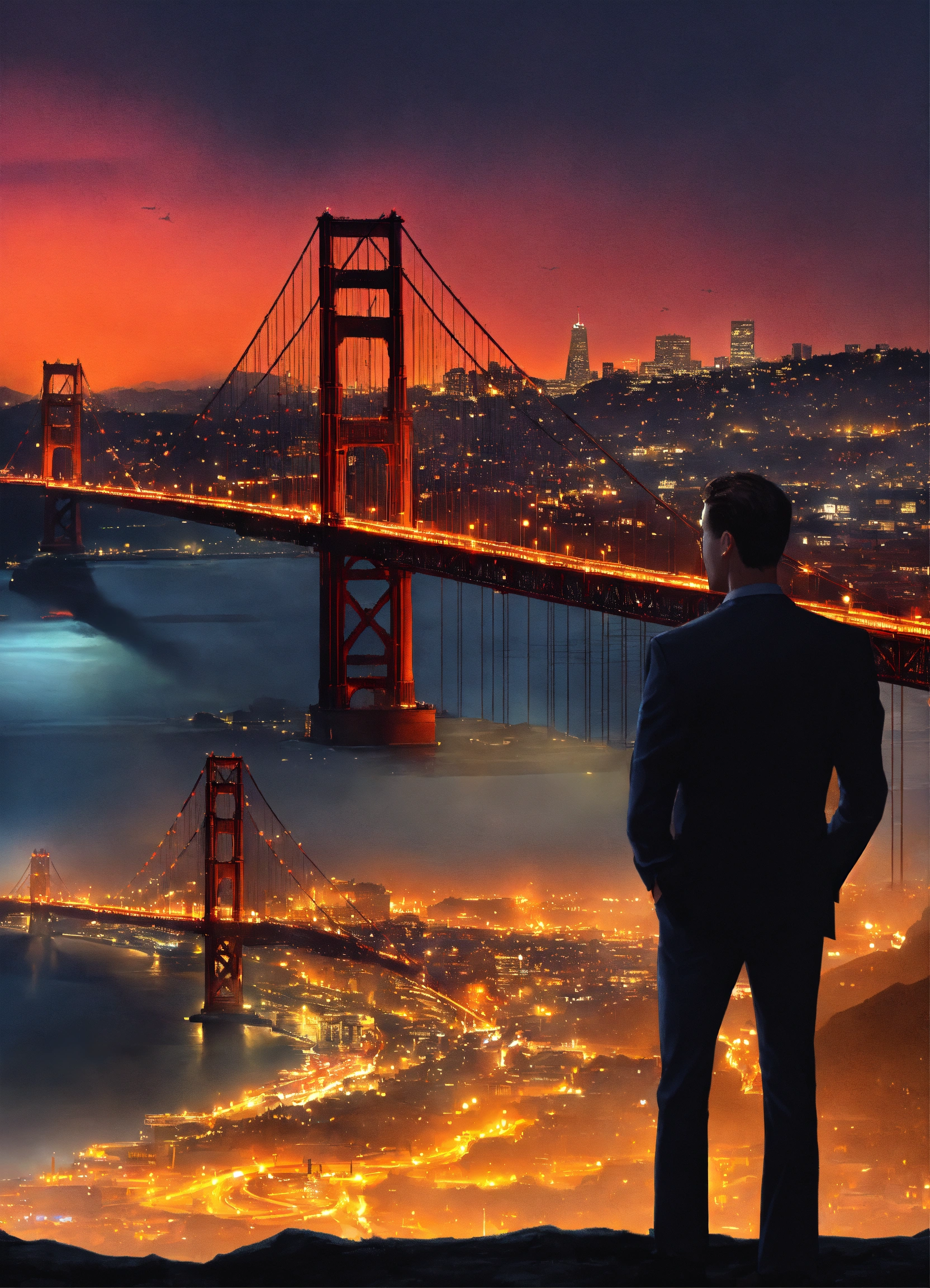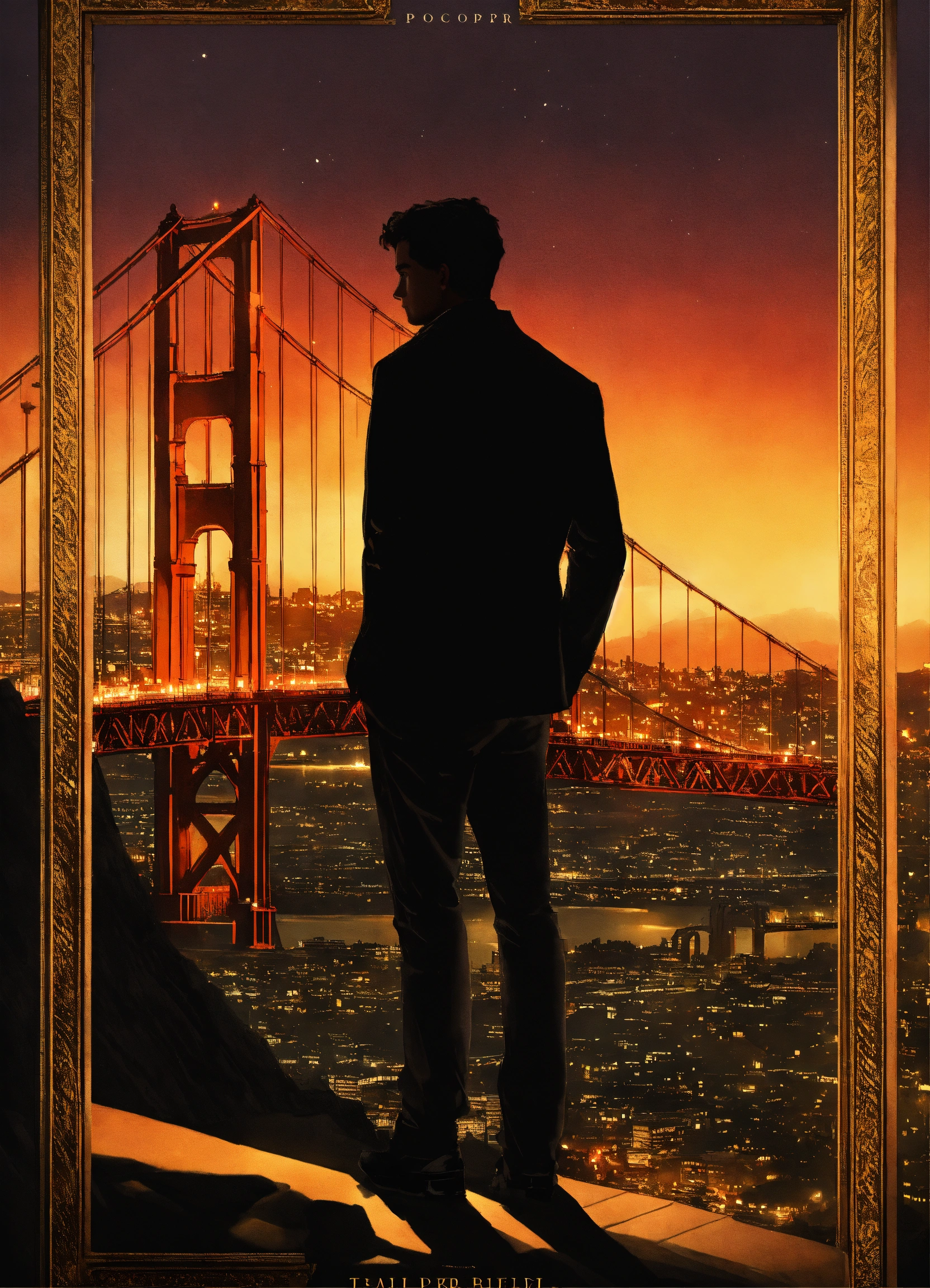 Create a captivating cover design that conveys the theme, city, nightlife, crime, and thriller silhouette of a man side view overlooking the city with golden gate bridge in the background, inspired by the book of mark dawson "the chameleon (charlie cooper thrillers book 2)", photoreal, photorealistic, with lighting and shadows effect, city lights at night, super detailed city, extremely detailed