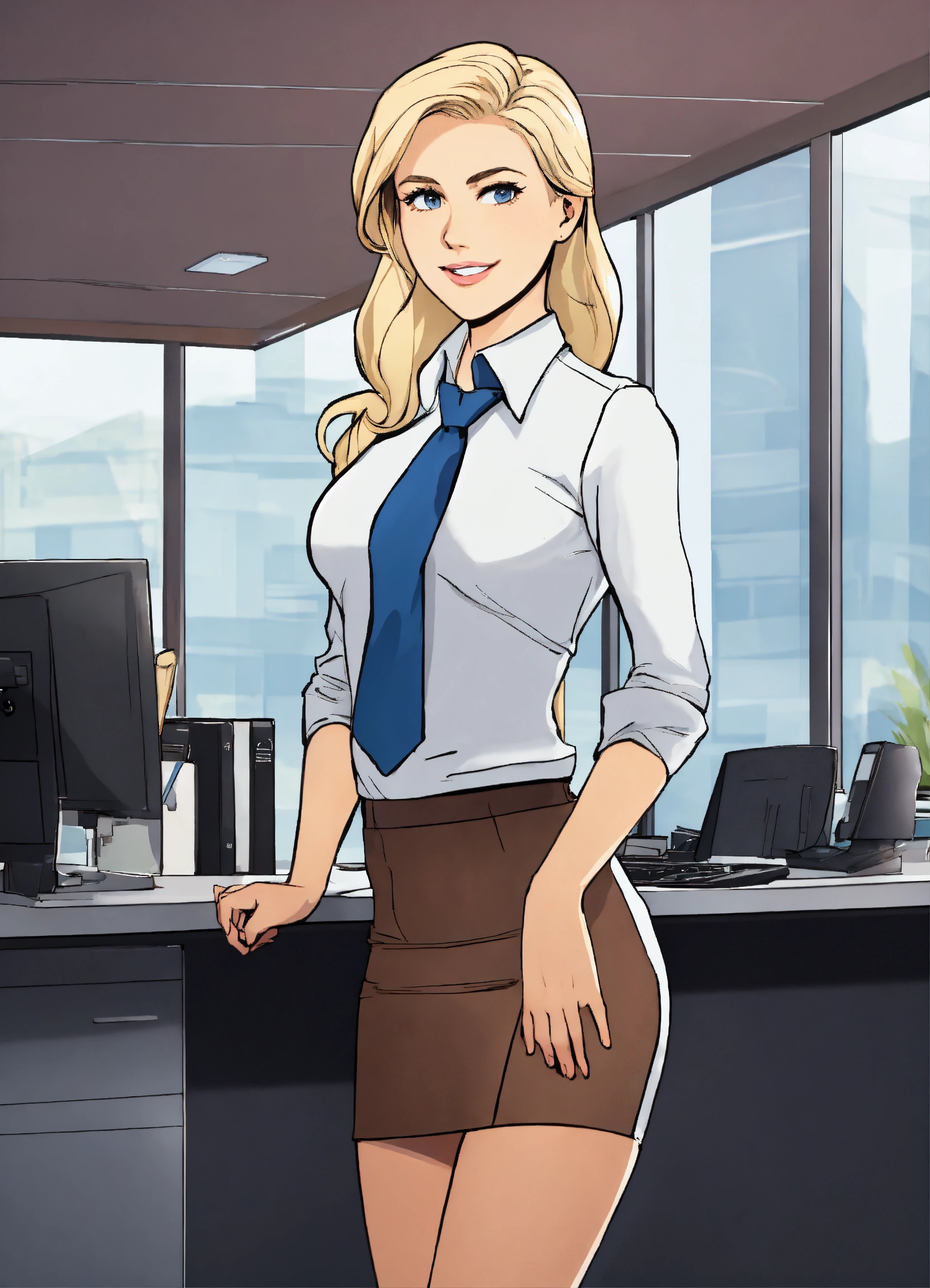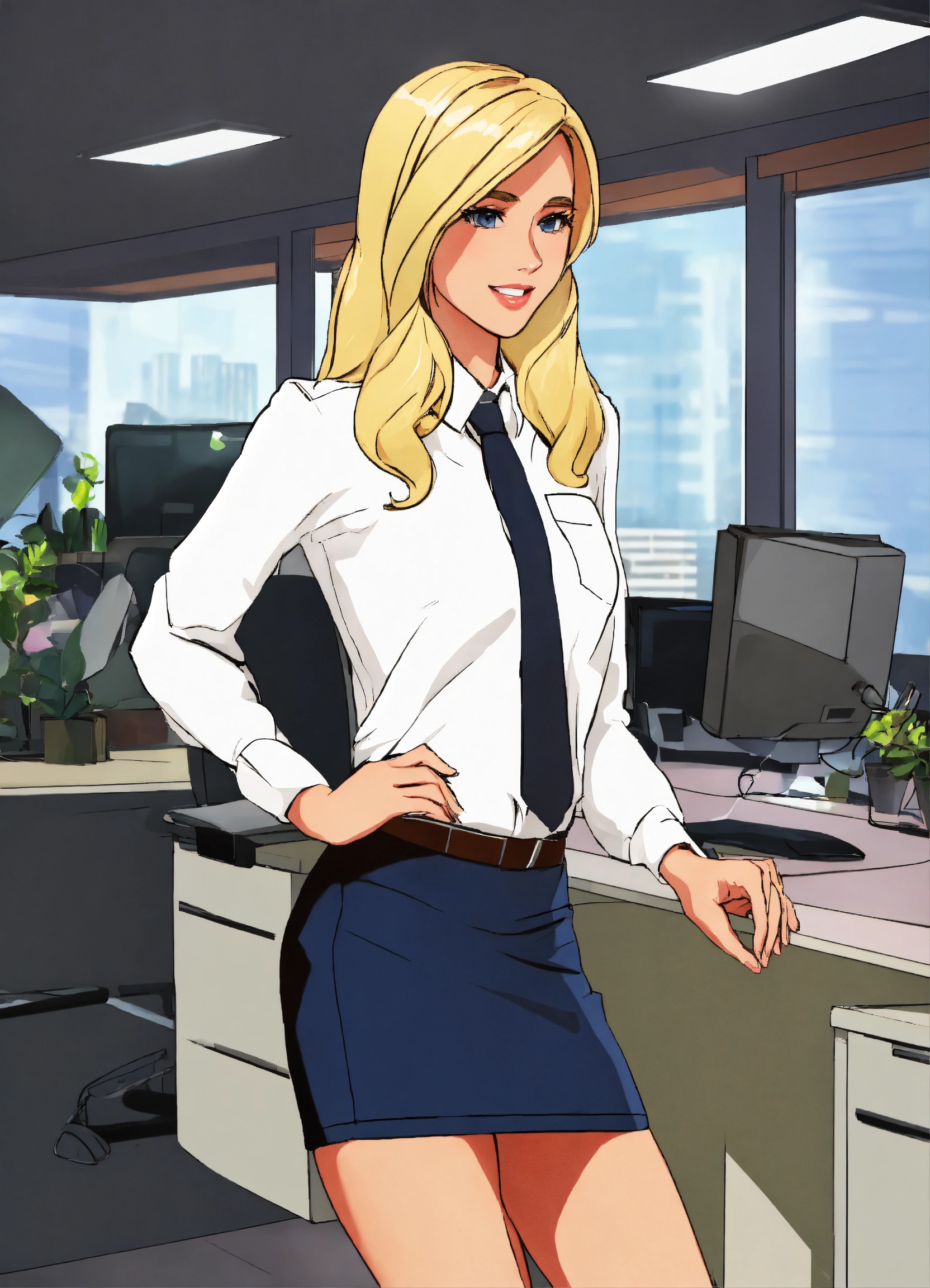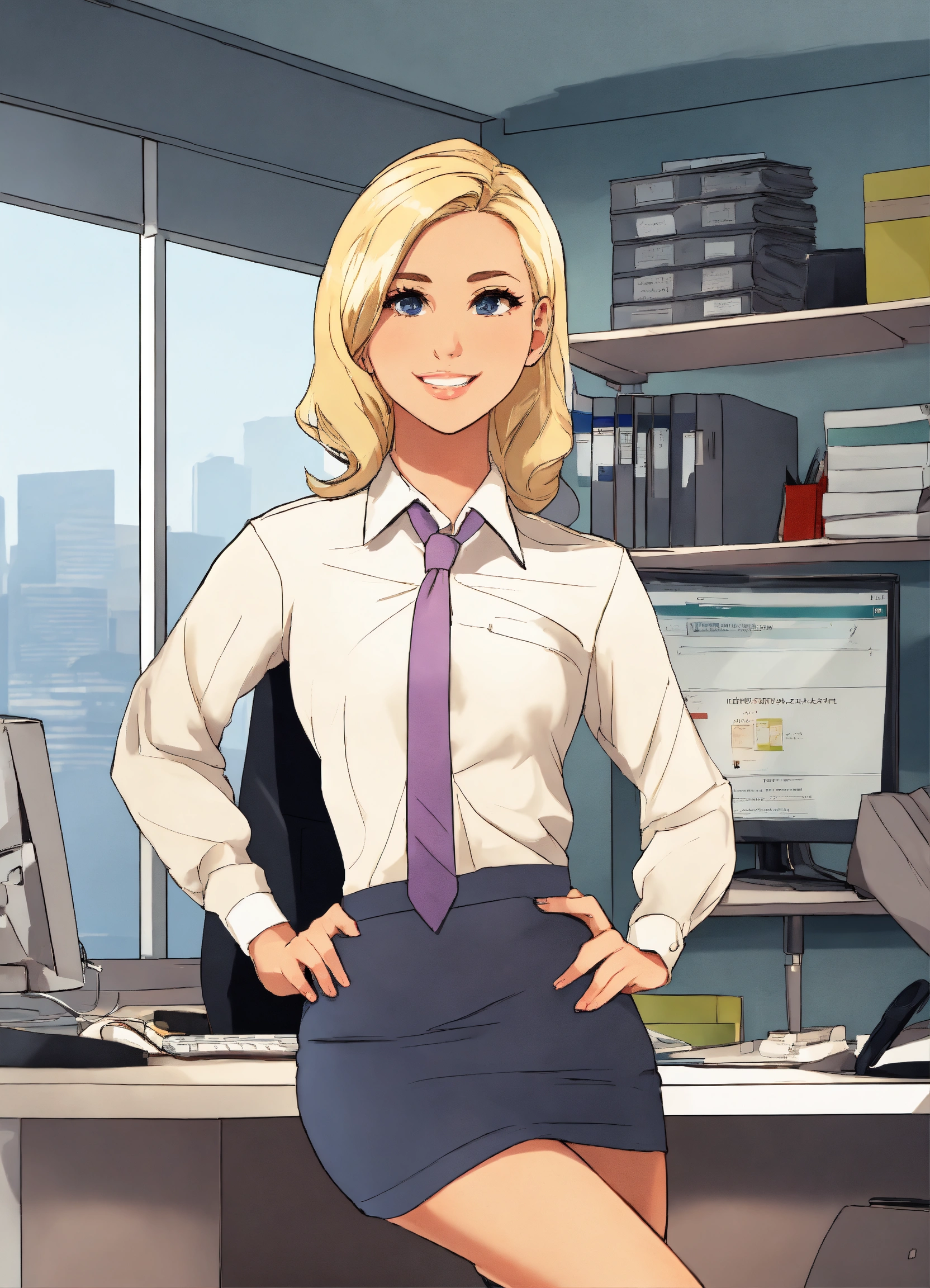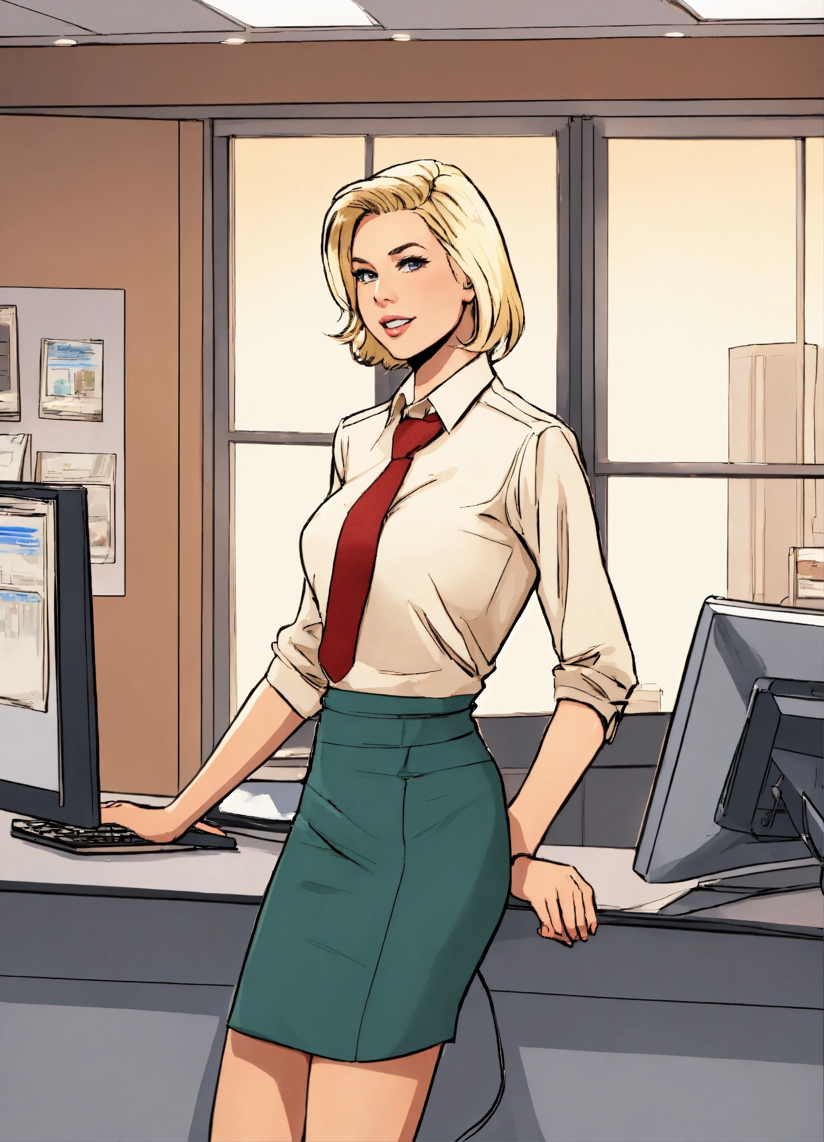 A blonde receptionist in a modern office, wearing a miniskirt, bending over, portrait. animated series
