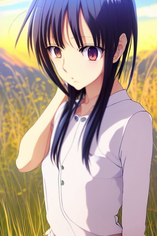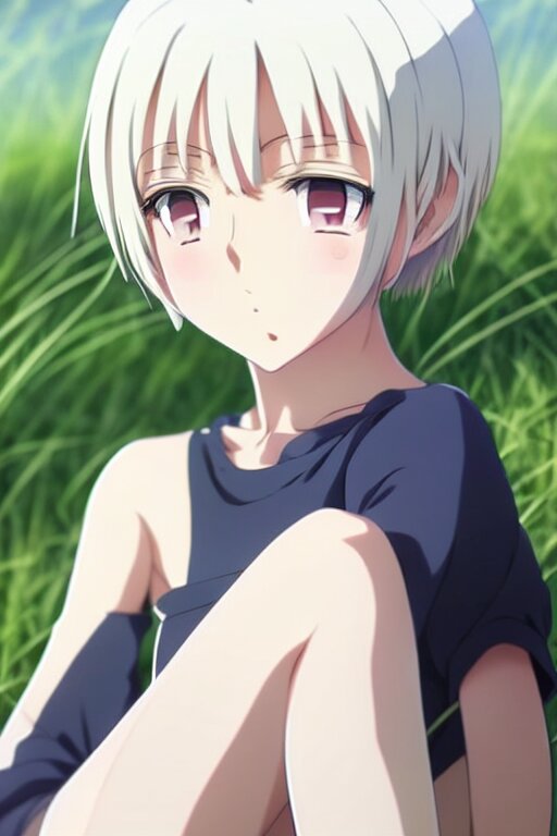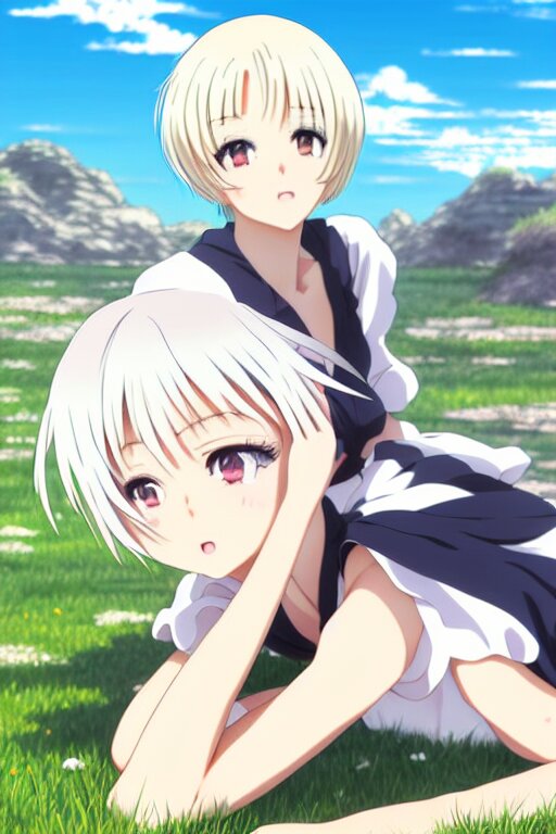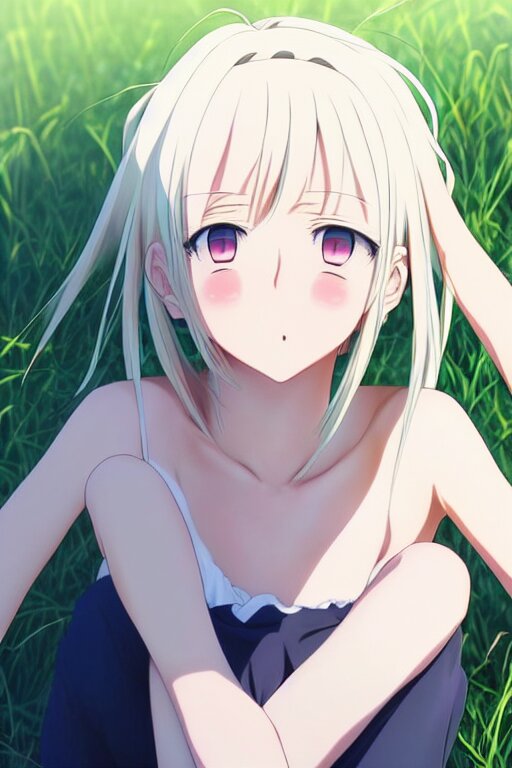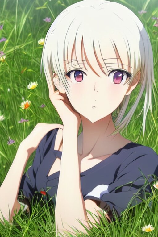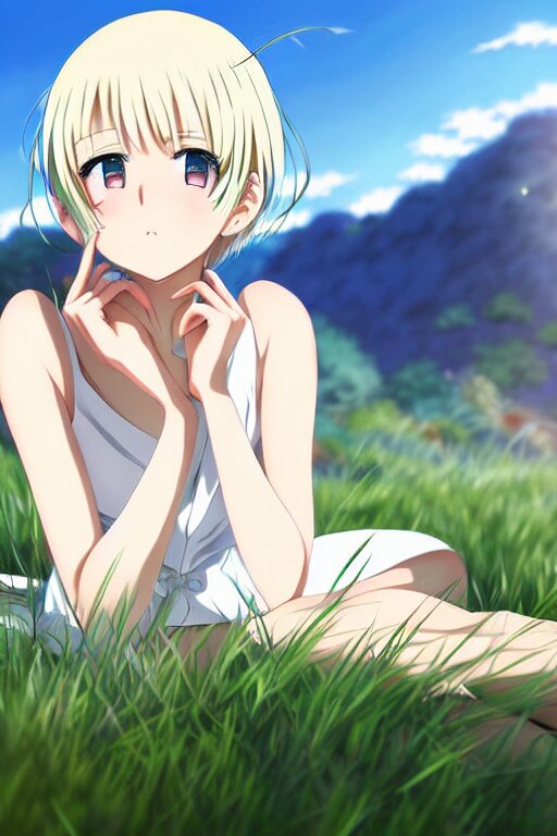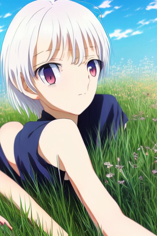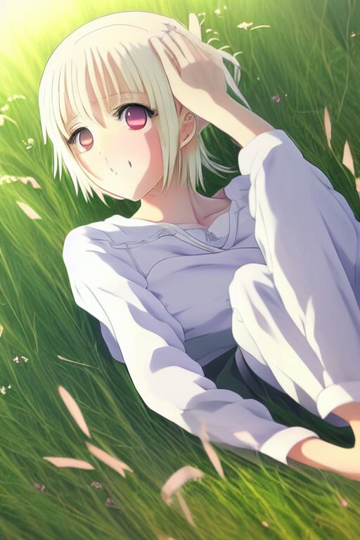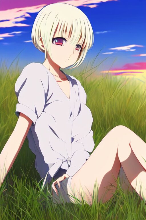 Anime art full body character concept art, anime key visual of elegant young female, platinum blonde straight bangs and large eyes, finely detailed perfect face delicate features directed gaze, laying down in the grass at sunset!!!!!! in a valley, golden hour sunset lighting, trending on pixiv fanbox, studio ghibli, extremely high quality artwork