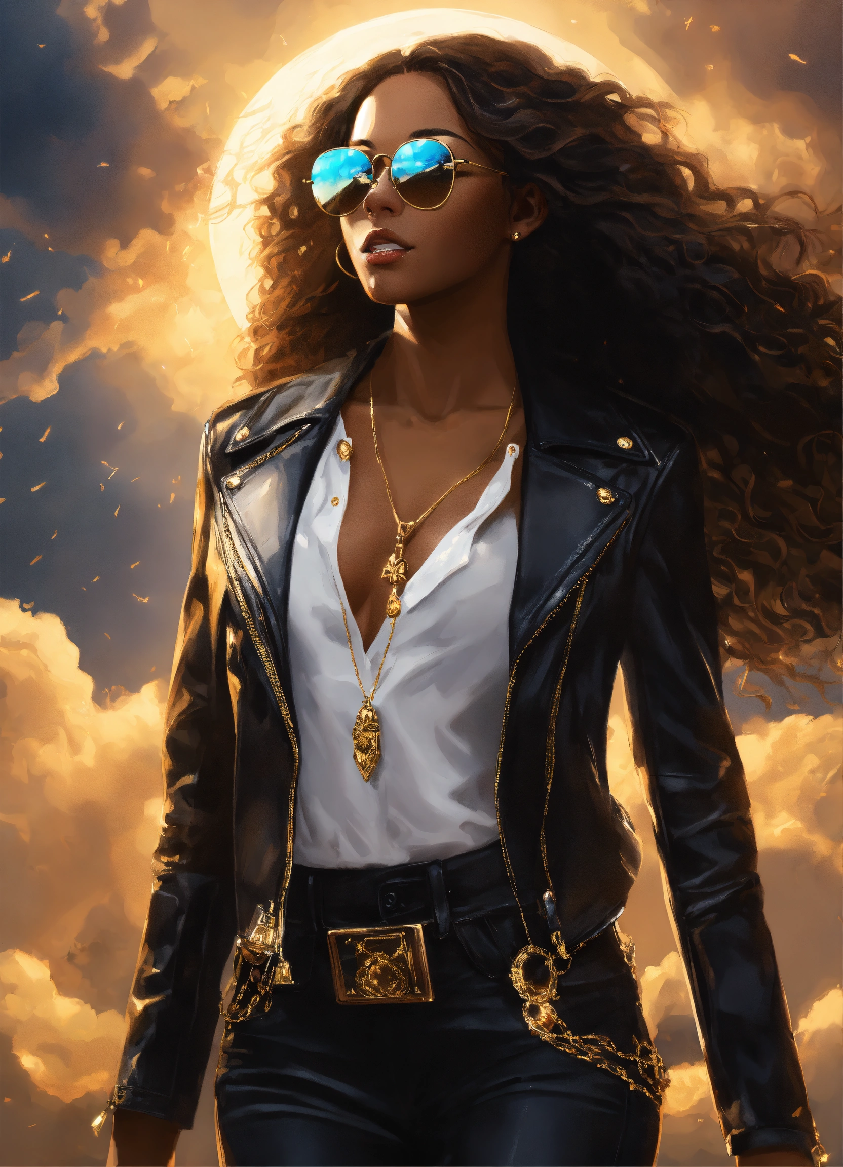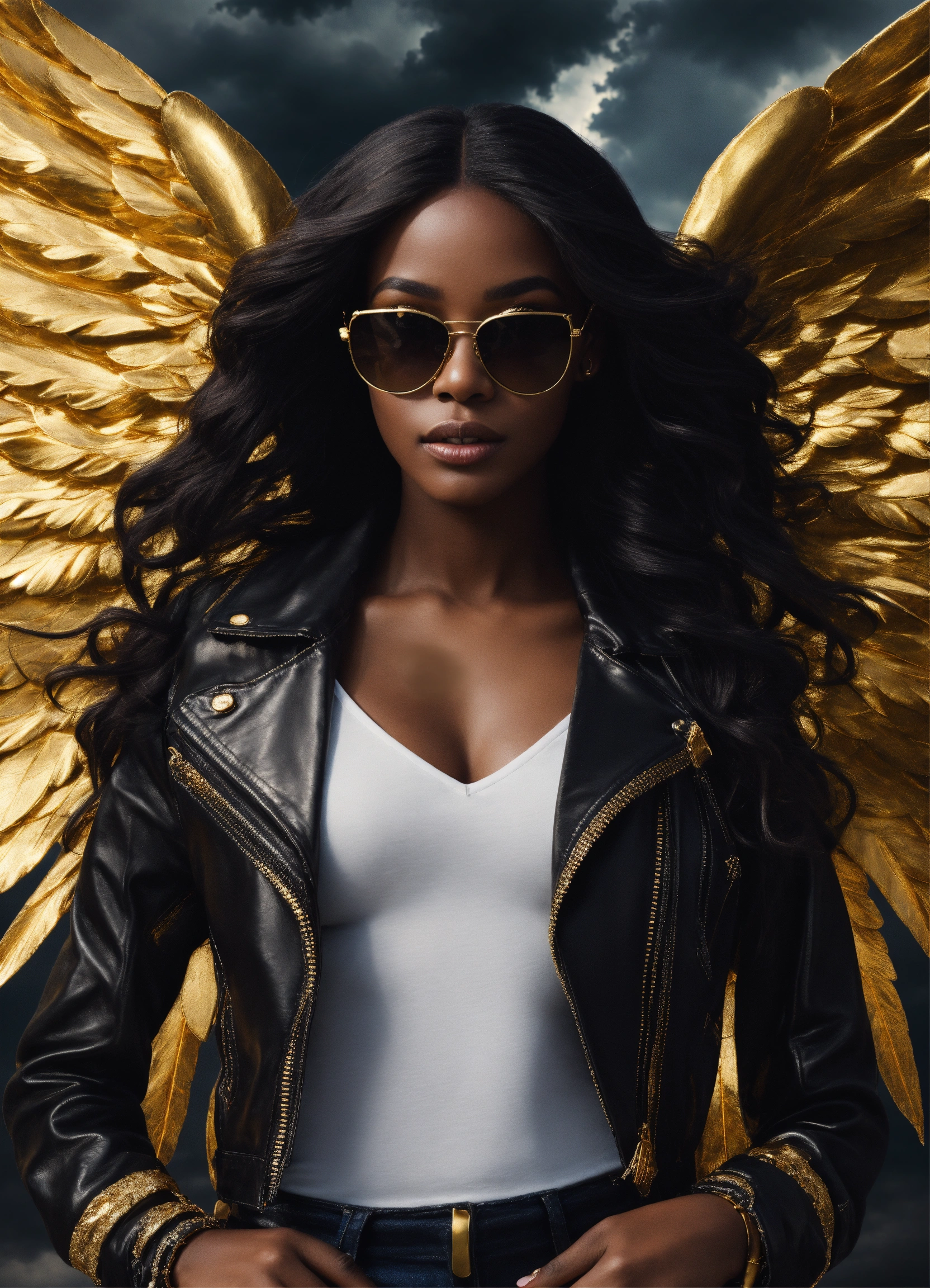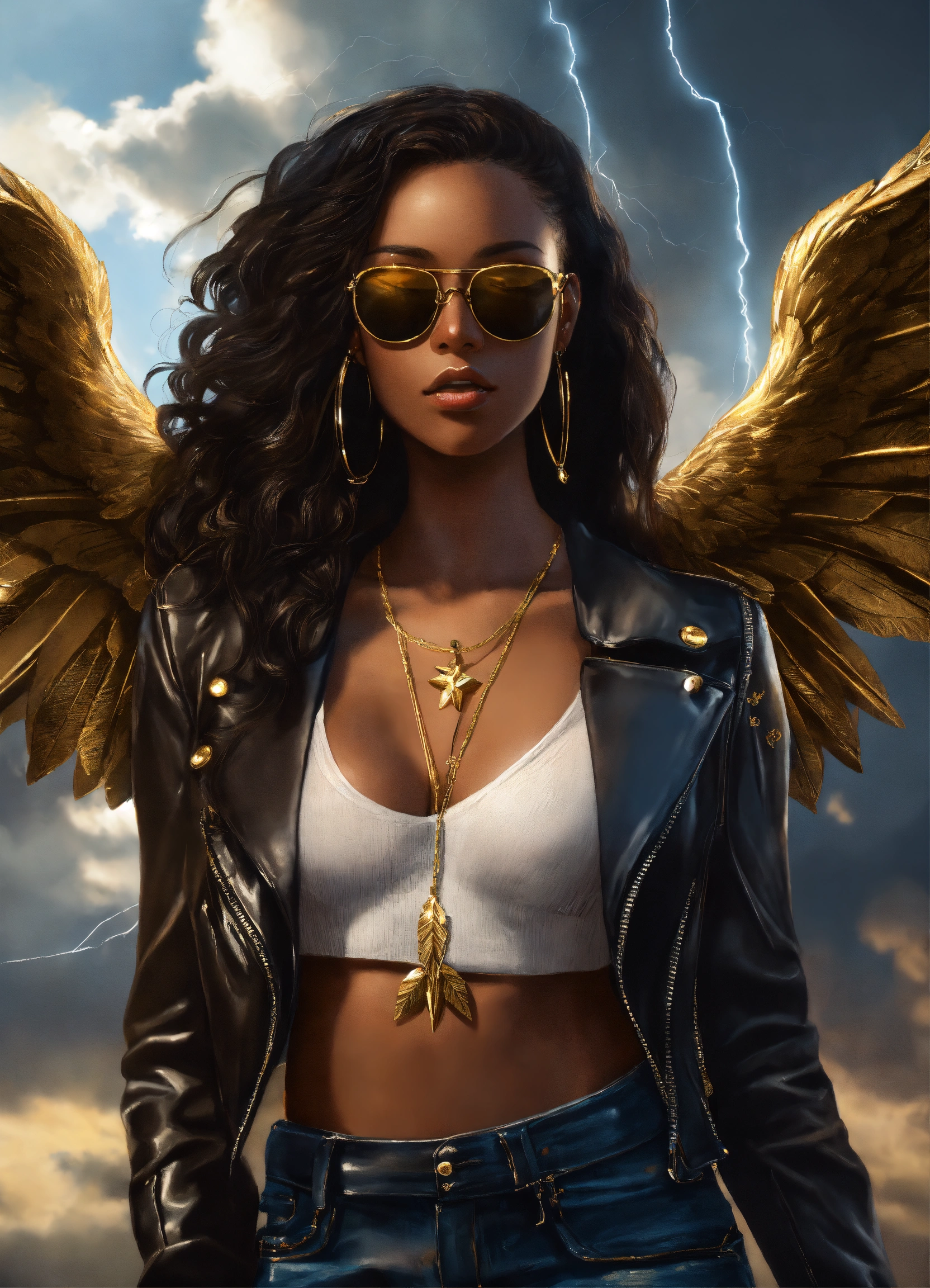 Full body beautiful black goddess angel with wings, beautiful black angel woman with dark brown skin, beautiful perfect face, shapely hour-glass figure long flowing hair, fully clothed black leather jacket, jean pants and white blouse with gold accessories and sunglasses, she's floating in the sky with gold lightning dark clouds behind her, high detail, realistic photo, high detail, digital painting, cinematic, stunning, hyper-realistic, sharp focus, high resolution 8k, insanely detailed