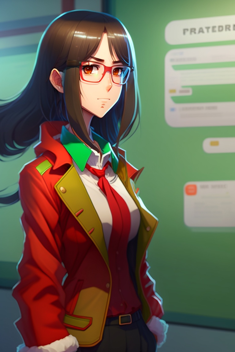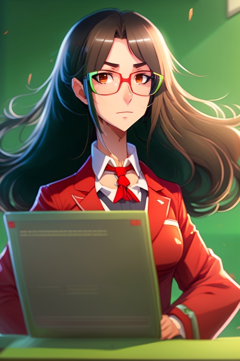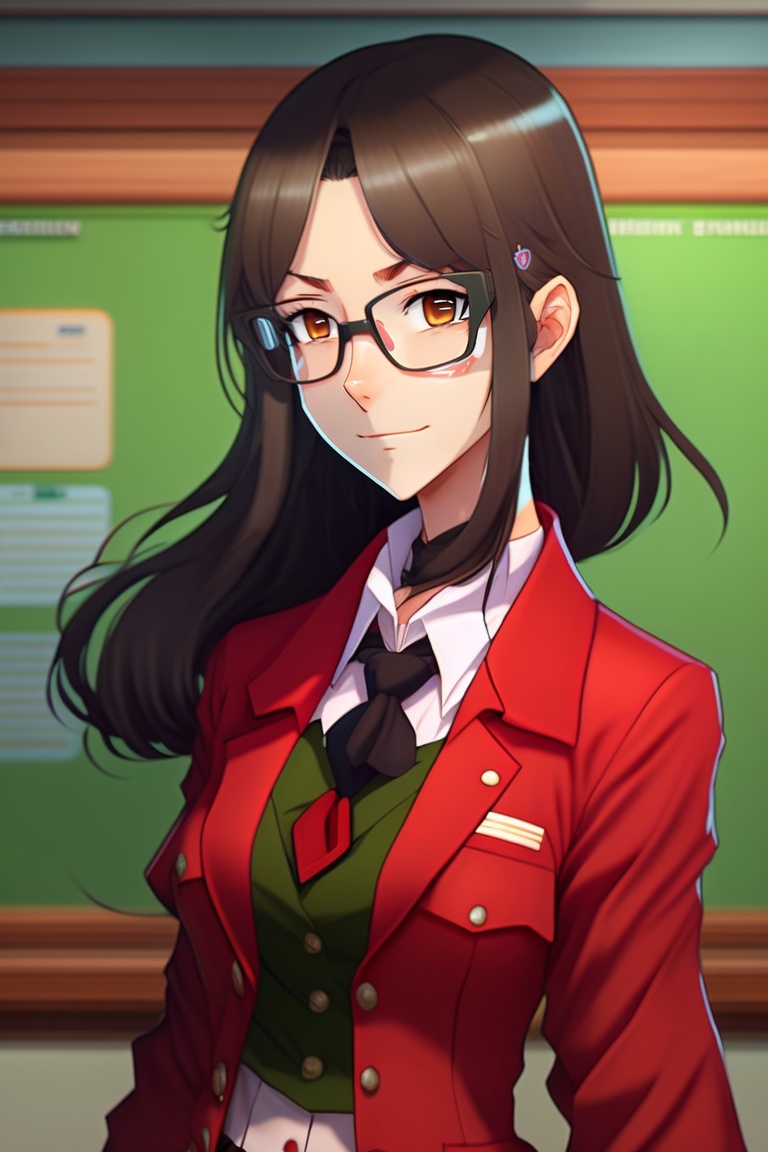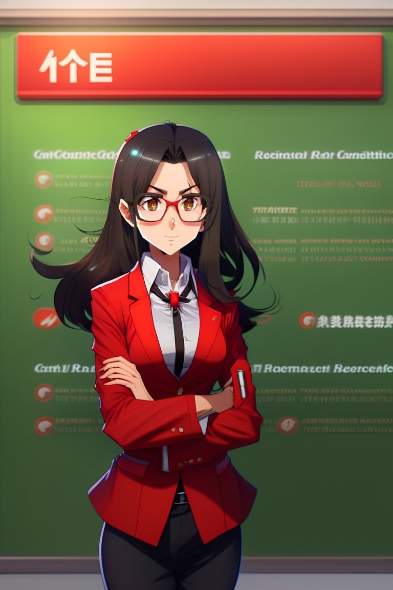 Female anime teacher, wearing a red jacket, square glasses, brown eyes, long black hair tied over shoulder, looked down at the class and angry, standing in front of the green board