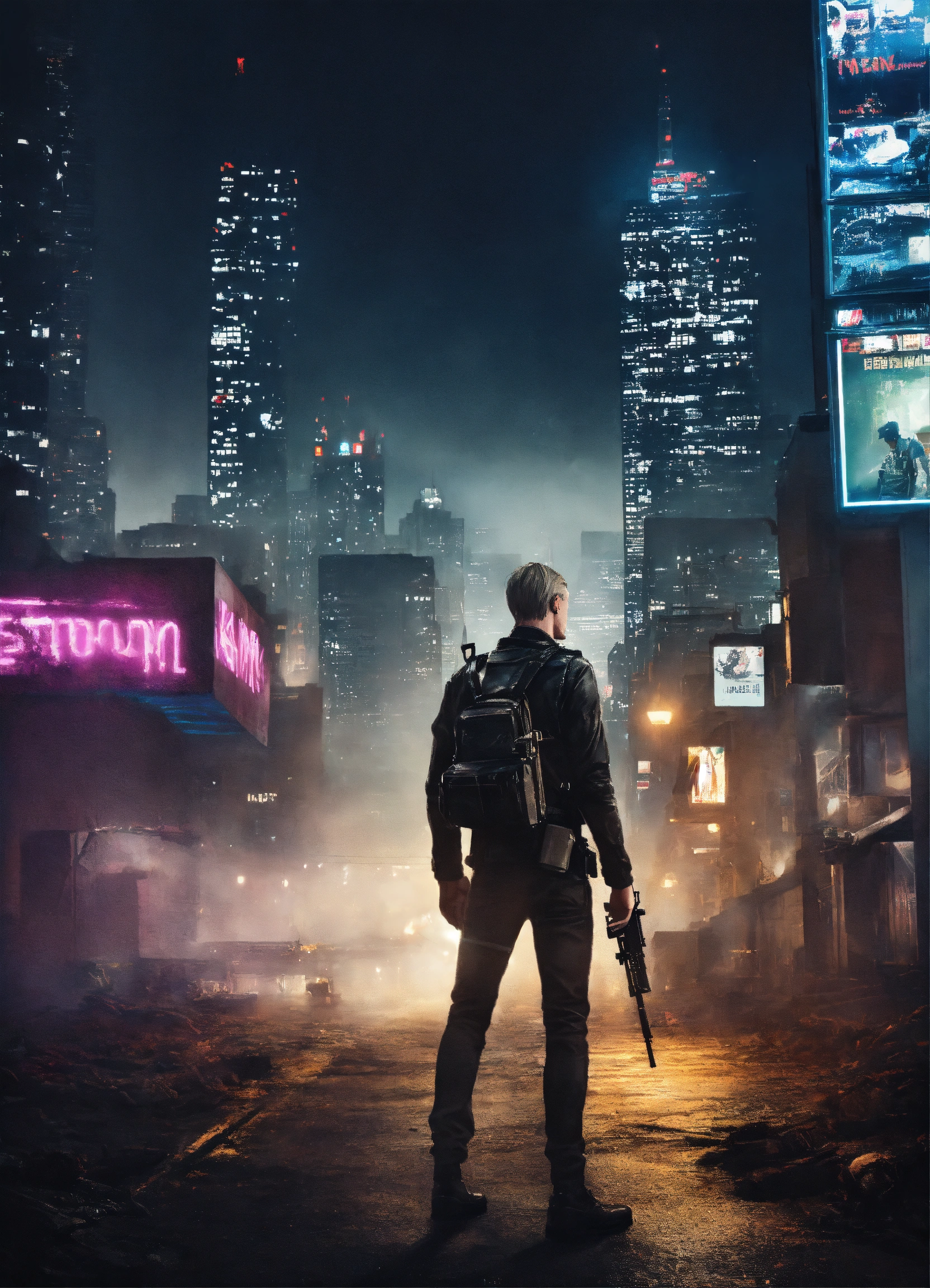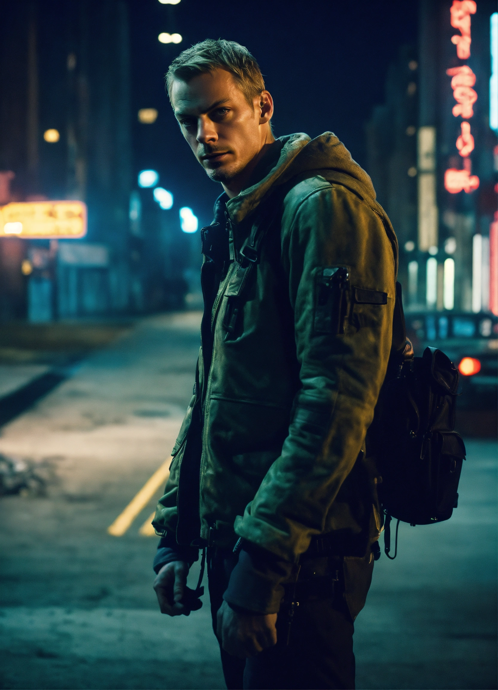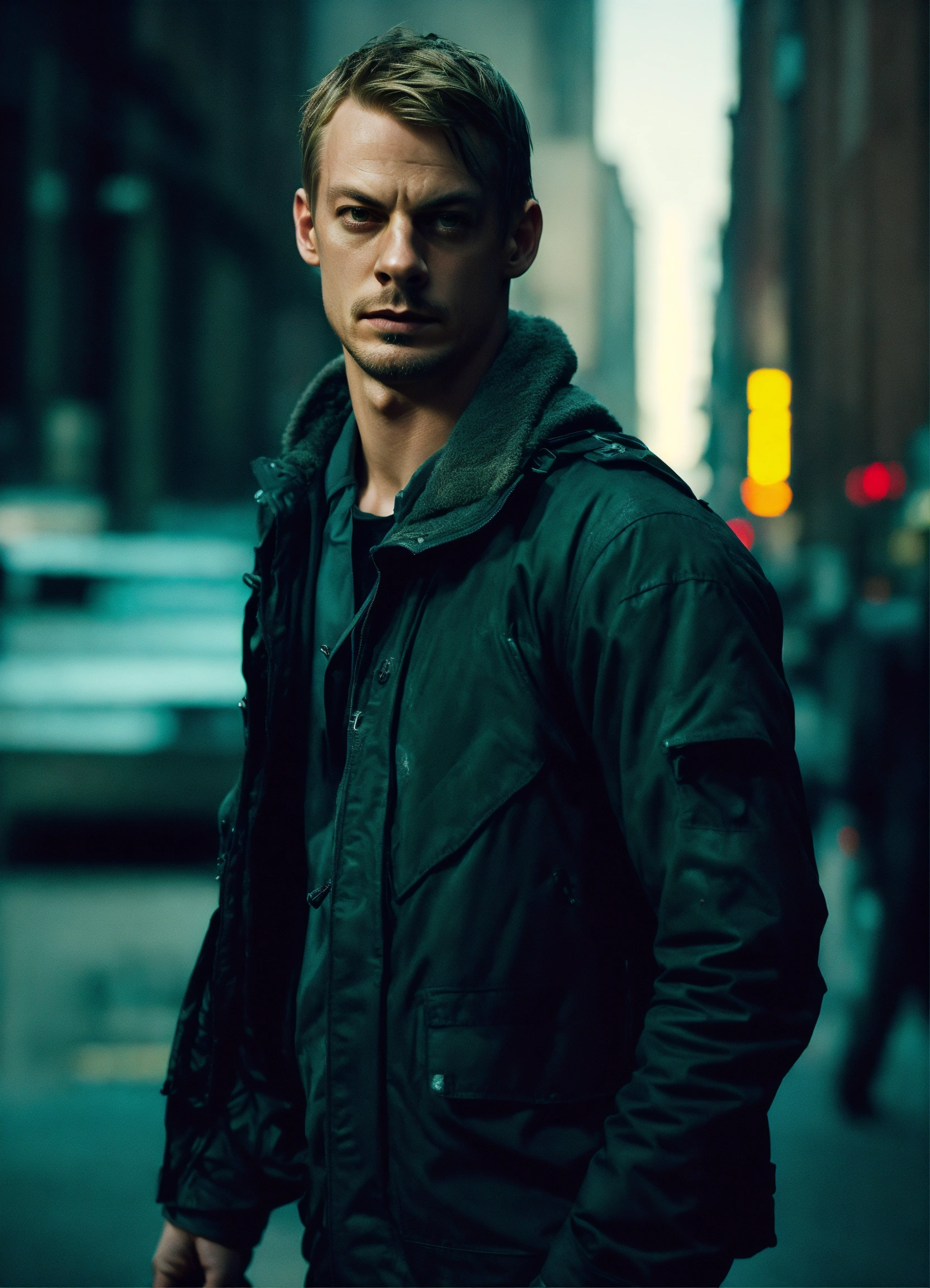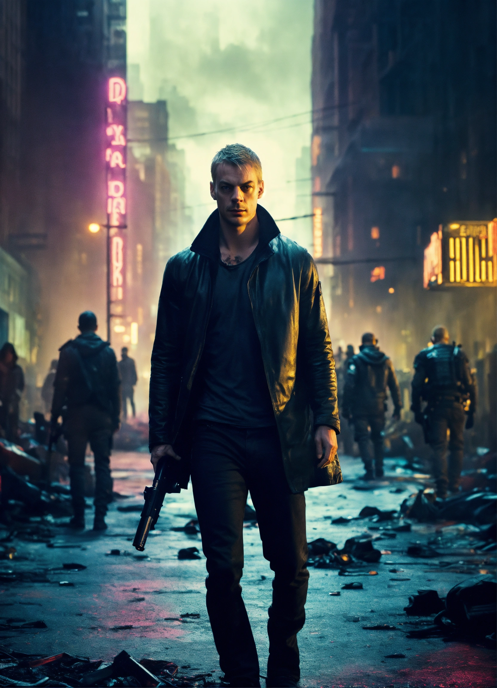Young handsome tall joel kinnaman, dystopian, dark, walk, city, white, light, neon, cinematic, epic, detailed, zombie, realistic photo