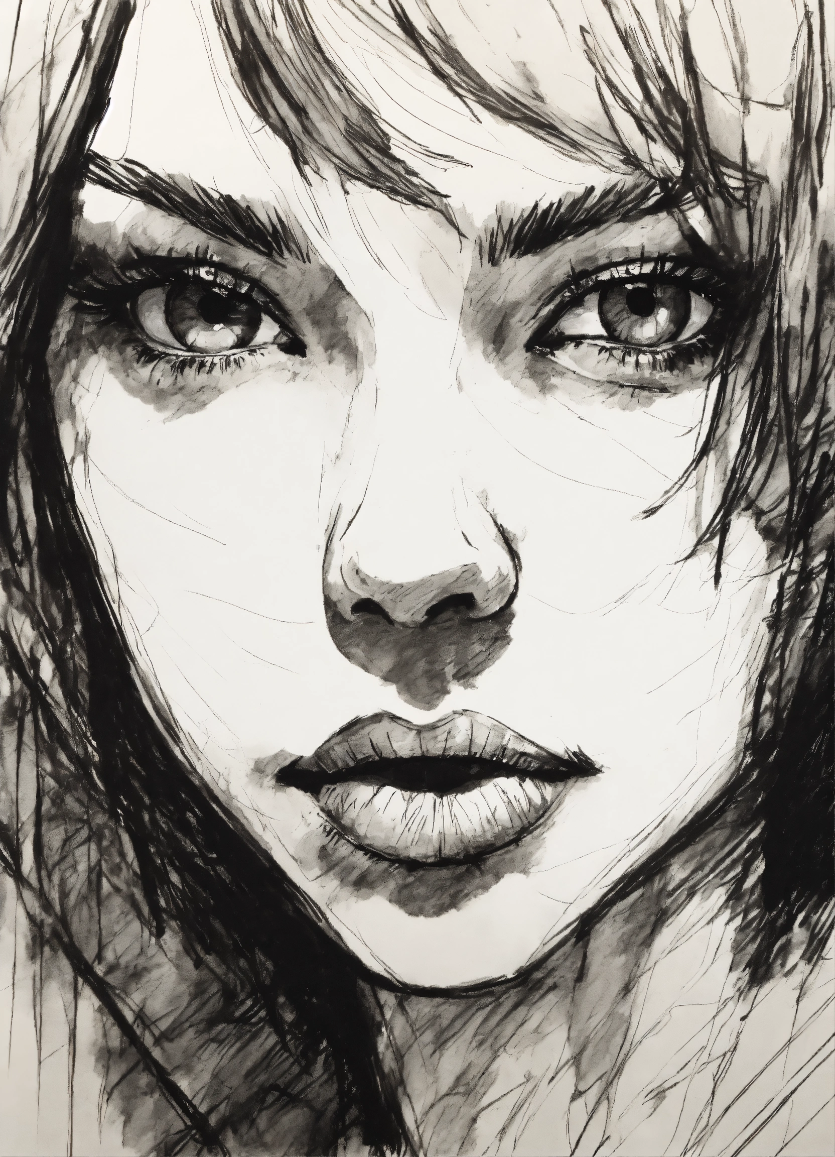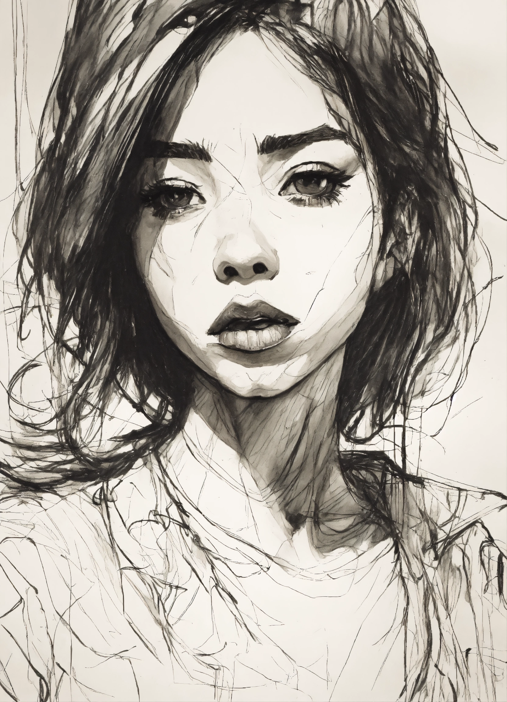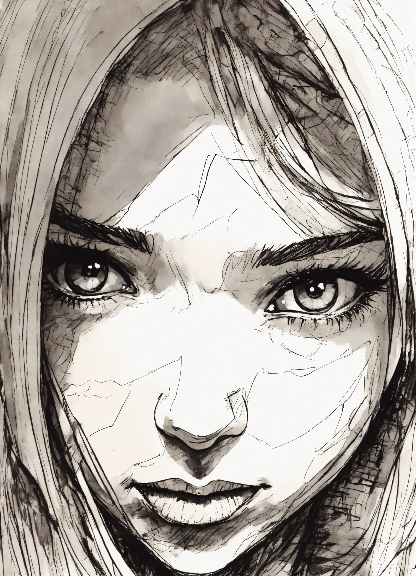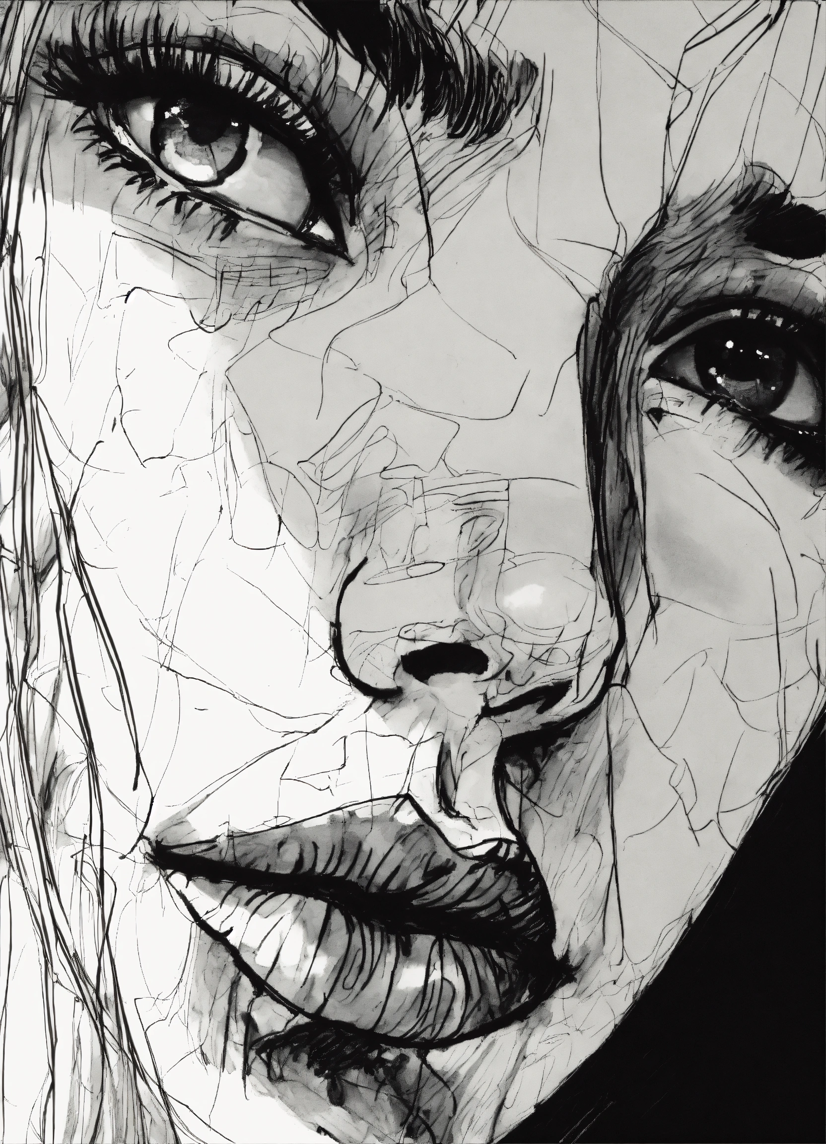 Scratchy pen strokes, blind contour, fisheye perspective closeup, beautiful girl, s face in darkness, stark hatch shaded sketchy scribbly, ink, strong angular shapes, woodcut shading, pen strokes, pouty lips, hungry eyes, minimalist realistic, anime proportions, distorted perspective