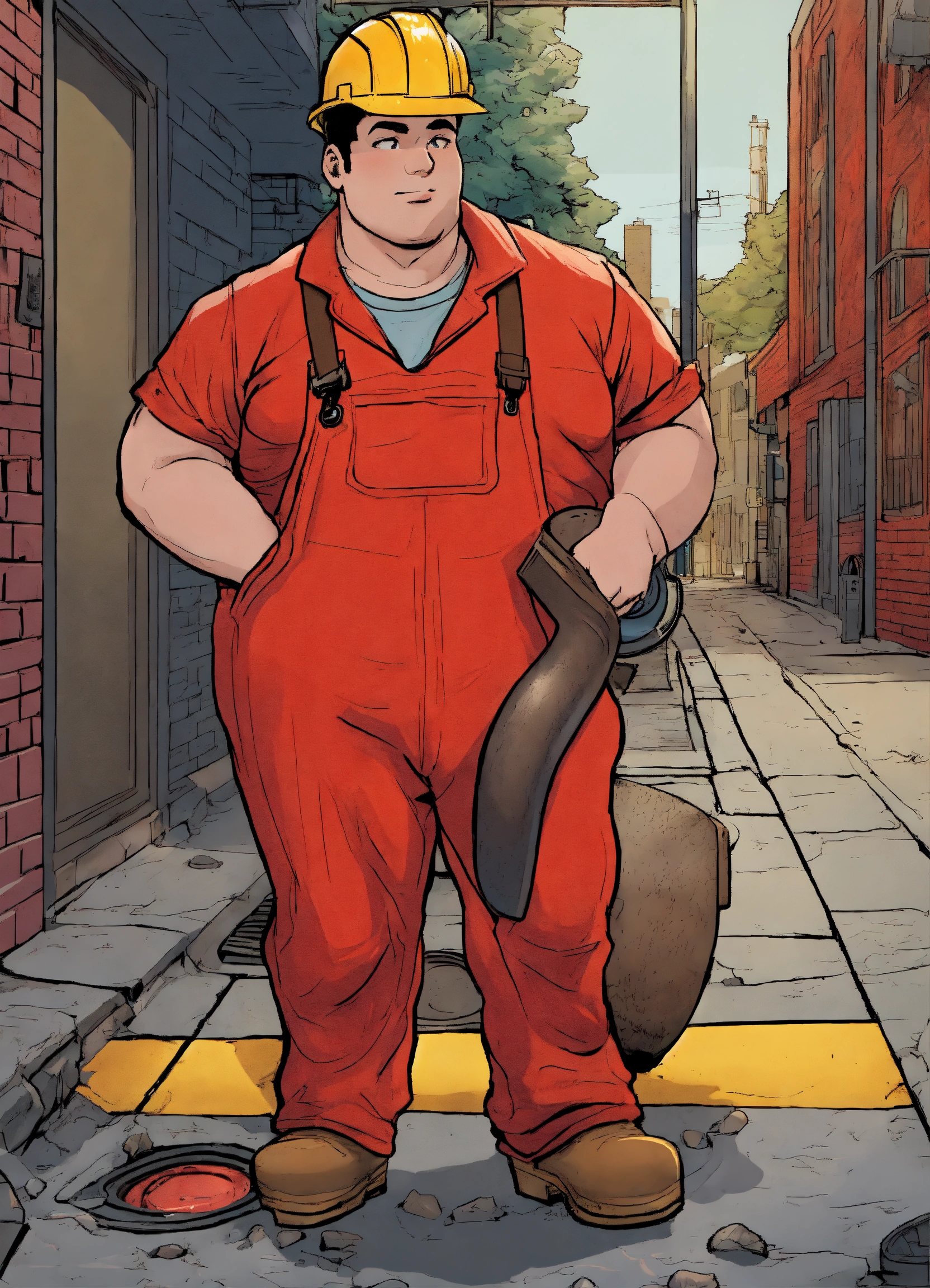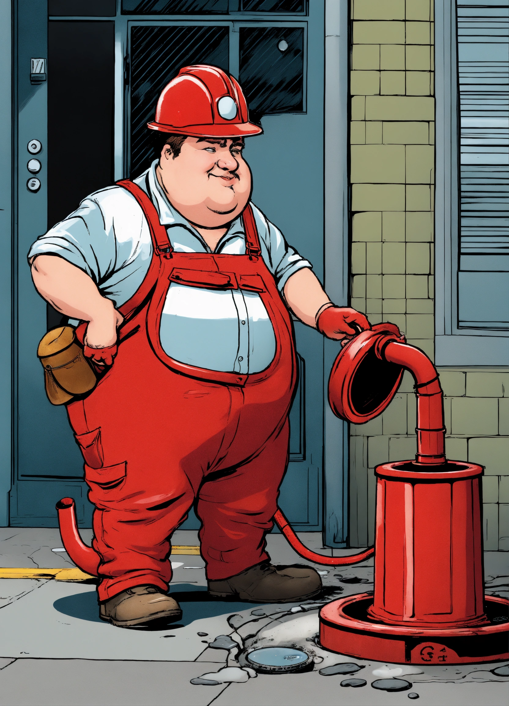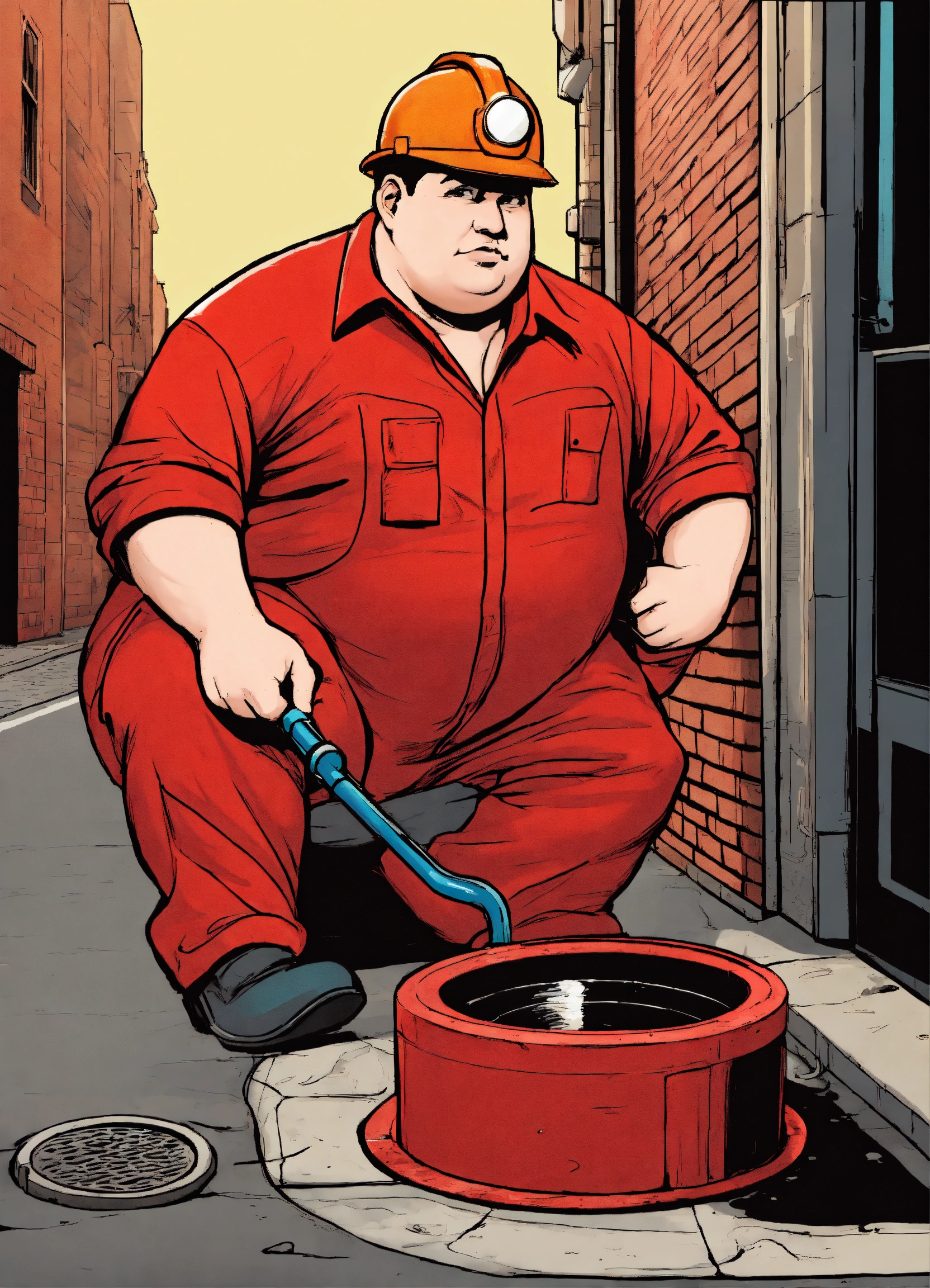 A plumper with a red overall outfit and a red hard hat put a pipe in to the manhole cover on the street, comic style