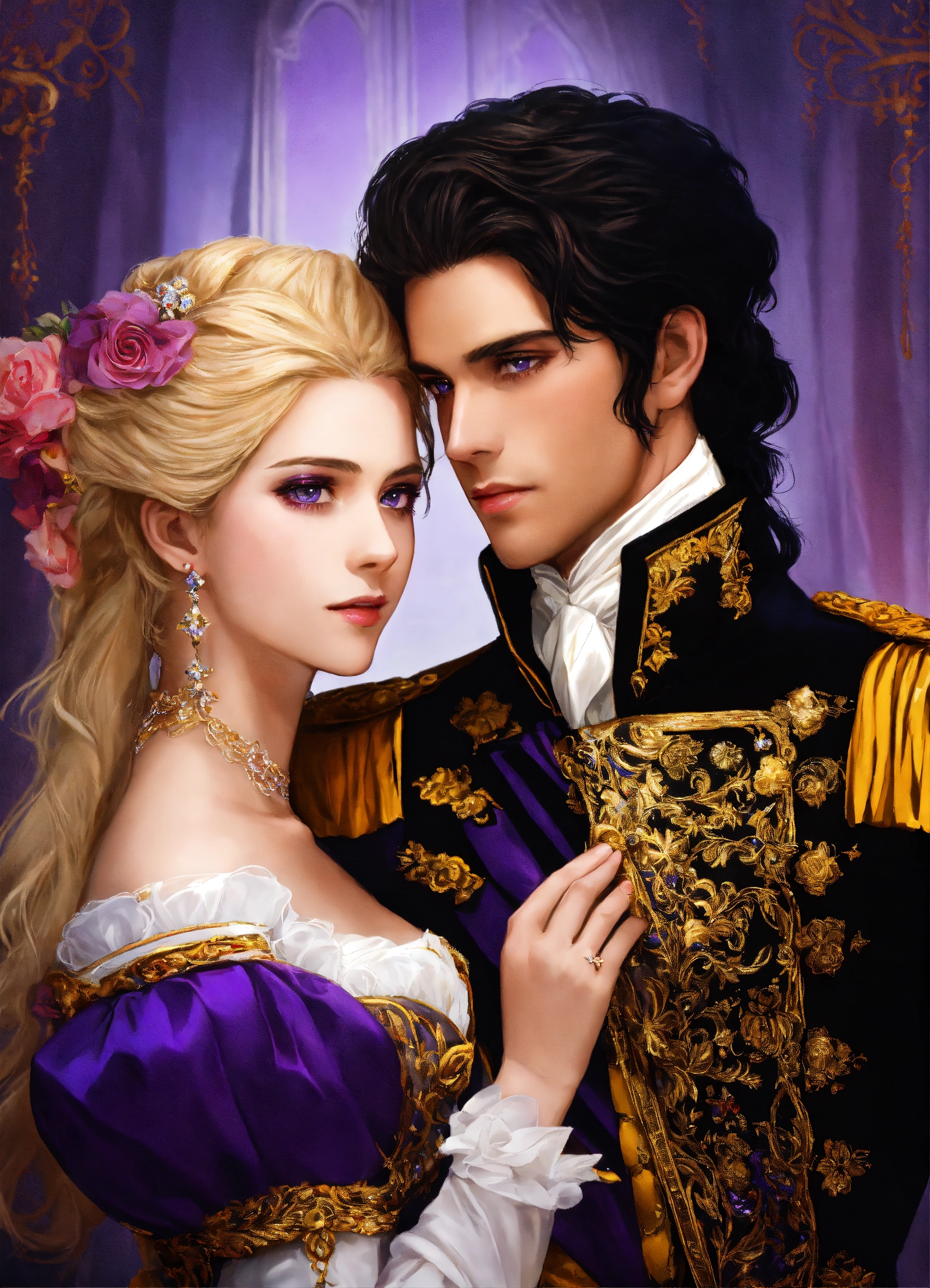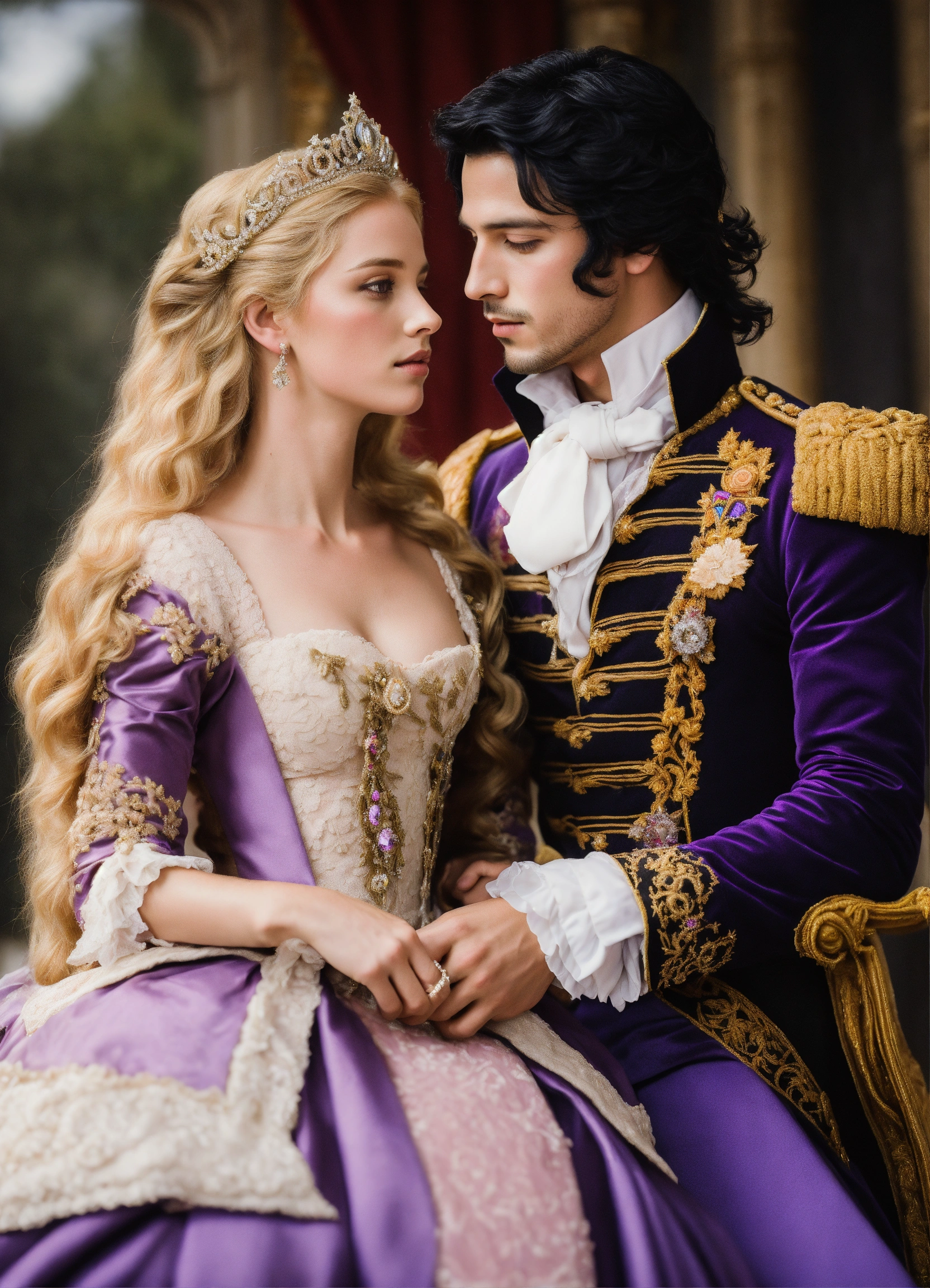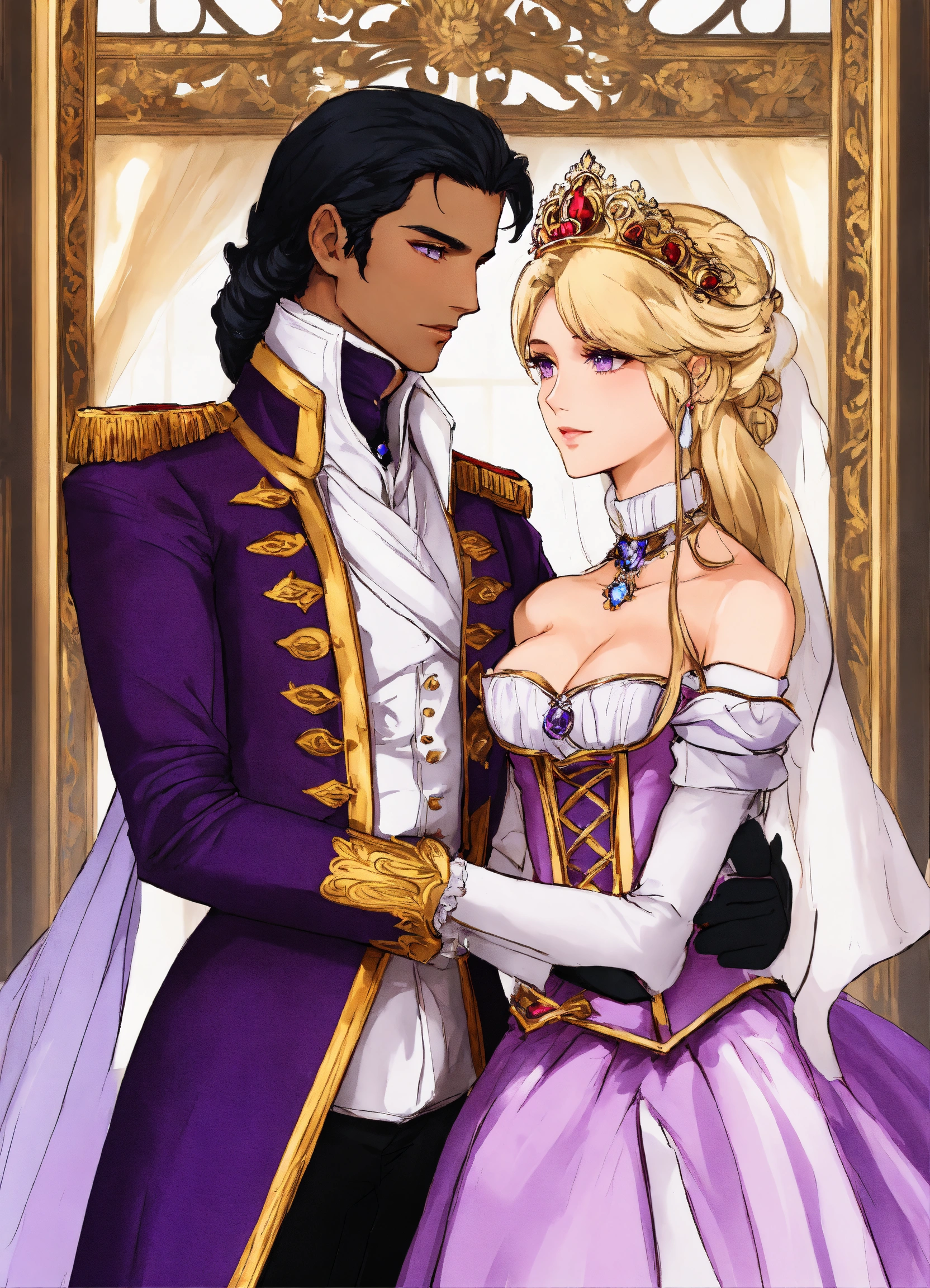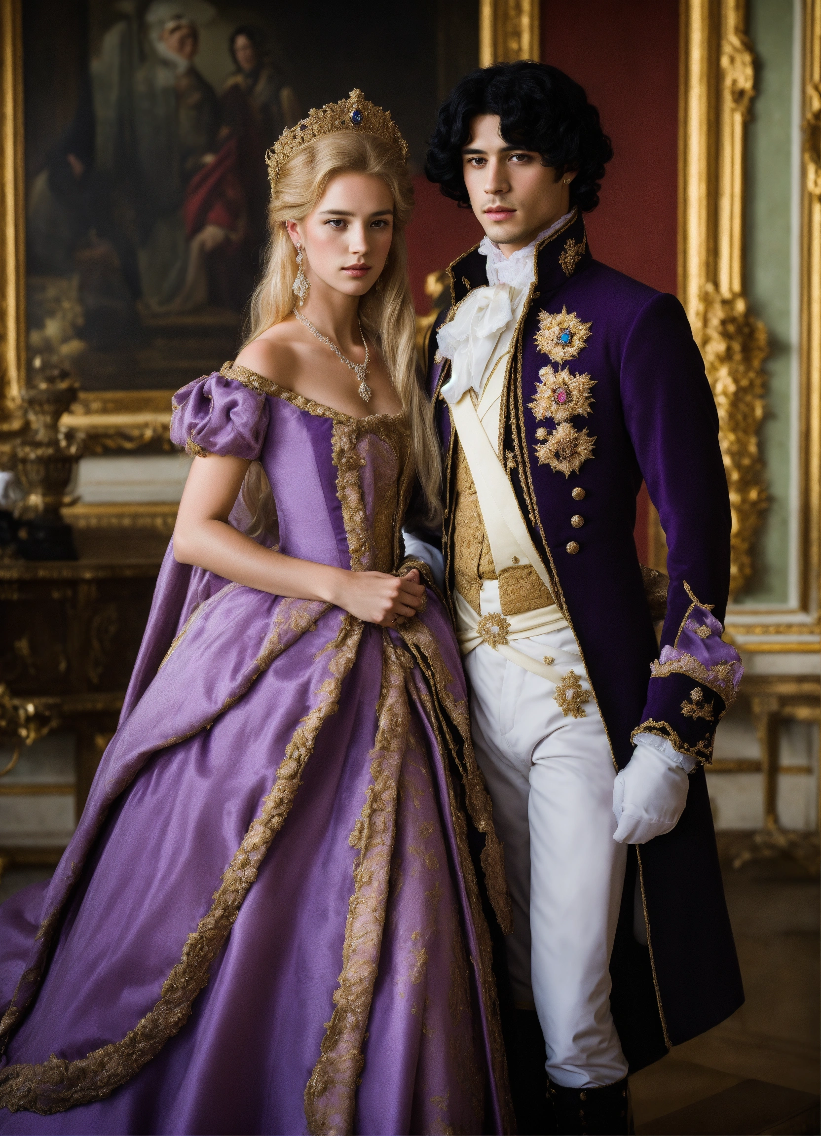 Princess of versailles with blond hair and prince with very cut black hair and costums black and purple get married portrait