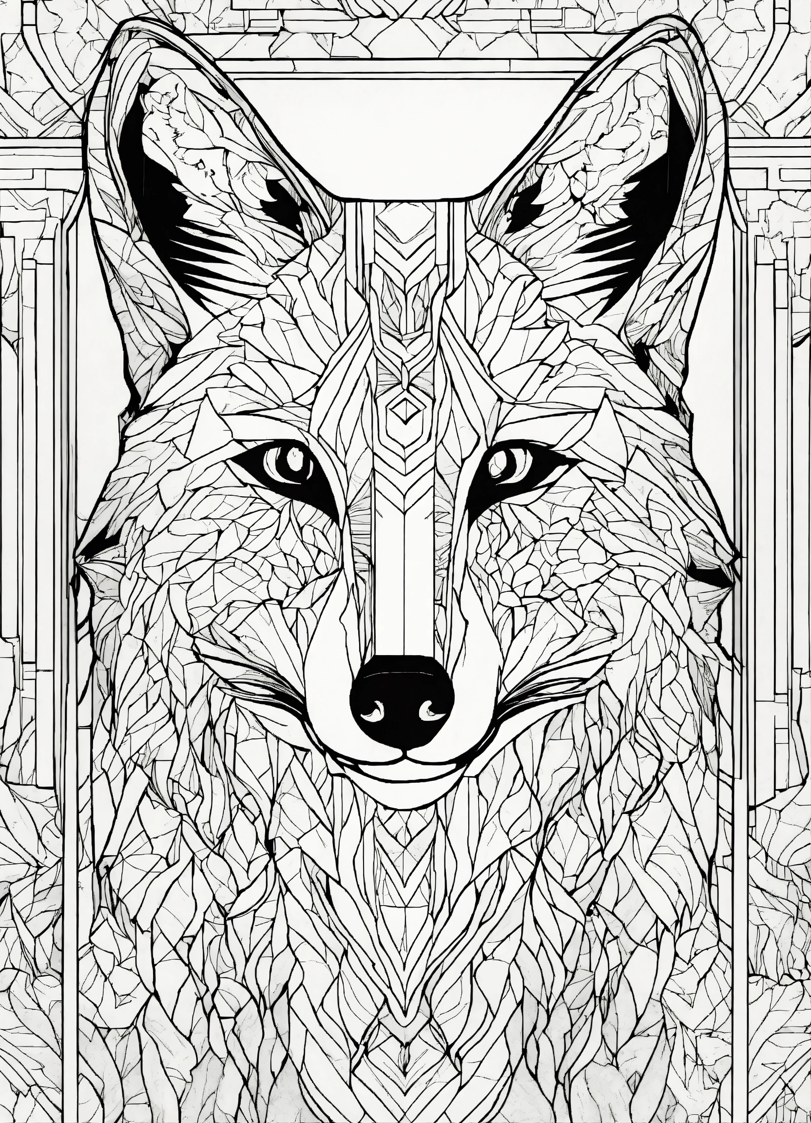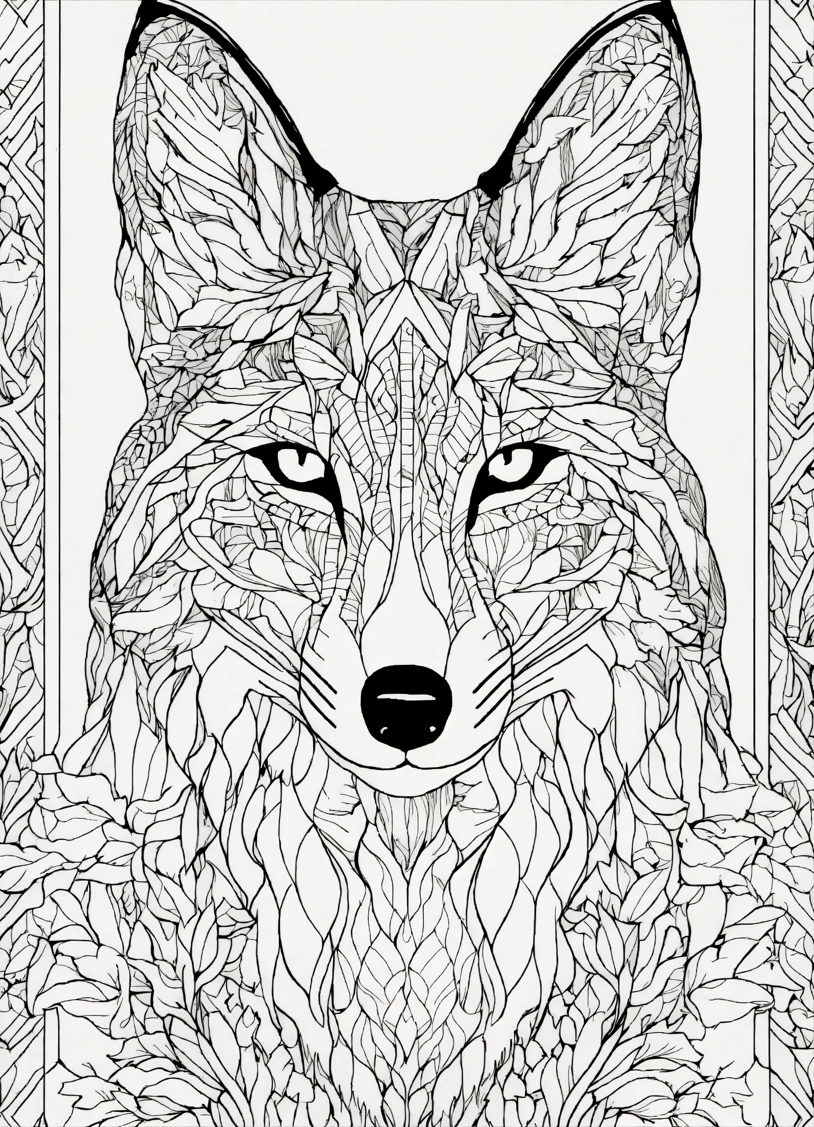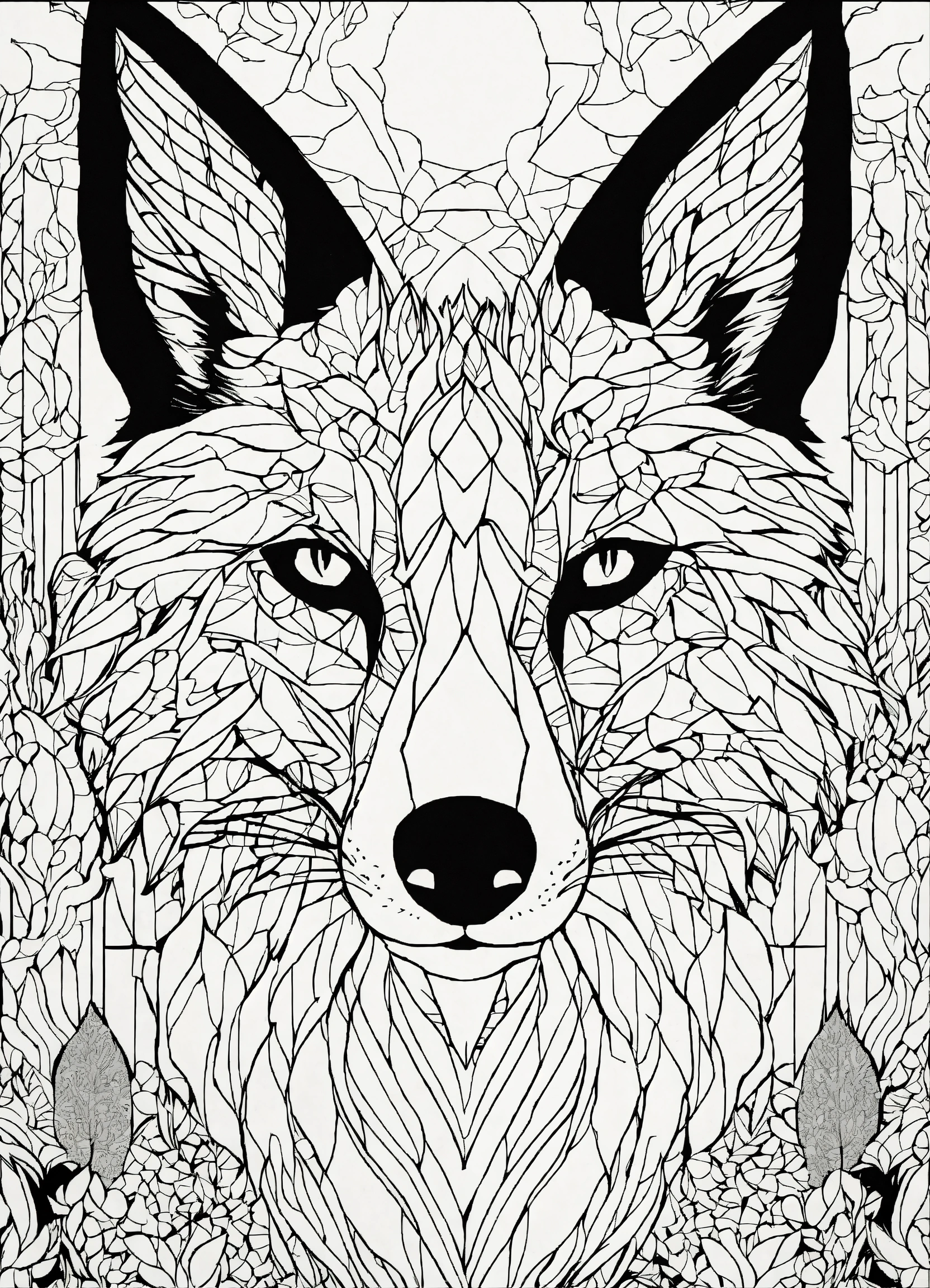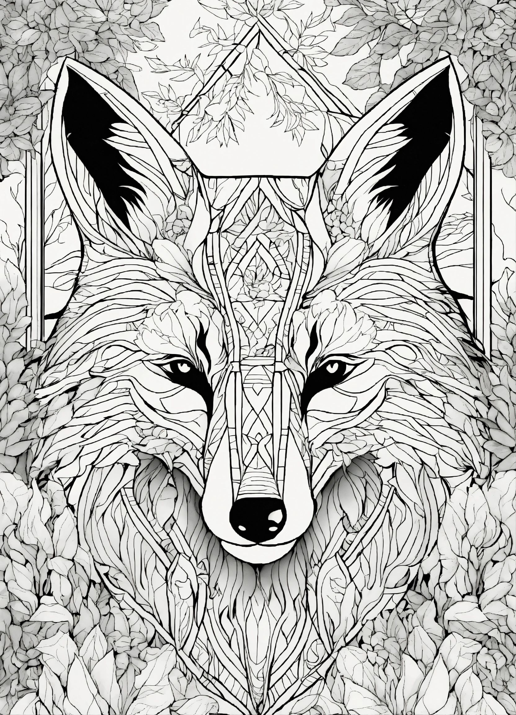 Coloring book, connected lines, symmetry, one fox head, facing front, black and white, beautiful forest background, ink fine line art stylized, vector, design for tattoo, african pattern