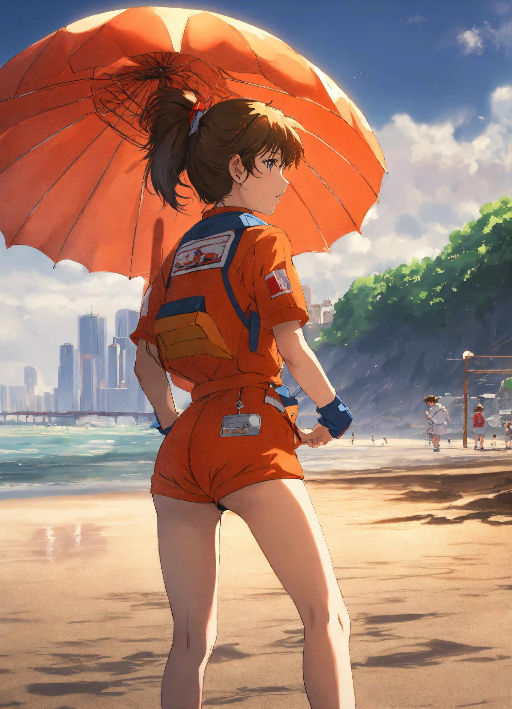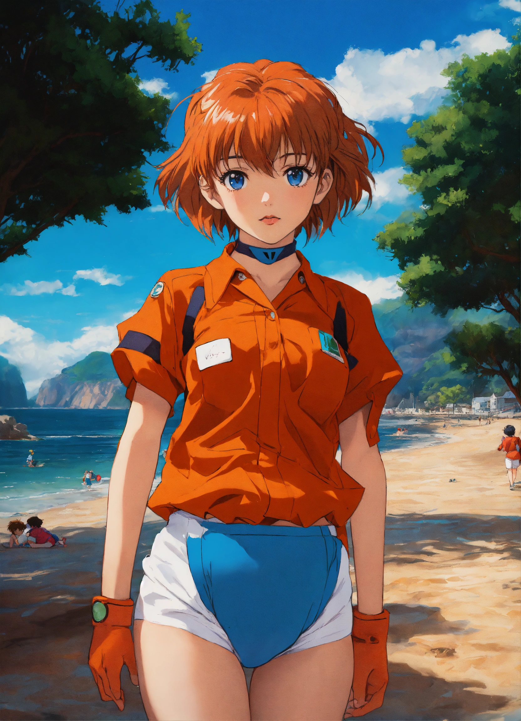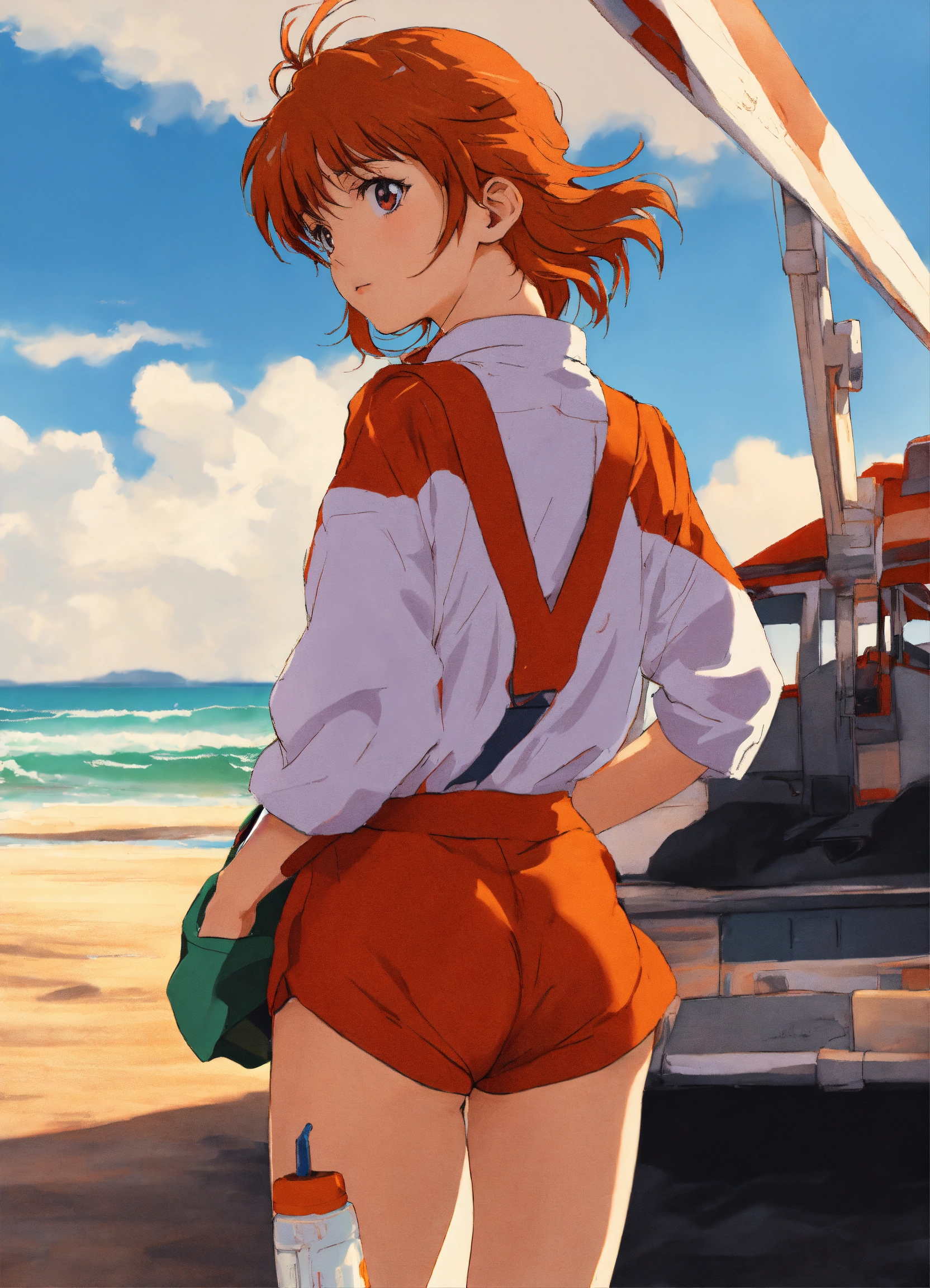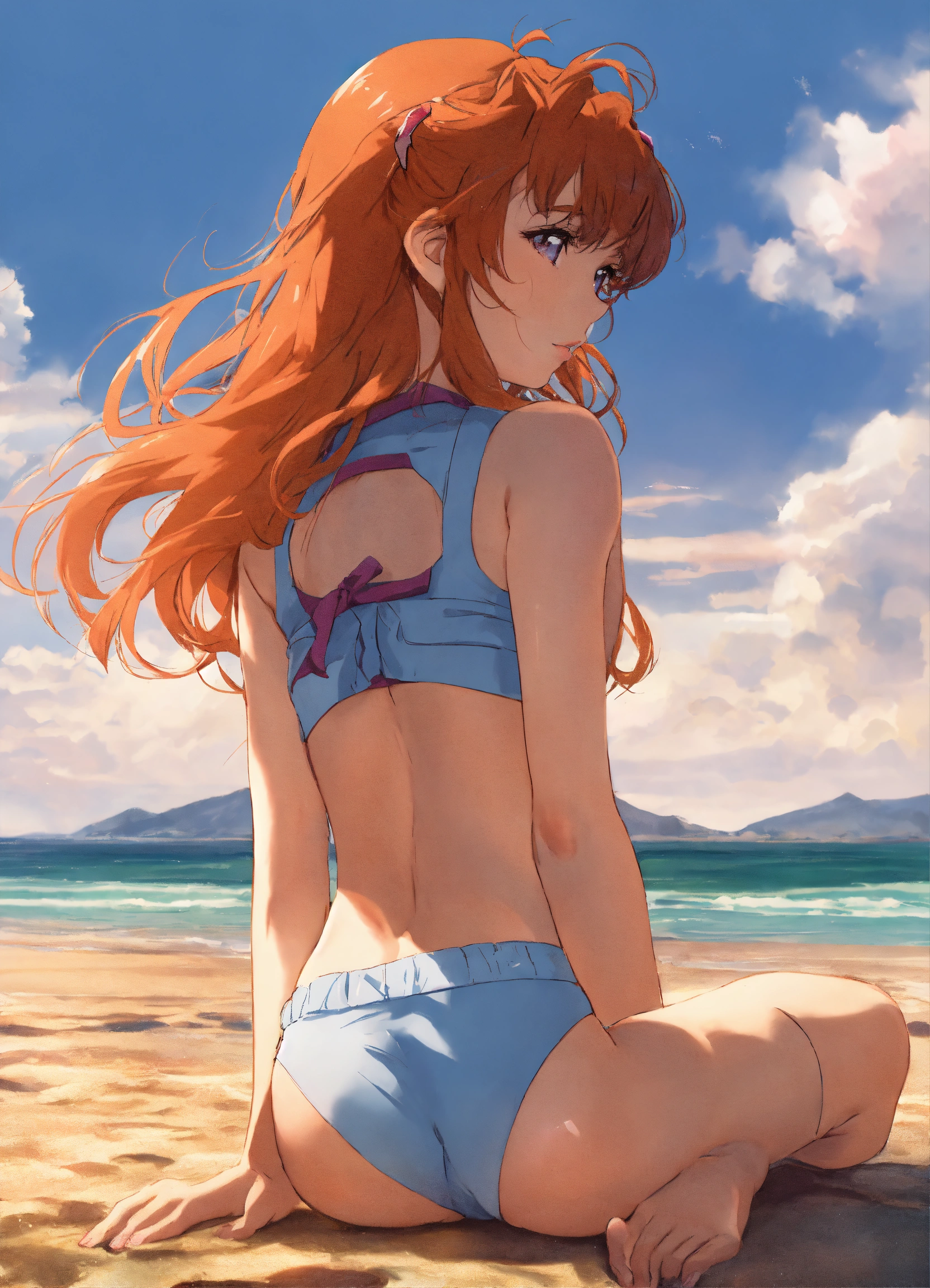 Anime art of asuka from evangelion wearing a diaper, diapered, beautiful girl, toddler, young girl, back, realistic, legs, vintage 80s anime art, 8k, stunning detail, realism, trending on artstation, ray-traced environment, detailed scenery, beach, sunny