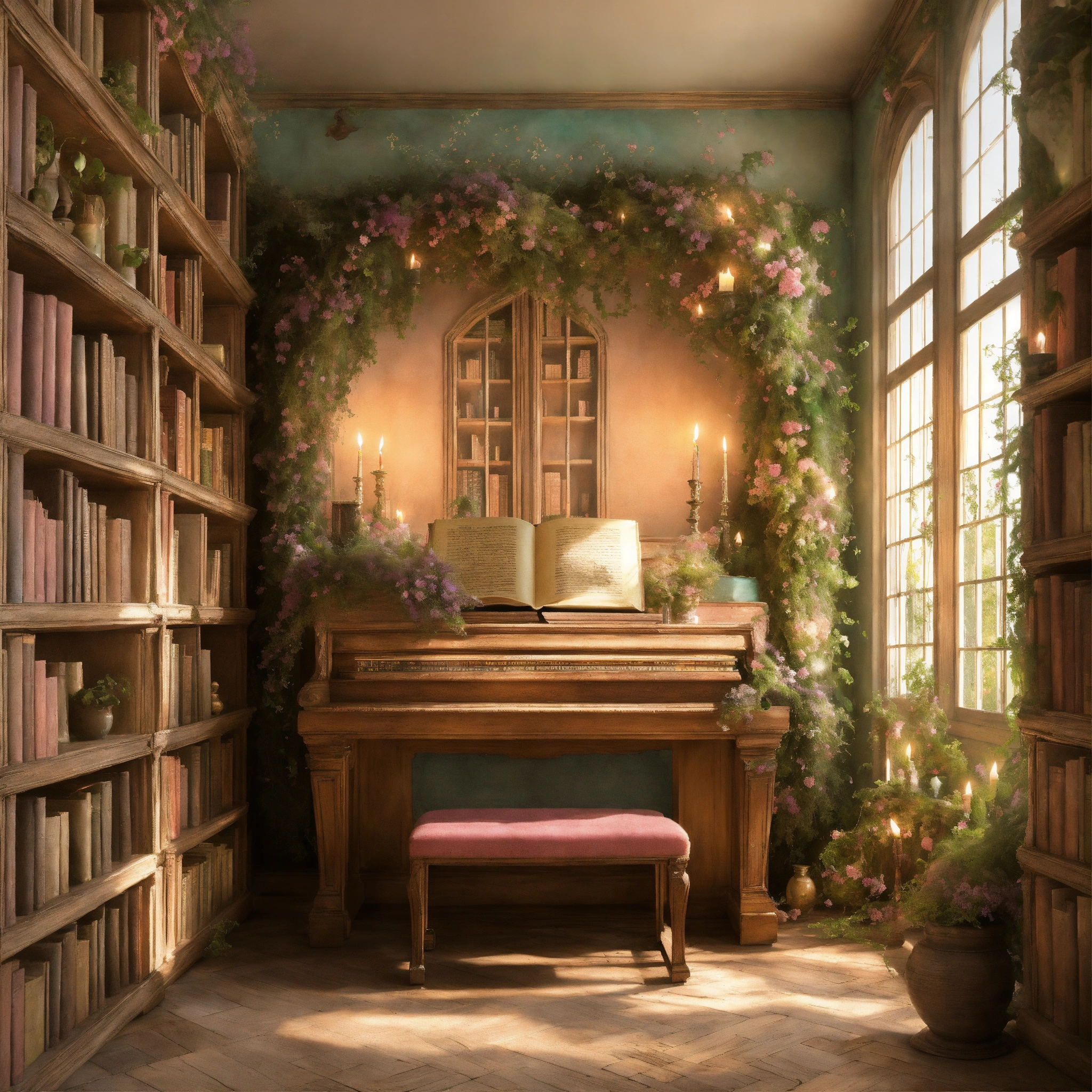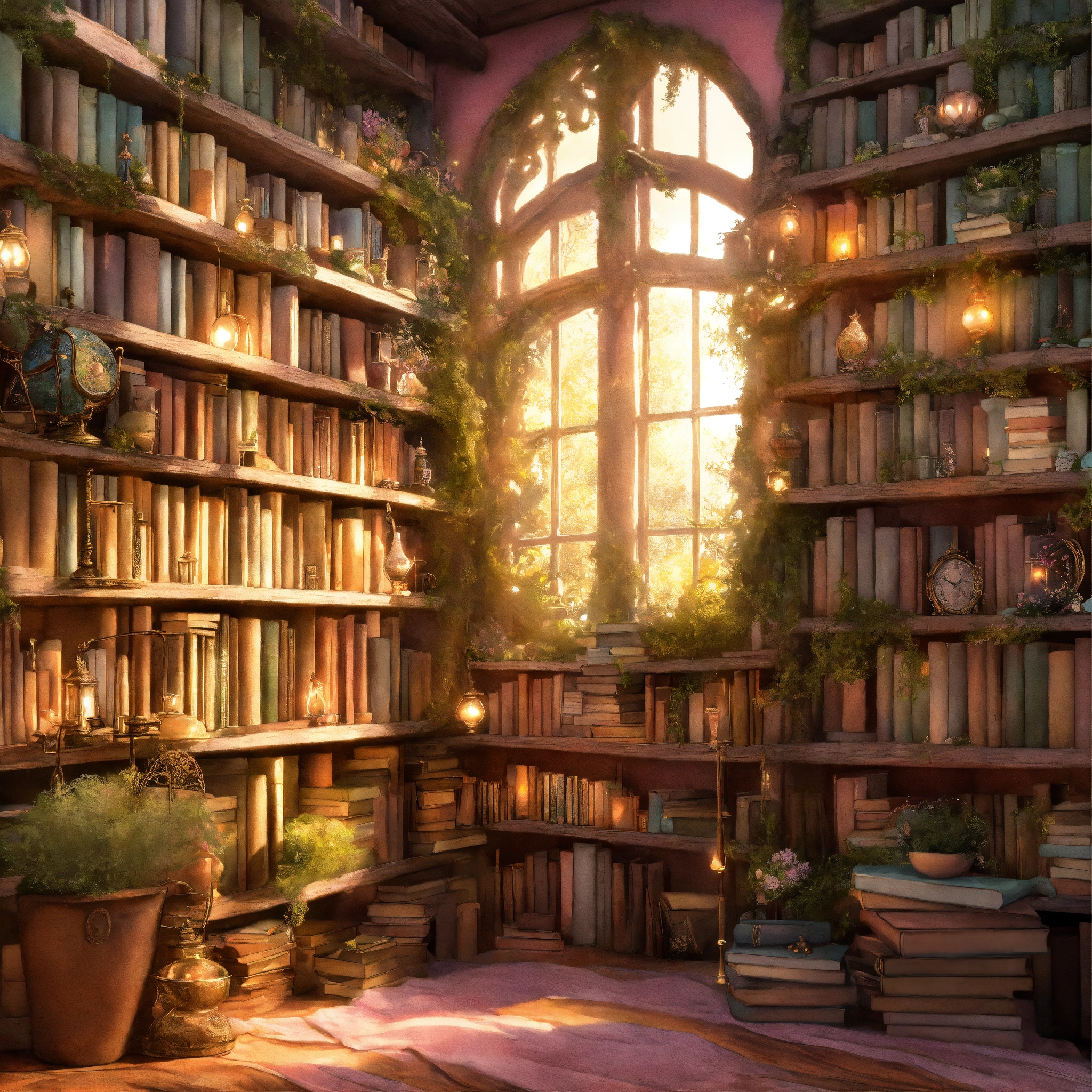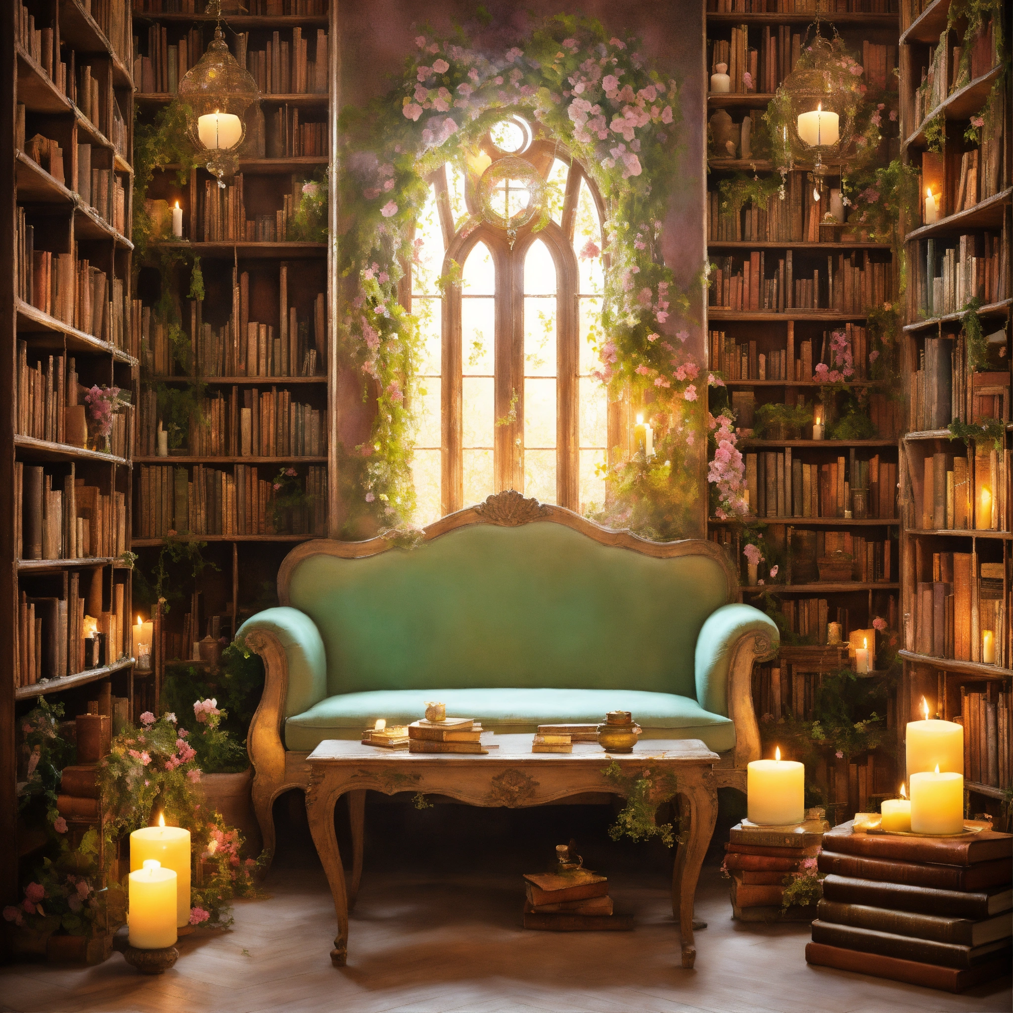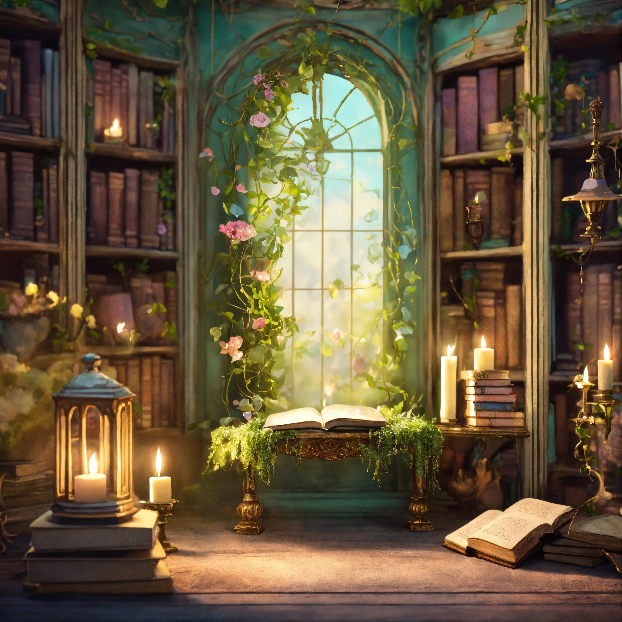 Shabby chic dreamy mist pastel junk journals the enchanted library describe a vast library that seems to extend endlessly, its shelves constructed from living vines, and filled with ancient, whispering books. floating candles and talking paintings adorn the walls. swirling magical fairytale abstract art style