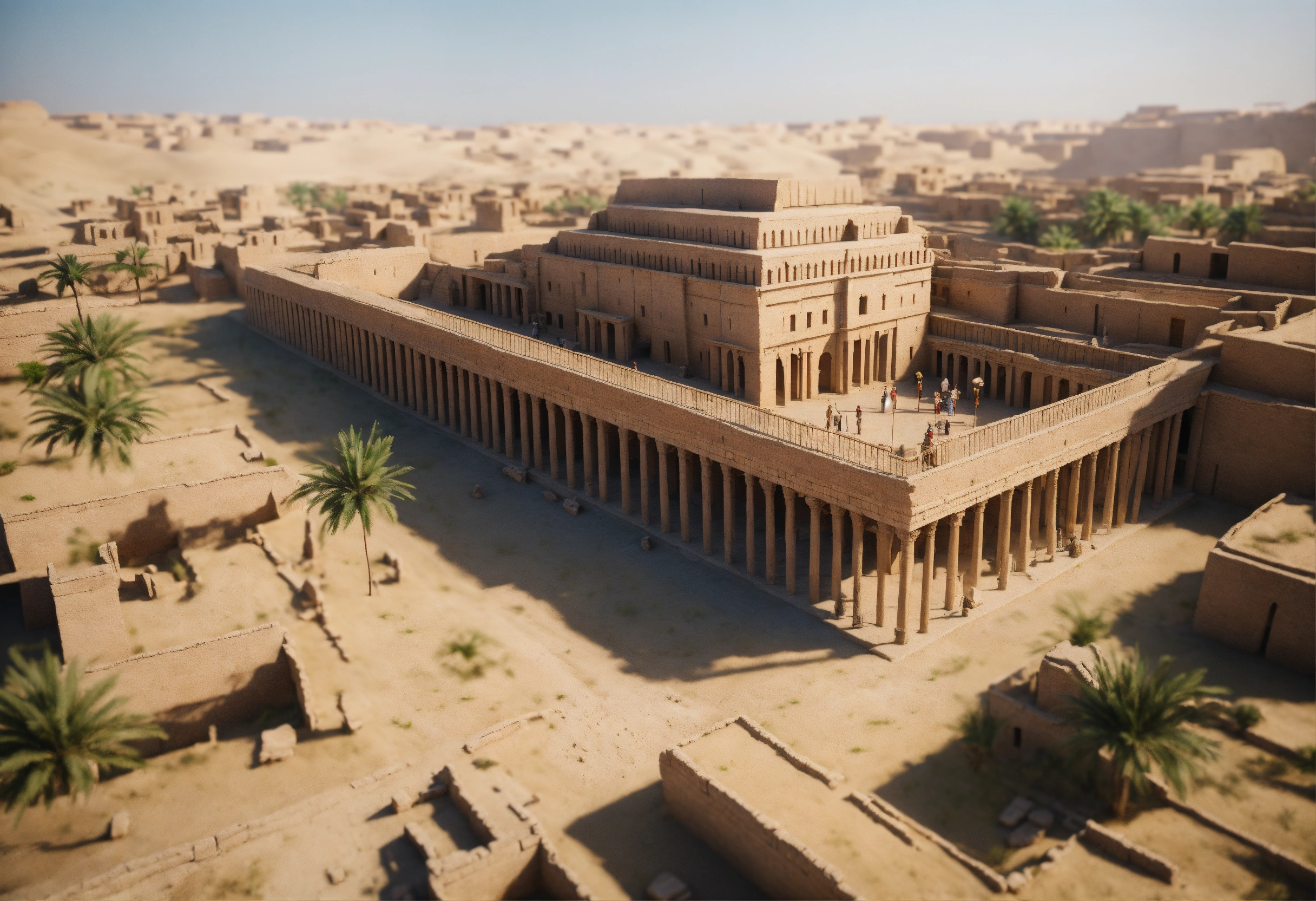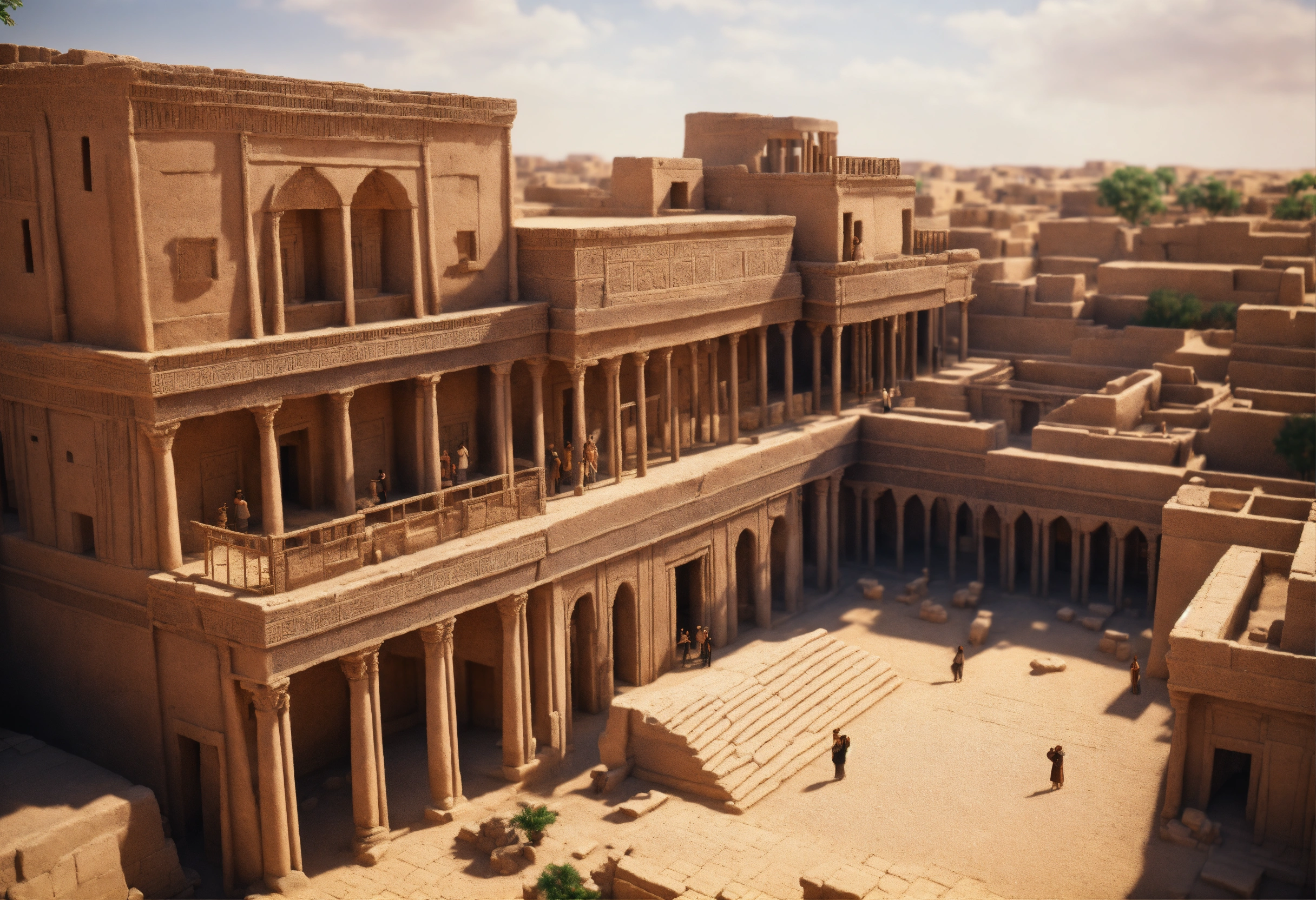 Ancient city mesopotamia. ancient buildings, 811-806 bc, ancient mesopotamia babylon ancient street. hyper detailed, photorealistic, 8k, angle from below.