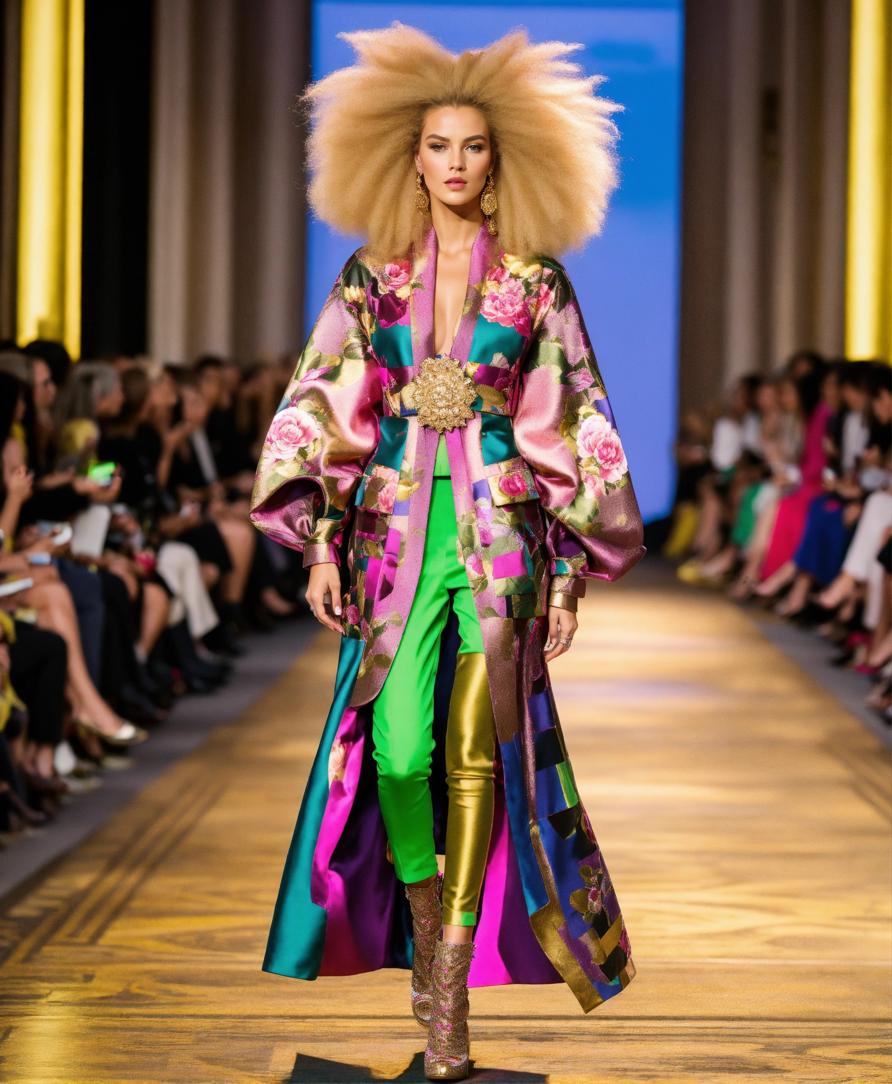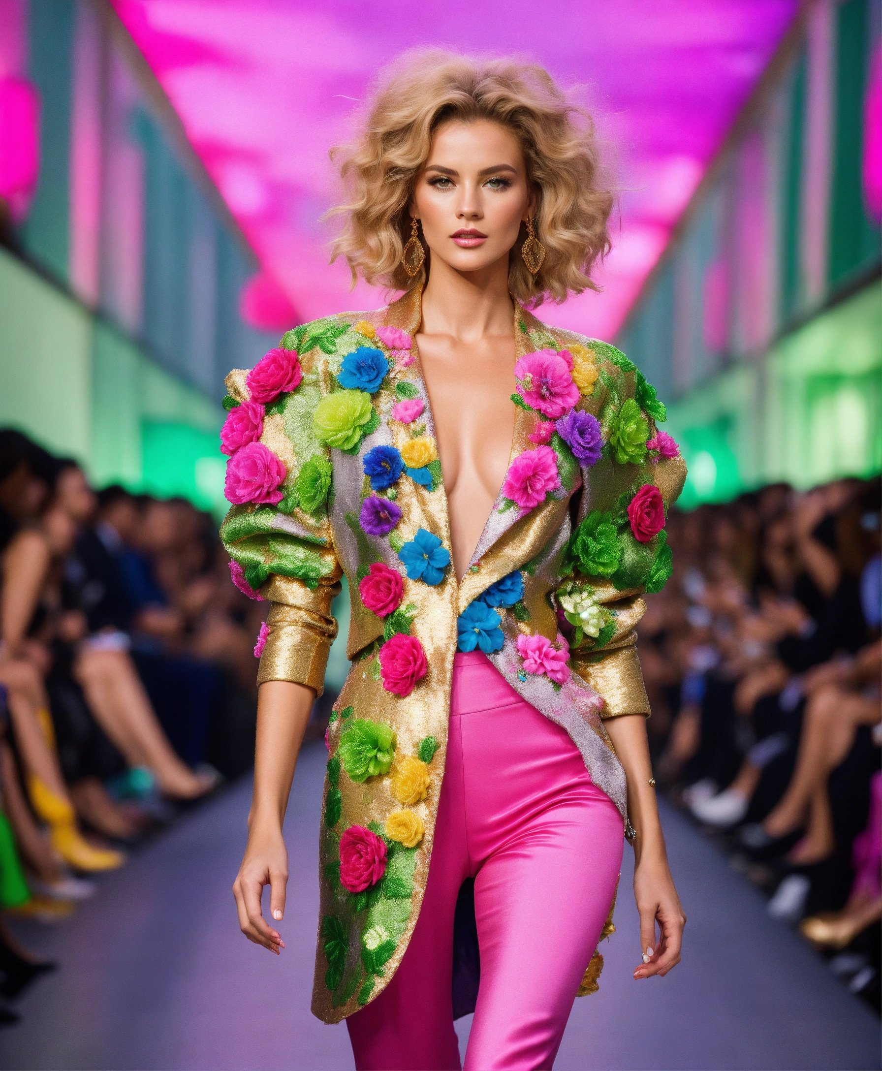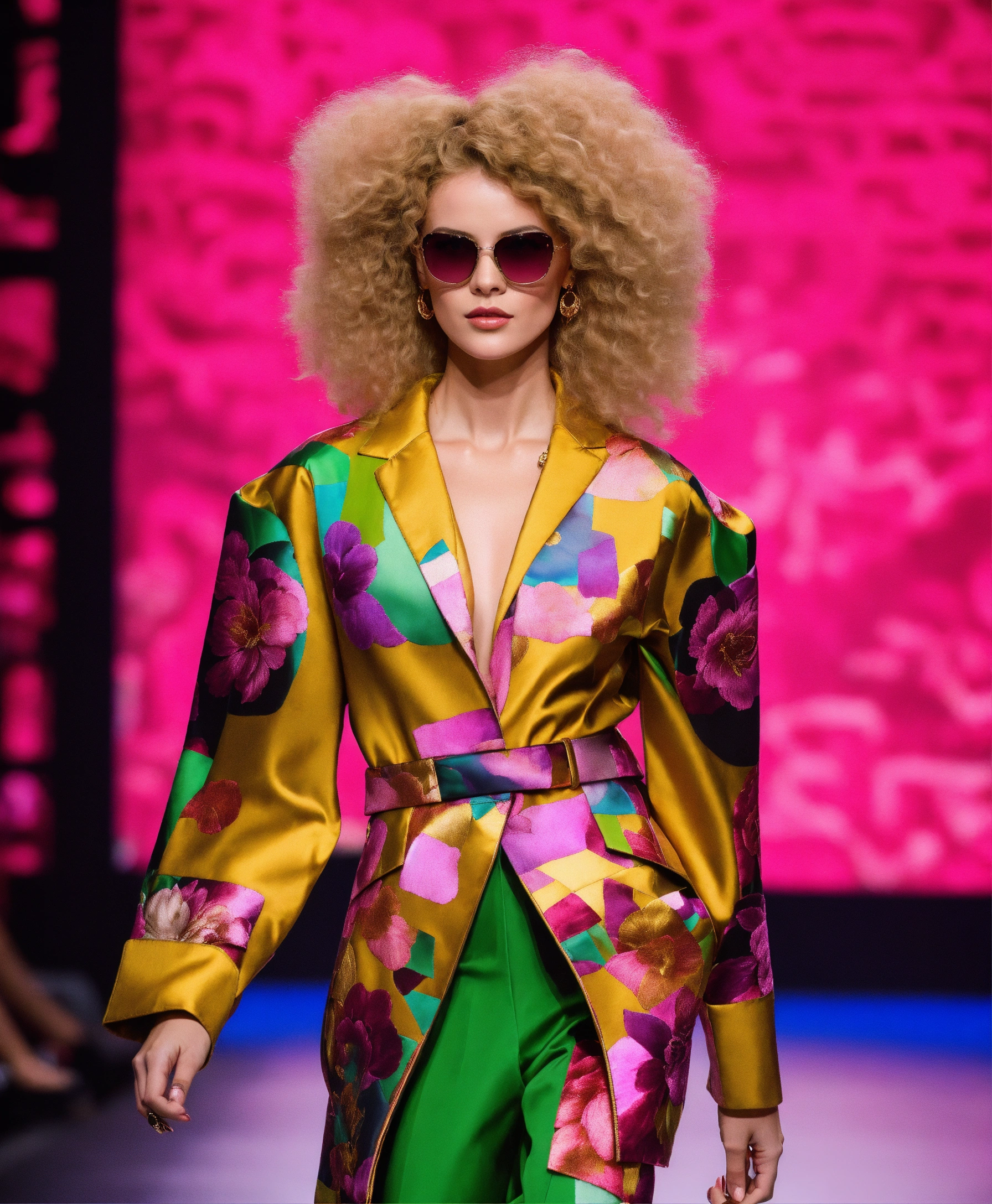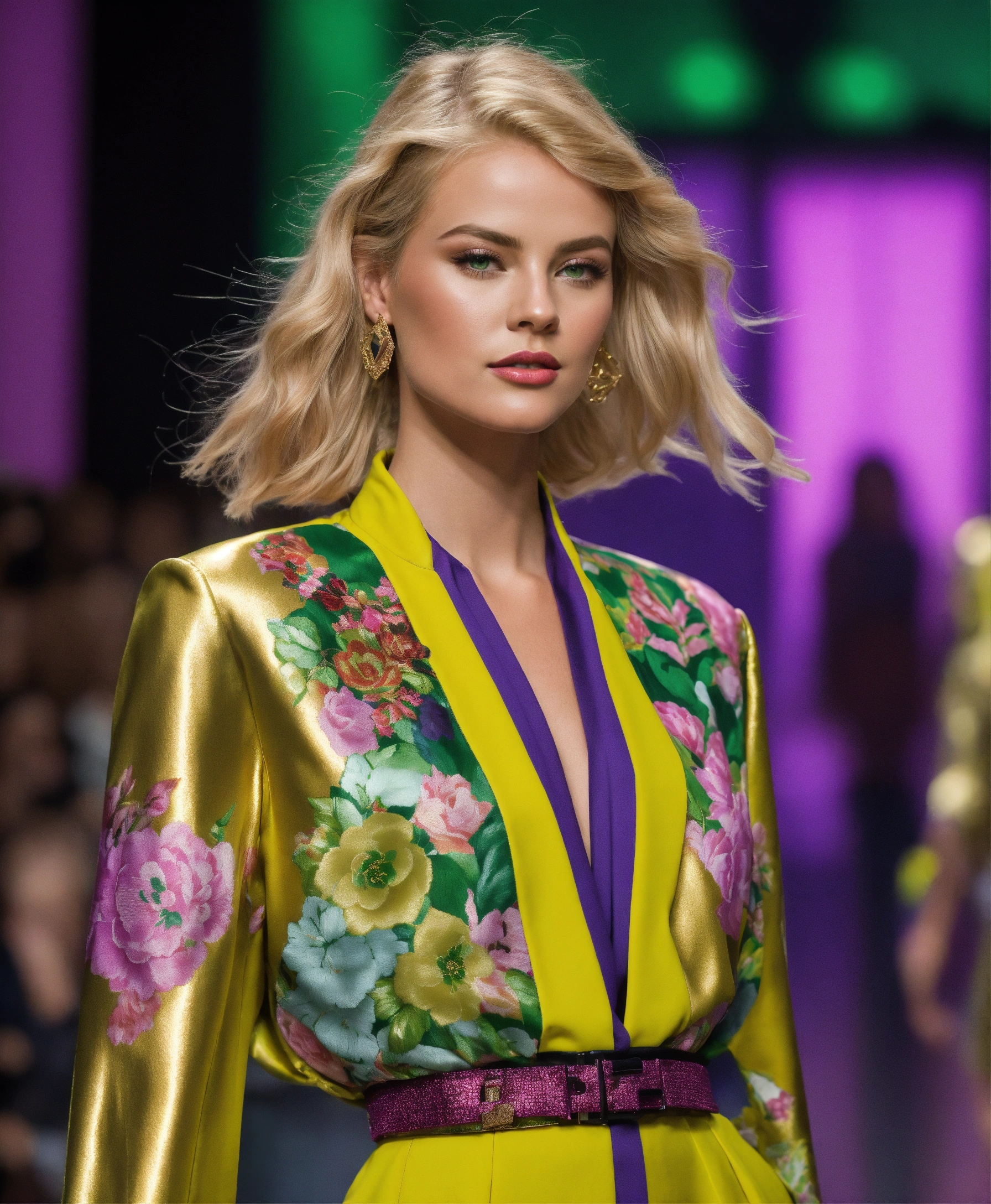 Ultra realistic full body photo of a trendy big hair blonde german model walking the runway modeling summer designer novelty interesting complex unusual street sporty classy modern dolman sleeve outfit brave, paris versailles details cutouts and and gold geometric pattern floral structured tailored jacket pink gold green lilac peridot silver magenta lime fuchsia yellow blue black gray copper mauve bronze haute couture ultimate elegance beautiful luxurious awesome wealthy resplendent magnificent sublime 12k