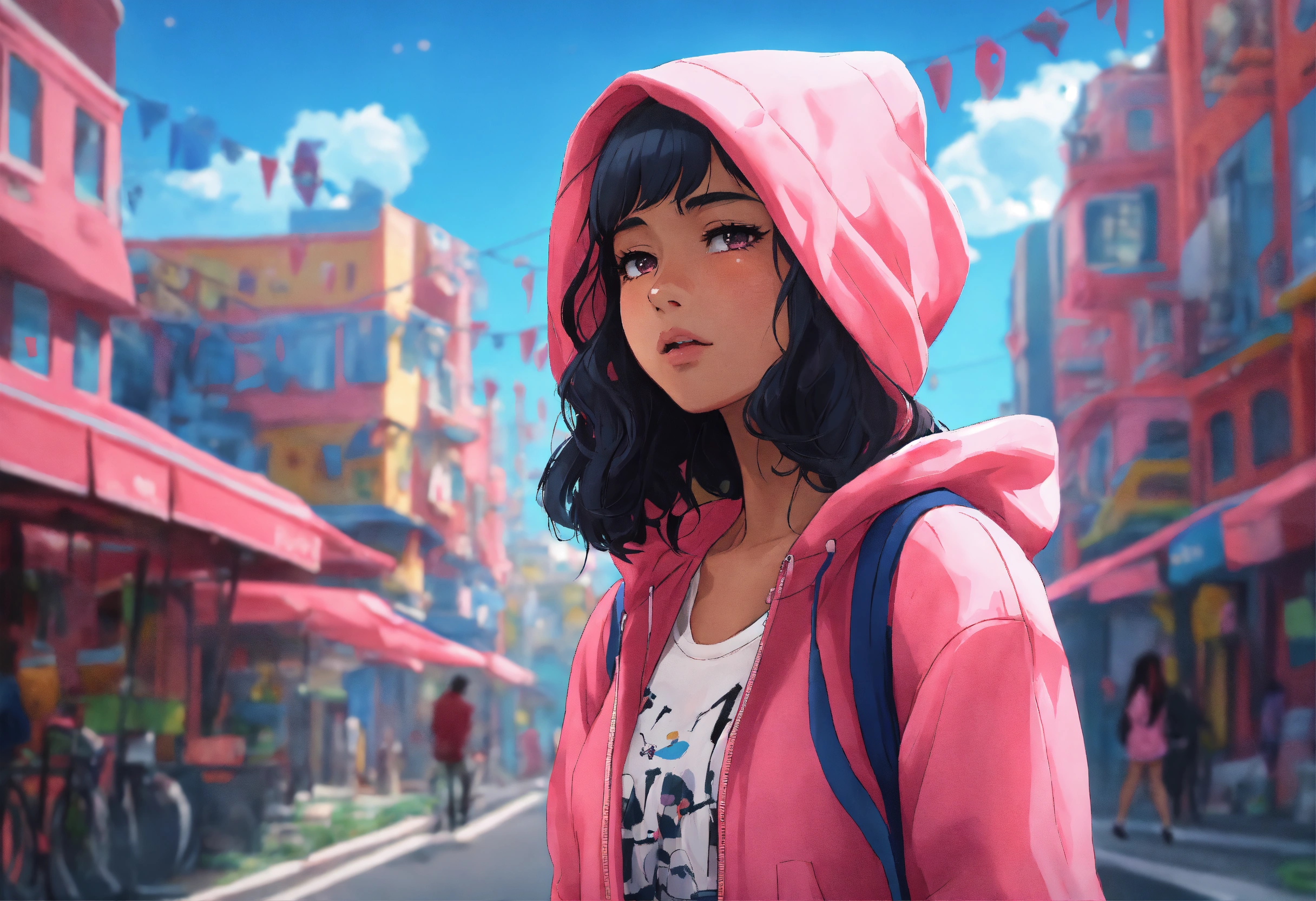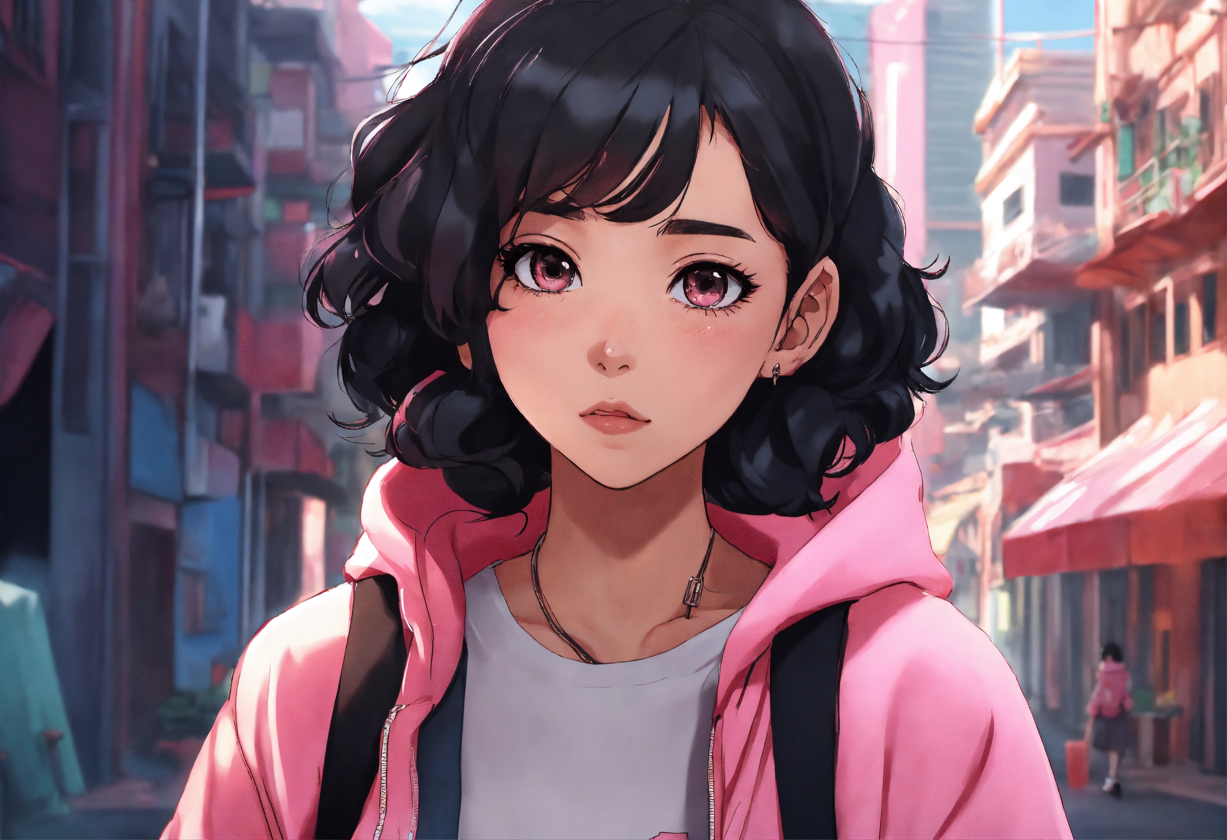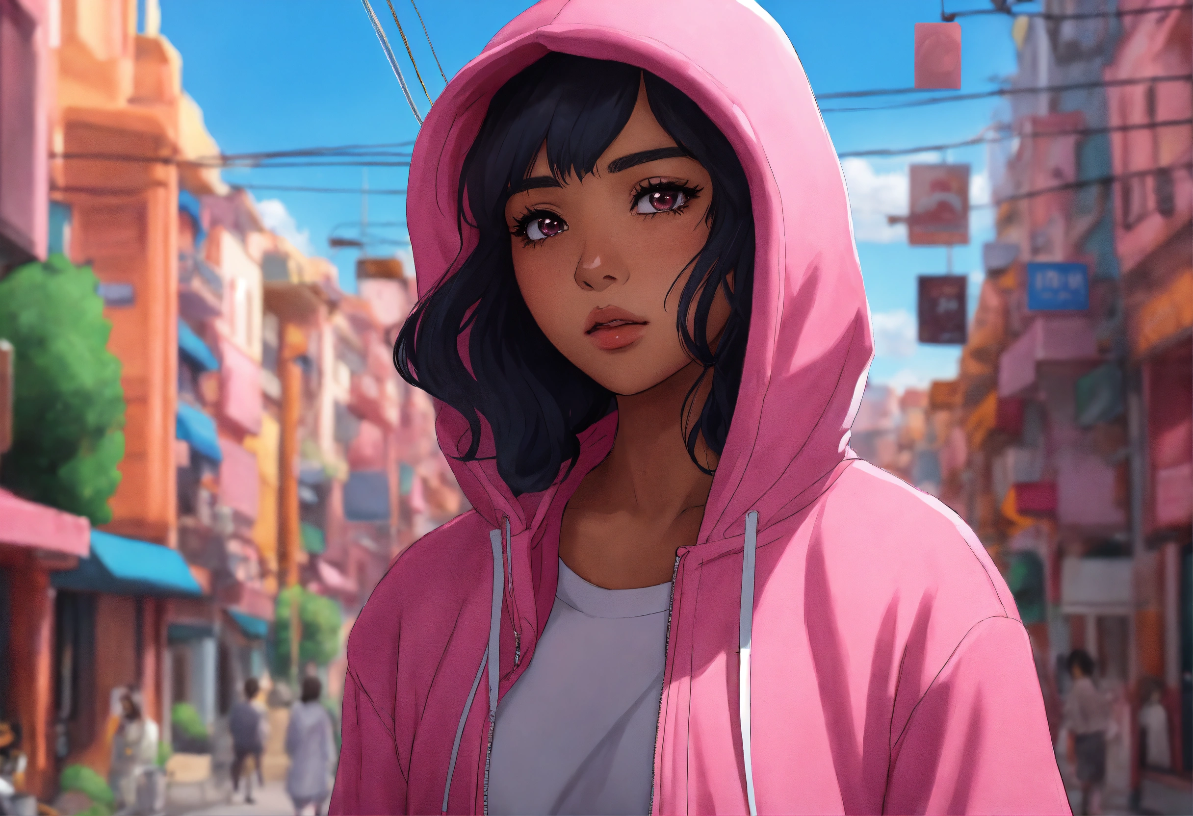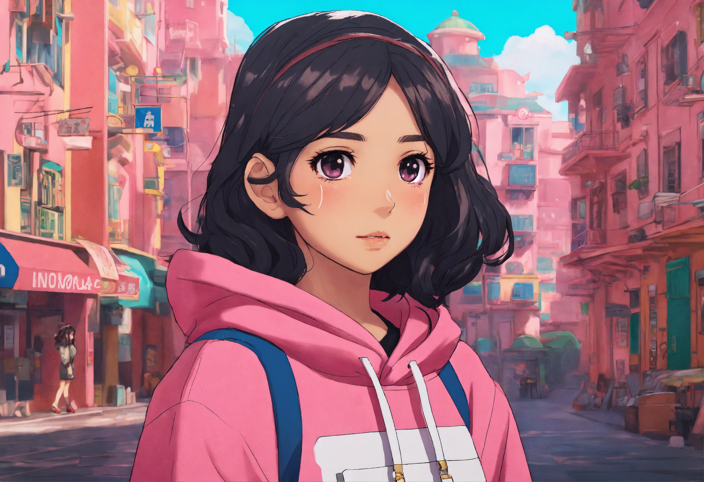 Anime; cartoon; ultra realistic; pink city, young girl mixed race, named laura rijo, wearing pink hoodie, wavy black hair; in a anime city, ultra realistic, toca boca life world perfect, no imperfection, 4k, sad, chocked