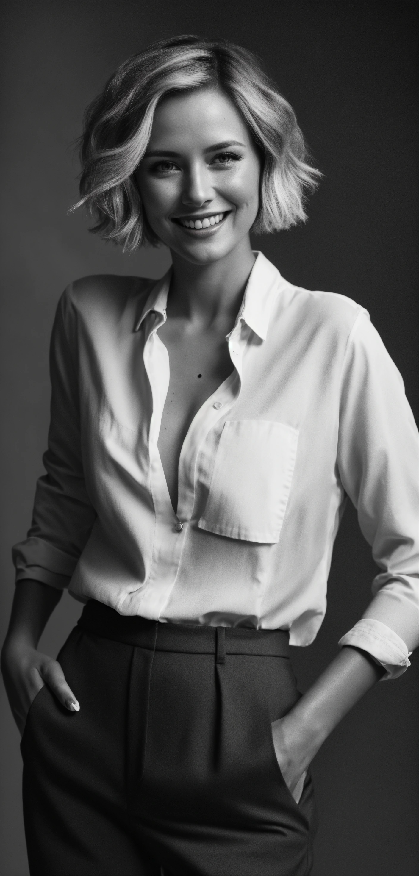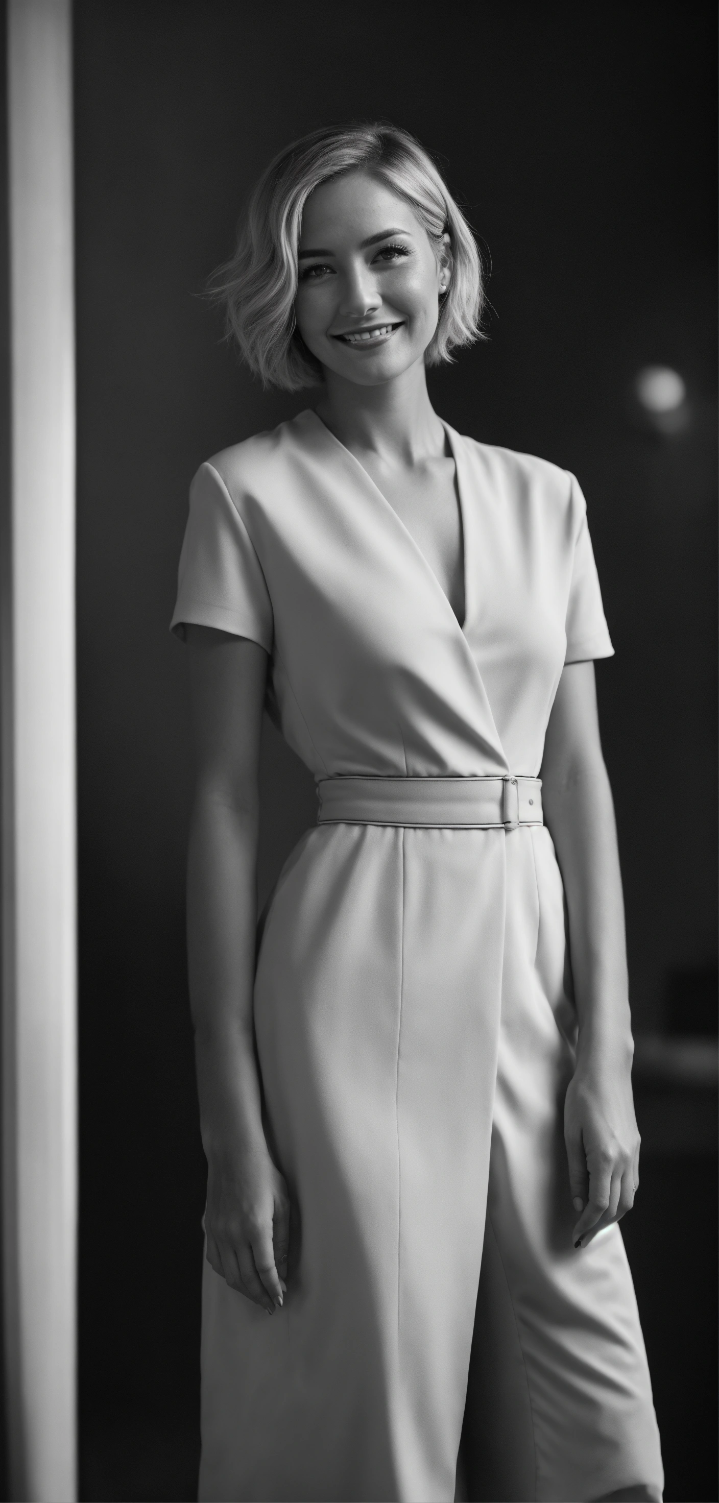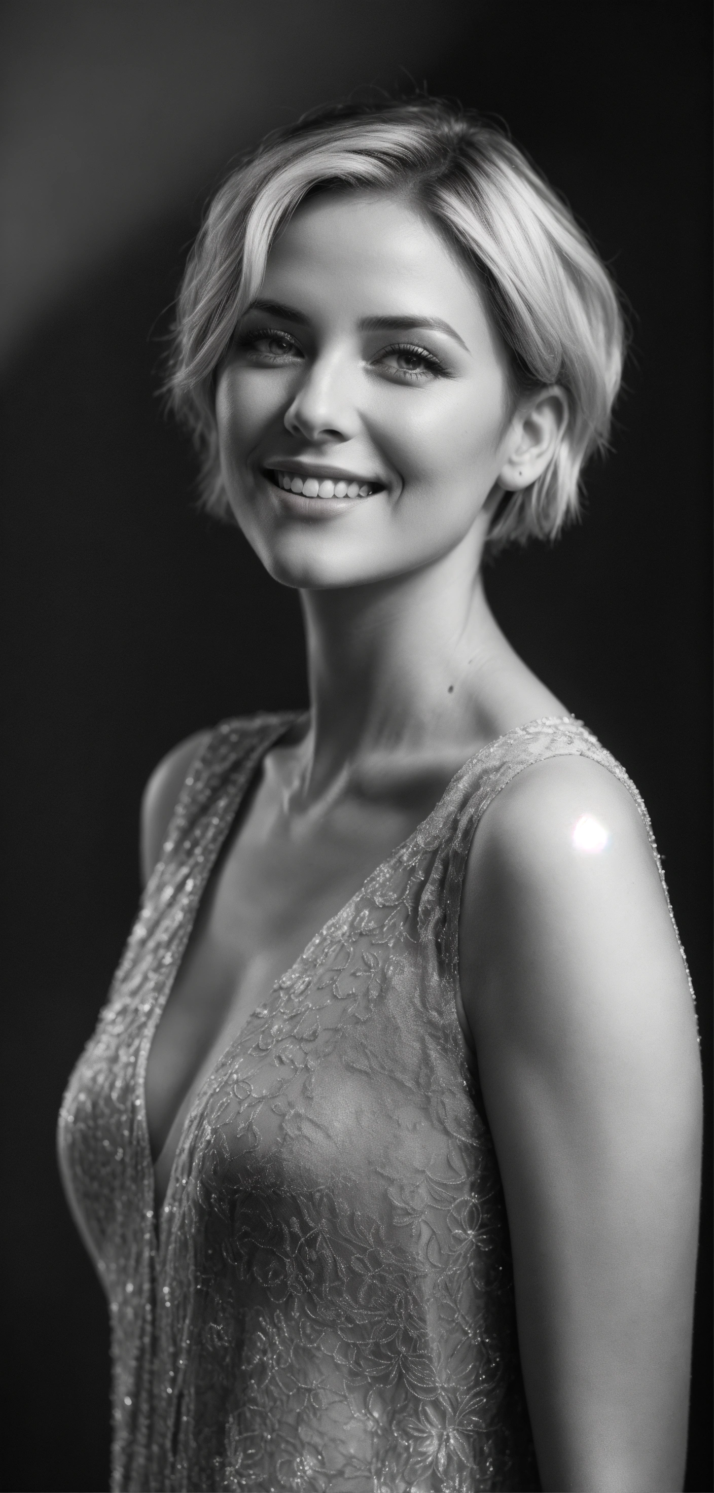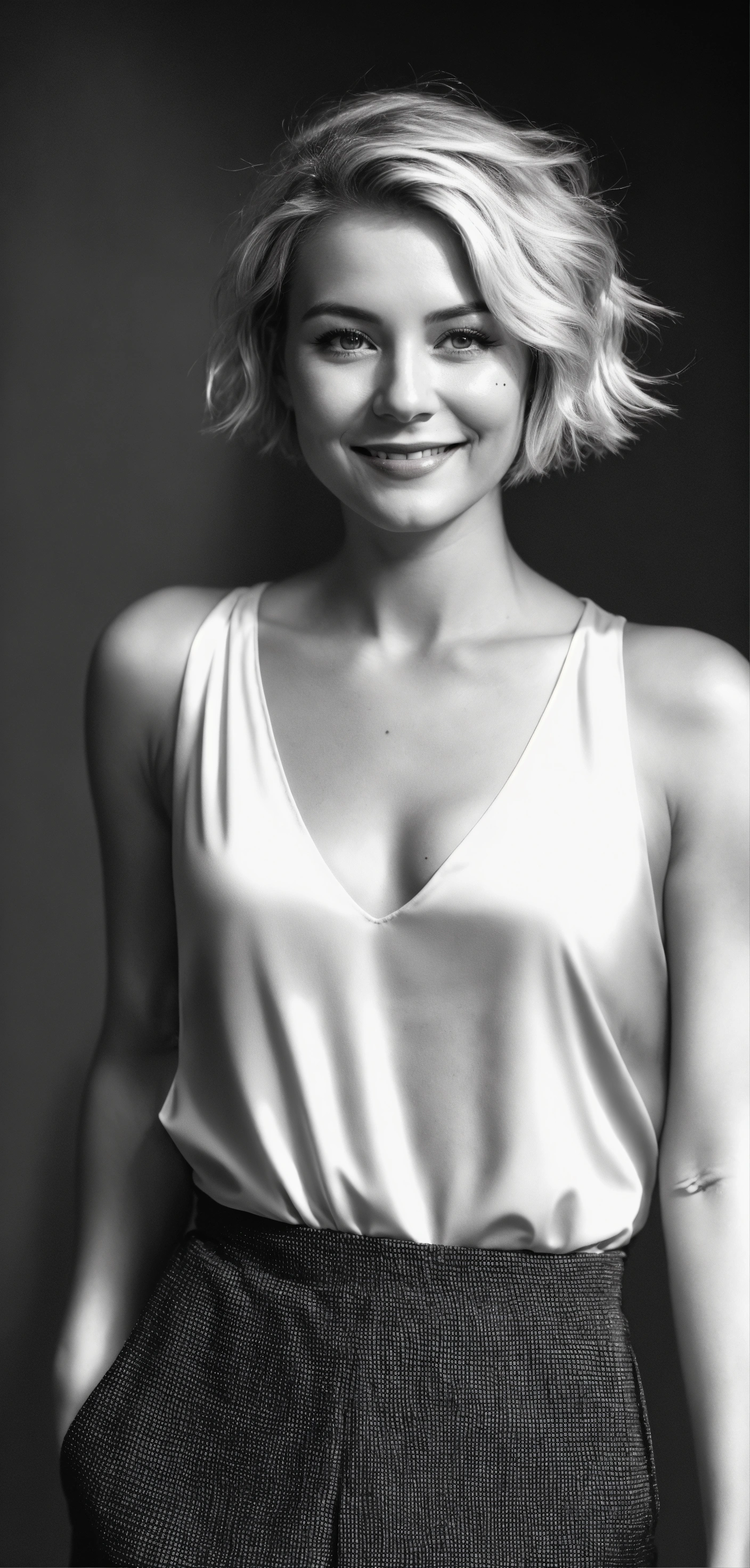 Photo with knowing smile of an actress standing full length, 35 year old woman, blonde, with short hair, with natural skin detail and small mole, black and white studio photo, light eyes, cinematic atmosphere, light style harcourt studio, ultra-detailed, 4k quality