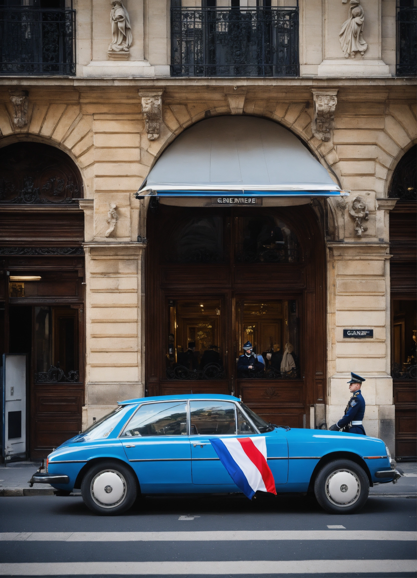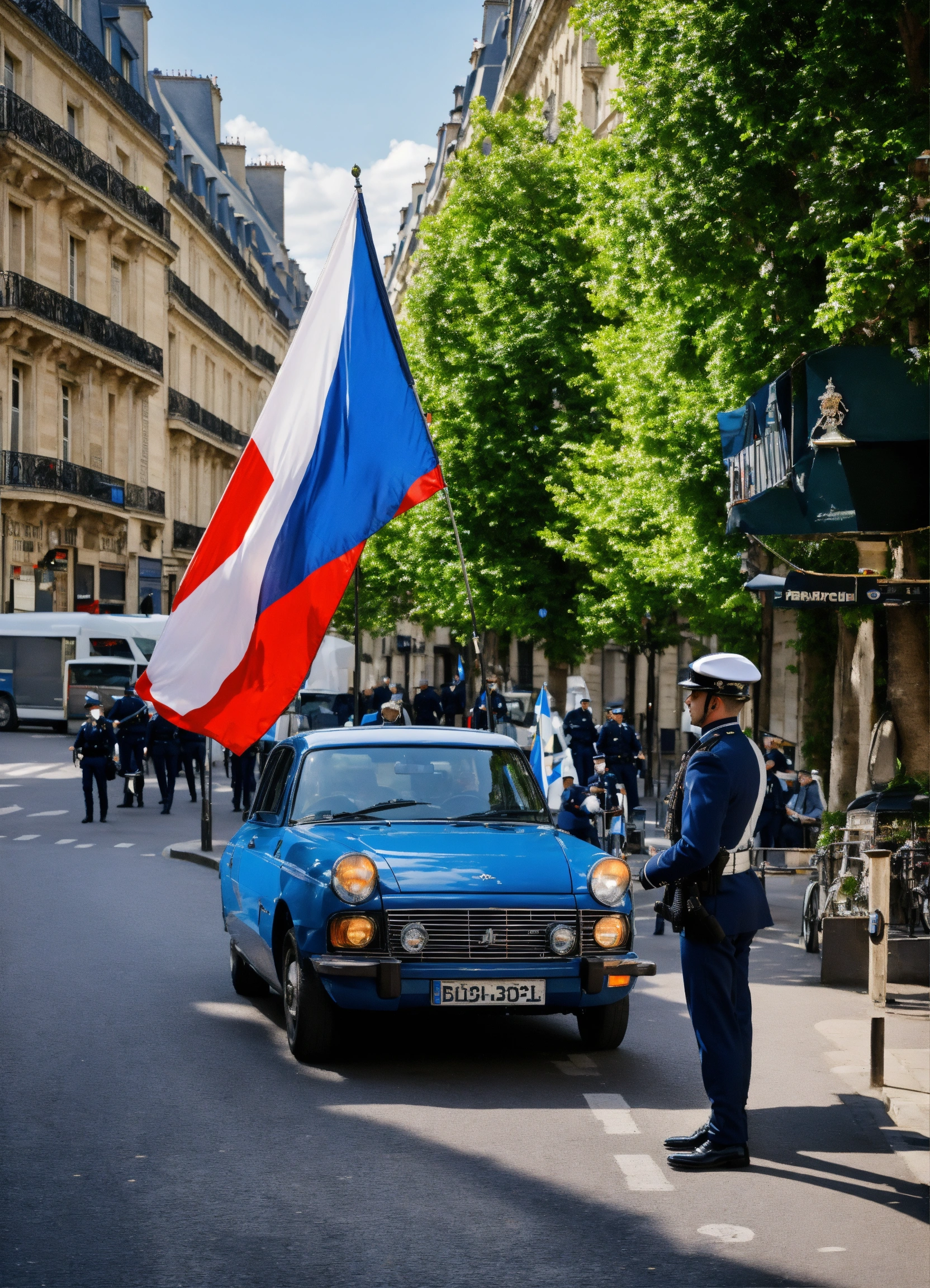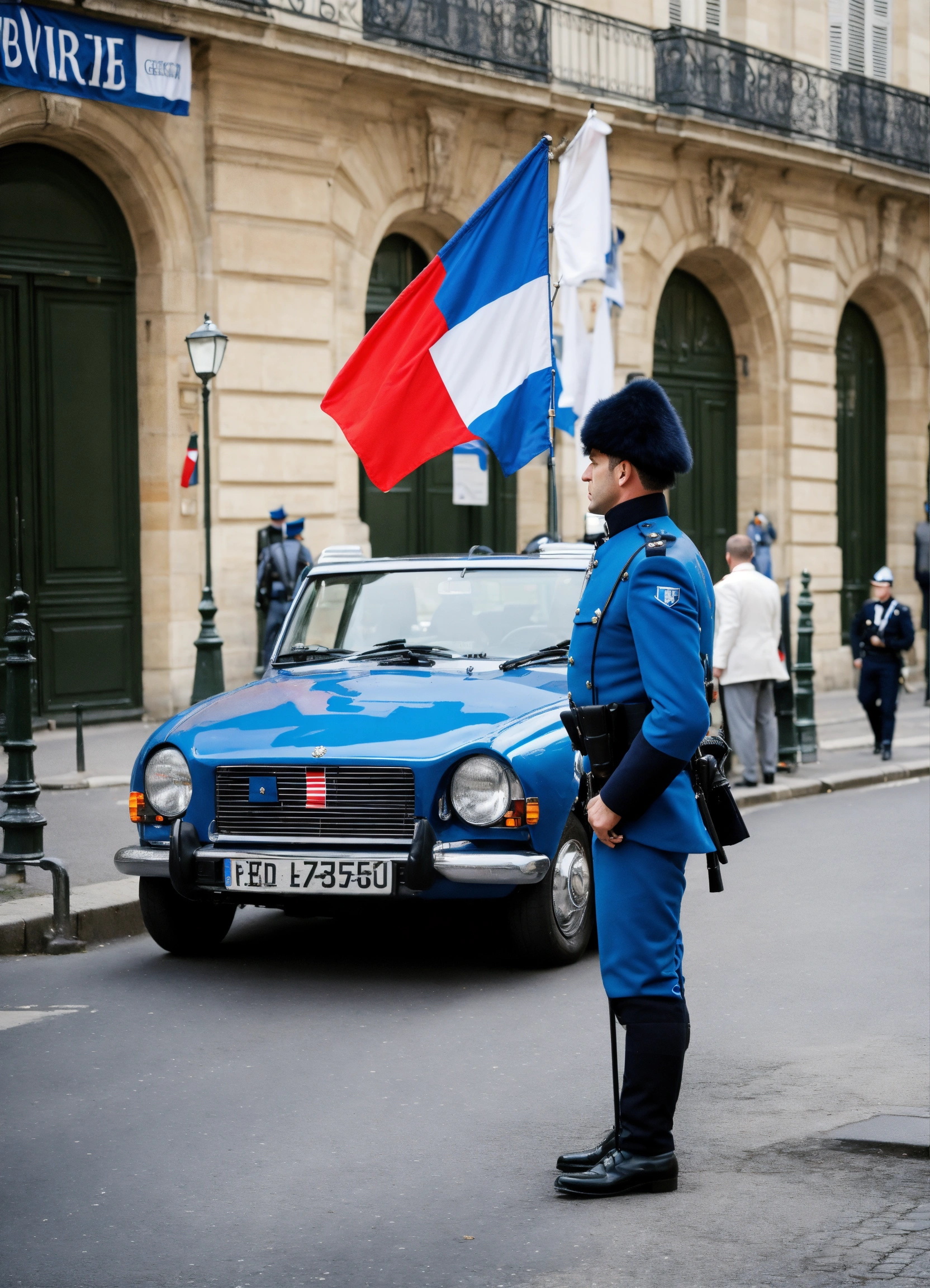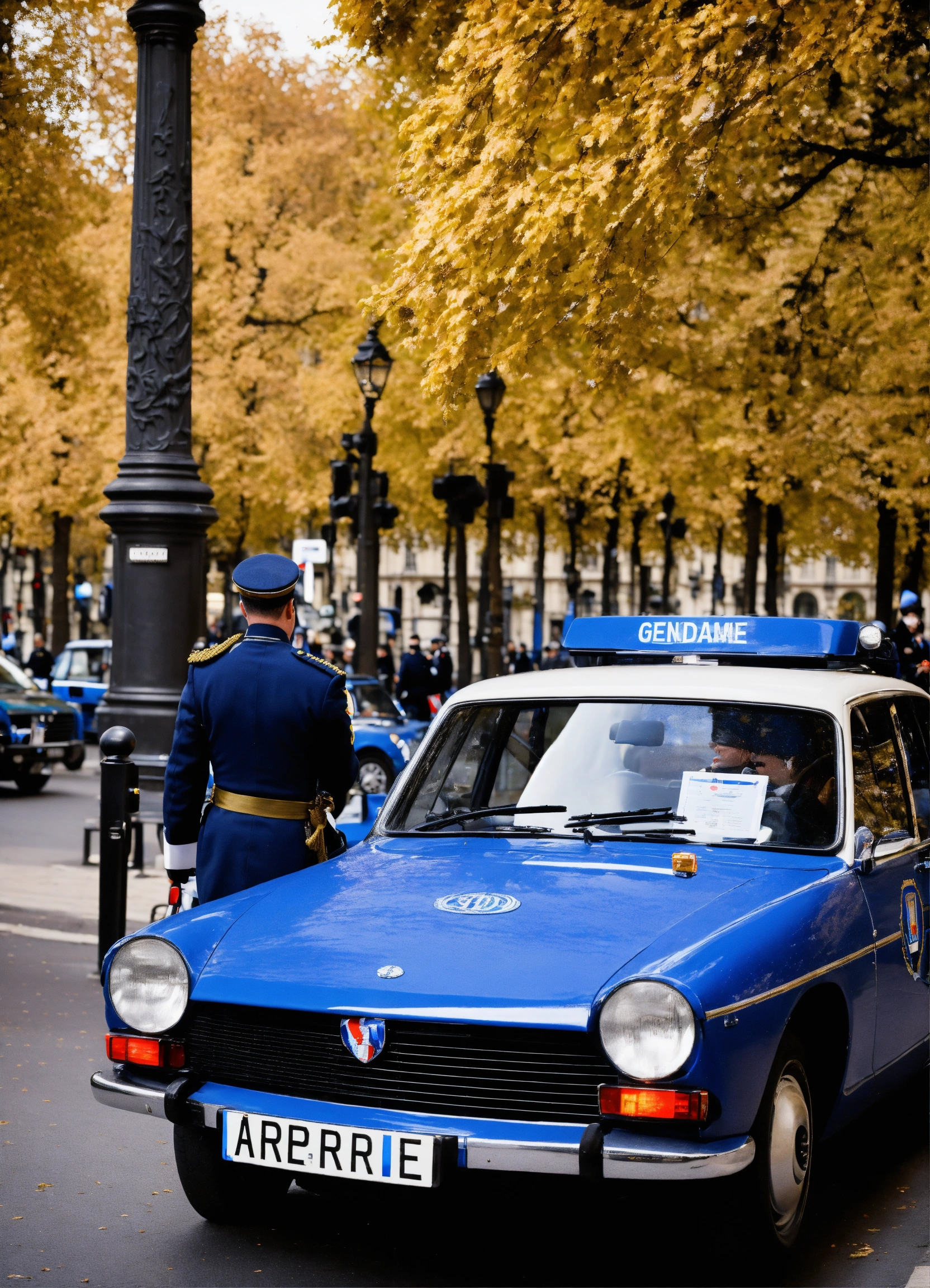 French gendarme doing his job in paris with the gendarme car behind and a french flag