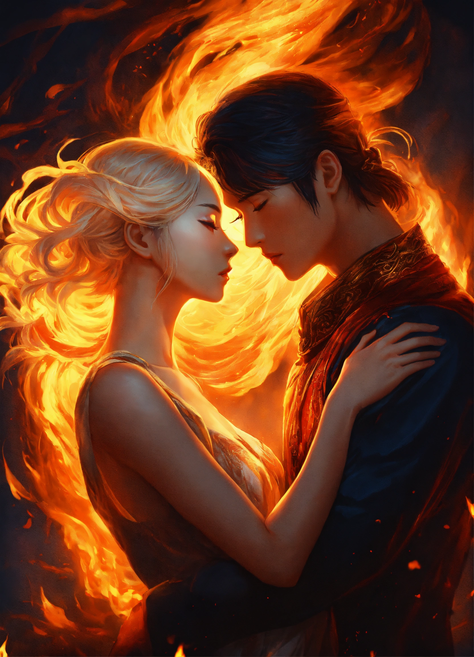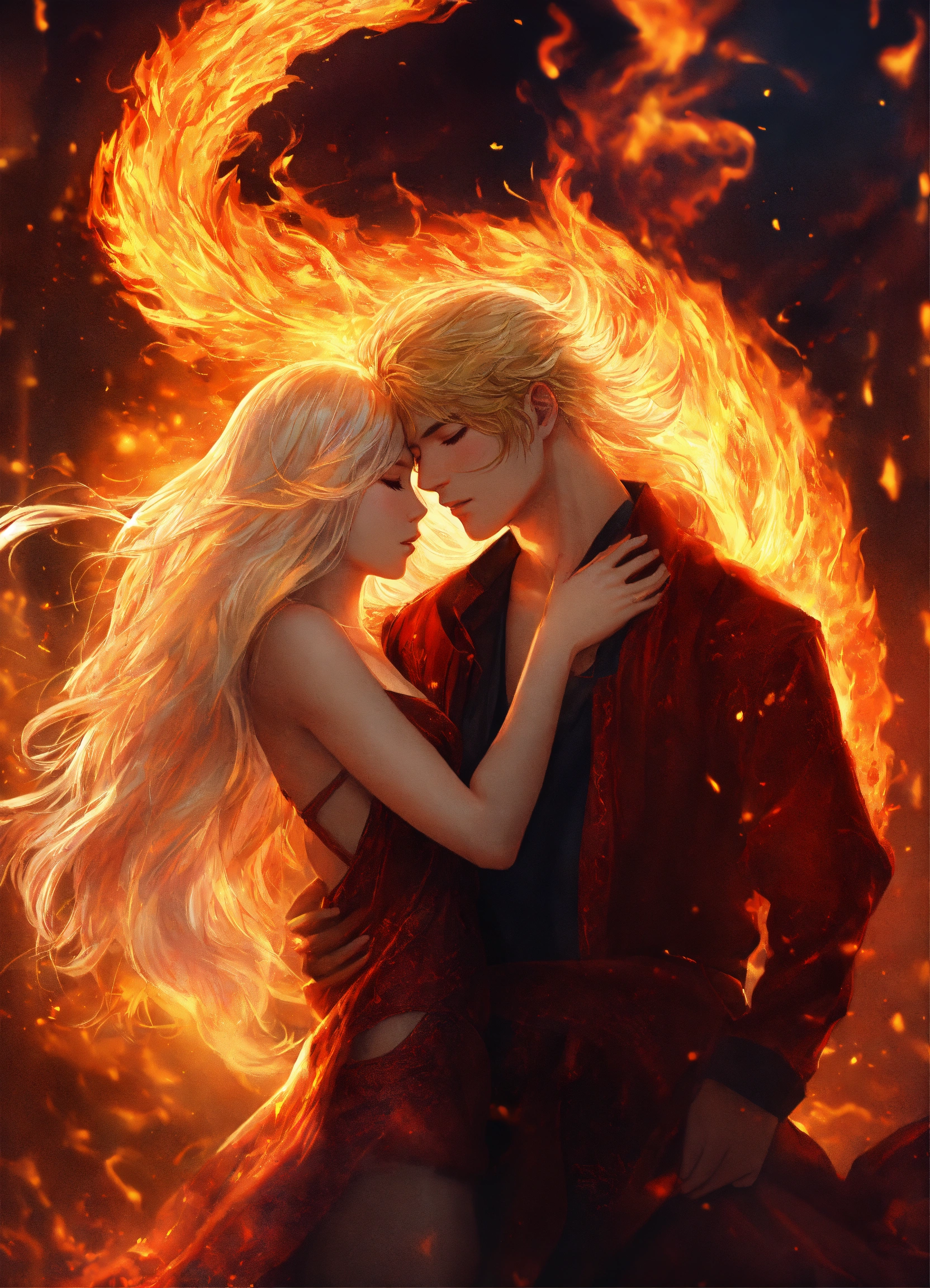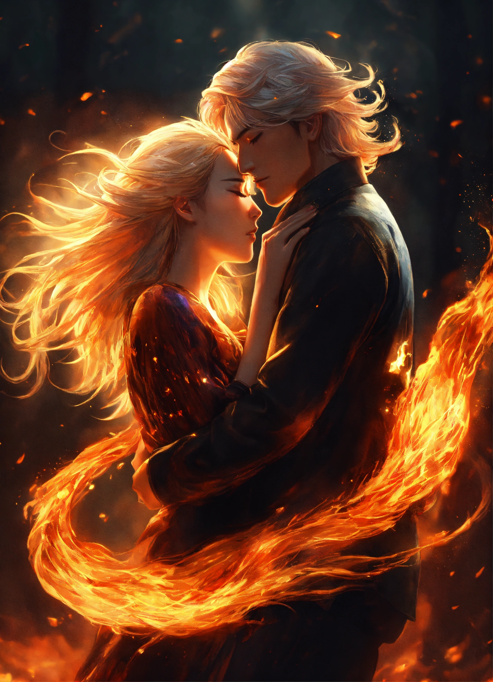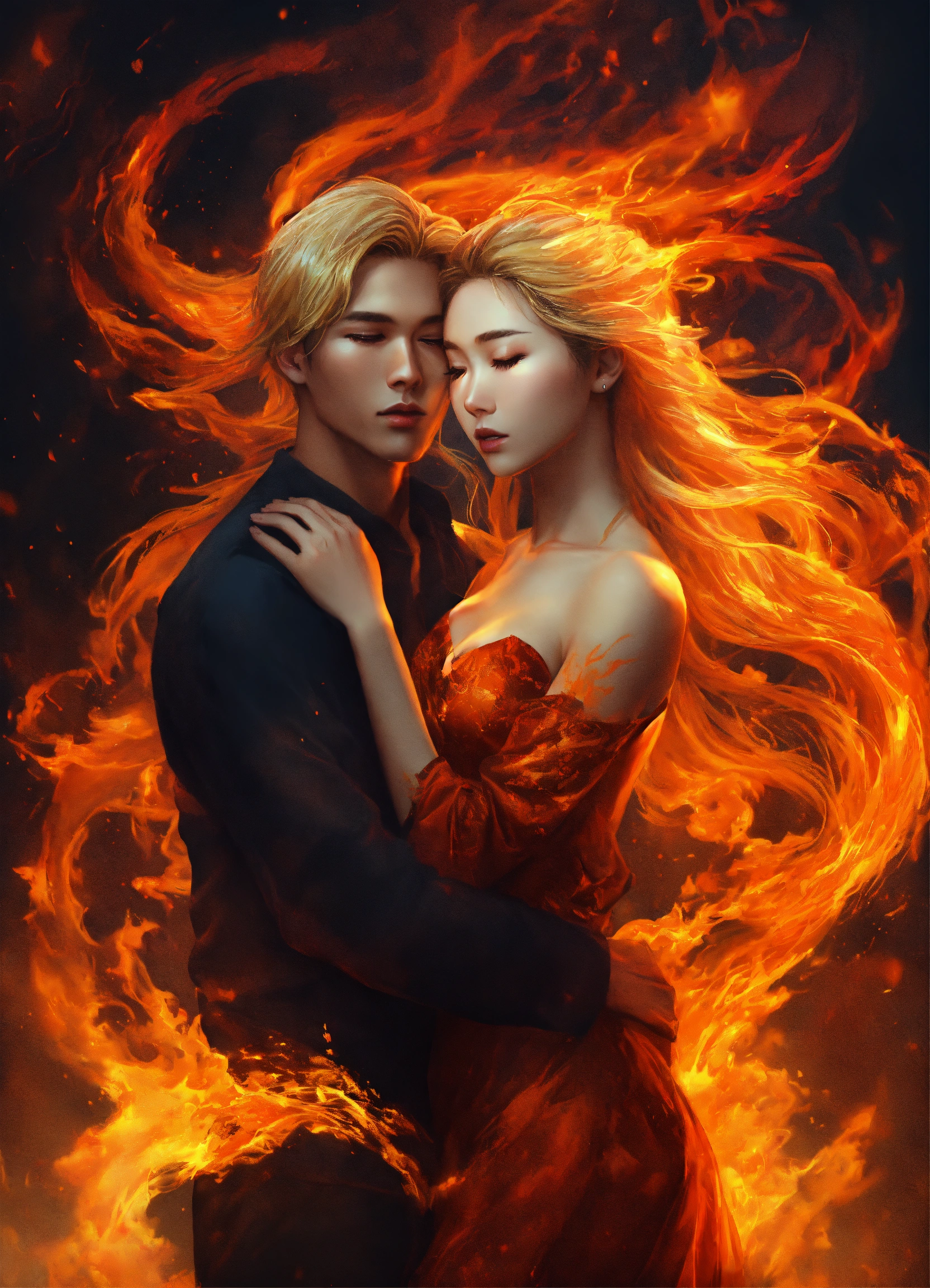 A korean blonde woman made out of fire and she has hair made of flames embracing a man, dark, magical, fantasy, digital art.