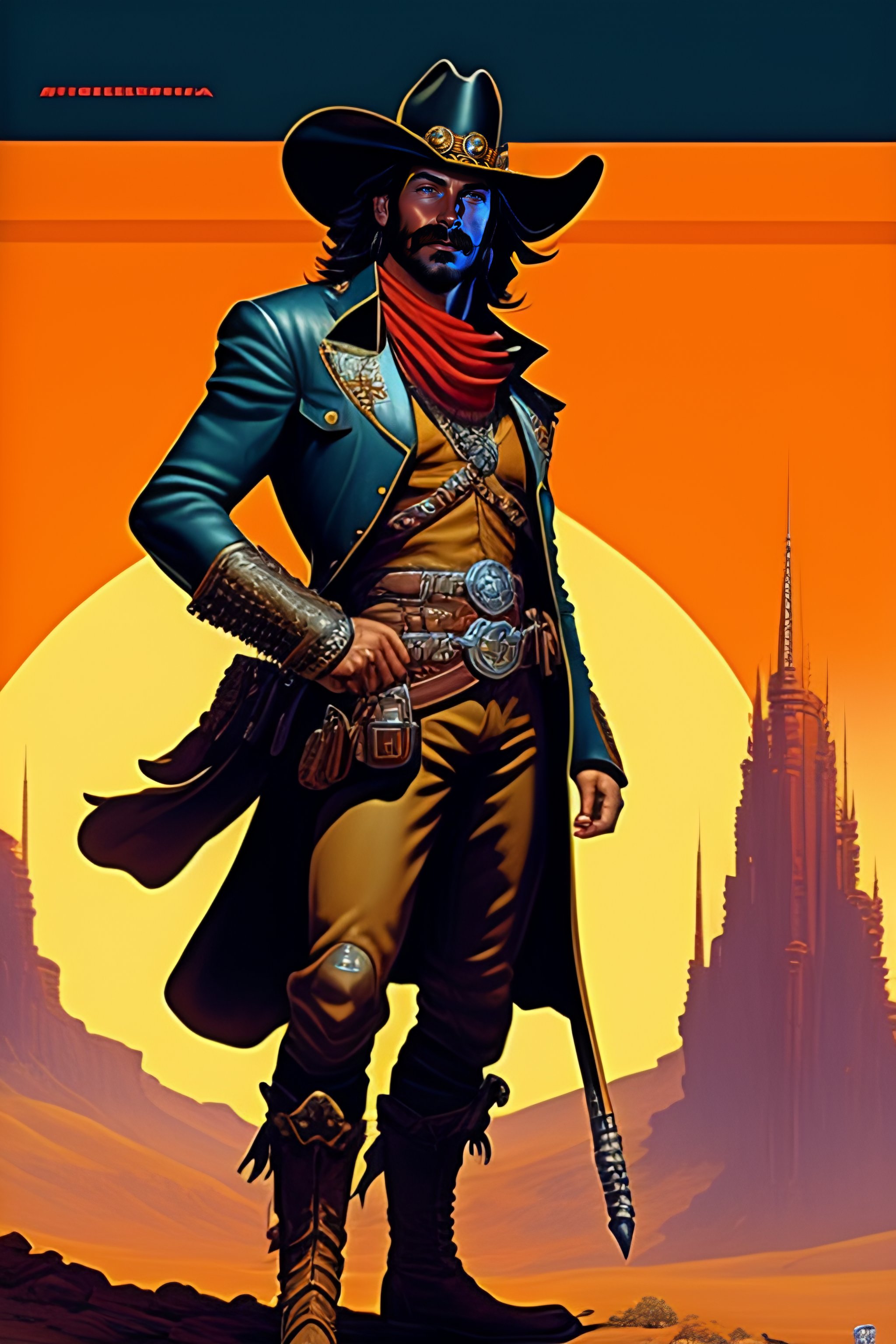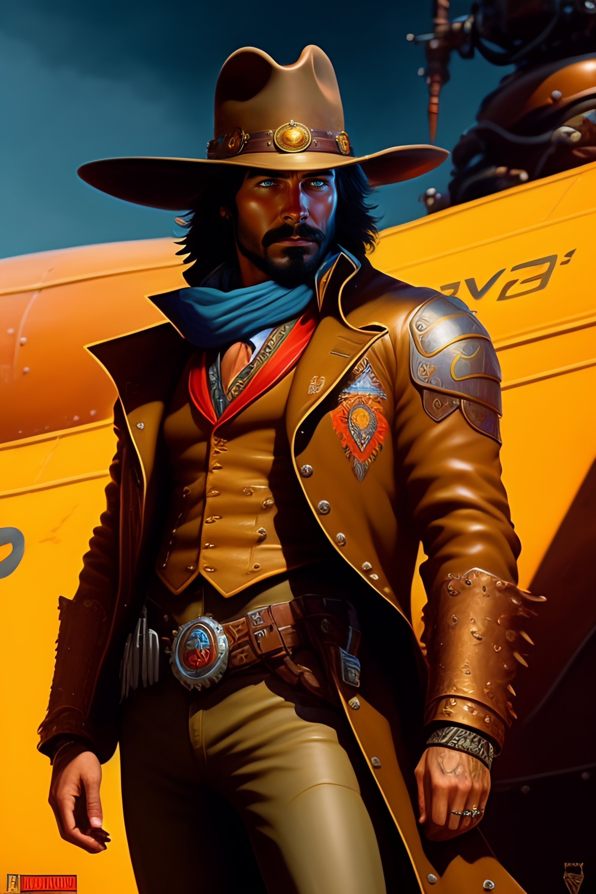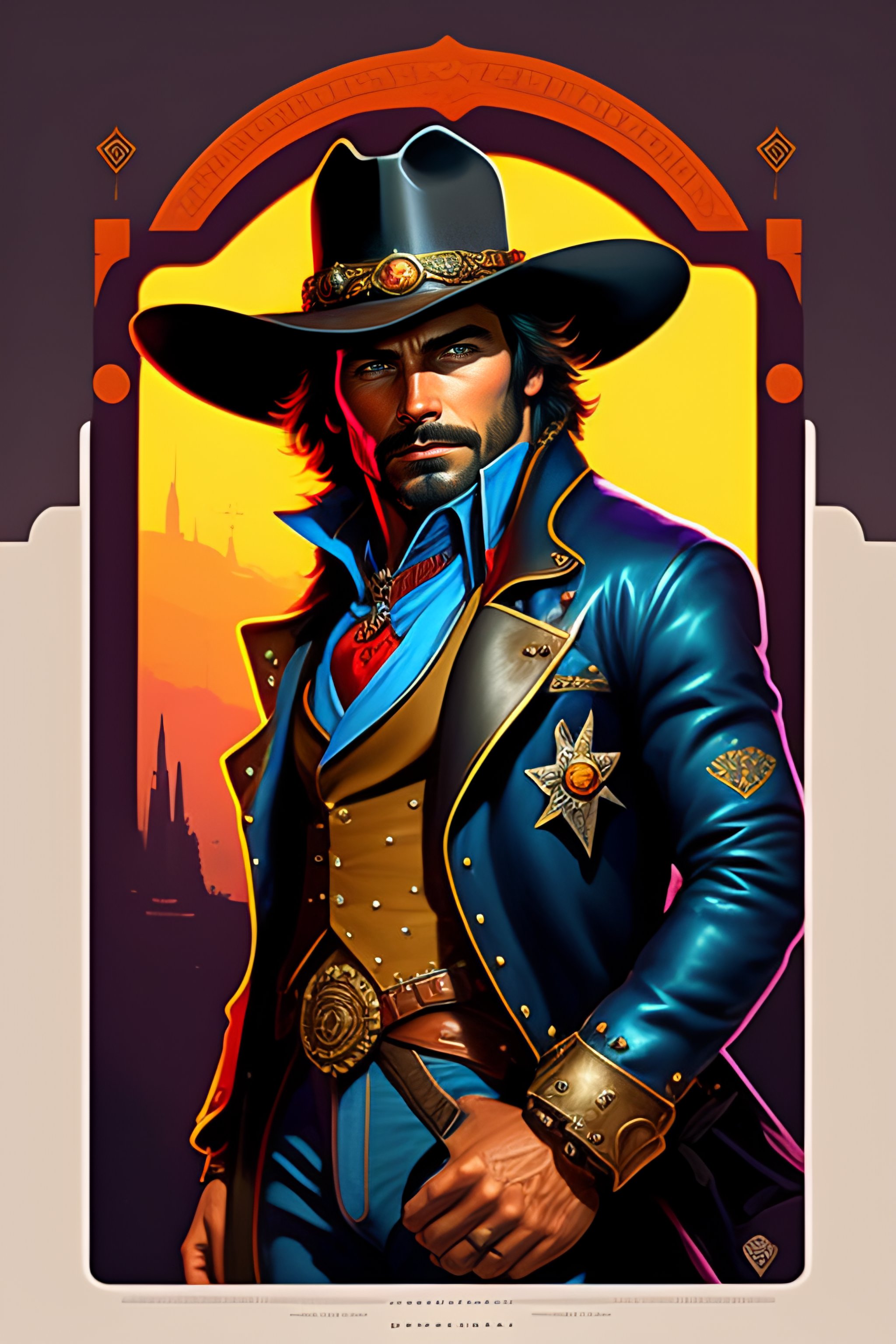 Mccree from overwatch with his gambler skin equiped, medieval cowboy, character portrait, mechanical arm showing, portrait, close up, concept art, intricate details, highly detailed, vintage sci - fi poster, retro future, vintage sci - fi art, in the style of chris foss, rodger dean, moebius, michael whelan, and gustave dore