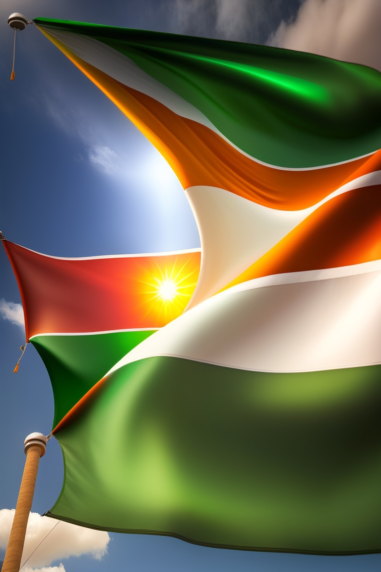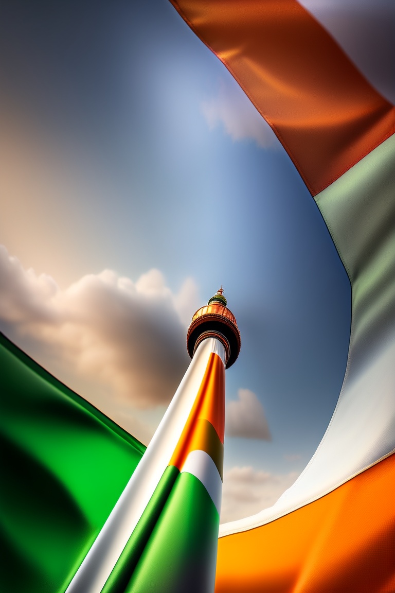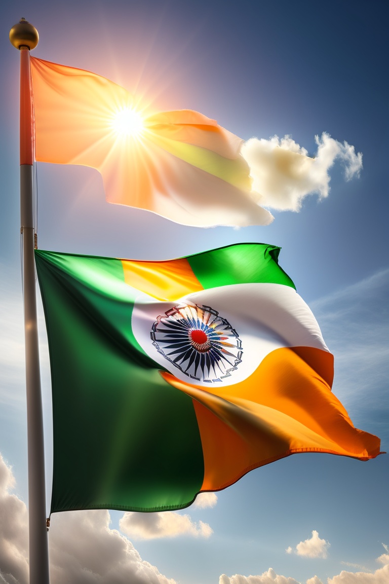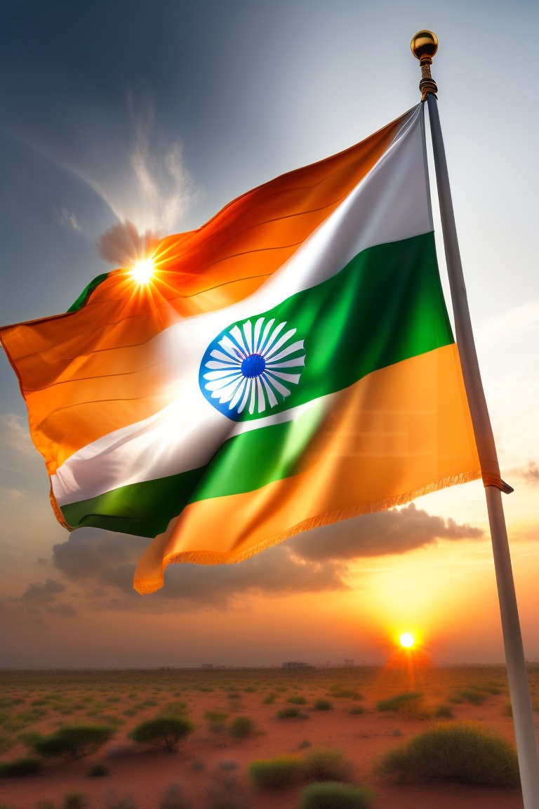 Waving tricolor indian flag, having colors saffron, white with a radial chakra in the middle and green, hoisted in the air, early morning sky, sun rising in the background, strong windy weather, heavy clouds, birds flying, wide angled shot realistic