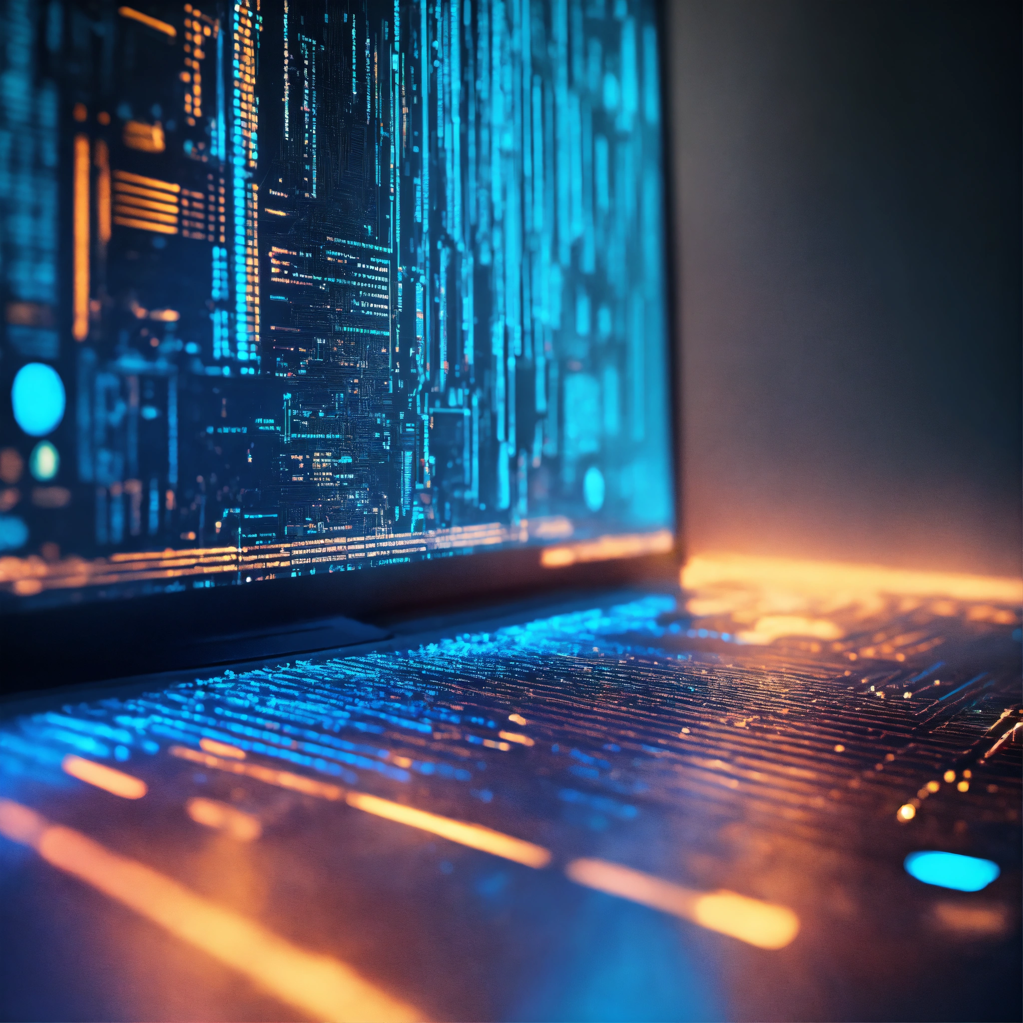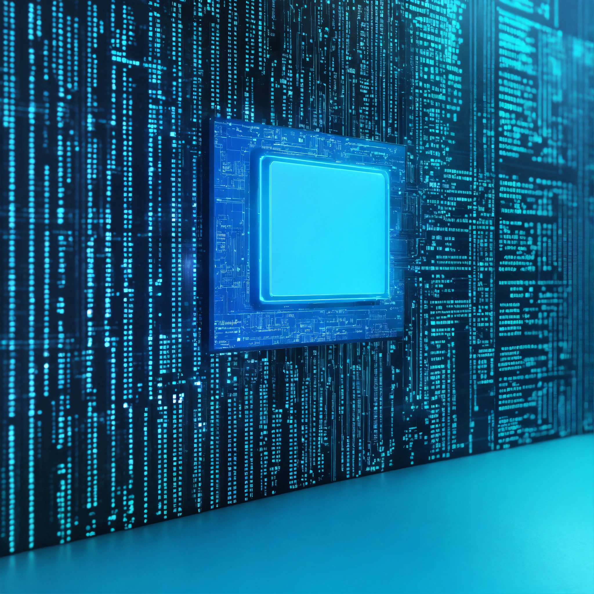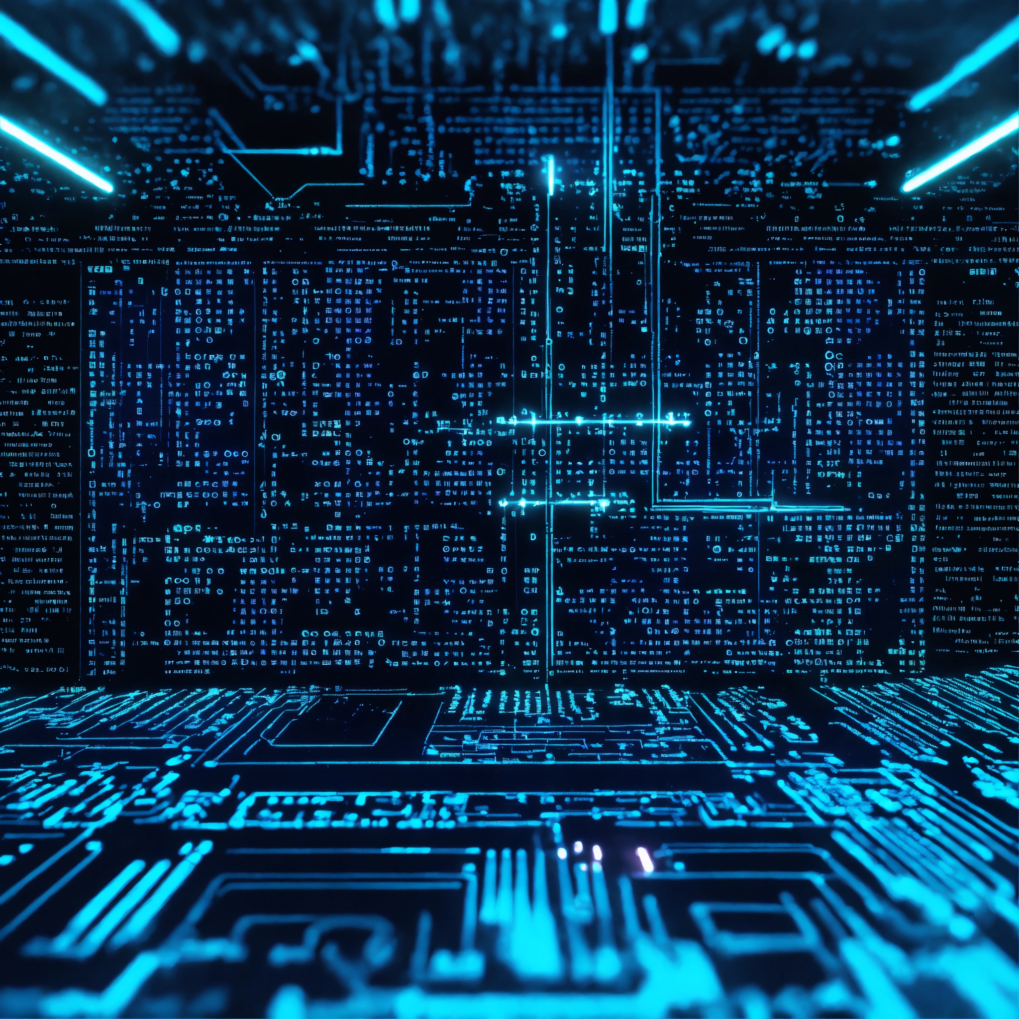 Ultra realistic photo of a very high tech 3d software code lit with bright blue and turquoise light