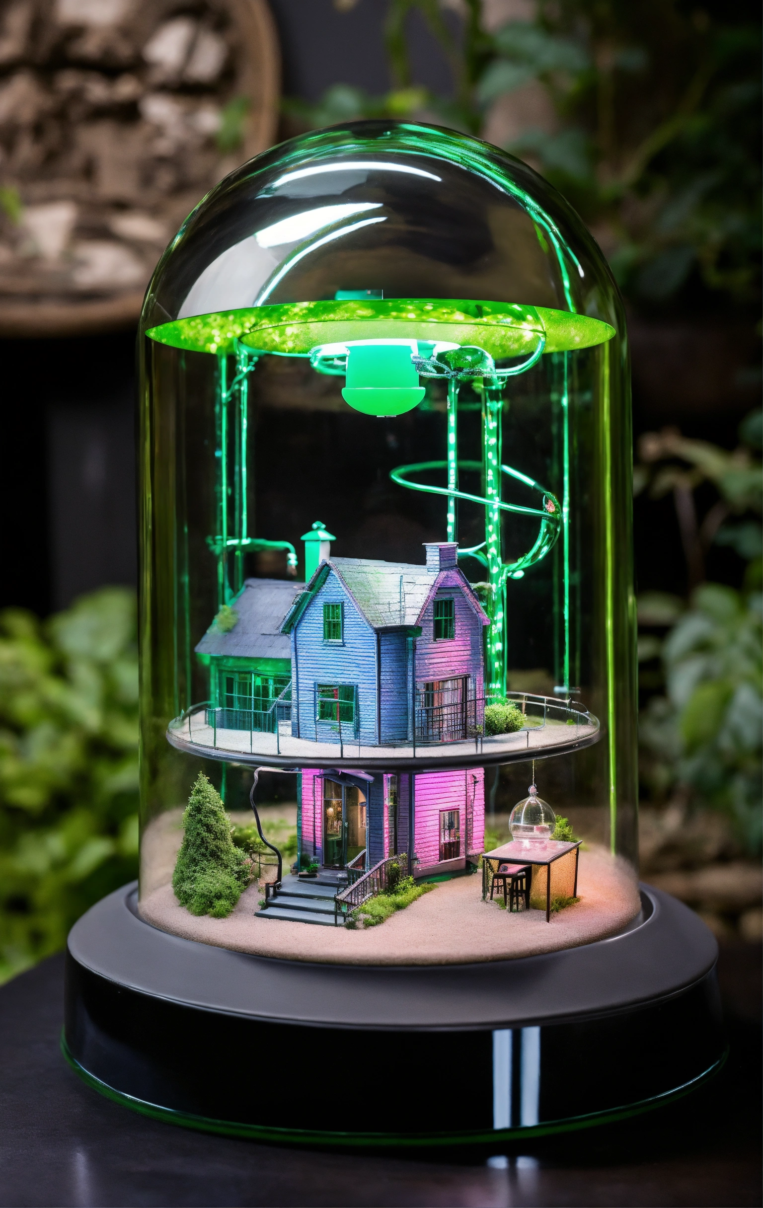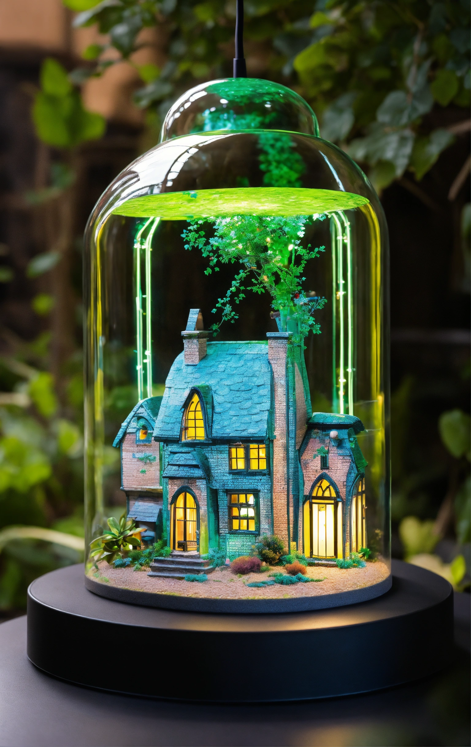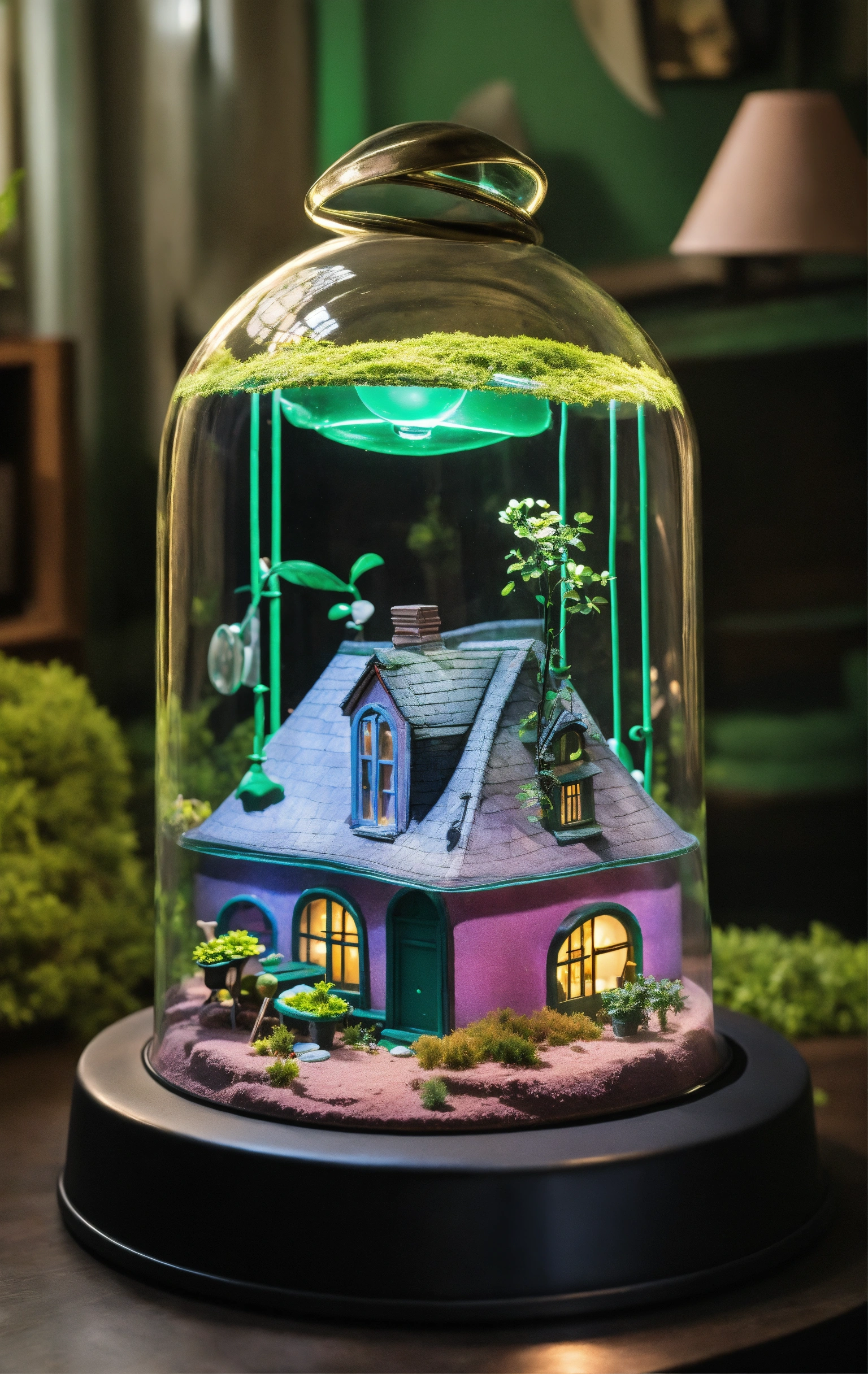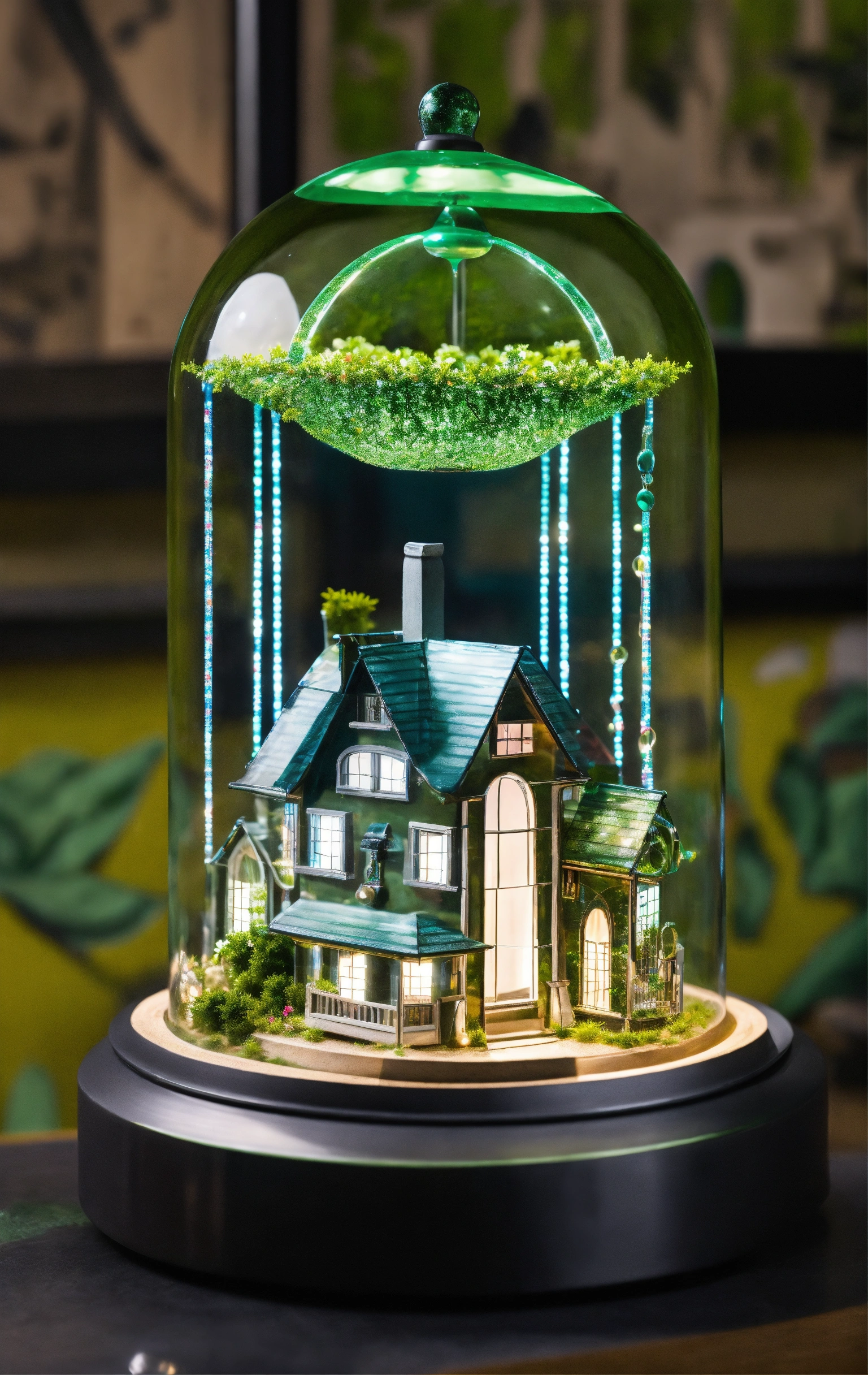 Futuriste lampe, cloche en verre avec maison de style tim burton, de l'eclairage vert beaucoup de détails design, lainée cardée, moderne lampe