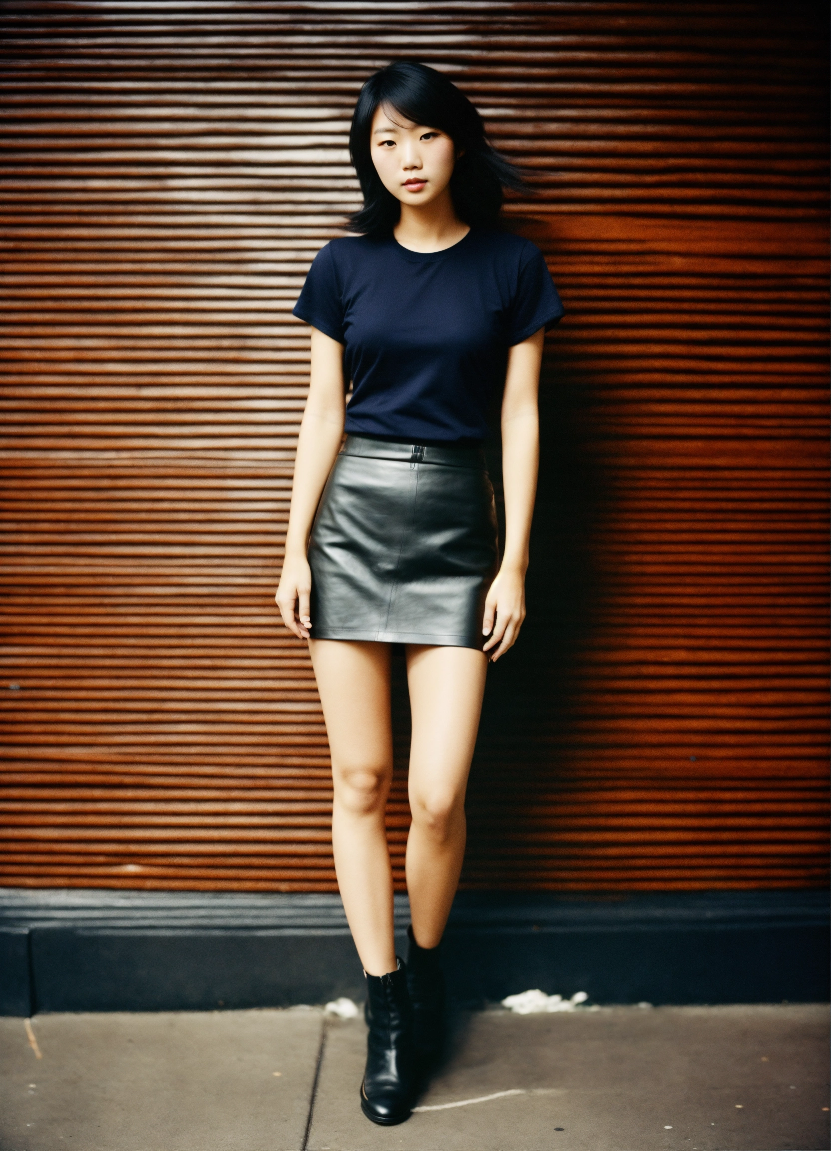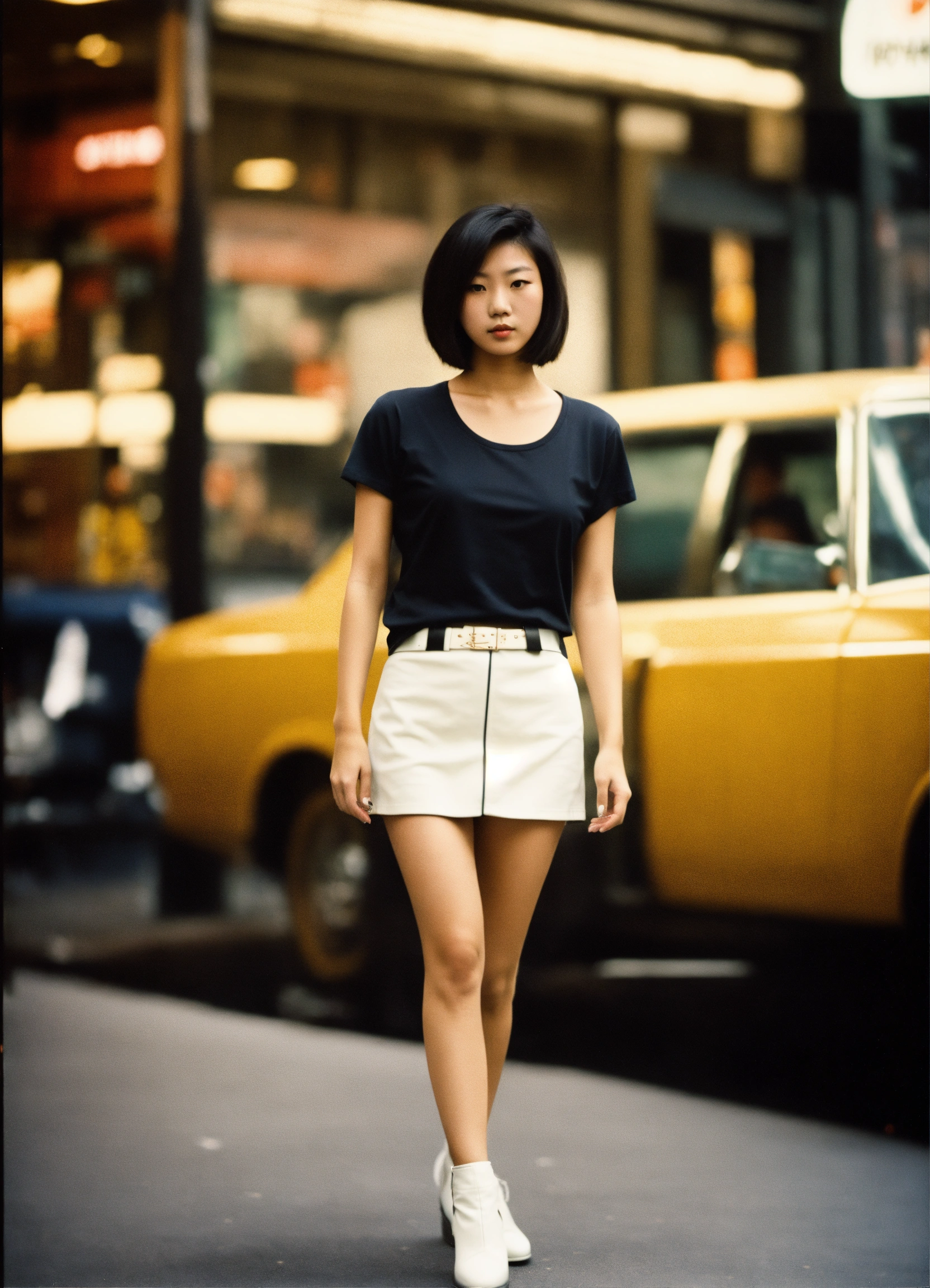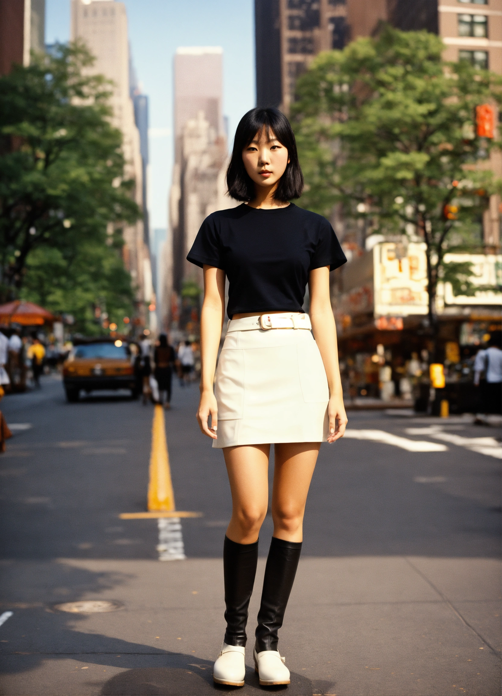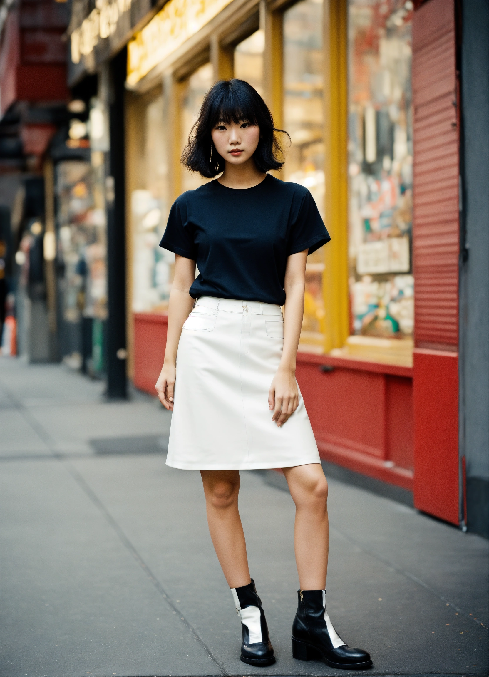 Vintage full body photo of one full-bodied japanese female model modeling plain blank black t-shirt, with white leather skirt in new york.