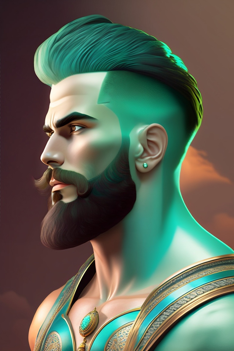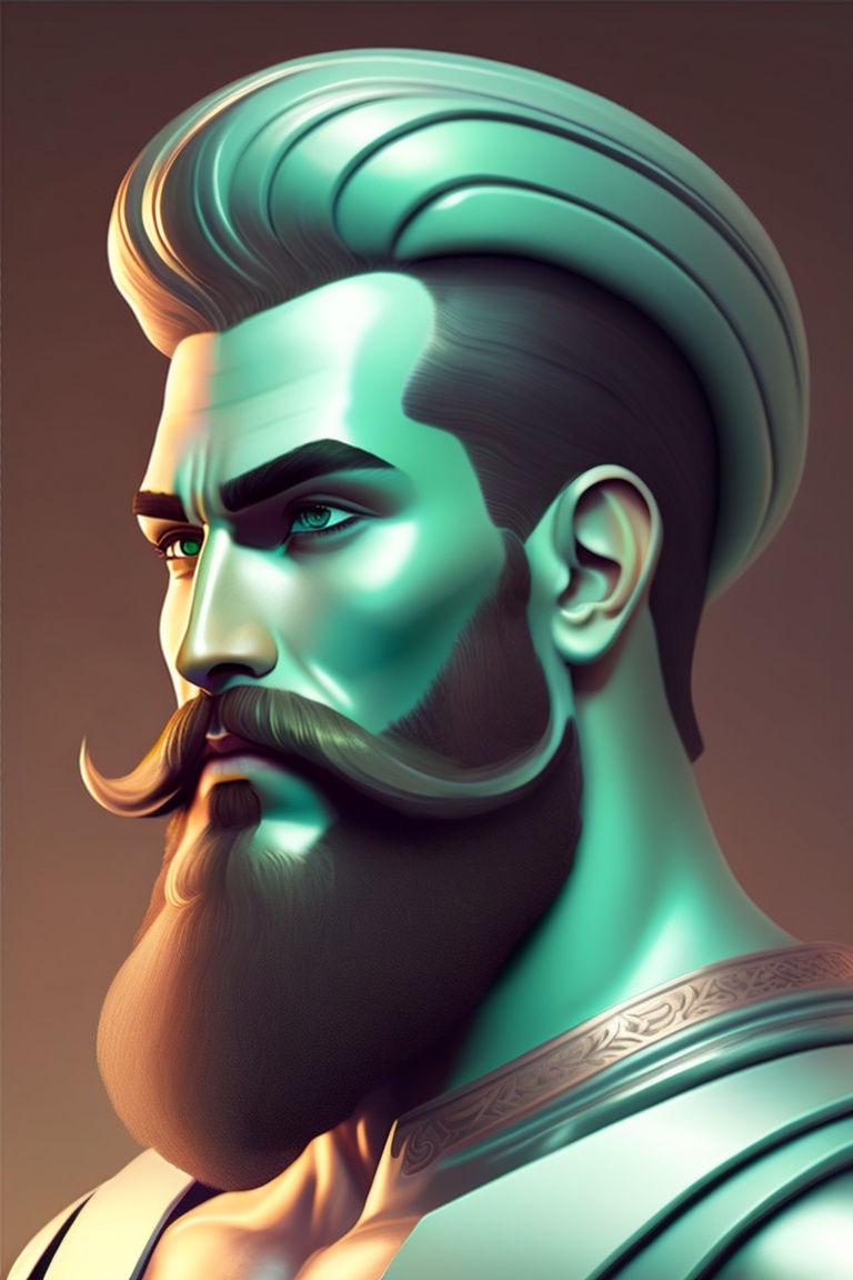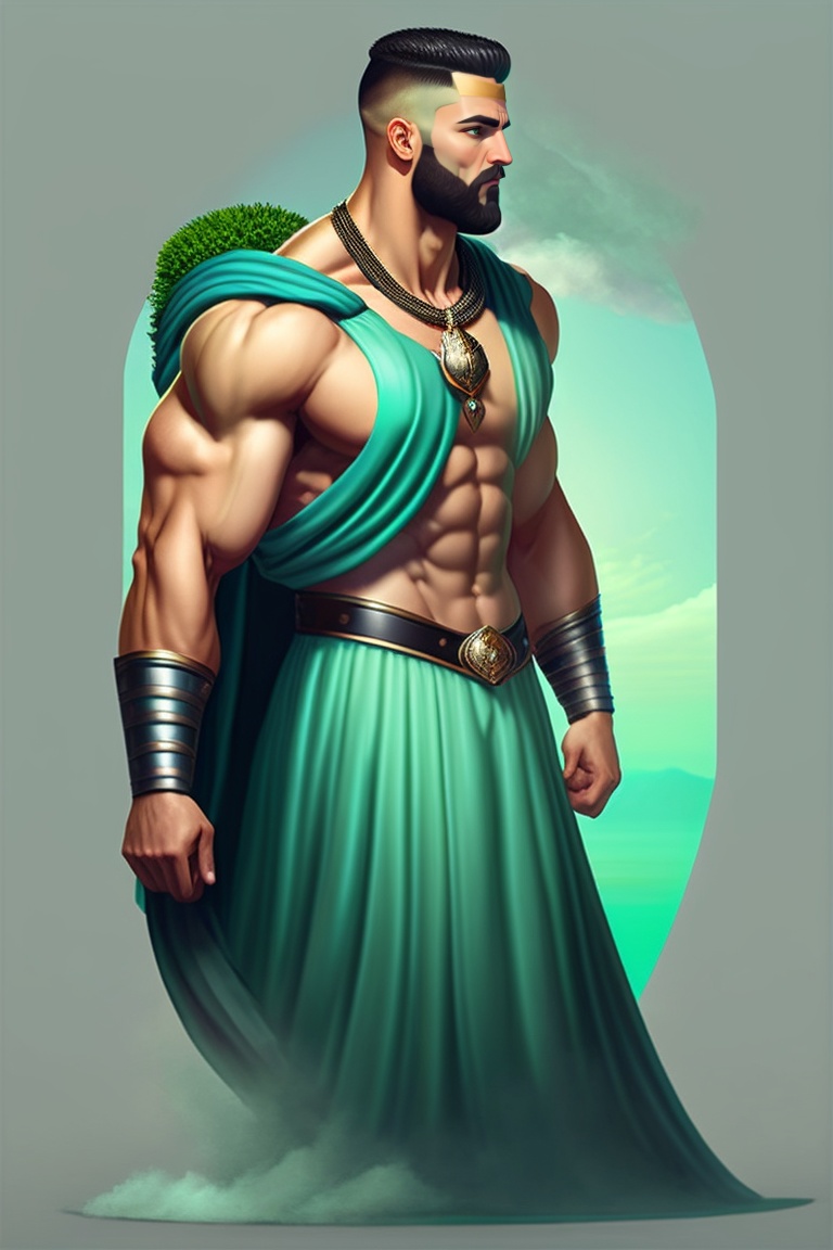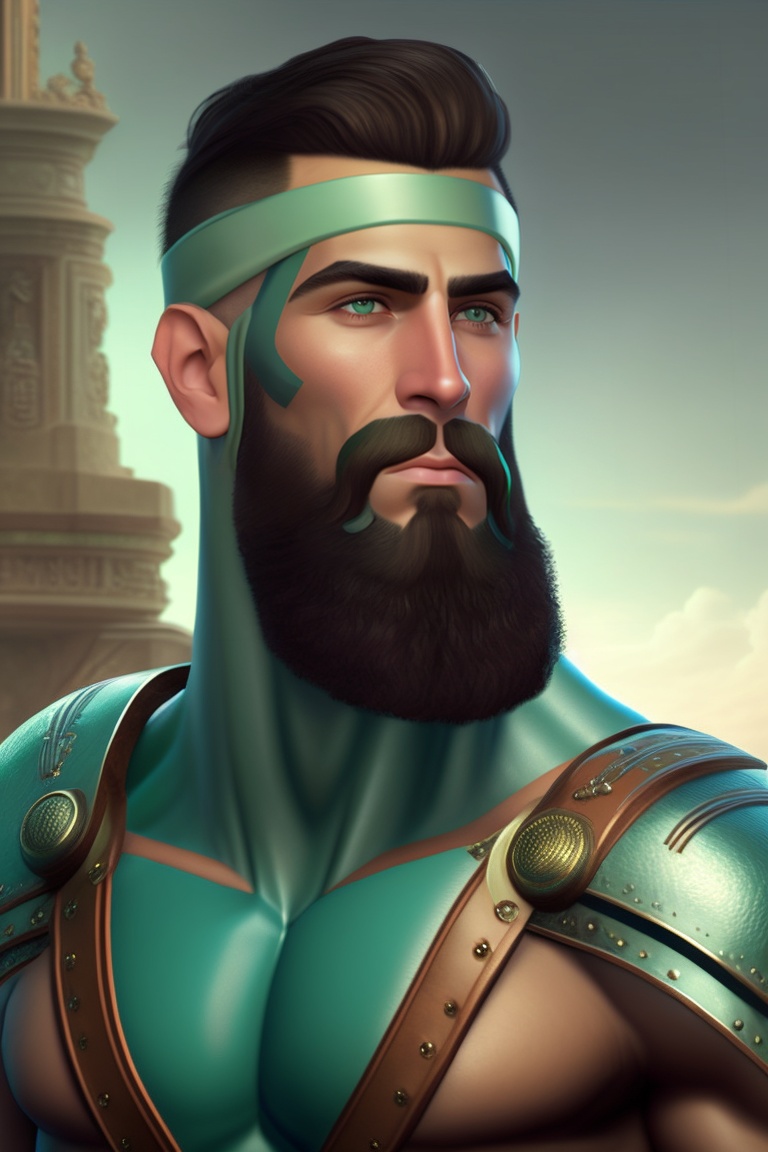 A greek hero with a buzz cut and black beard