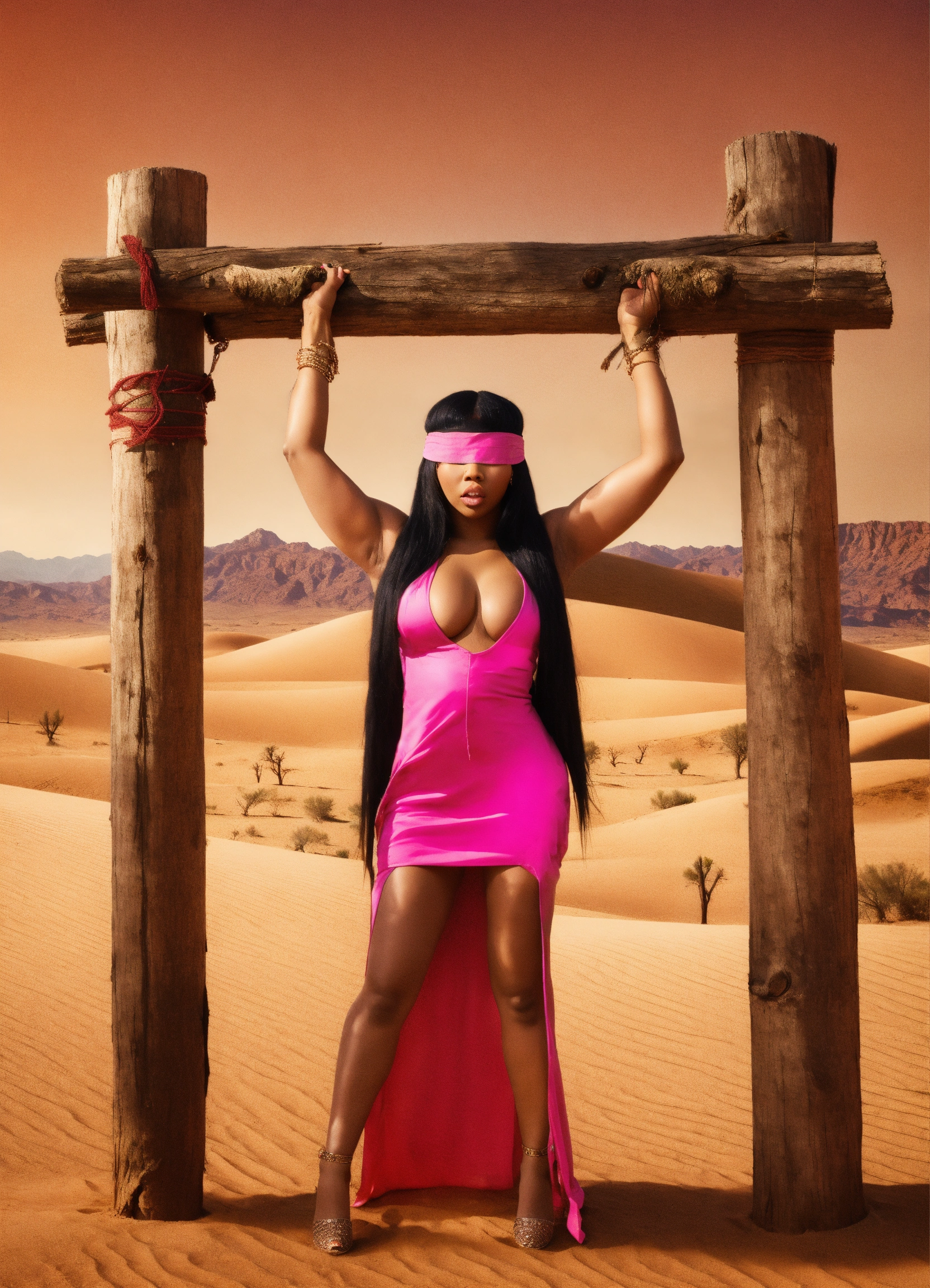 Nicki minaj blindfolded standing in front of a wood pole in a desert