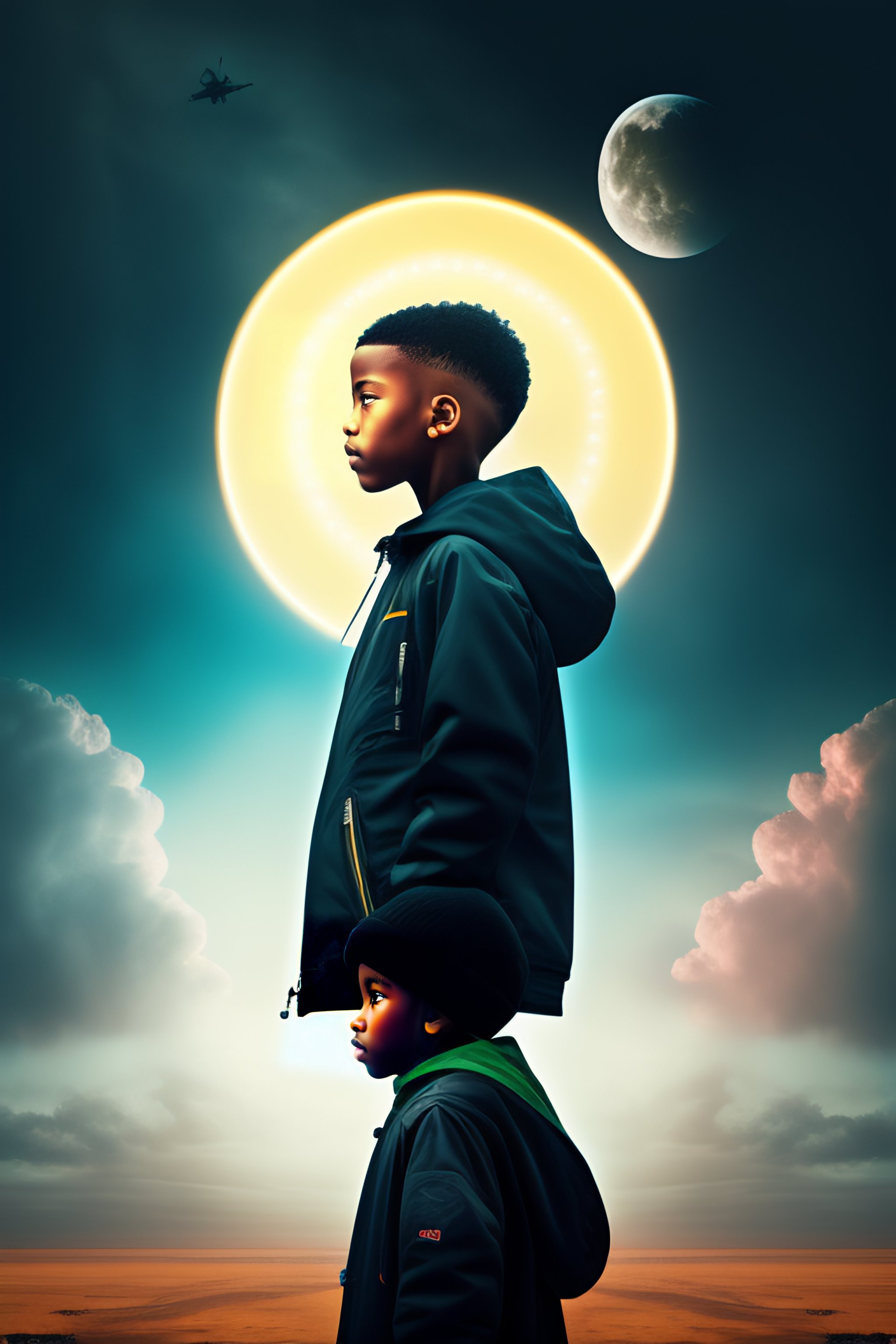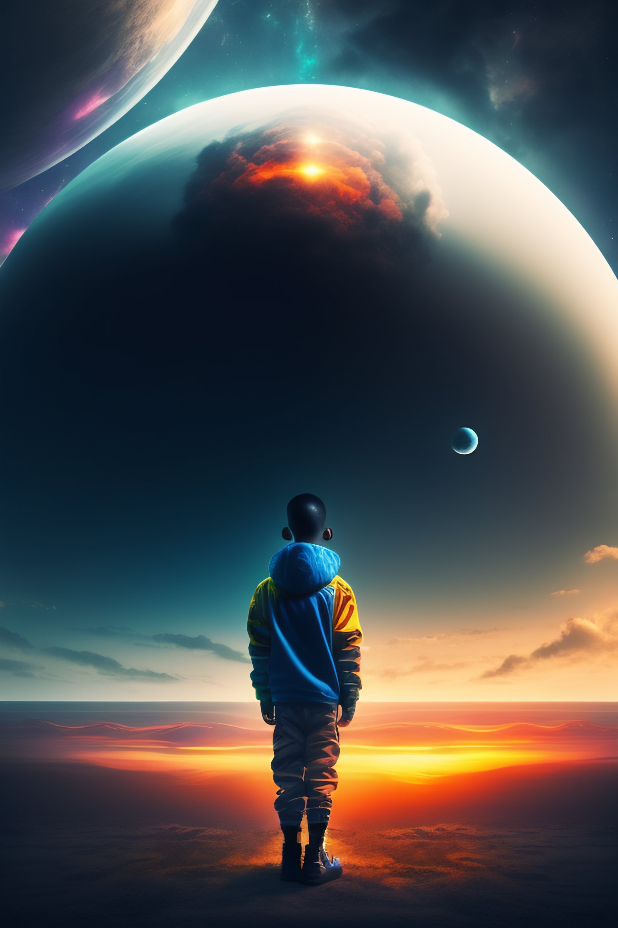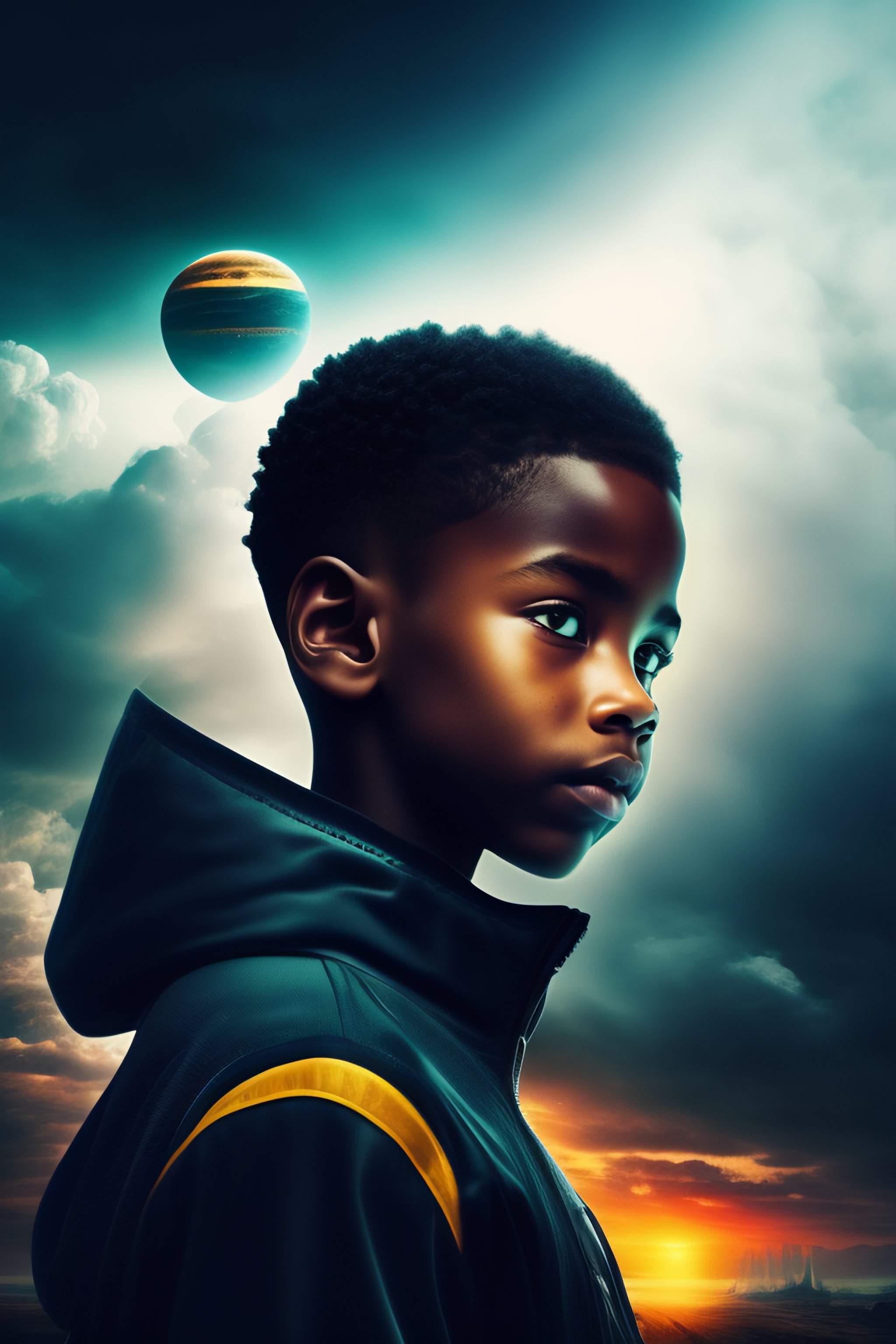 Distopic future, alien space ship above the sky, earth as a pos-apocalyptic paradise, a half human half black vulcan boy with pointy ears at the center o the image looking at the sky, cinematic