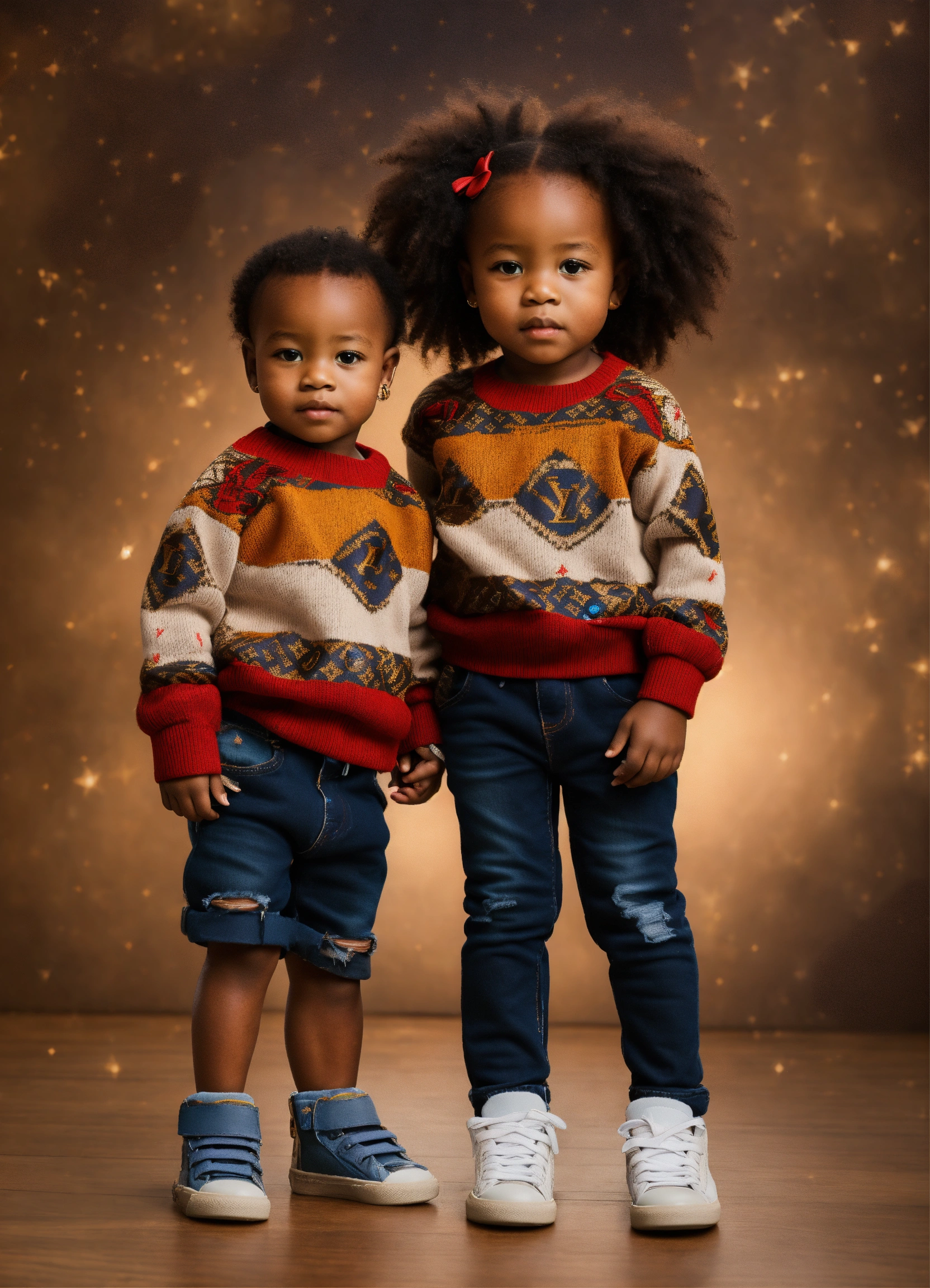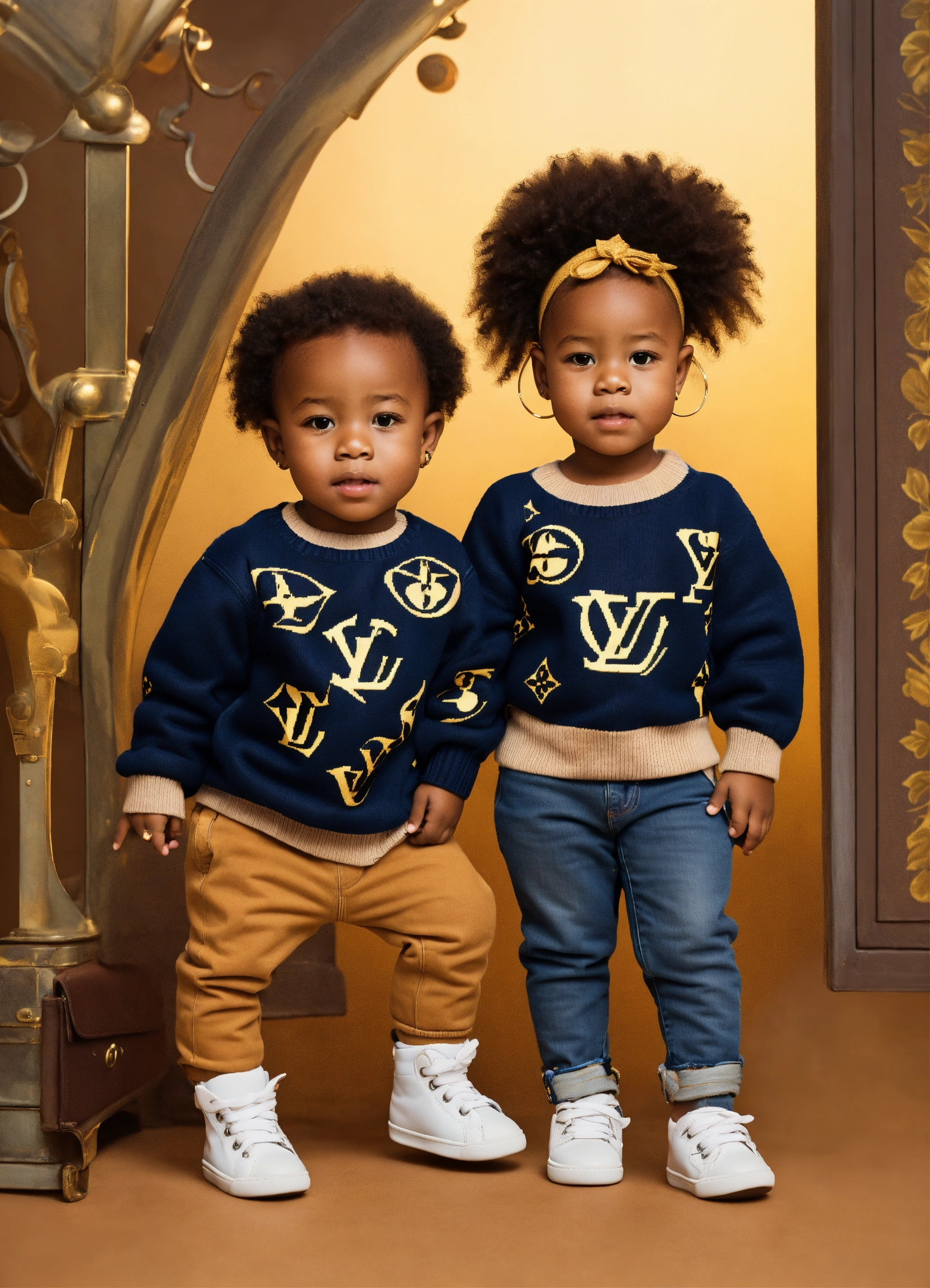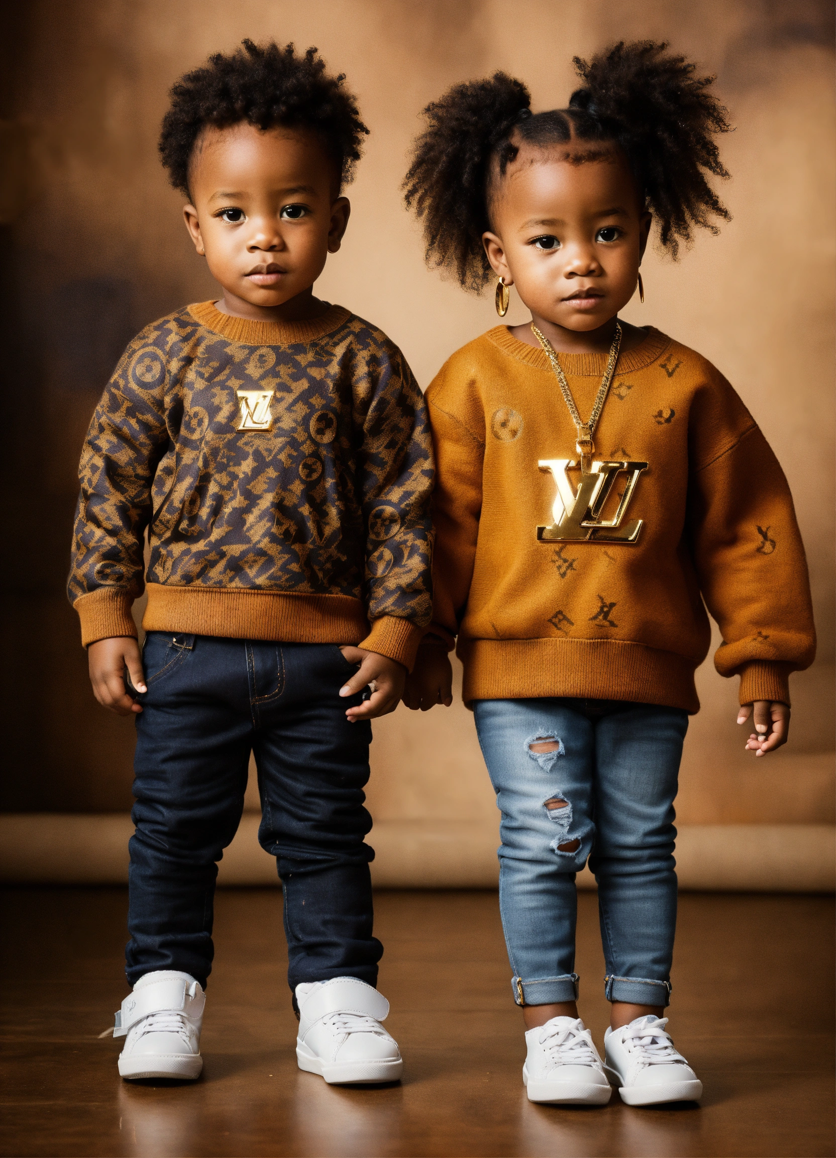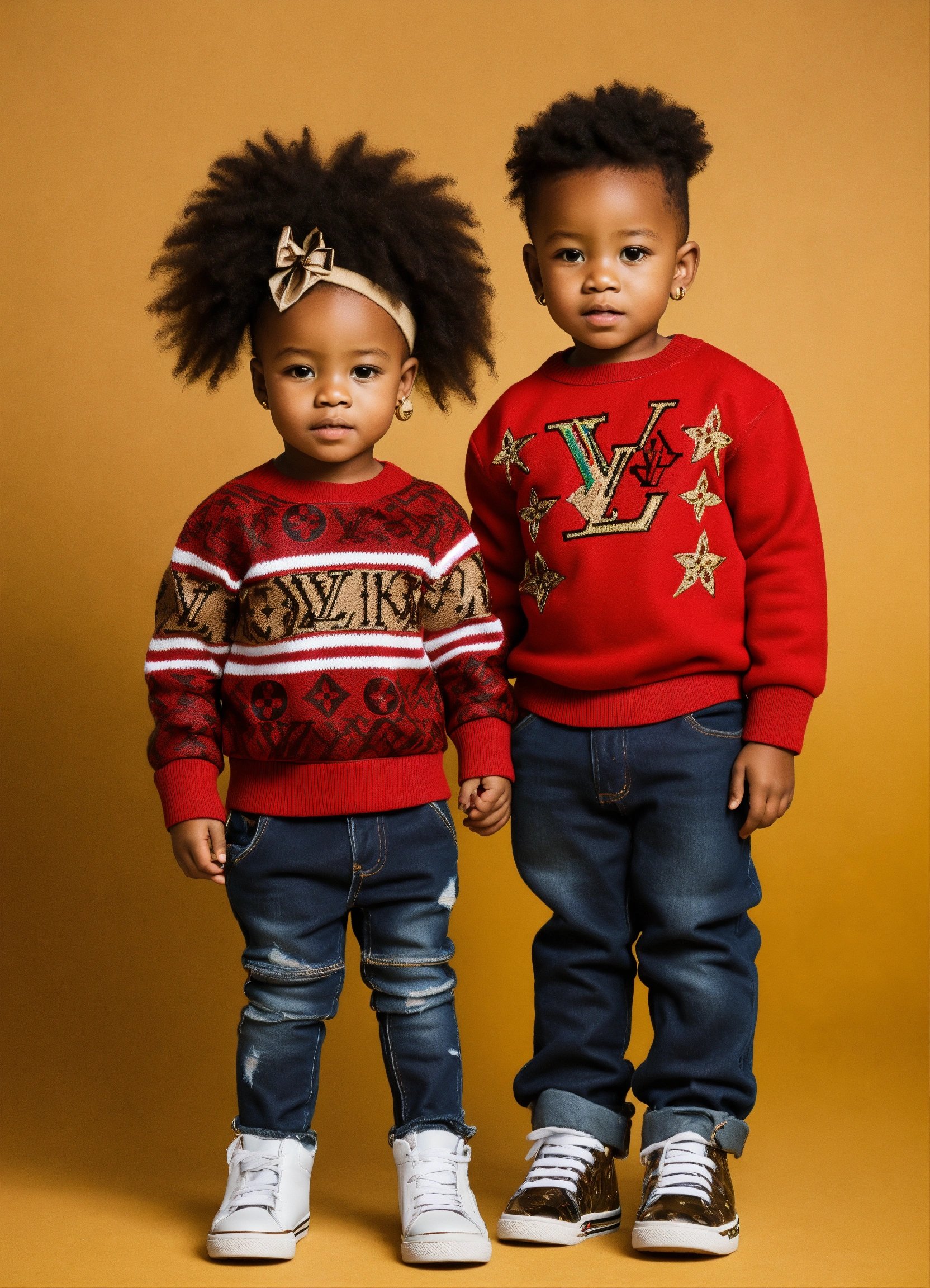 A handsome african american toddler boy and a beautiful african american toddler girl standing, full body, wearing a louis vuitton sweater and jeans with sneakers on his feet --v 5.0